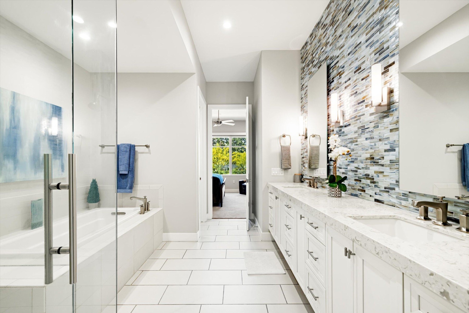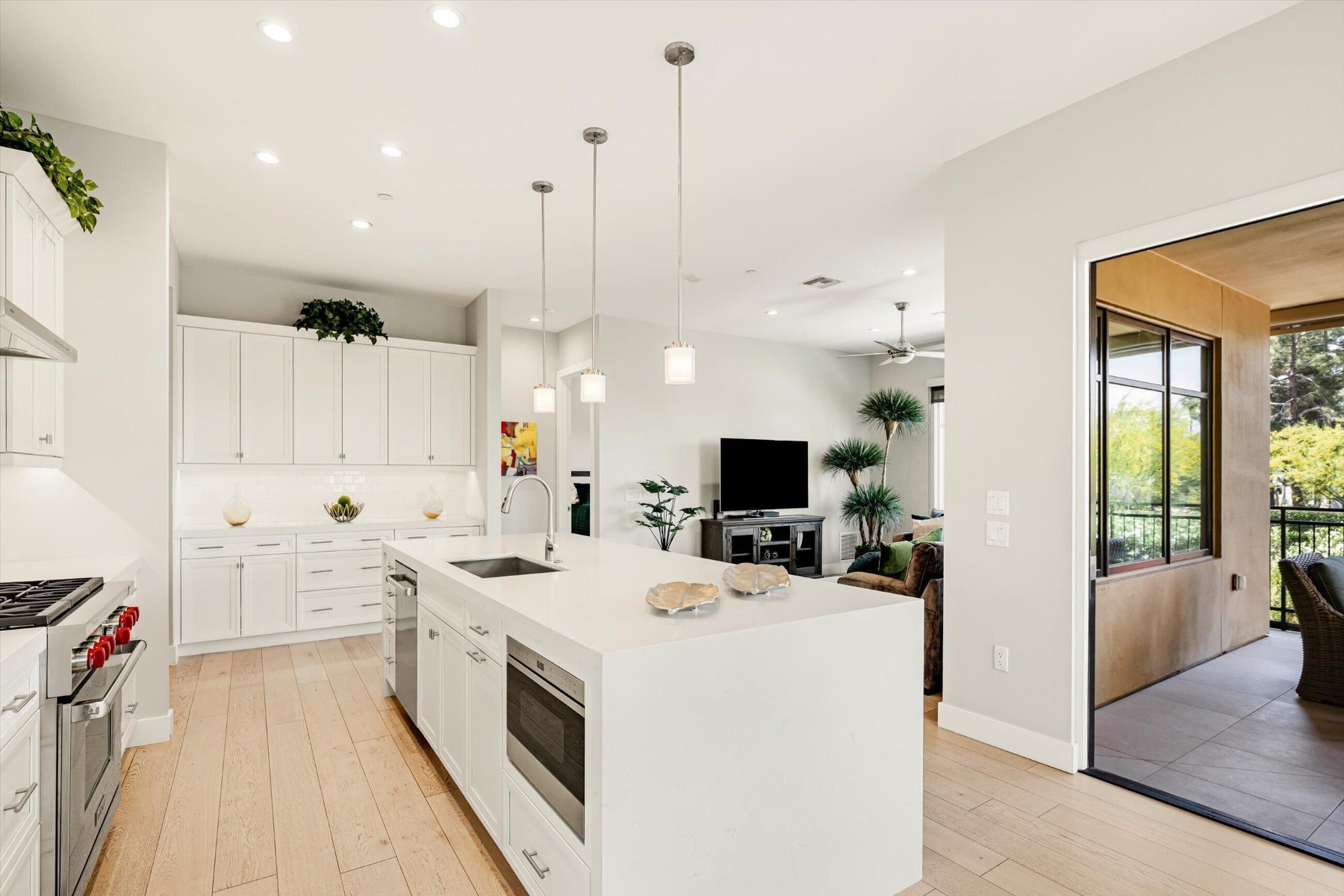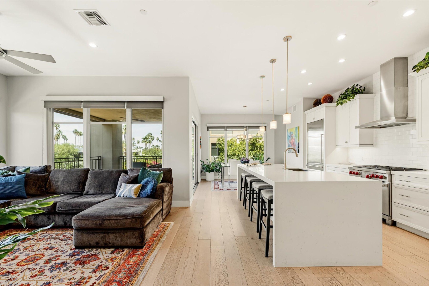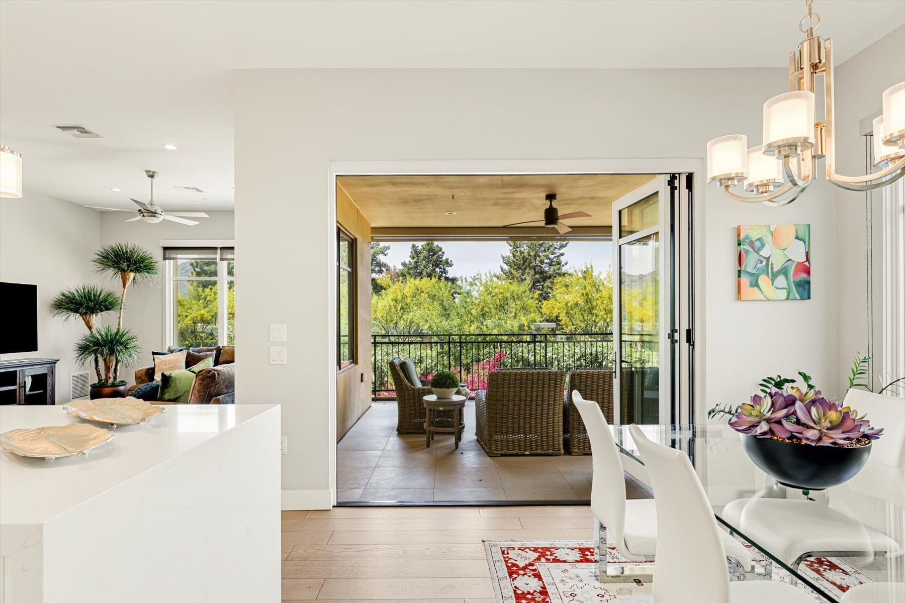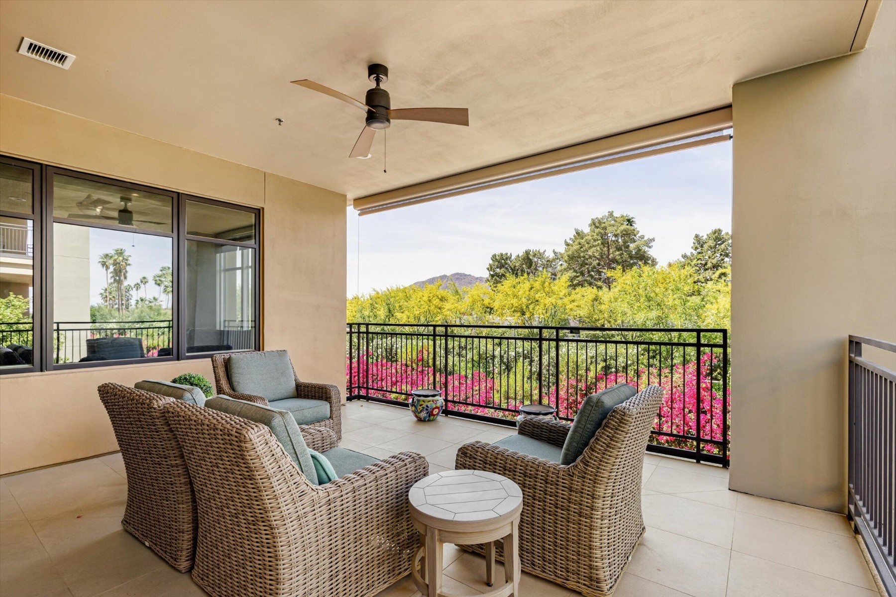 Experience refined living at Enclave at Borgata, Scottsdale's most walkable luxury address. Ideally positioned at the quiet back of the community, this 2 bedroom, 2.5 bath corner residence is wrapped with windows to the lush green trees and vegetation that wrap the Enclave. With 10' ceilings, a separate den and a desirable split floor plan this home is bright yet private. Stacking doors open to an oversized corner terrace with views across Paradise Valley. Residents enjoy 24/7 staffing, a resort-style pool, great fitness center, club room, dog park six water features, outdoor fireplace and gardens that meander through the community. Literally just outside the gates are Scottsdale's finest restaurants, grocery stores and everything that you need. Lock-and-leave living at its finest.