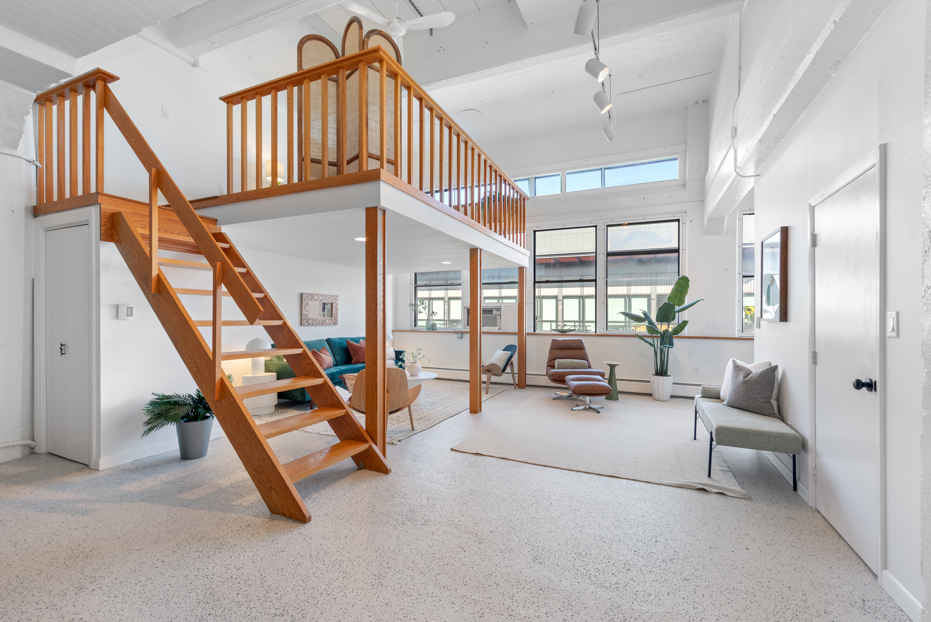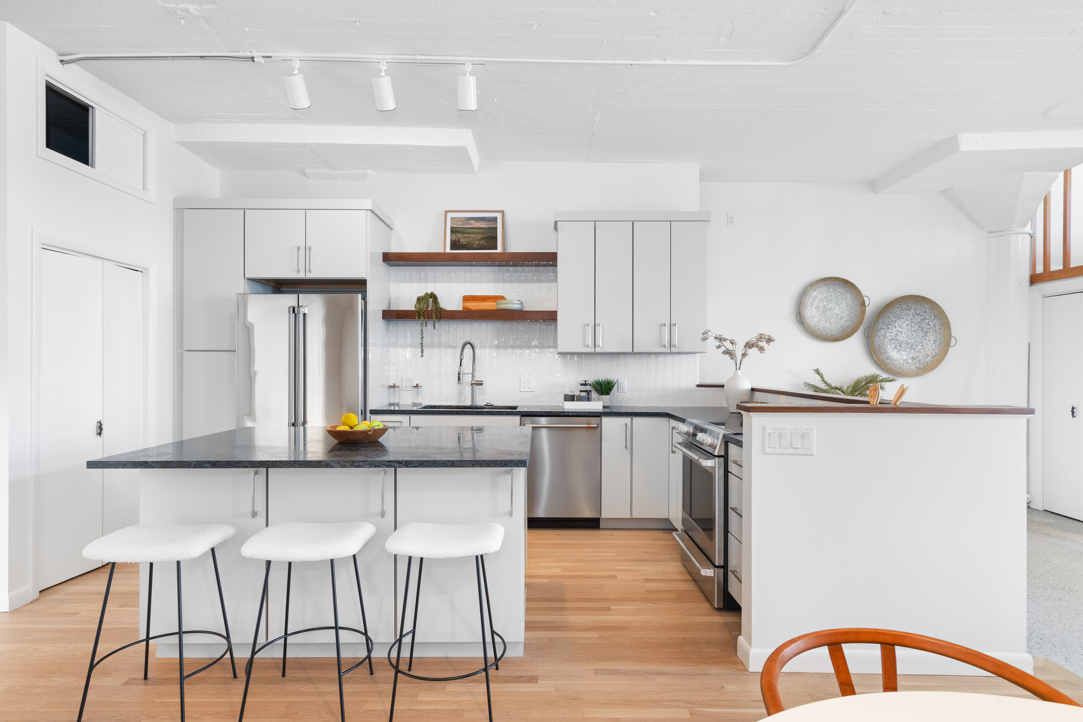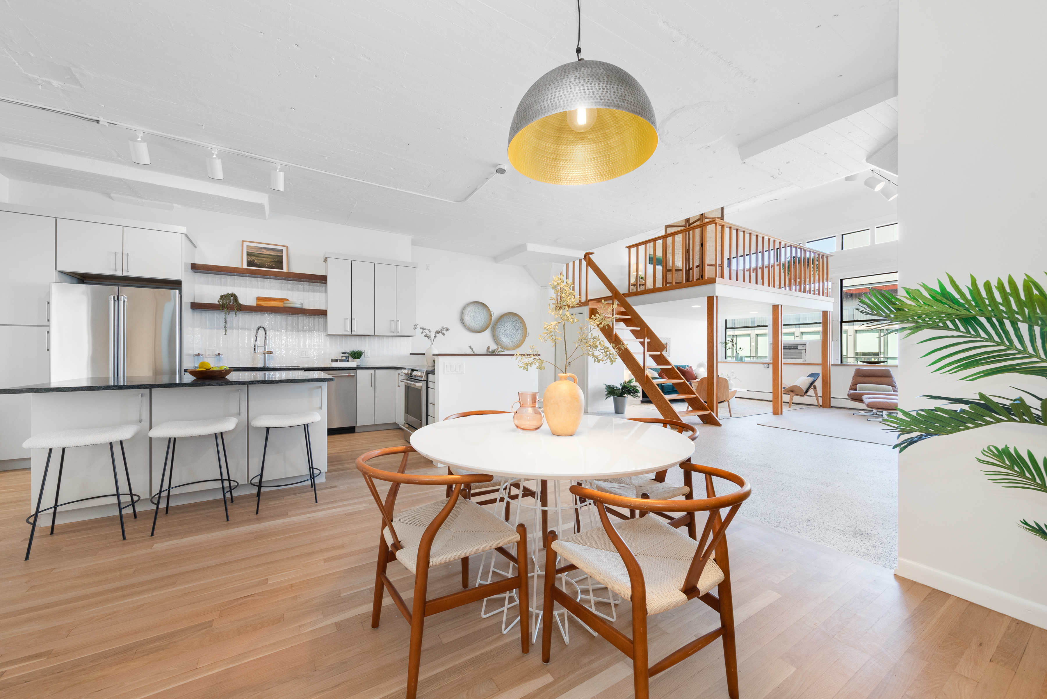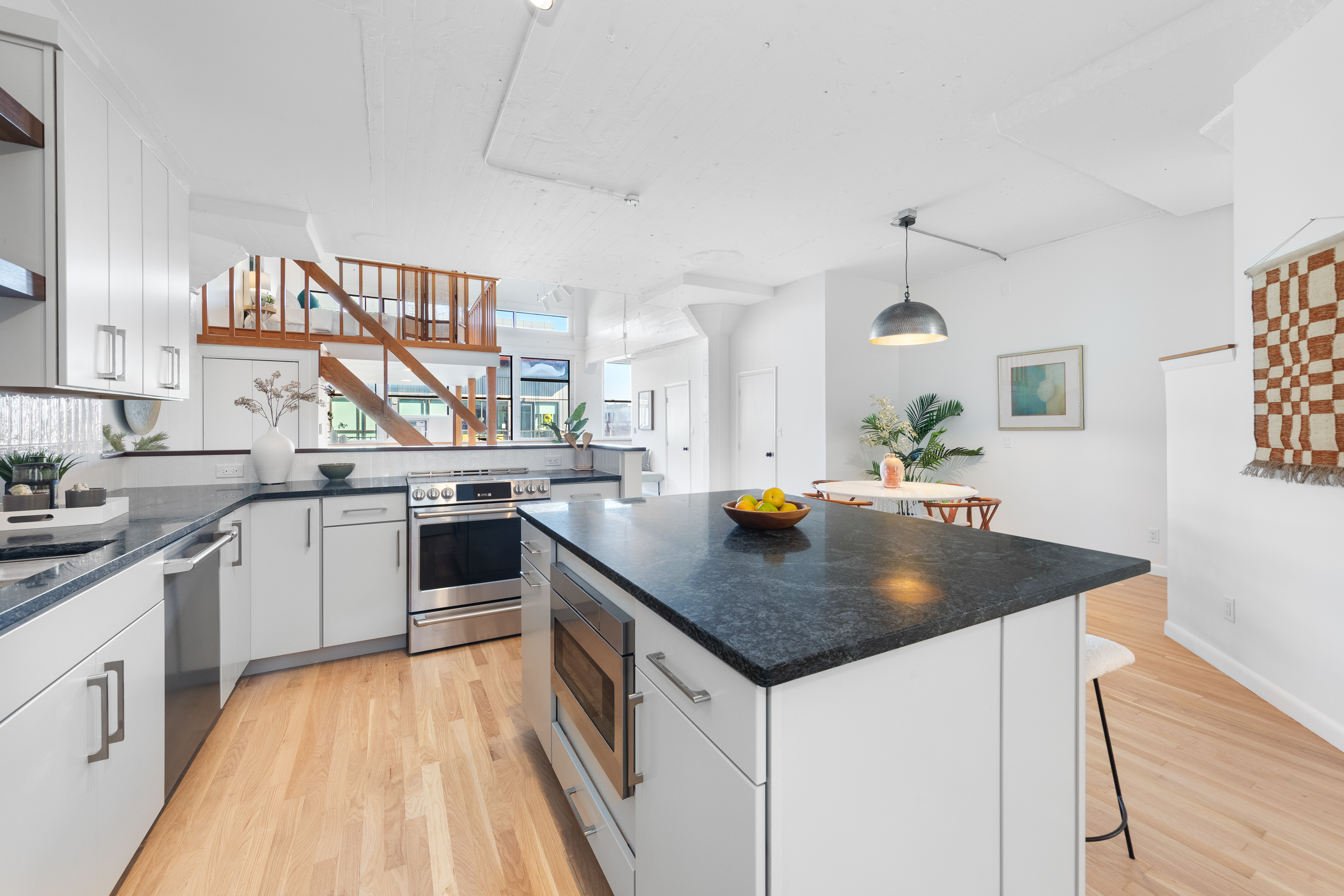 Gorgeous, newly renovated penthouse loft at Brickbottom! One of the most desirable units with soaring ceilings and skylight. Updated to meet the function and style buyers crave. Sleek kitchen features high end soapstone countertops and new GE Café appliances. Custom walnut “work from home” station and shelving are indicative of the attention to detail and the quality of craftmanship. New paint, new hardwood floors, new lighting, new washer and dryer. Spacious elevated loft offers flex space that could be used as a second bedroom. Sunlit office nook has views of the new commuter bike path and beyond through huge windows. Abundant kitchen cabinets, numerous closets and custom built-ins throughout provide exceptional storage. Rare deeded oversized non-tandem garage parking spot. Desirable area minutes from Boston, steps from new T stop. BB is a vibrant community that celebrates art in its gallery and hosts lively social events throughout the year. Welcoming shared courtyard and much more!
