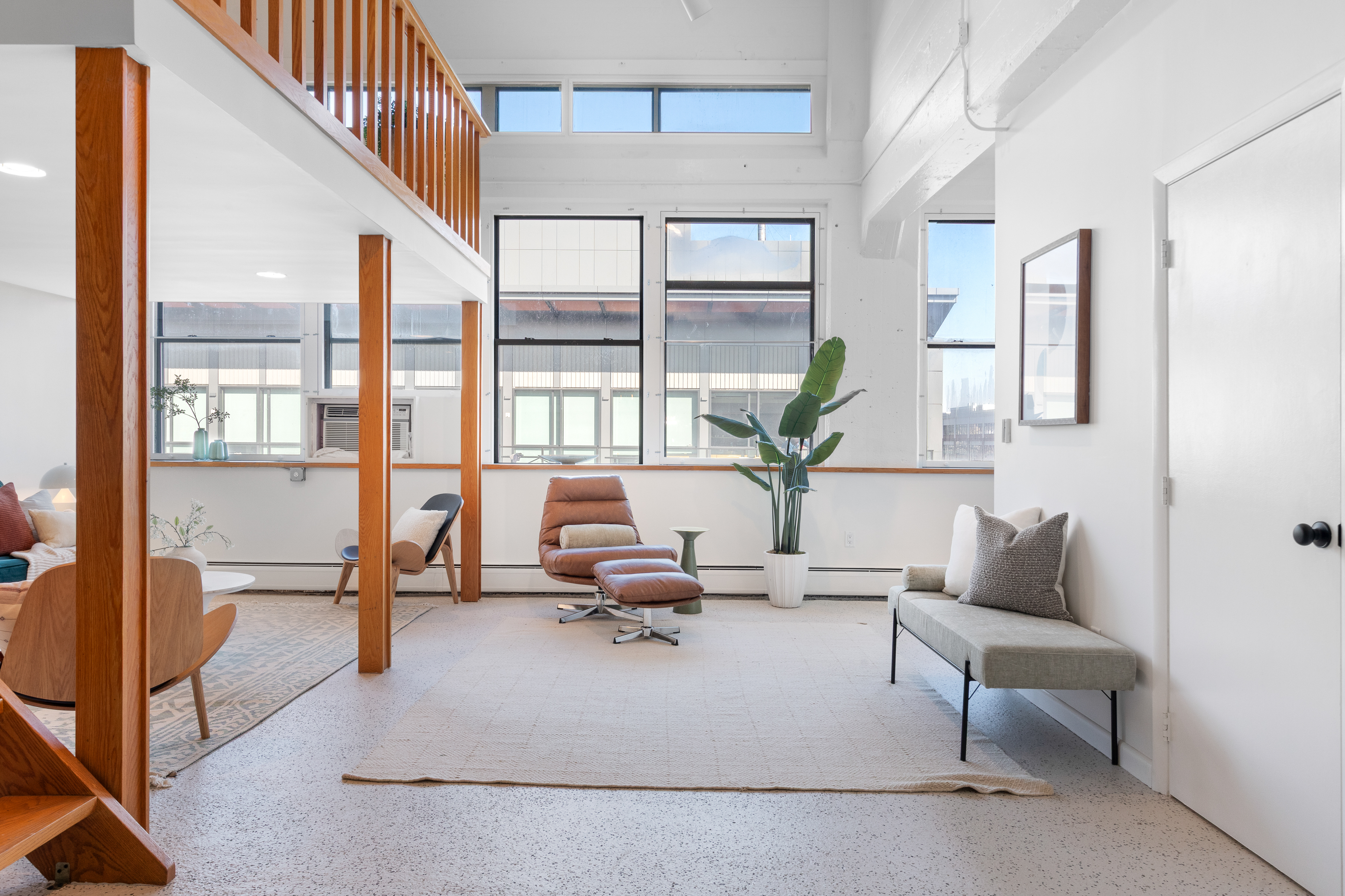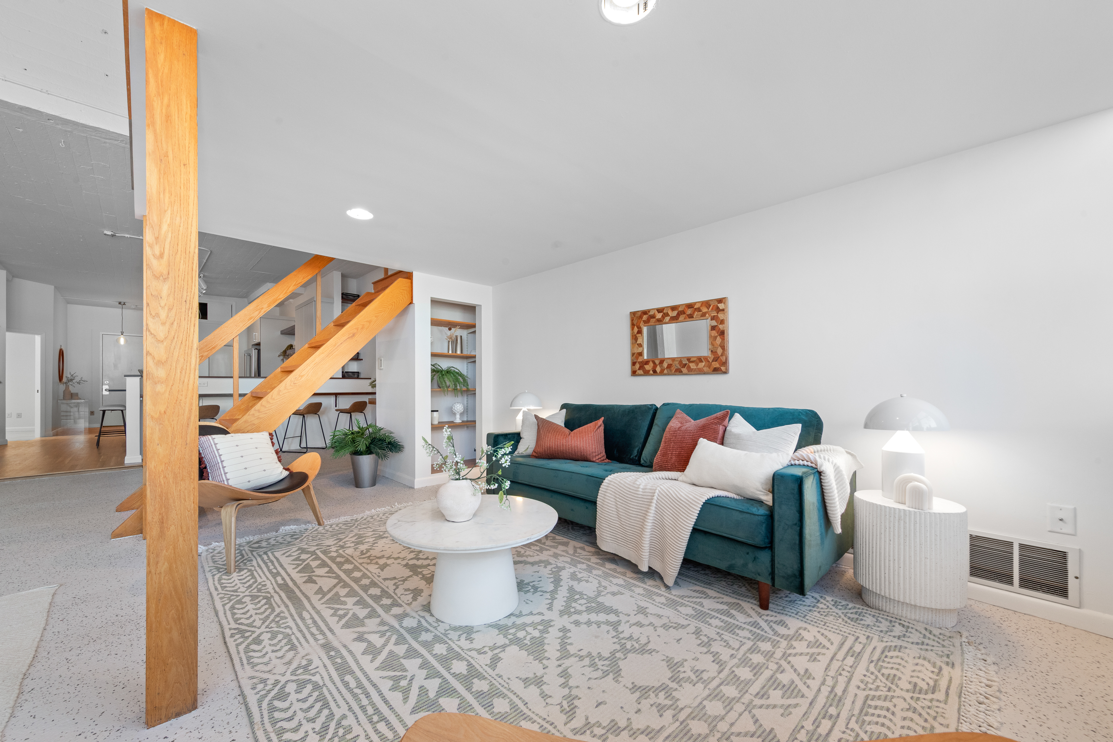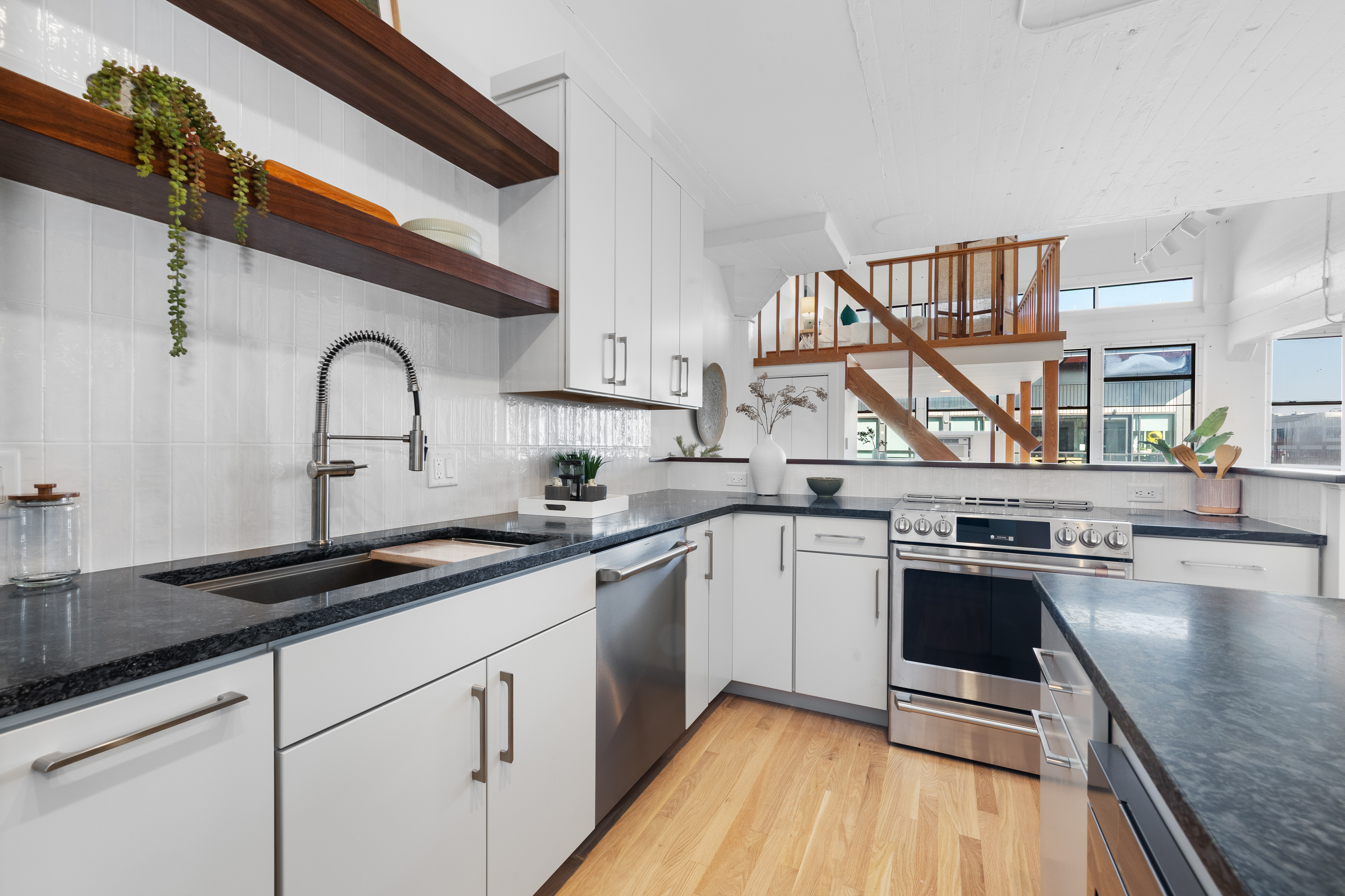Gorgeous, newly renovated penthouse loft at Brickbottom! One of the most desirable units with soaring ceilings and skylight. Updated to meet the function and style buyers crave. Sleek kitchen features high end soapstone countertops and new GE Café appliances. Custom walnut “work from home” station and shelving are indicative of the attention to detail and the quality of craftmanship. New paint, new hardwood floors, new lighting, new washer and dryer. Spacious elevated loft offers flex space that could be used as a second bedroom. Sunlit office nook has views of the new commuter bike path and beyond through huge windows. Abundant kitchen cabinets, numerous closets and custom built-ins throughout provide exceptional storage. Rare deeded oversized non-tandem garage parking spot. Desirable area minutes from Boston, steps from new T stop. BB is a vibrant community that celebrates art in its gallery and hosts lively social events throughout the year. Welcoming shared courtyard and much more!
