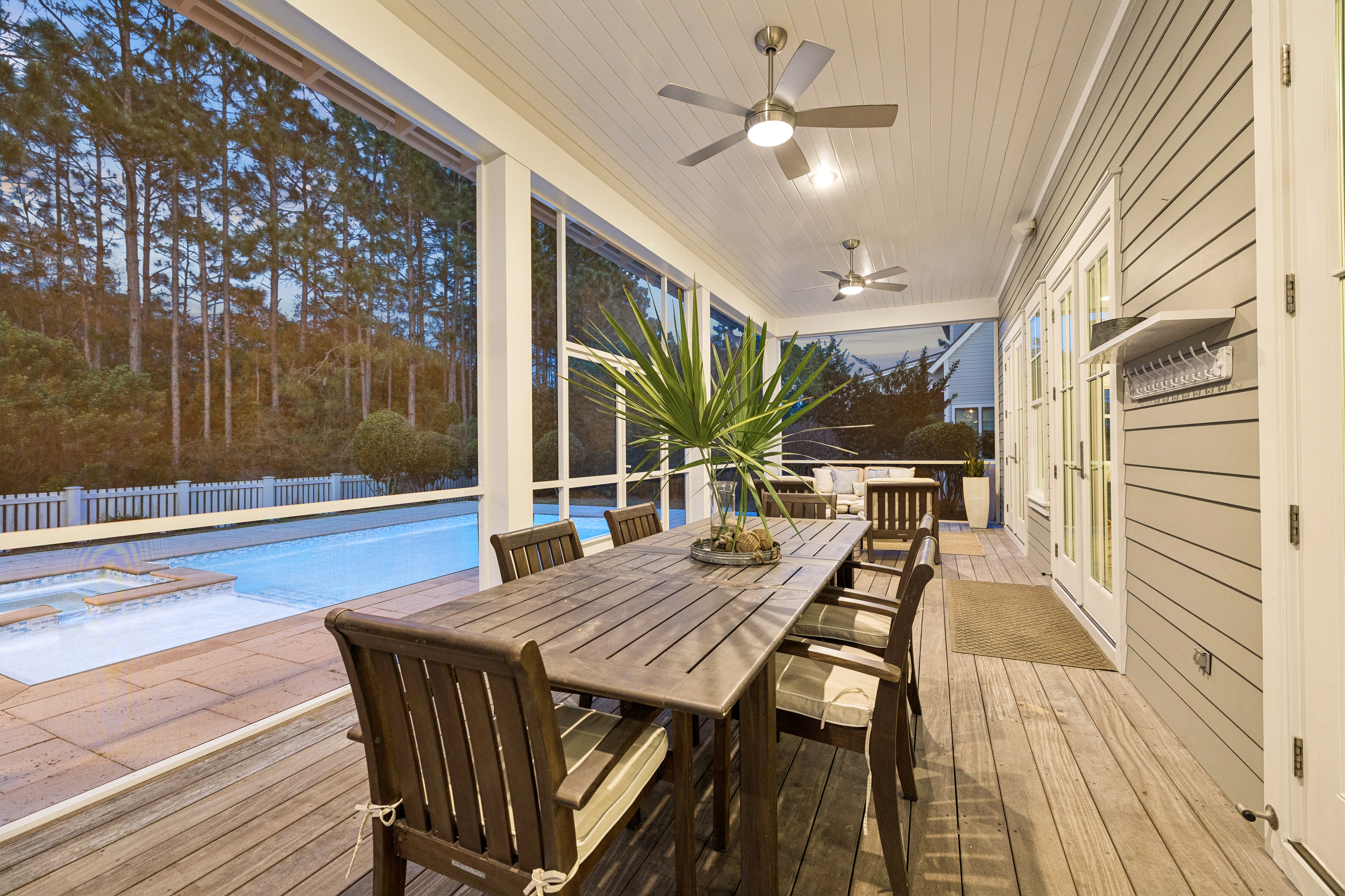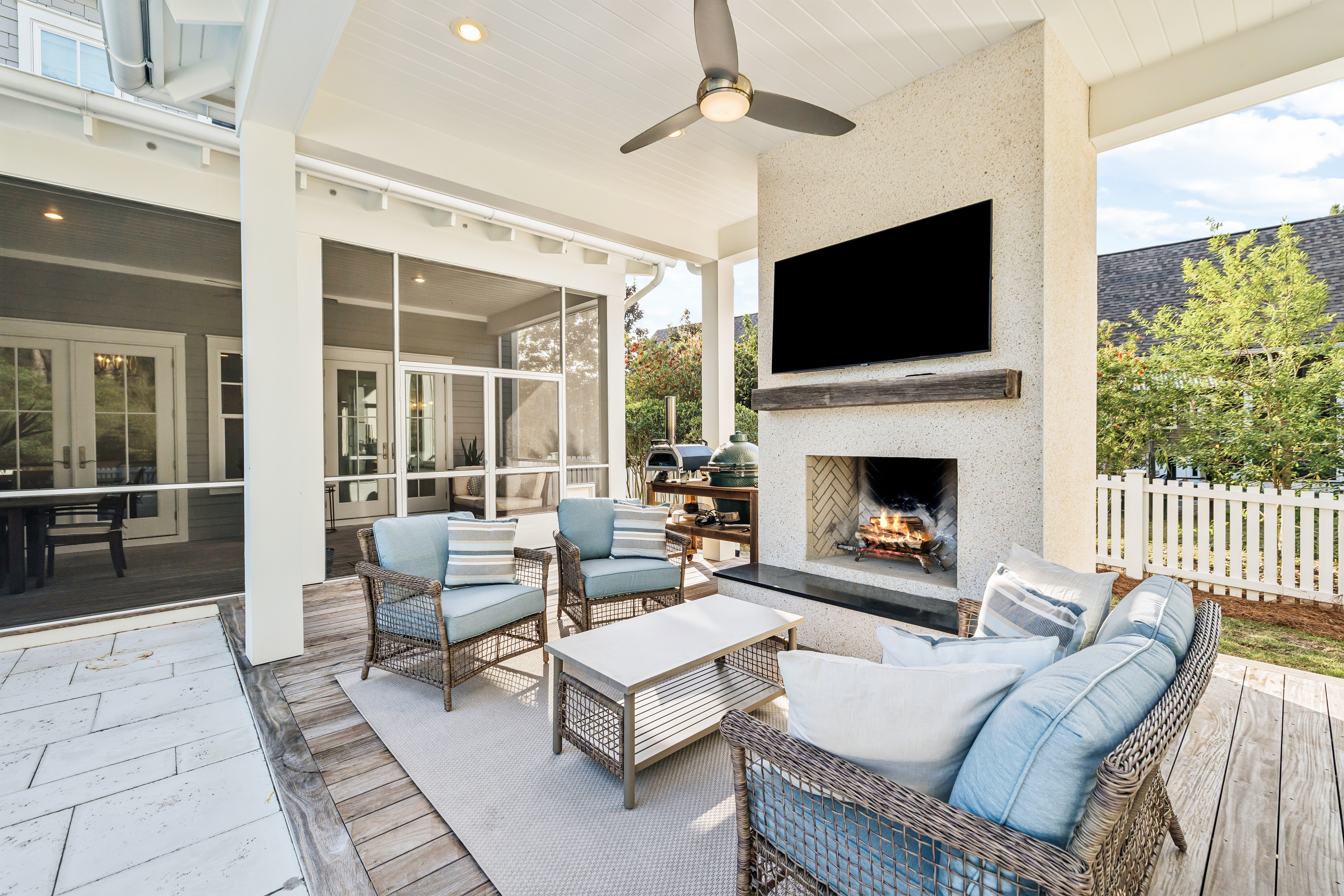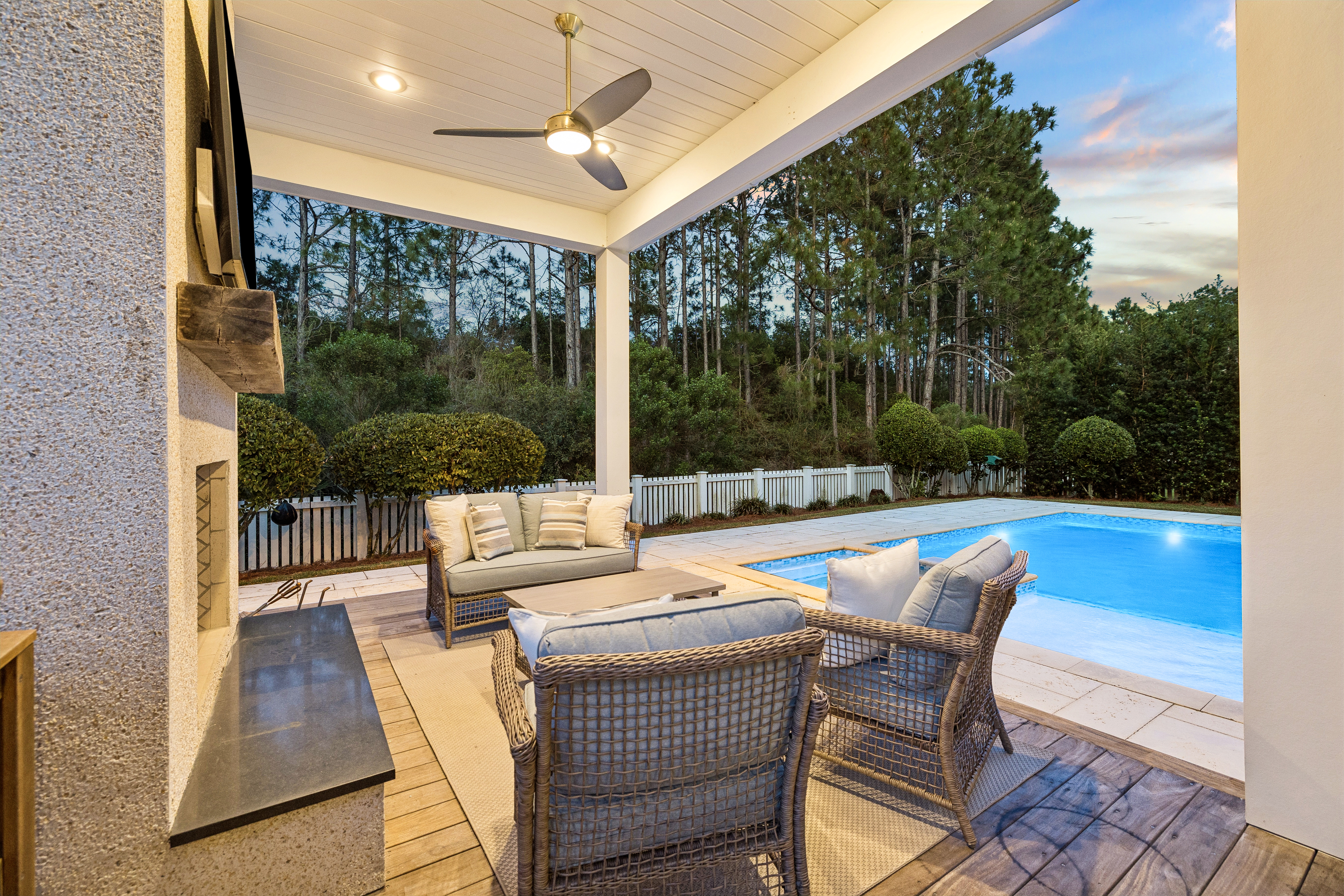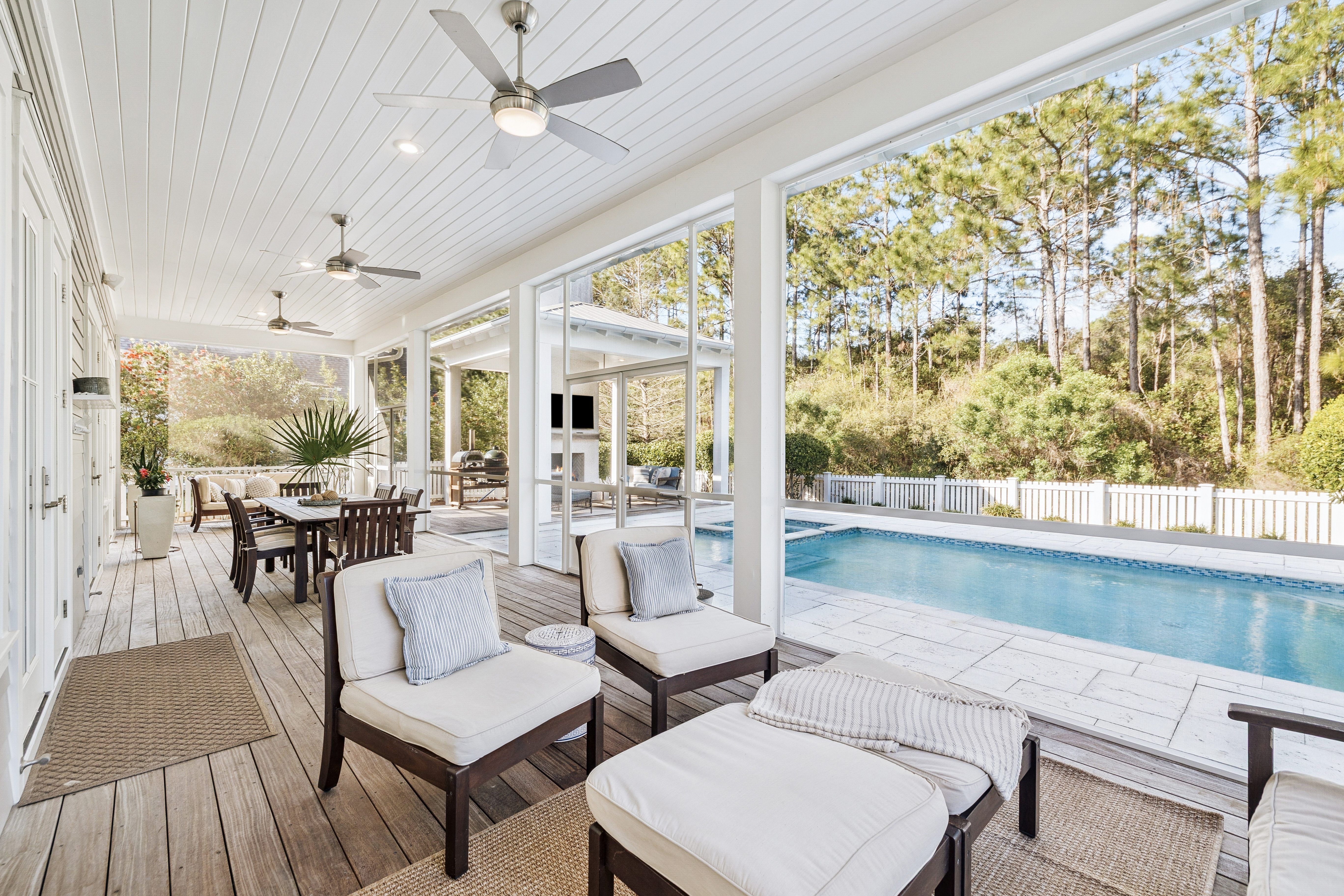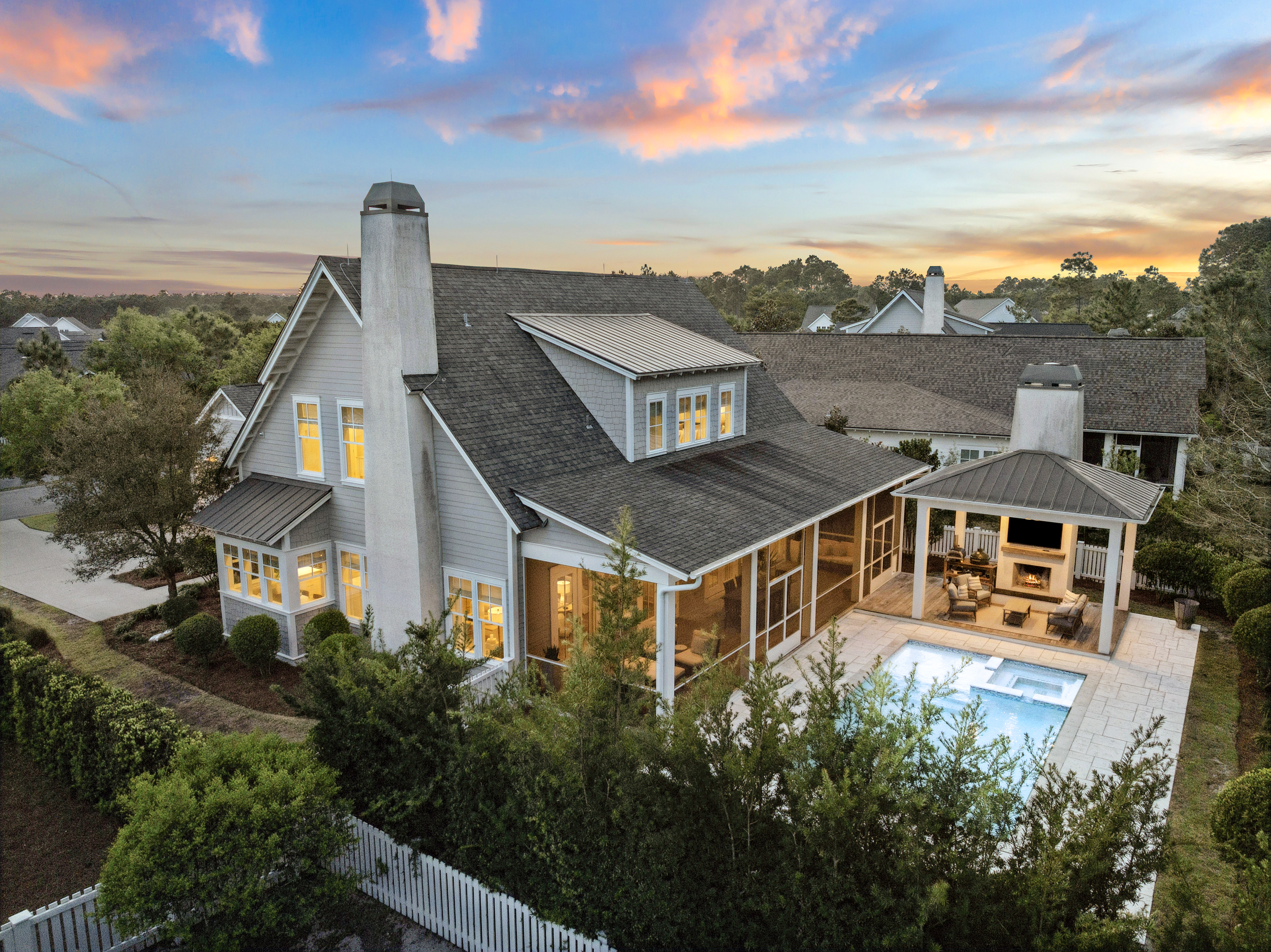 Located in the established section of WaterSound Origins, this highly sought-after Weatherly floor plan by Romair Homes sits on an exceptionally private homesite backing to a serene nature preserve. This Cape Cod–inspired home offers 4 bedrooms and 4.5 baths, including a primary suite on the main level, combining timeless design with everyday functionality. You are welcomed by a charming front porch complete with a quintessential porch swing, setting the tone for relaxed coastal living. Offered fully furnished, this home presents a turnkey opportunity for buyers, adding immediate value and ease of ownership. Convenient access via Breaker Street makes getting in and out of the community effortless. Situated on the south side of Splash Drive, this section of WaterSound Origins is known for its generous spacing, creating a uniquely quiet and private setting.The main living area features an open floor plan ideal for both everyday living and entertaining, with seamless flow between the kitchen, dining, and living spaces. Upstairs, in addition to three bedrooms, you will find a secondary living area or study, along with a separate built-in bunk space, offering flexible accommodations for guests and family. Outdoor living is a true highlight, creating a private oasis. The oversized backyard features a heated saltwater pool and spa, along with an outdoor fireplace and cabana, all backing to protected green space for an unmatched sense of privacy. A spacious screened porch and mature landscaping further enhance the natural, tranquil setting. This is one of the most beloved floor plans in WaterSound Origins, offering a rare combination of privacy, thoughtful design, and timeless coastal charm.