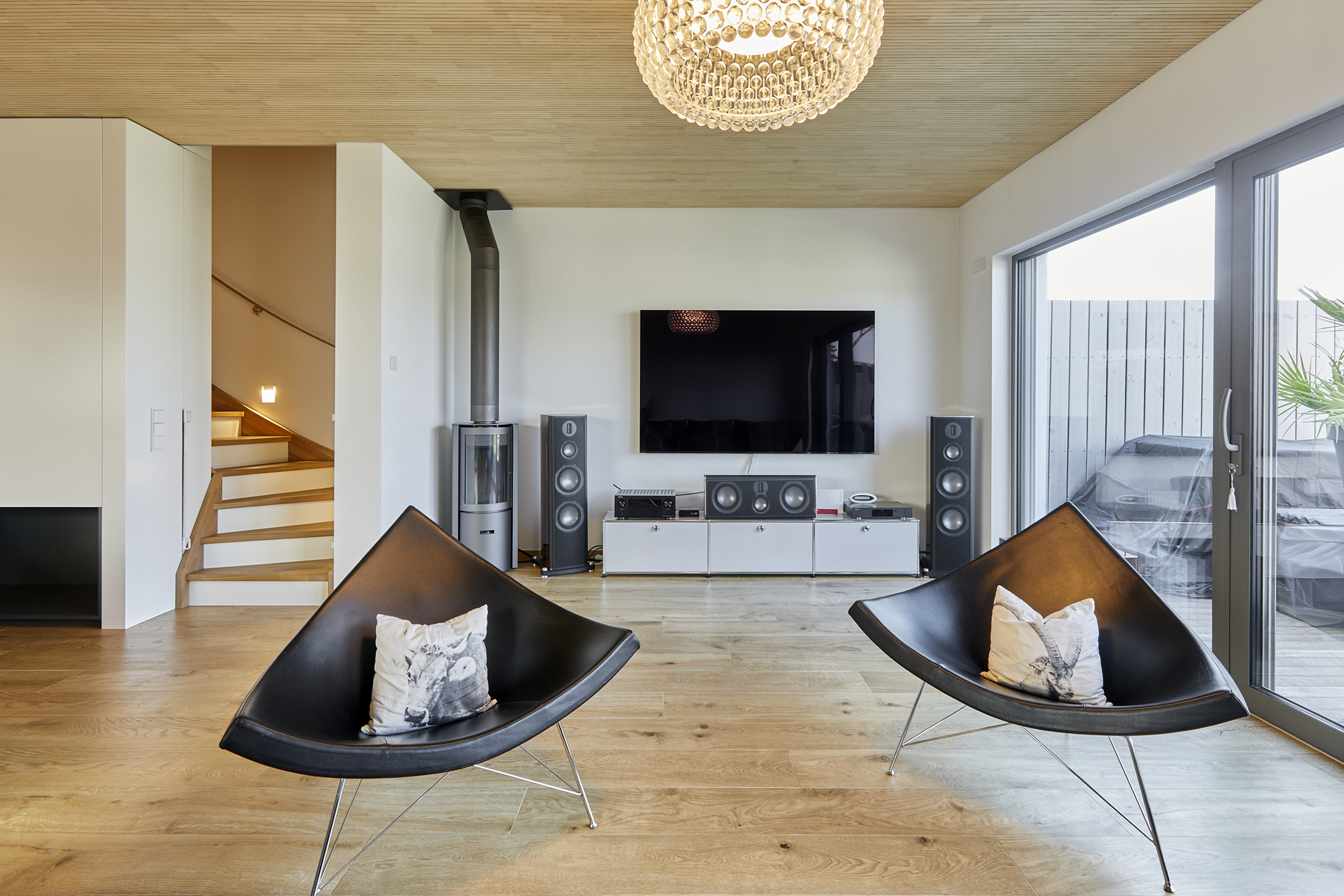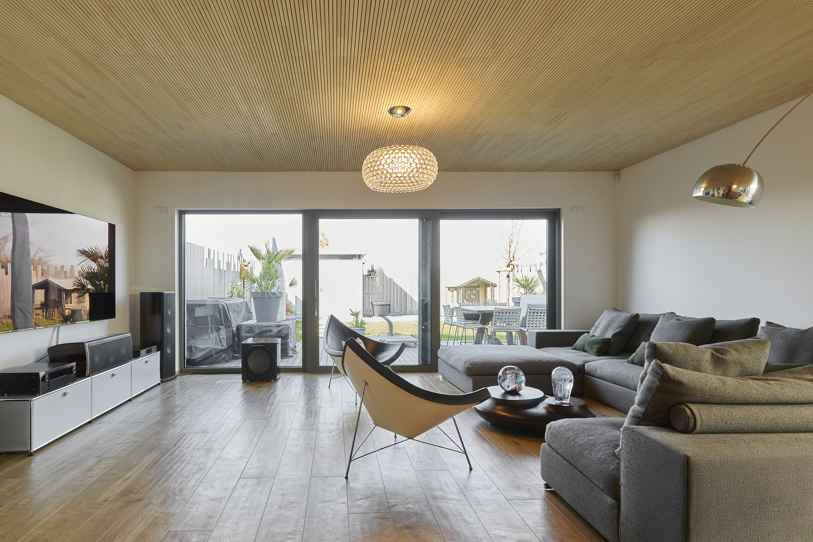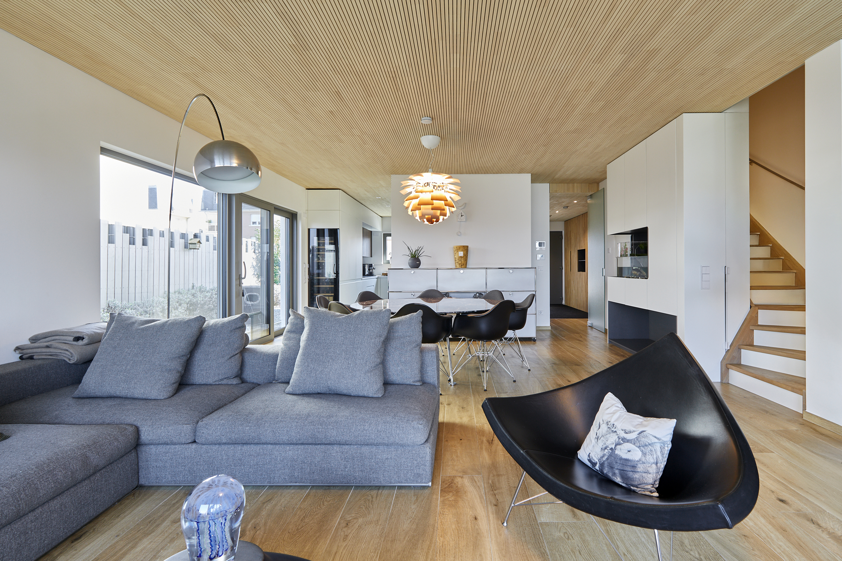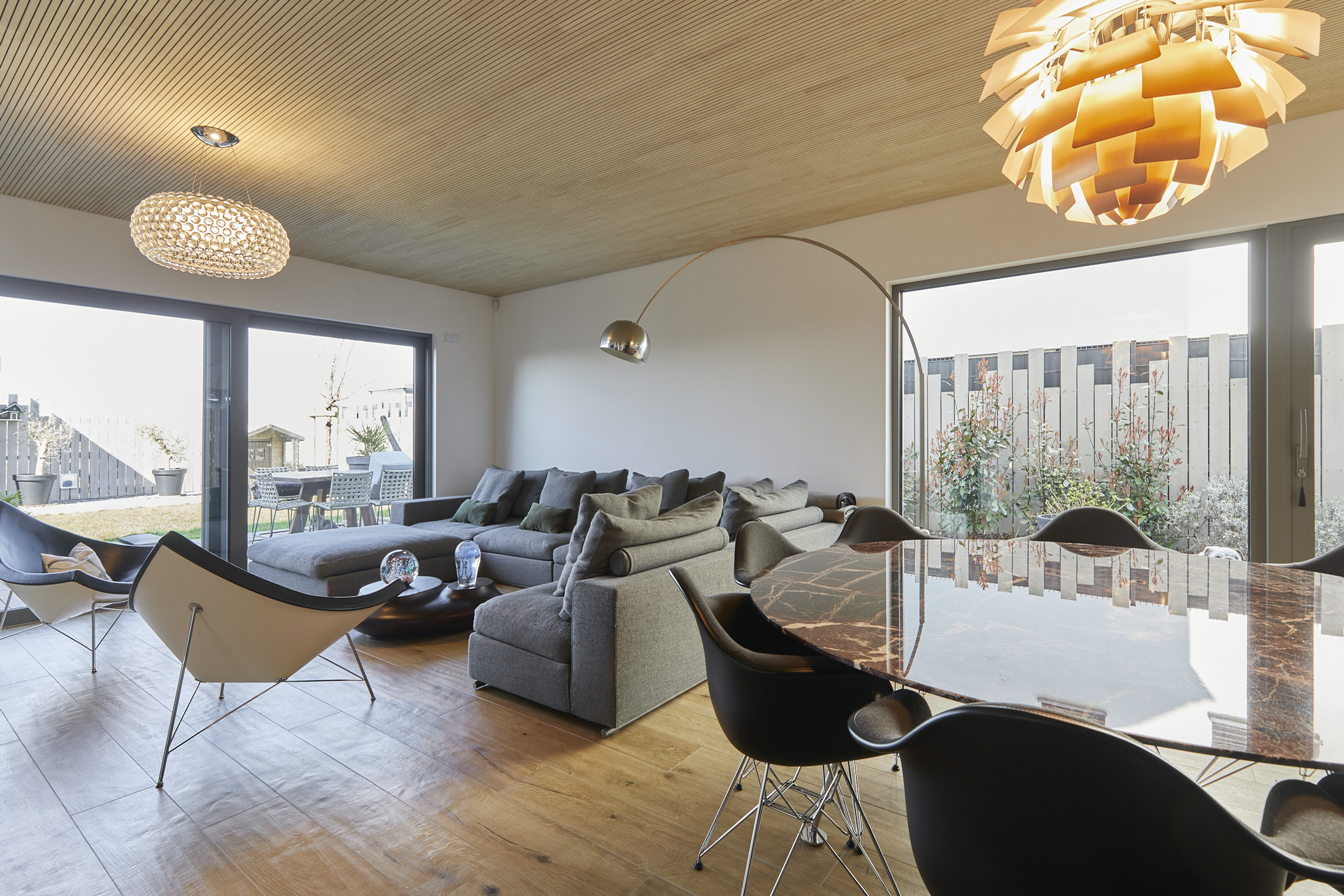 From the moment you enter, an elegant entrance hall with custom-made oak joinery leads into a bright and spacious living area. Large sliding glass doors open seamlessly onto the terrace and fully enclosed garden. The Lignotrend ceiling, known for its acoustic performance, along with the fireplace, creates a warm and refined atmosphere.