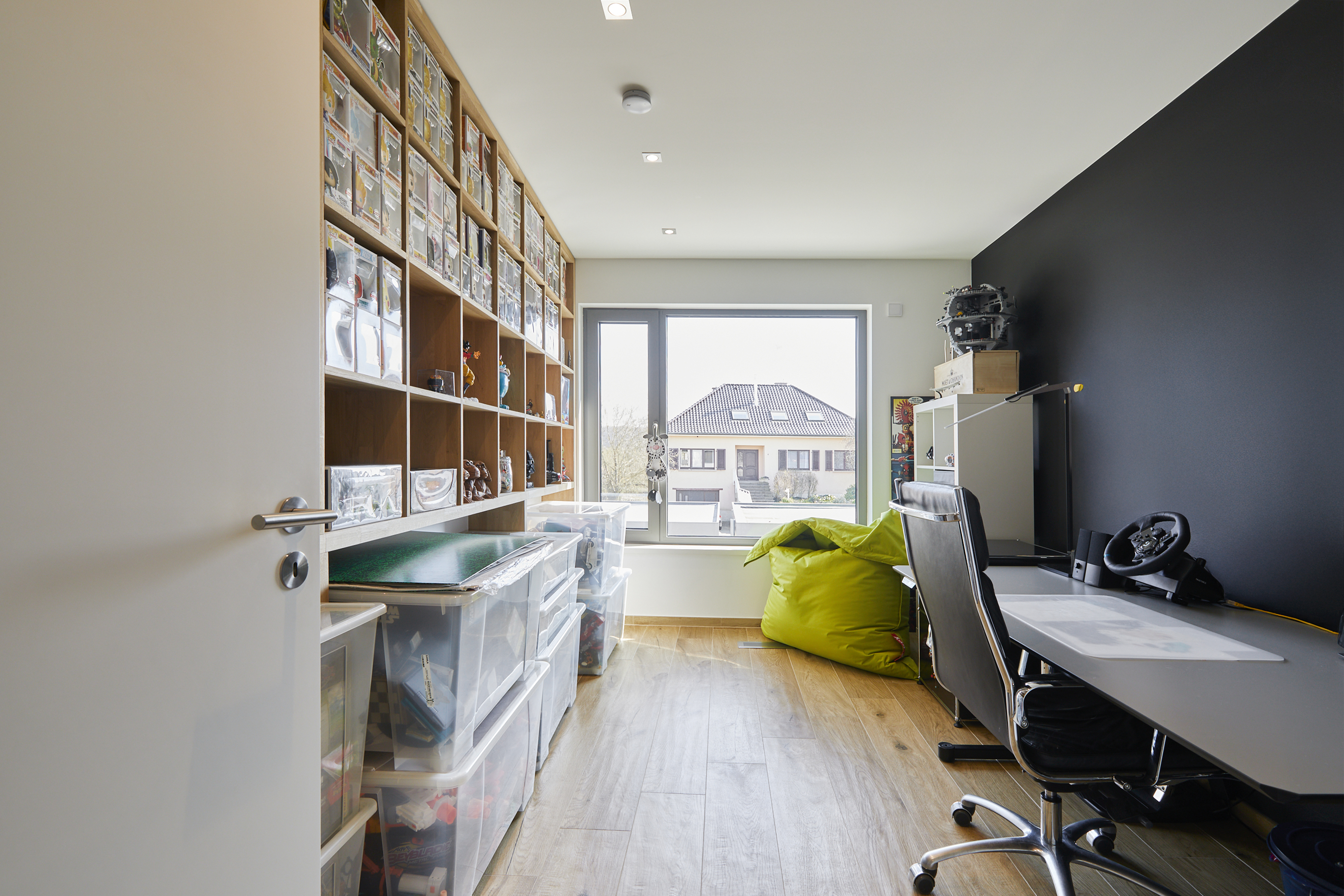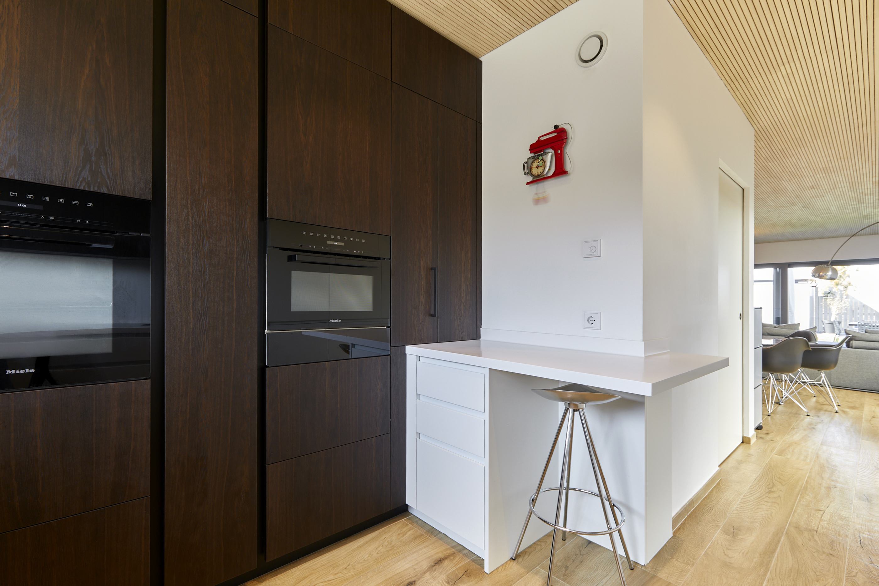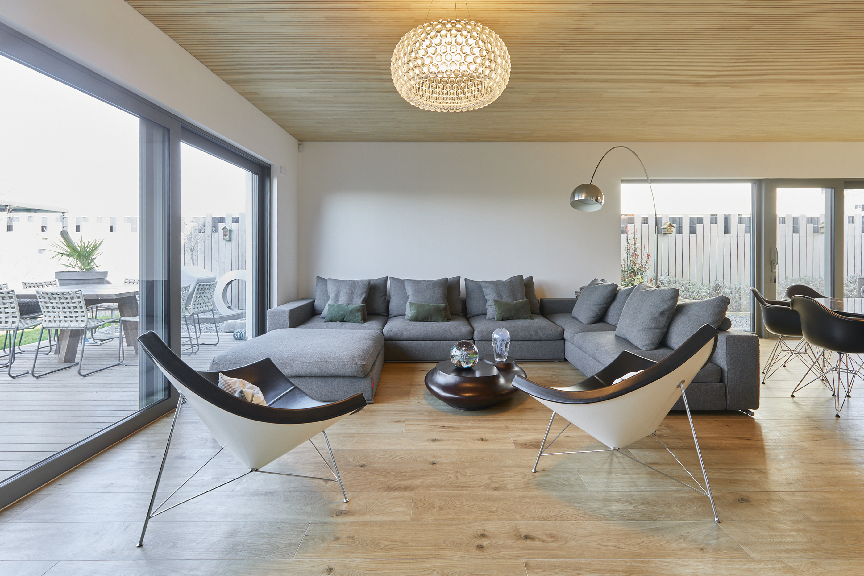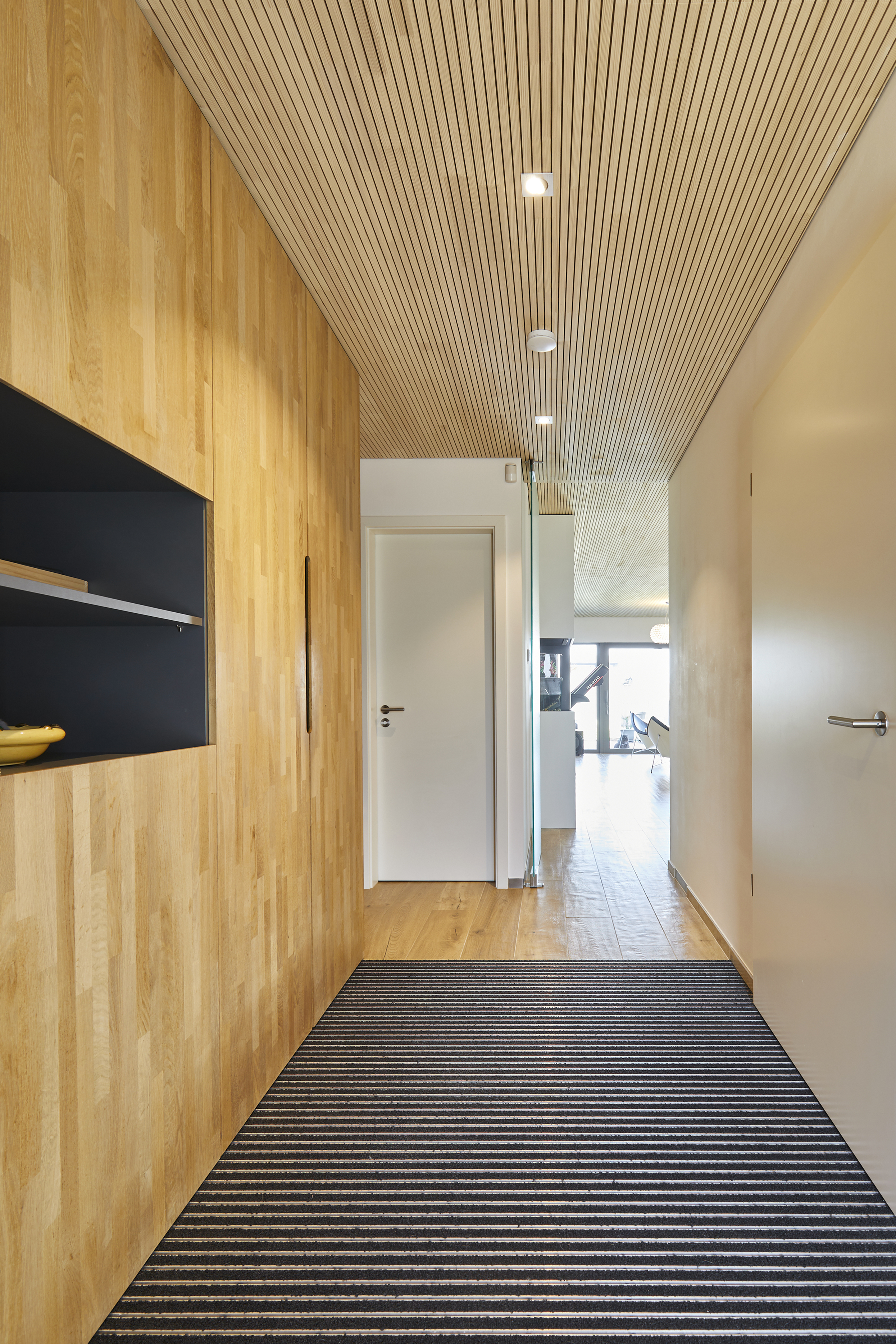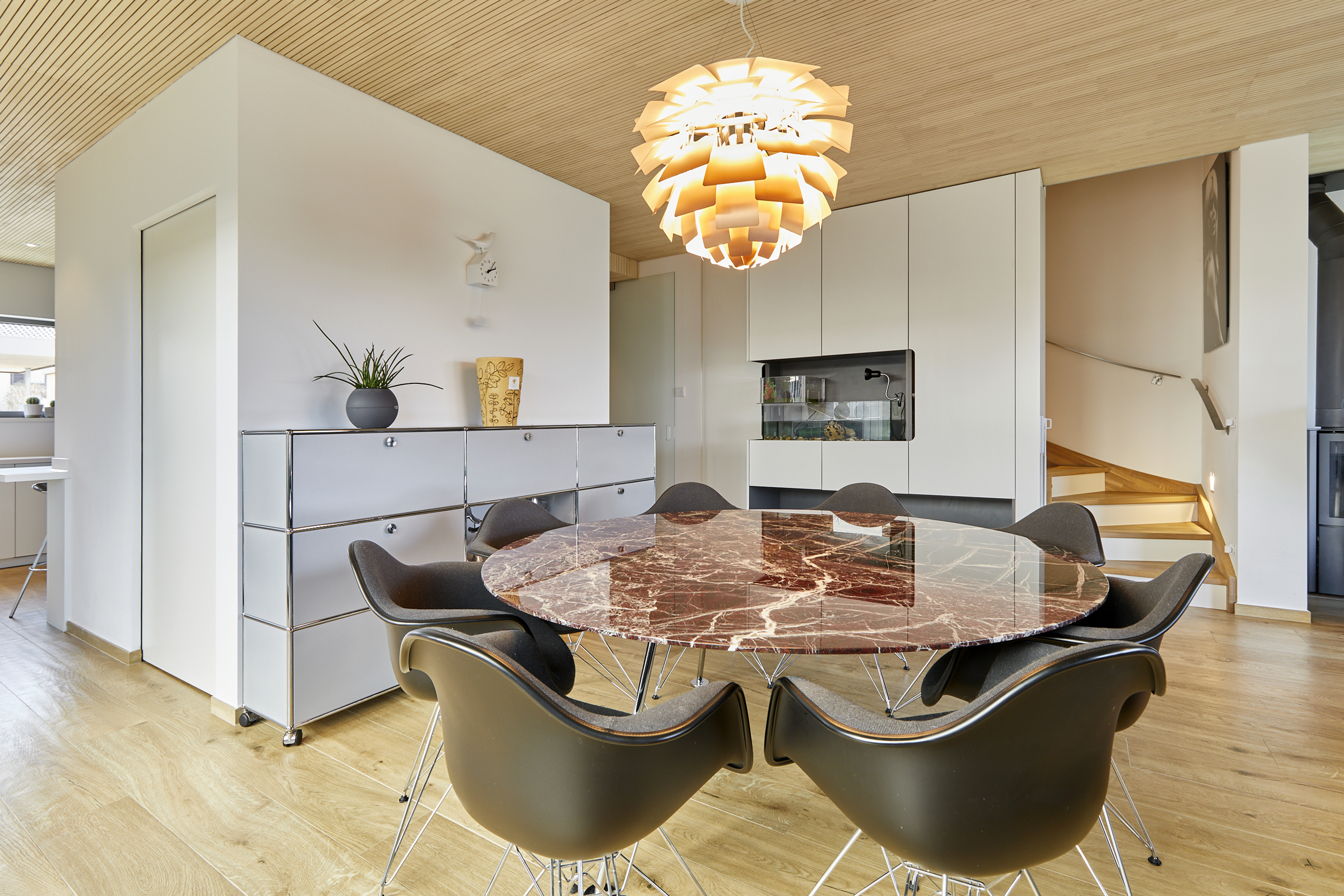 From the moment you enter, an elegant entrance hall with custom-made oak joinery leads into a bright and spacious living area. Large sliding glass doors open seamlessly onto the terrace and fully enclosed garden. The Lignotrend ceiling, known for its acoustic performance, along with the fireplace, creates a warm and refined atmosphere.