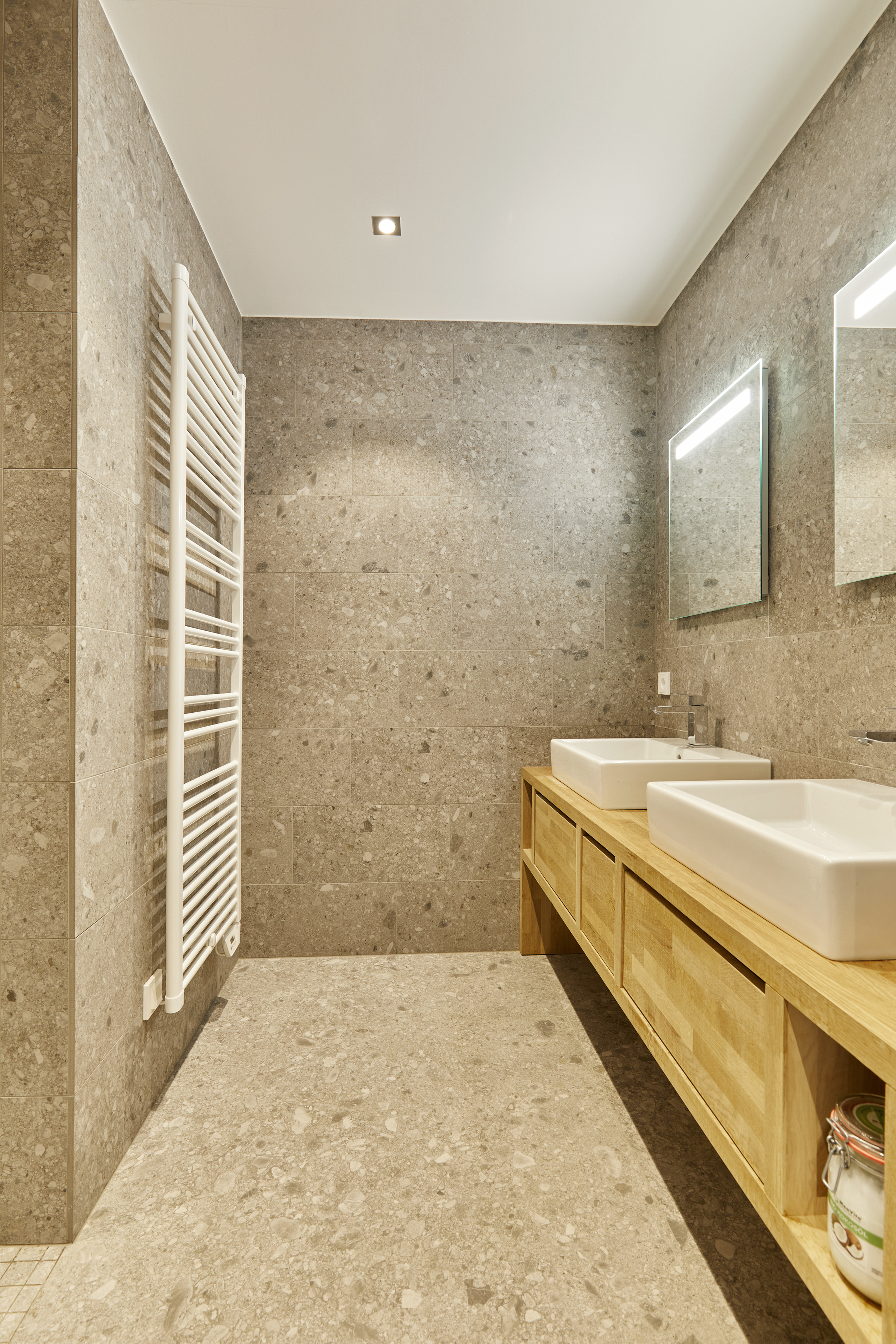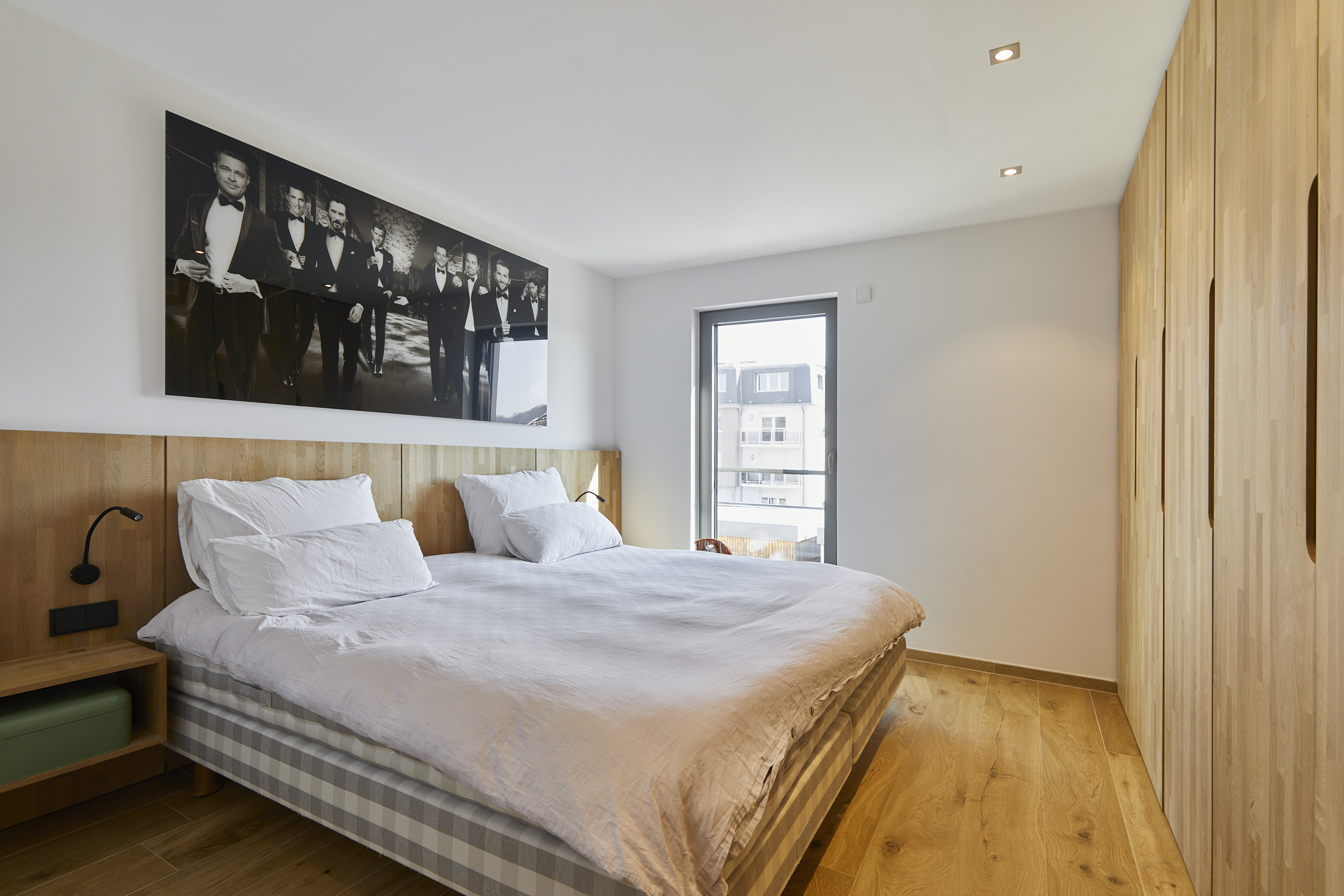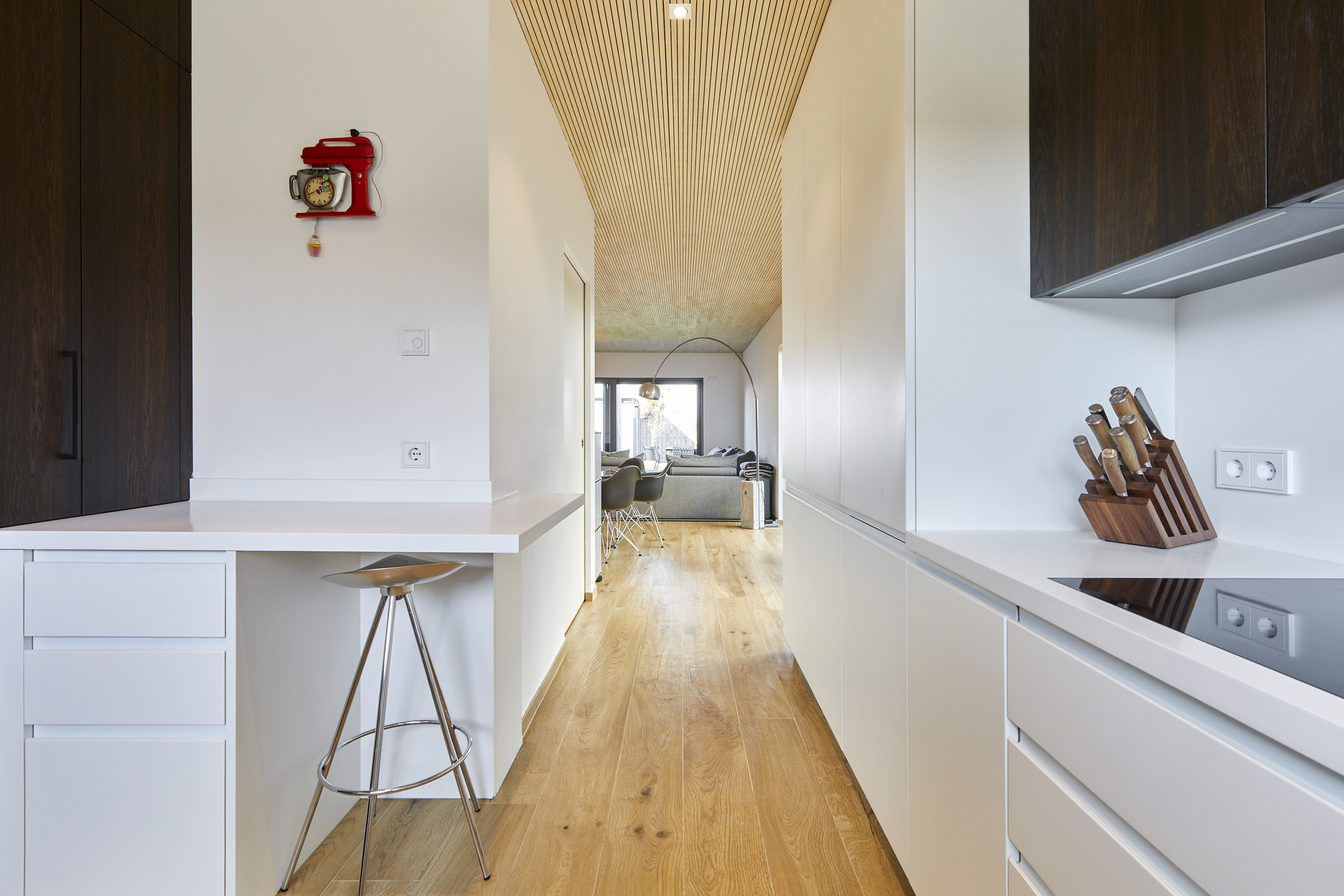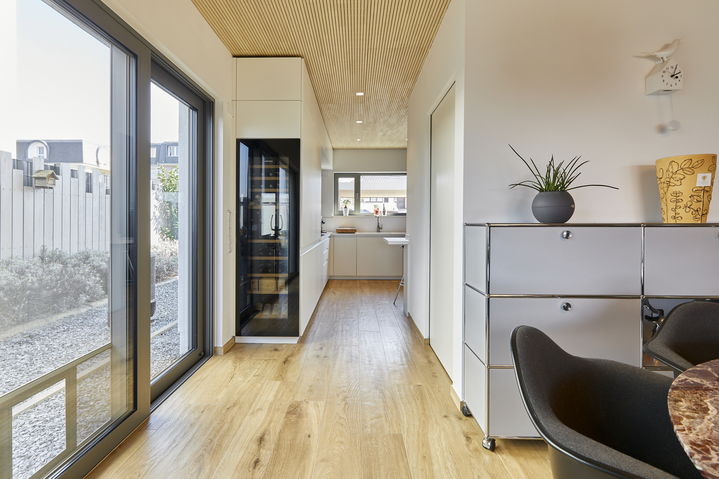 From the moment you enter, an elegant entrance hall with custom-made oak joinery leads into a bright and spacious living area. Large sliding glass doors open seamlessly onto the terrace and fully enclosed garden. The Lignotrend ceiling, known for its acoustic performance, along with the fireplace, creates a warm and refined atmosphere.