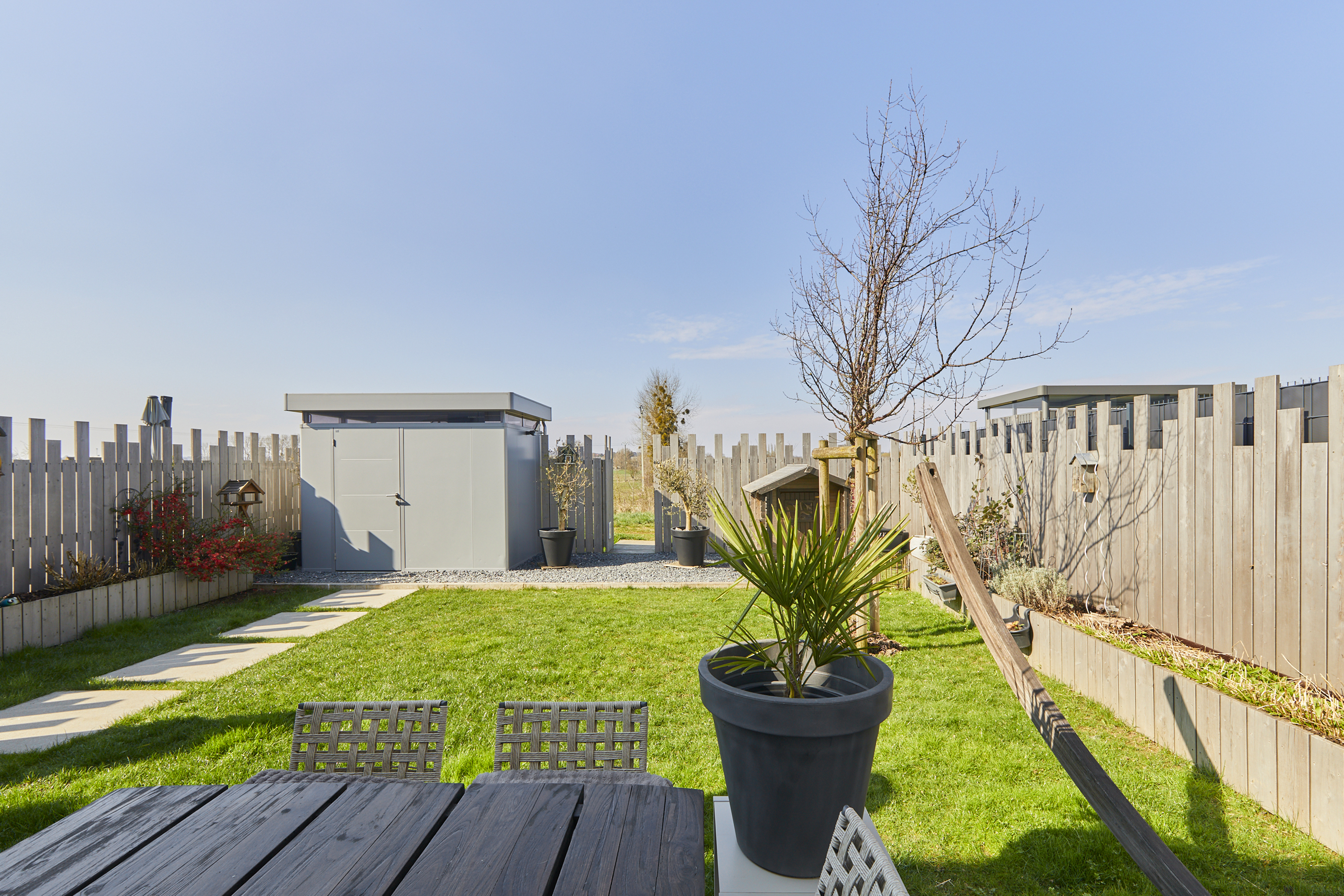 The outdoor areas have been carefully landscaped, featuring a fully enclosed garden opening onto a protected green zone at the rear, several terraces, and a double garage equipped with electric vehicle charging stations.