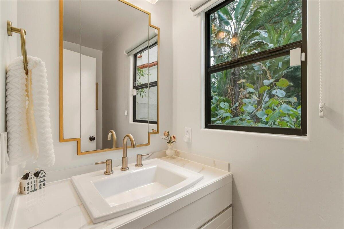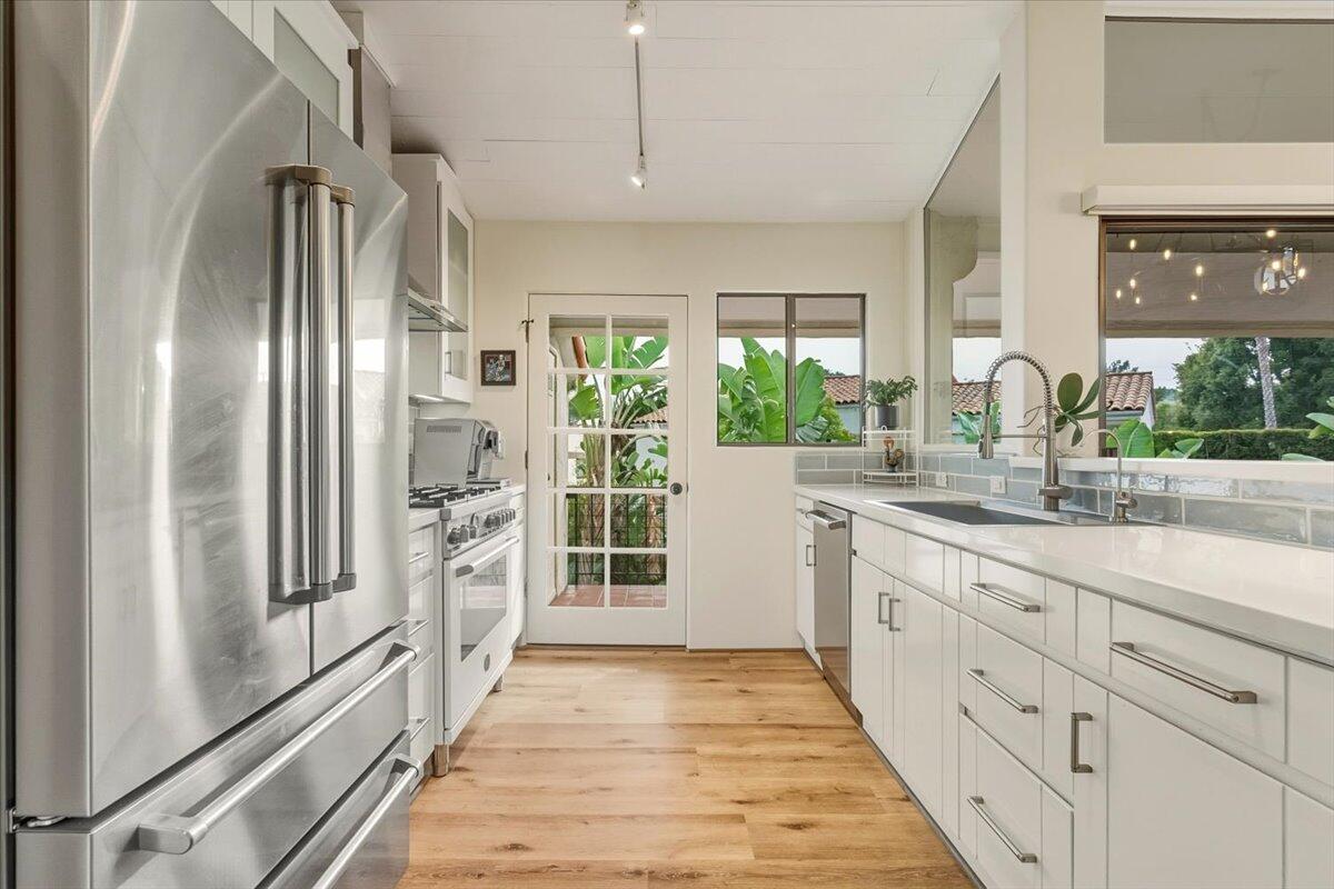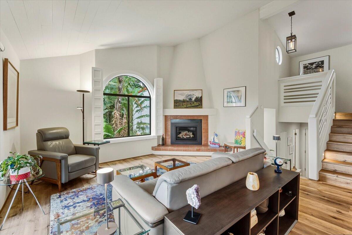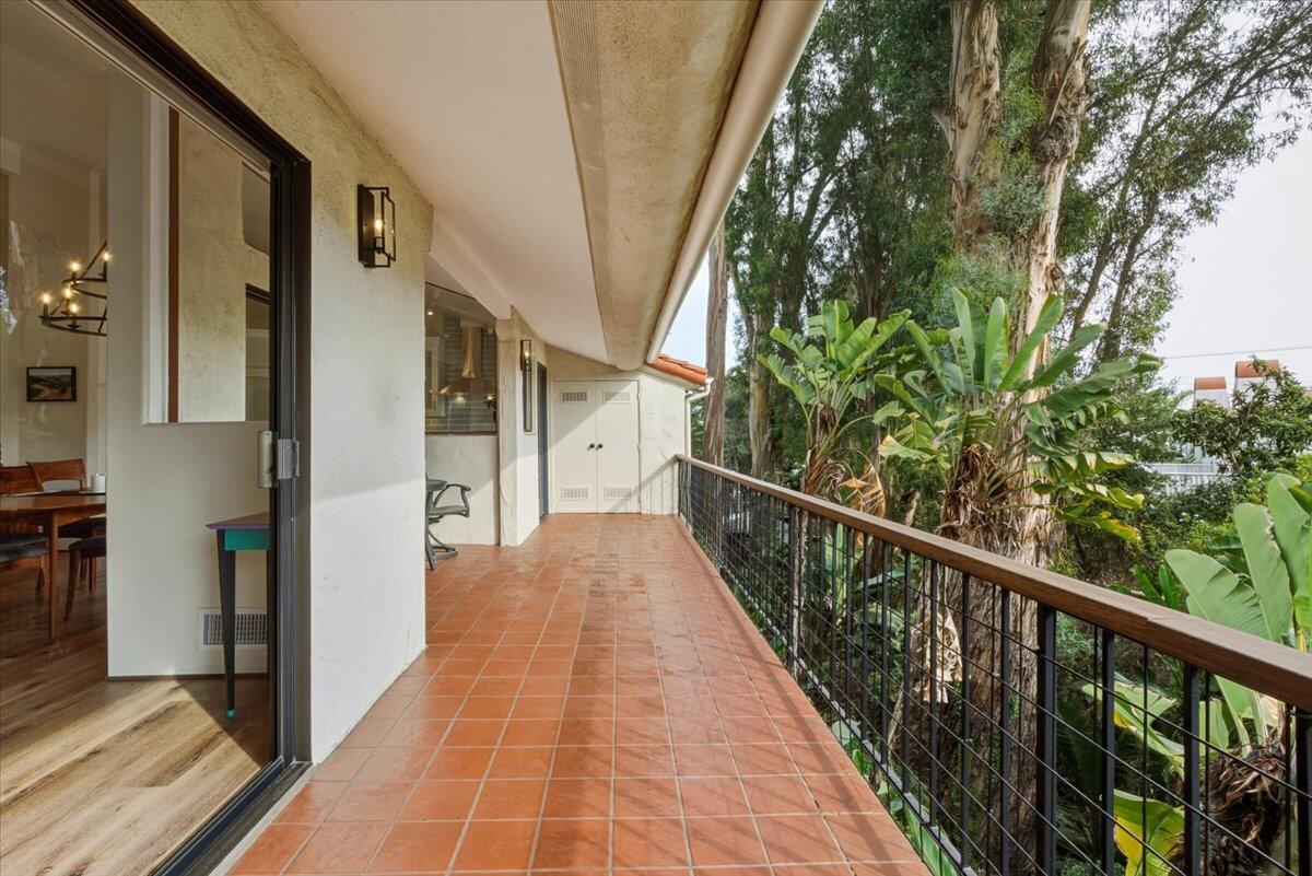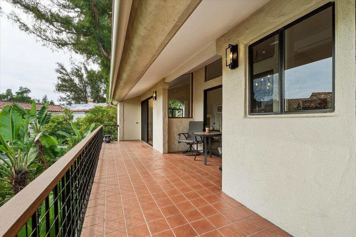 Lower Riviera European Charm. An exclusive La Muralla residence with elevated finishes throughout. Set beyond a long, private approach, this light-filled residence offers a rare sense of seclusion within one of Santa Barbara's most central and desirable neighborhoods. Tucked within an intimate, architecturally cohesive community, the home feels peacefully removed while remaining moments from downtown, the Upper East, and the city's cultural destinations. South-facing and thoughtfully designed, the nearly 2,000-square-foot, tri-level home features three bedrooms and two-and-a-half bathrooms with expansive windows framing tranquil views of the surrounding barranca. The setting provides exceptional privacy and a calming connection to nature which is an increasingly rare offering so close to Santa Barbara's vibrant amenities. The main level living spaces are warm and refined, anchored by a gas fireplace and enhanced by motorized roller shades for effortless light control. The kitchen is ideal for both daily living and entertaining, featuring Italian Bertazzoni appliances, quartz countertops, a walk-in pantry, Thor wine cooler, and a WaterDrop tankless reverse osmosis water system. Outdoor living is seamlessly extended by a tiled upper balcony and lower balcony finished with bamboo thermo decking and railings. The upper level primary suite serves as a peaceful retreat with custom wardrobe cabinetry and a spa-inspired bath featuring a semi-frameless shower enclosure, walk-in shower, and soaking tub. Additional highlights include Invisible Smart Locks for keyless entry and an ADT security system with camera. Offering a combination of privacy, thoughtful upgrades, and proximity to Santa Barbara's cultural and lifestyle amenities, this exceptional home offers elevated living in a setting that feels both tranquil and connected.