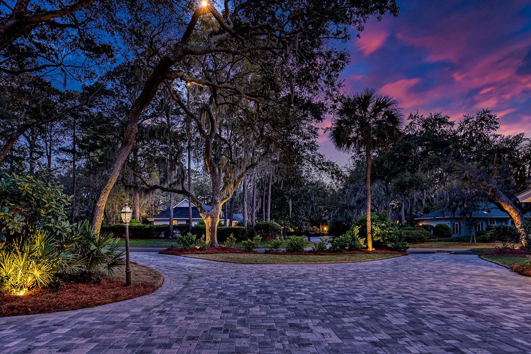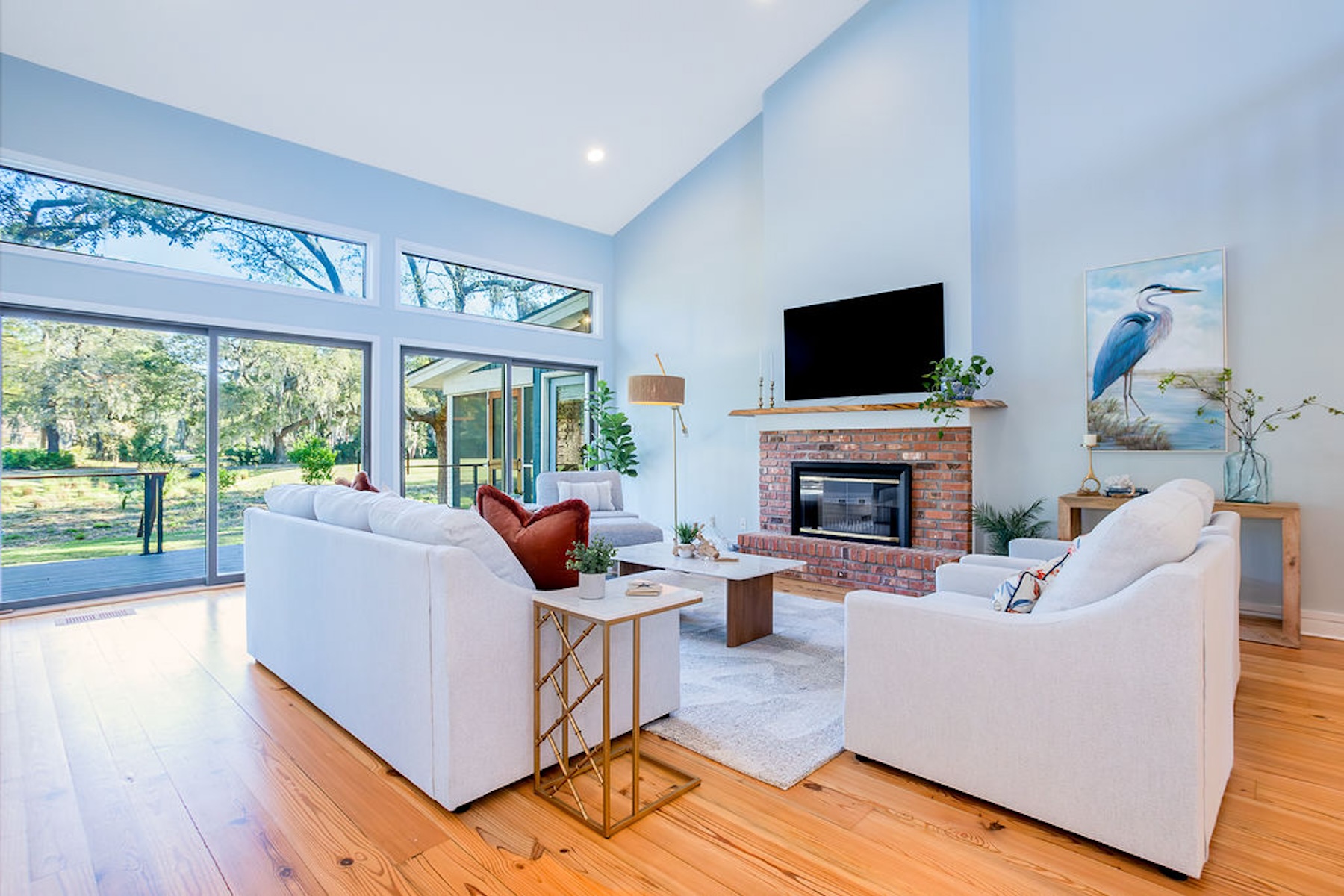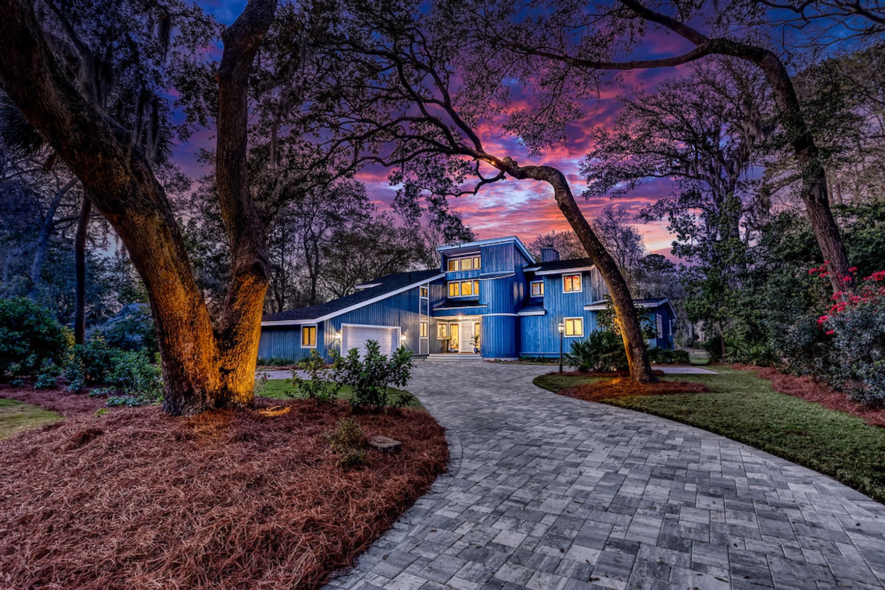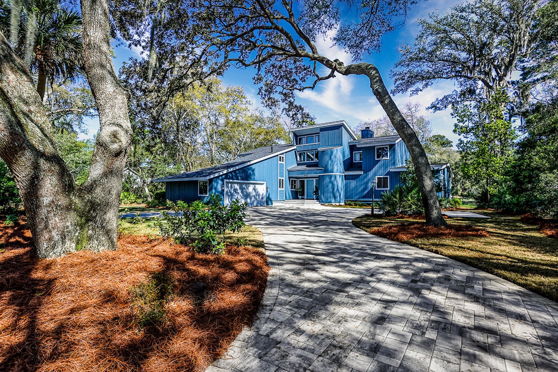 Double lot premium, move-in ready Landings home recently remodeled by Josh Waters Building & Design. The residence sits on over a half-acre of John Glenn landscaped property with quiet views of #2 Terrapin Point tee box & lagoon. A Monaco paved driveway circles the entry to an art deco homesite surrounded by ancient live oaks. The floorplan features heart pine floors throughout a renovated main floor with new kitchen & wet bar, laundry, 1.5 bathrooms, bedroom and oversized primary suite. Kitchen highlights include ceiling height backsplash tile, 48” Fulgor gas range, warming oven, Monogram refrigerator, marble & red oak tops & custom cabinetry; ensuite highlights include walk-in steam shower, standalone tub, Marsh brand double vanity and walk-in closet with quartzite topped island. 2 additional ensuite bedrooms upstairs complete the floor plan. A sunroom and 2 Timbertech laced porches (covered & non) extend hospitality space with views. All major home maintenance (roof, HVAC, 2 tankless gas water heaters, encapsulated crawlspace, paint) and bonuses (landscape lighting, irrigation, well) are new. Within the gated Landings community, the location provides daily lifestyle opportunities: 5 minute golf cart ride to Palmetto club for dining & club sports or to Delegal Marina and the iconic Intercoastal Waterways.
