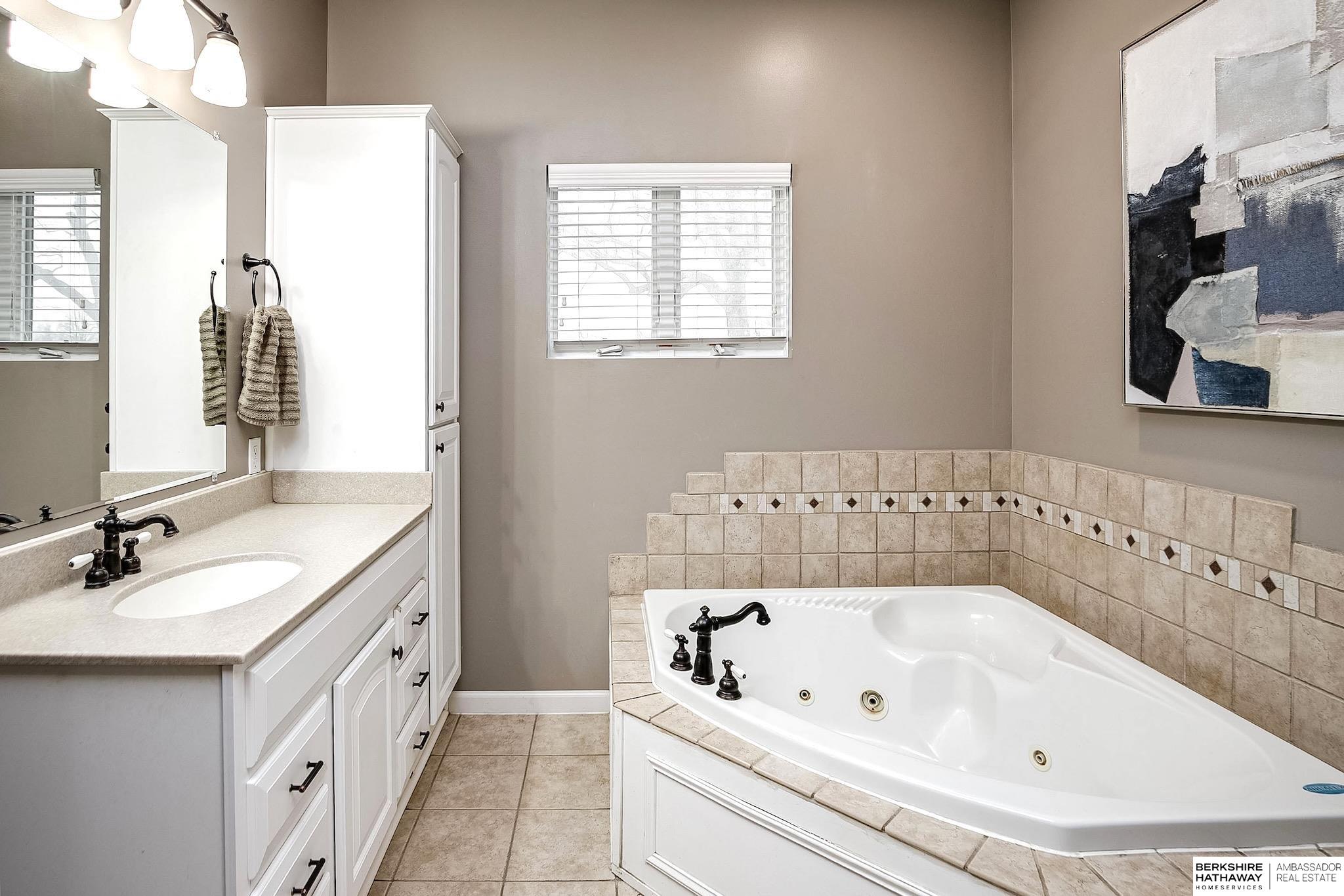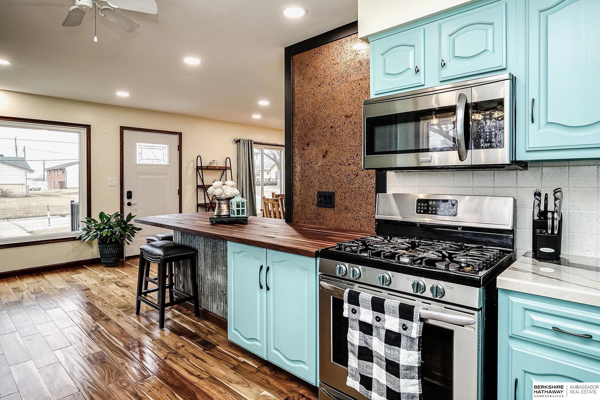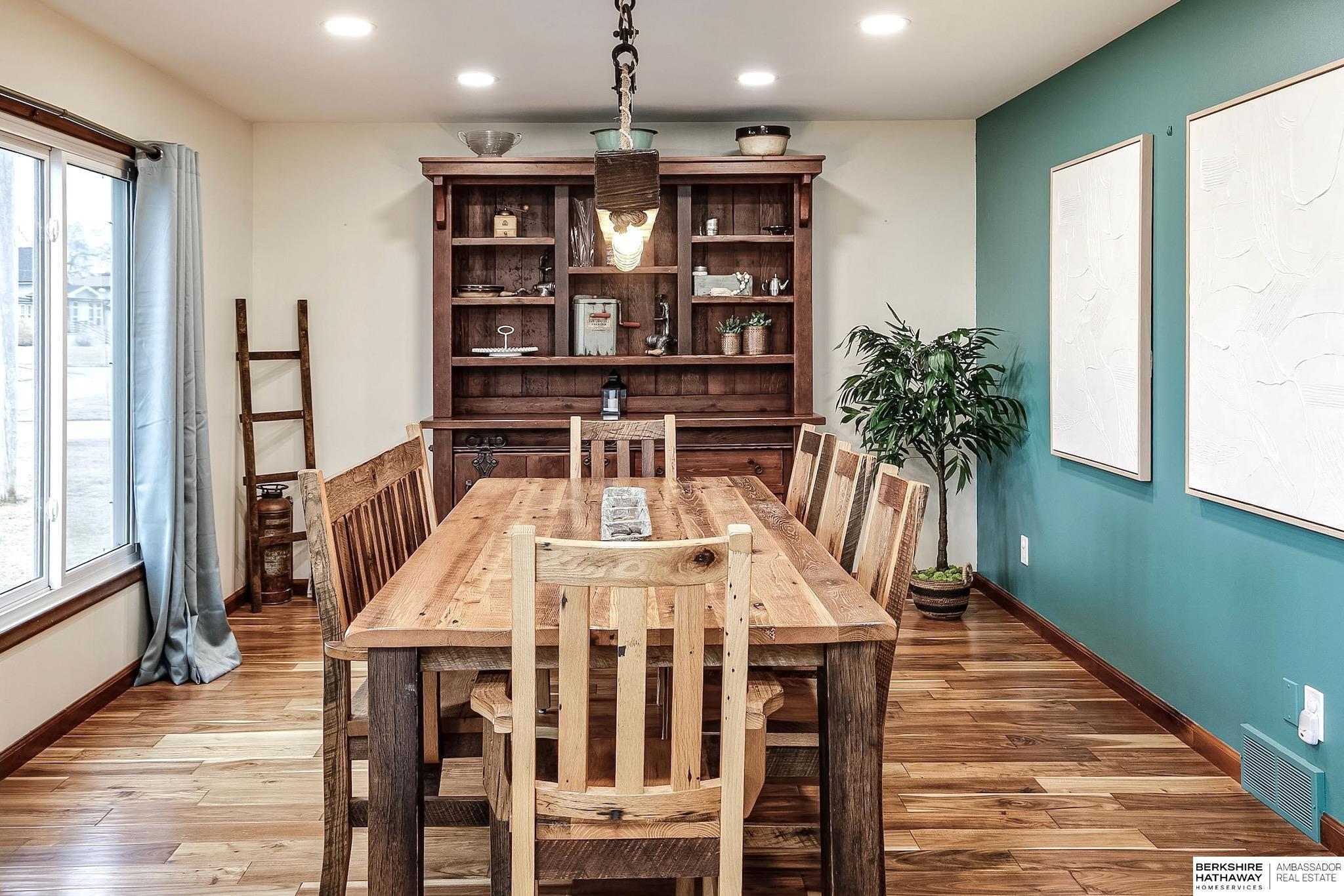 Rare 4 bed 3 bath ranch in Yutan! This home sits on a 1/3 of an acre corner lot in charming small town. Featuring over 3200 sq ft- Main floor includes updated kitchen and dining area with stunning hardwood floors, custom butcher block peninsula and painted cabinets- tons of storage, gas range and huge picture windows. 4 generously sized bedrooms + updated hall bath. Primary bedroom with en suite bathroom with whirlpool tub + shower. Huge walk-in closet + access to private deck. Walkout lower level features living area with tons of natural light + heated tile floors. Flex room perfect for exercise room or additional storage. Laundry room area set up with kitchenette. Updated windows, maintenance free siding, oversized 2 car garage + sprinklers, 2 new composite decks. Don't miss this one!