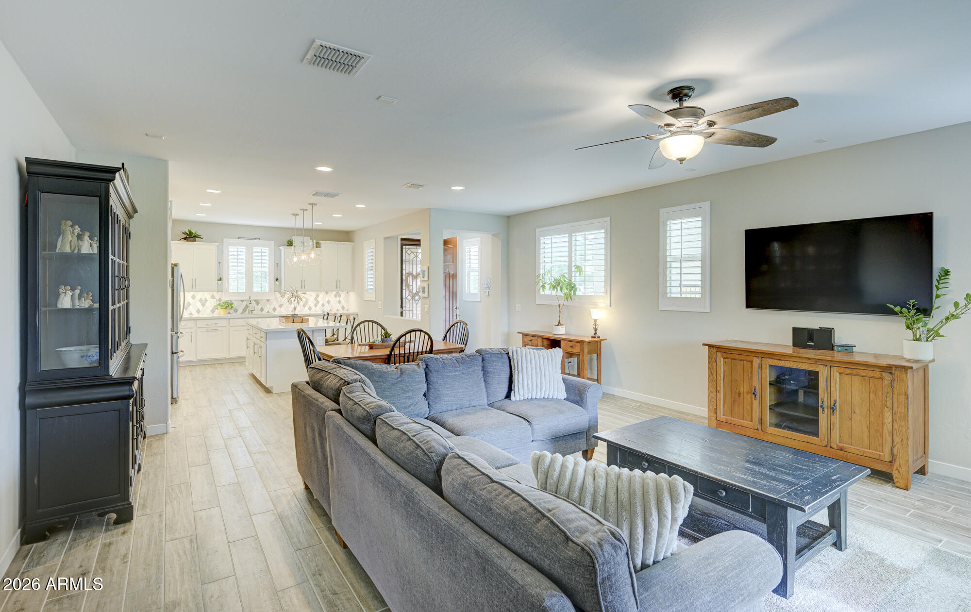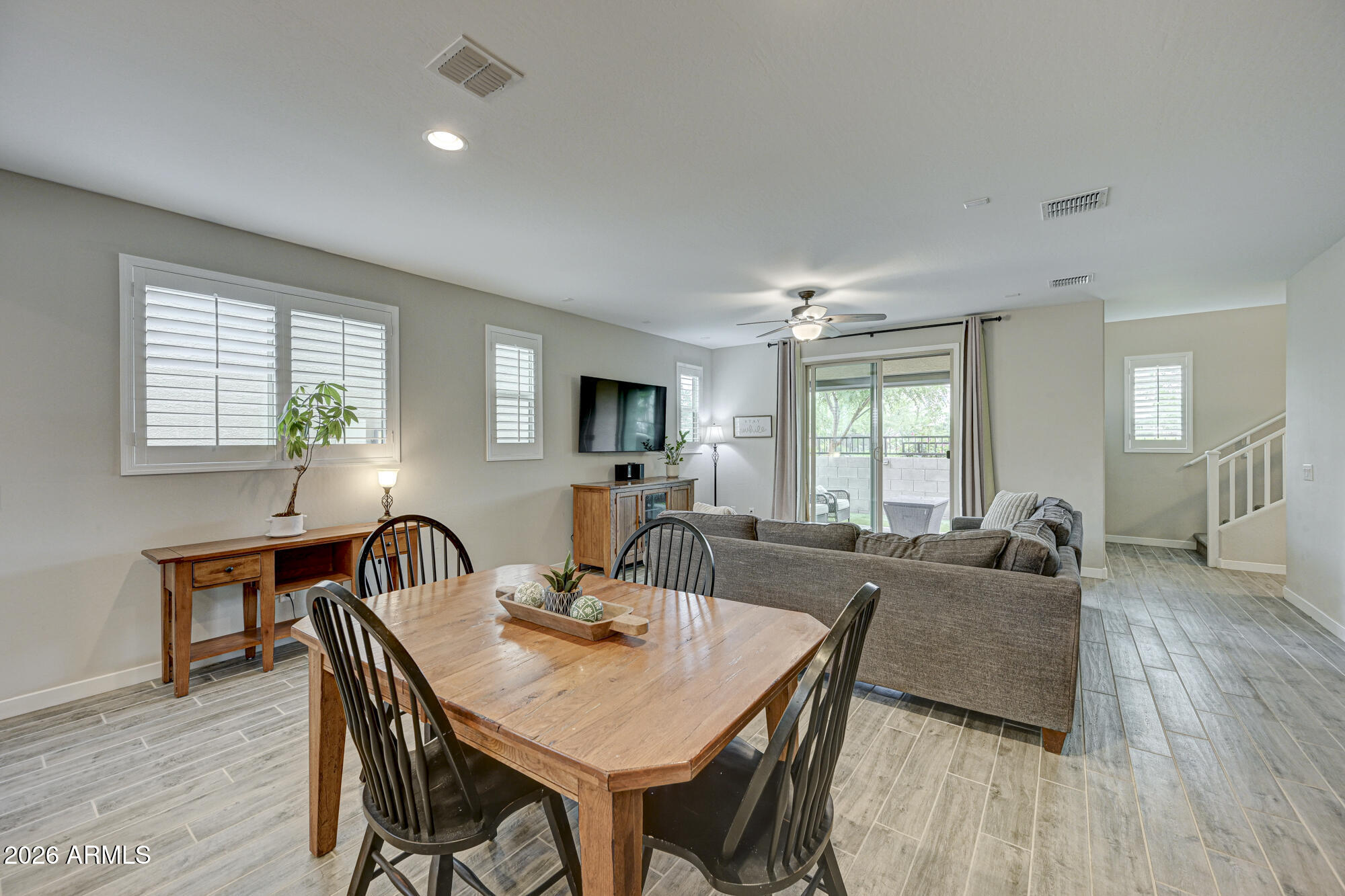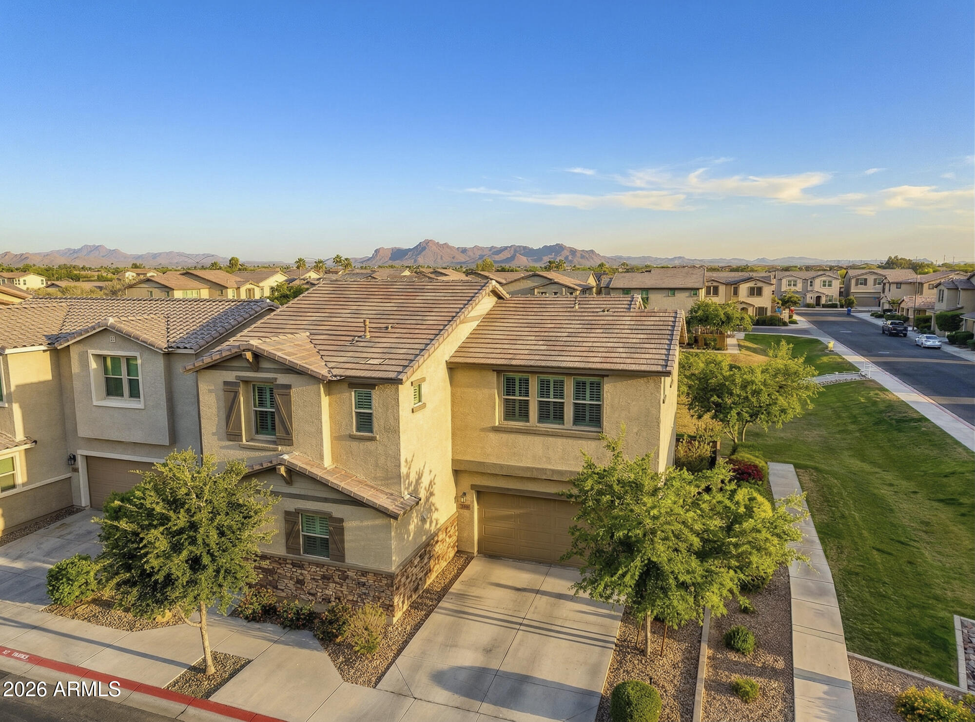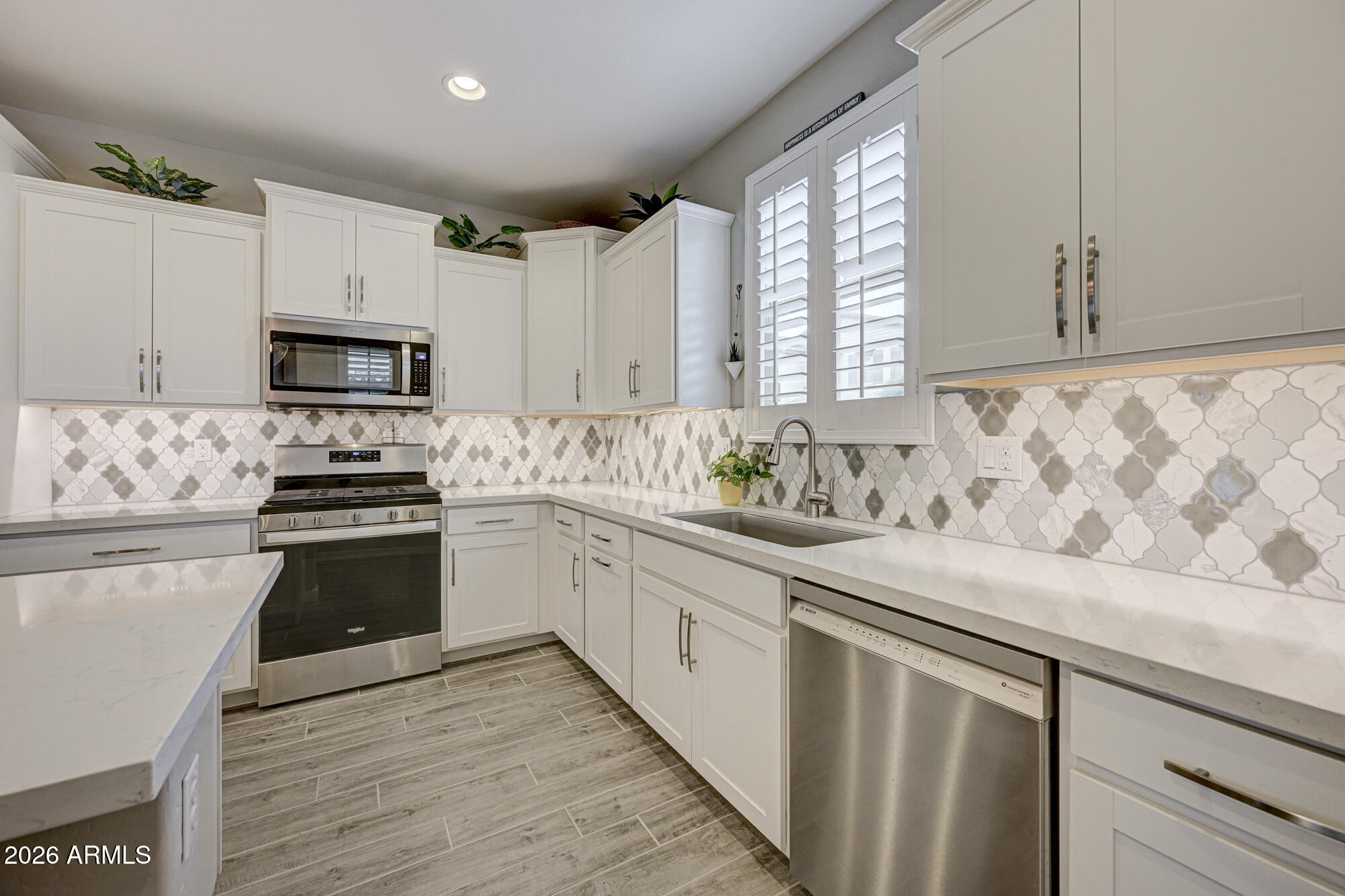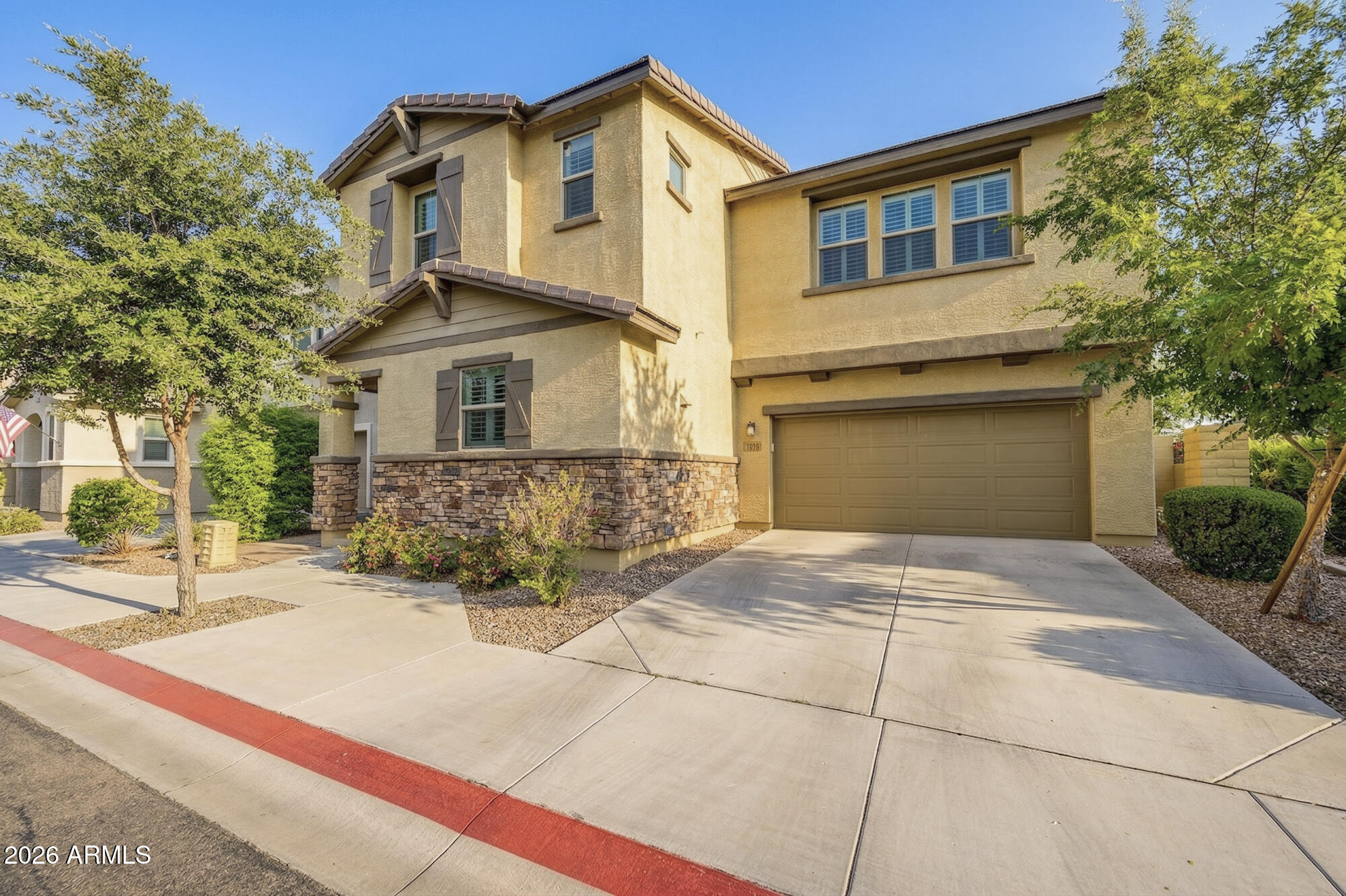 The open-concept layout allows the kitchen to flow gracefully into the living room perfect for refined entertaining and relaxed living. The main level is enhanced by rich wood-look plank tile flooring and elegant plantation shutters throughout.Upstairs, you'll find 4 generously sized bedrooms, 2 bathrooms, and a thoughtfully designed laundry room with custom cabinetry. The owner's suite is elevated with a generous walk-in closet, separate tub/shower, and a dual vanity. Spacious secondary bedrooms offer comfort and functionality, each complete with ample closet space.Step outside to a private paver patio with view fencing overlooking open green space. Low-maintenance turf and an automatic shade create the perfect blend of comfort, privacy, and outdoor enjoyment.Residents of Tavera South enjoy a low-maintenance lifestyle with exclusive access to private amenities, including a pool and spa, ramada, and tot lot--all within a secure and peaceful gated setting.Ideally located near top-rated schools, recreation, and dining, with easy access to major freeways, this home offers the perfect balance of luxury, comfort, and convenience.