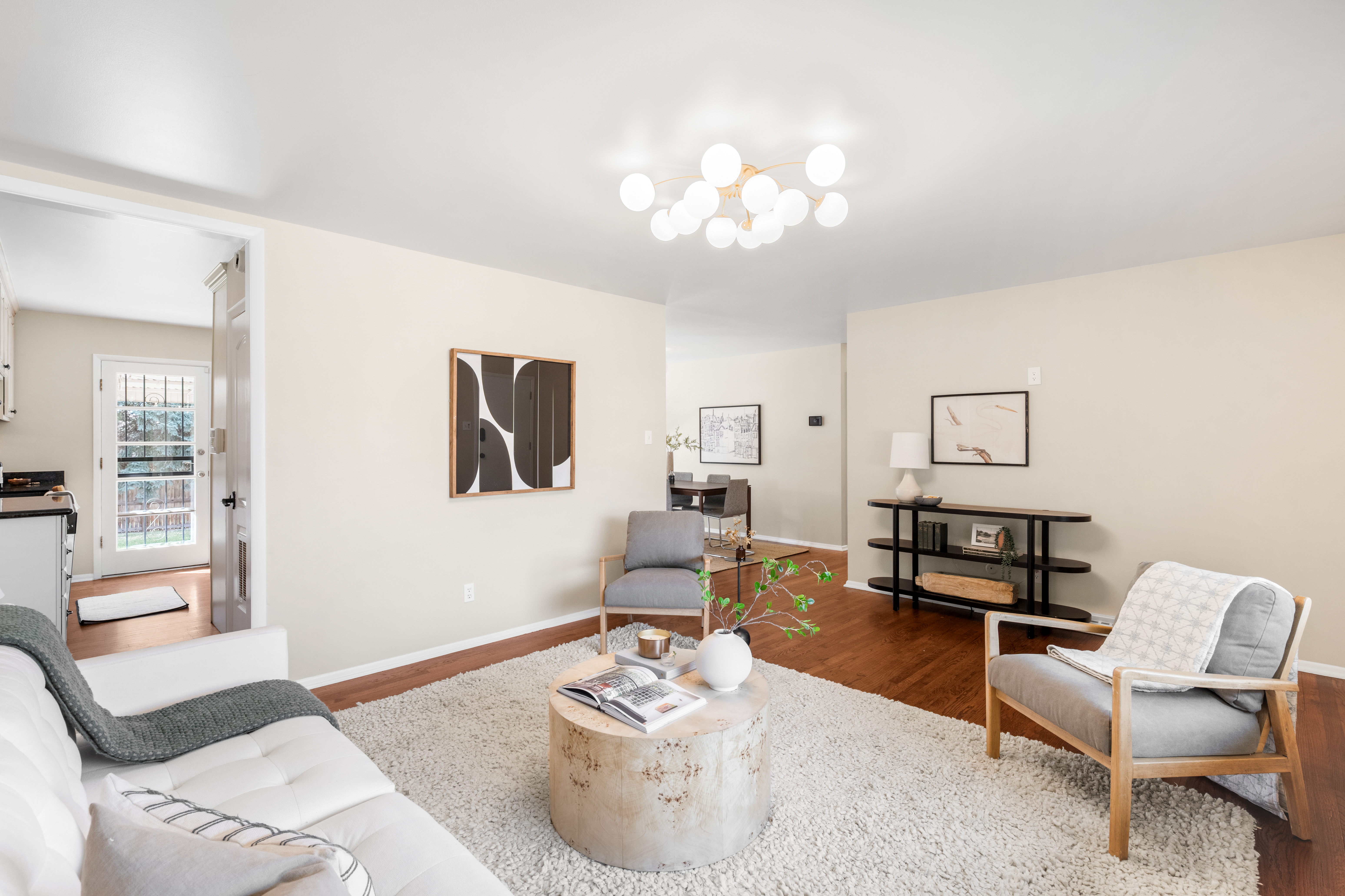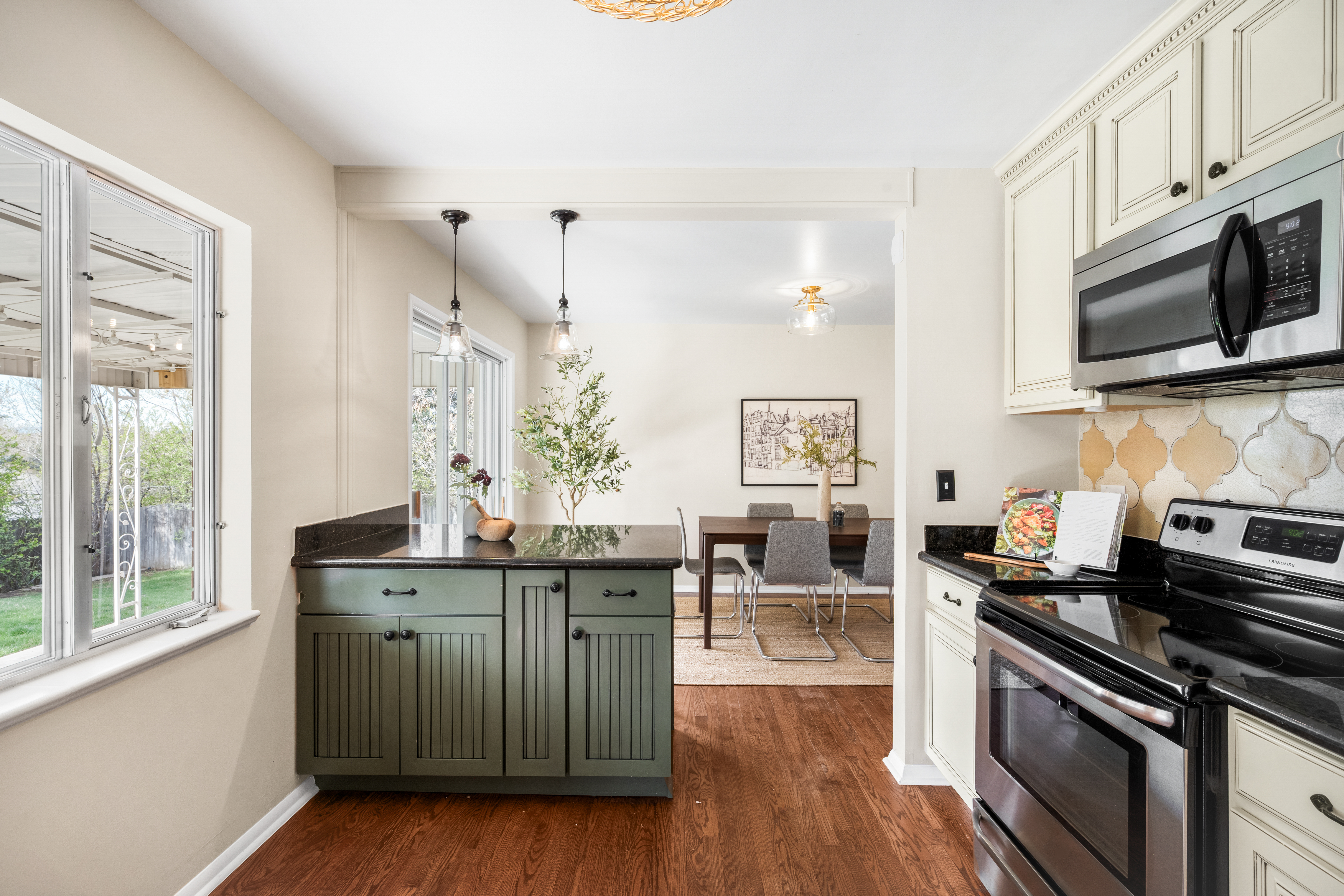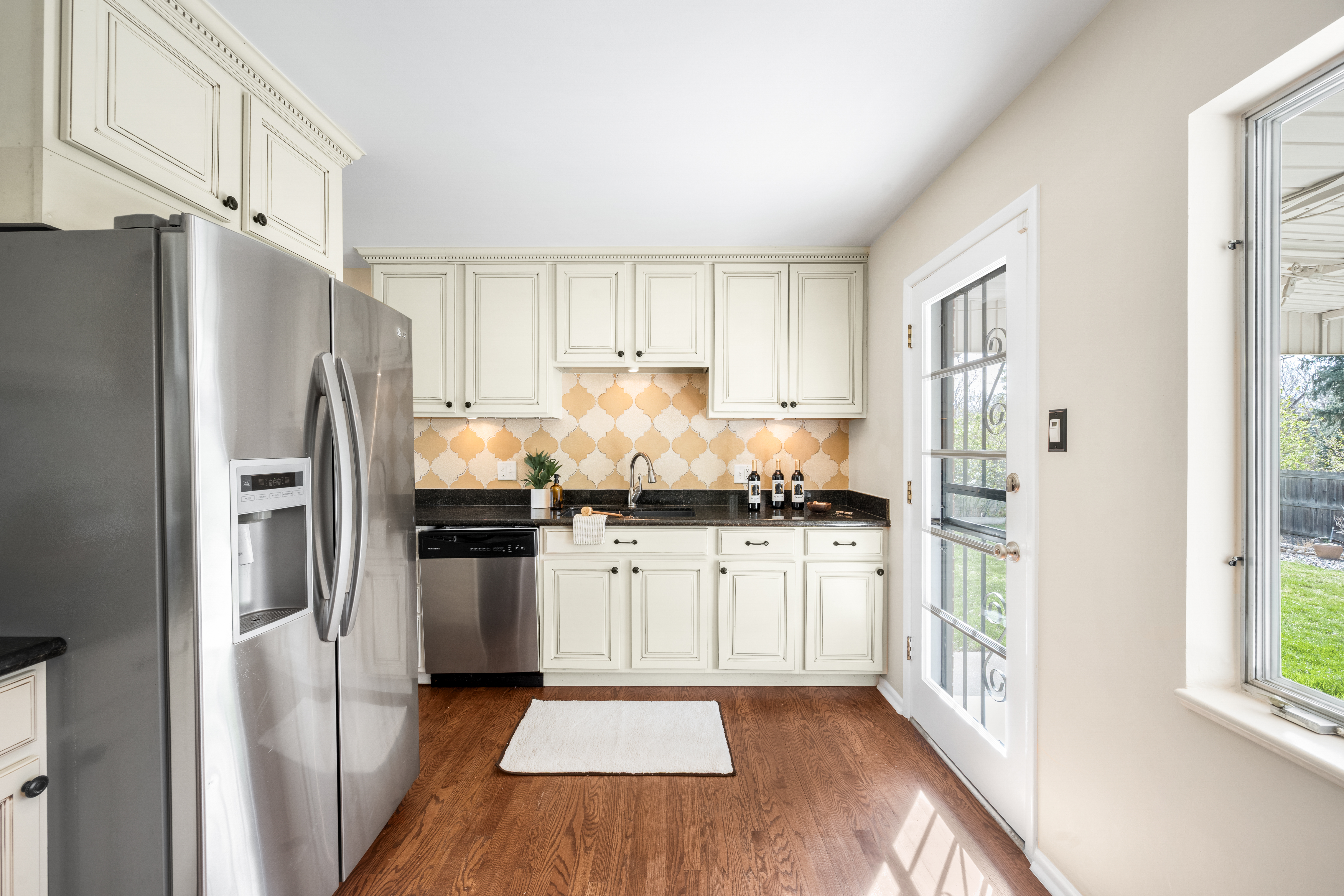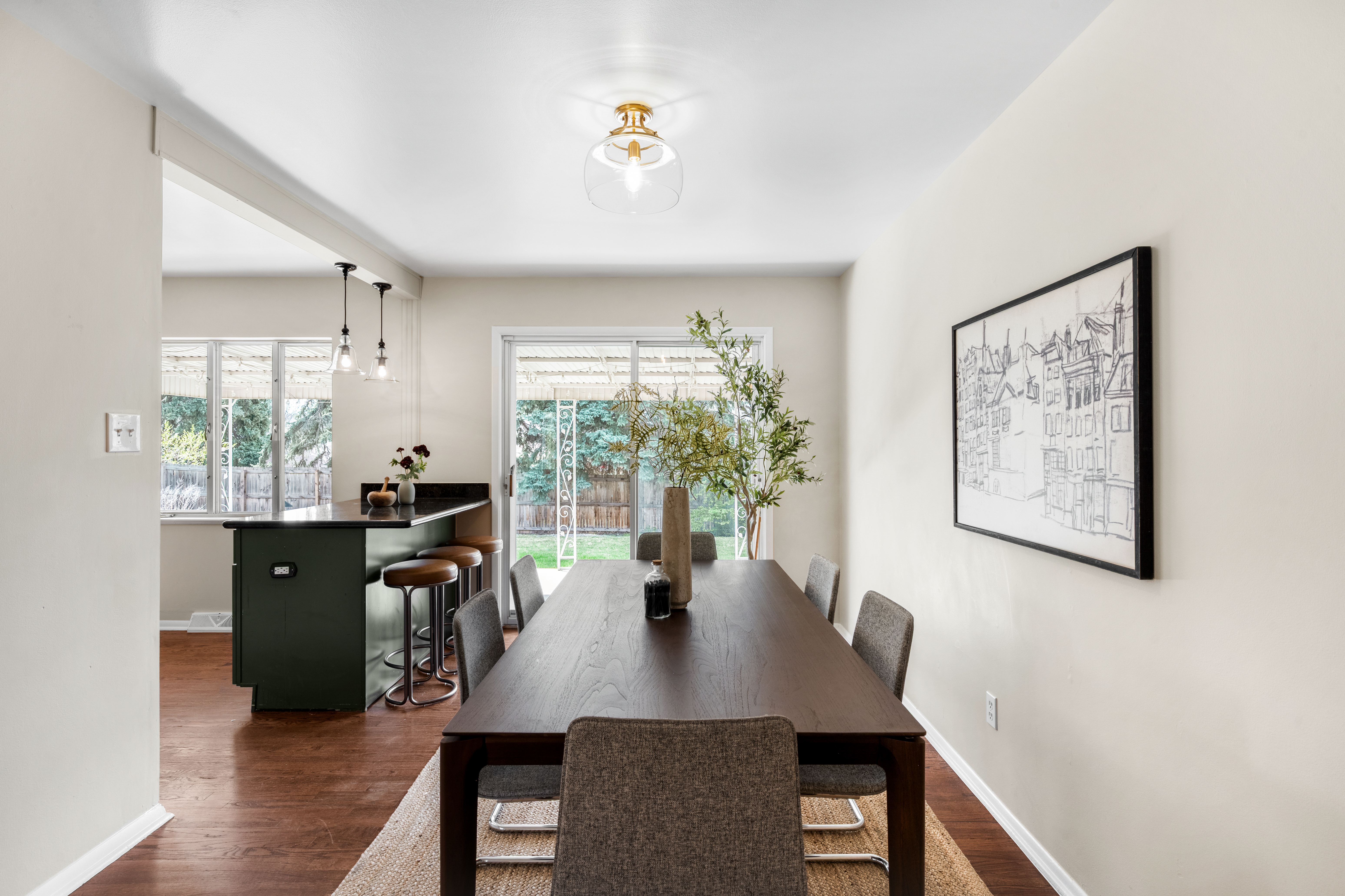 A timeless brick ranch with thoughtful updates and layered character, offering five bedrooms across two levels, three on the main level. Set on a spacious lot with a generous yard & hardwood floors throughout the main level, the living space is anchored by a wall of updated windows, filling the home with consistent natural light. An accent wall with intricate molding adds depth and sophistication, complemented by updated lighting throughout. The layout flows into a formal dining designed for gathering-featuring a built-in hutch with glass cabinetry for display + storage. Sliding glass doors open to the backyard, enhancing the home’s airy feel and creating effortless in-outdoor connection. The kitchen connects seamlessly, offering an eat-in island, granite countertops, stainless steel appliances, and full-height cabinetry with crown molding. A tiled backsplash adds personality, while picture windows frame backyard views. Direct access to the attached two-car garage-with built-in storage + workshop space-adds convenience. Three bedrooms are ideally situated on the main level. The primary suite features an en-suite bath and generous closet, while two additional main-level bedrooms share a full bath-creating a highly desirable layout. The lower level expands livability with secondary living space centered around a floor-to-ceiling brick, wood-burning fireplace + built-in shelving. The layout accommodates multiple zones-ideal for media or game space. Two additional bedrooms and a ¾ bath provide flexibility for guests or office space. A large utility/laundry room offers generous storage, built-in shelving, countertop space, and a utility sink. The backyard is expansive + private, featuring a large, fully fenced yard and covered concrete patio for year-round outdoor living-perfect for entertaining or quiet evenings. Ideally located with quick access to I-25 and I-225, moments from Cherry Creek Reservoir, Hampden Heights Park, and Whole Foods, and 15 mins to Cherry Creek.
