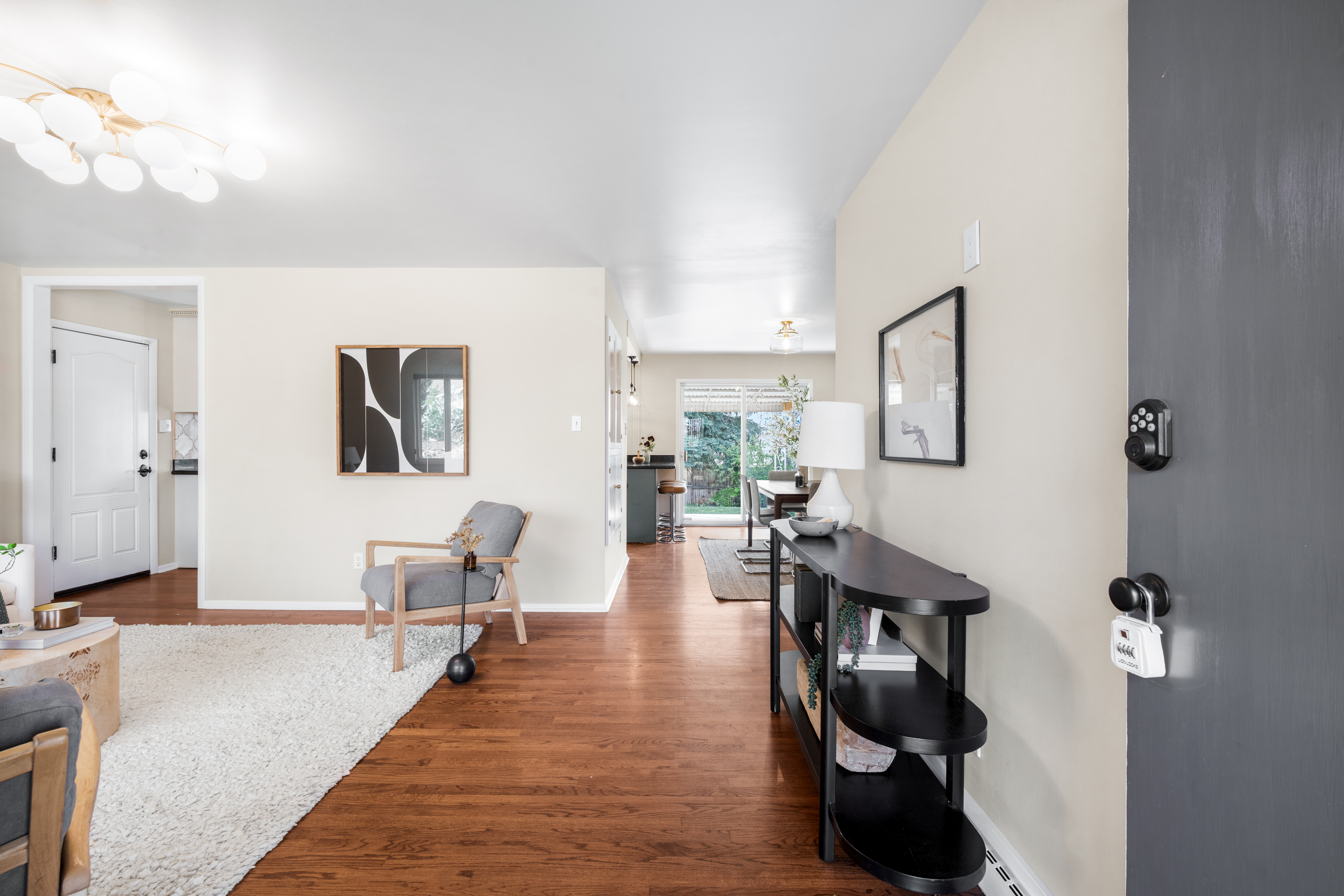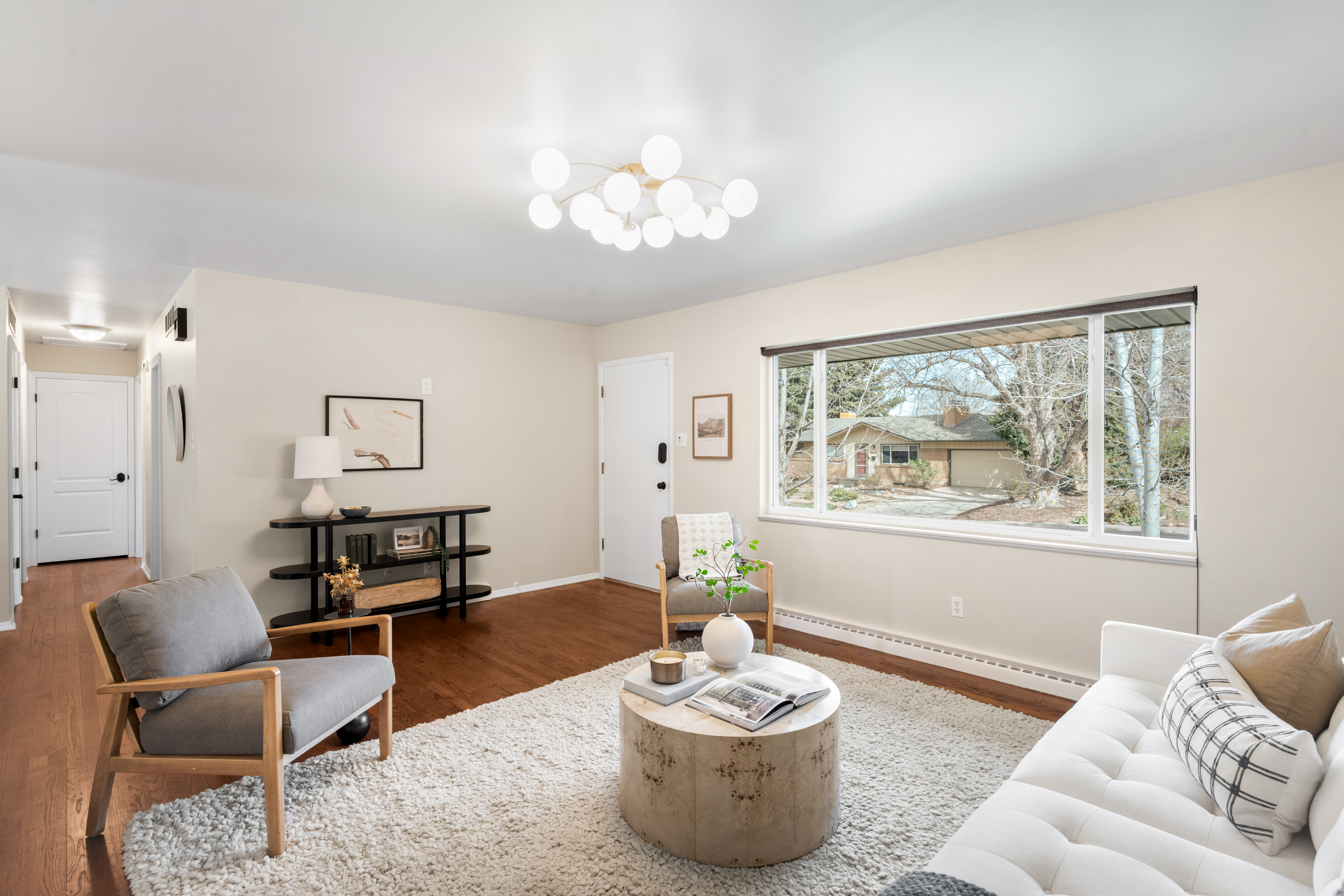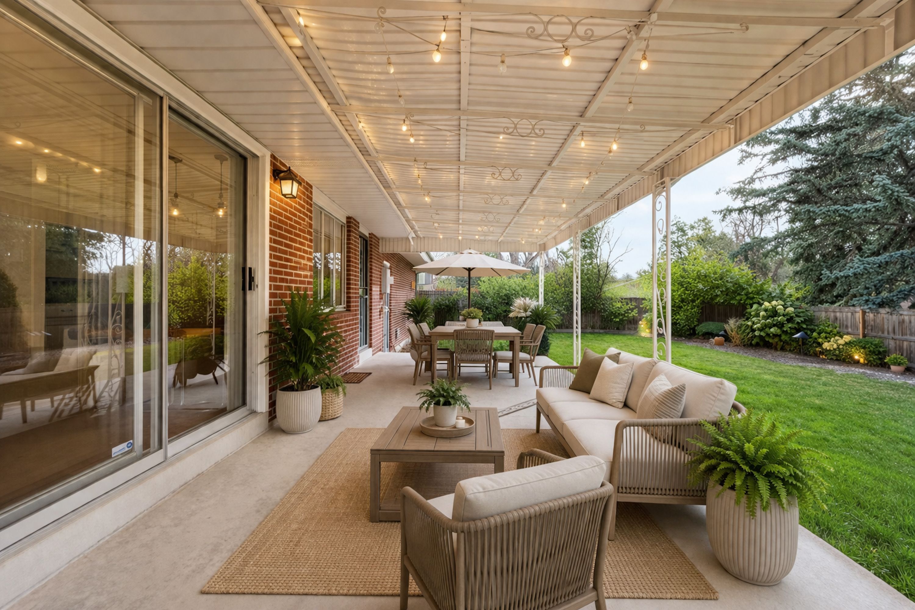 A timeless brick ranch with thoughtful updates and layered character, offering five bedrooms across two levels, three on the main level. Set on a spacious lot with a generous yard & hardwood floors throughout the main level, the living space is anchored by a wall of updated windows, filling the home with consistent natural light. An accent wall with intricate molding adds depth and sophistication, complemented by updated lighting throughout. The layout flows into a formal dining designed for gathering-featuring a built-in hutch with glass cabinetry for display + storage. Sliding glass doors open to the backyard, enhancing the home’s airy feel and creating effortless in-outdoor connection. The kitchen connects seamlessly, offering an eat-in island, granite countertops, stainless steel appliances, and full-height cabinetry with crown molding. A tiled backsplash adds personality, while picture windows frame backyard views. Direct access to the attached two-car garage-with built-in storage + workshop space-adds convenience. Three bedrooms are ideally situated on the main level. The primary suite features an en-suite bath and generous closet, while two additional main-level bedrooms share a full bath-creating a highly desirable layout. The lower level expands livability with secondary living space centered around a floor-to-ceiling brick, wood-burning fireplace + built-in shelving. The layout accommodates multiple zones-ideal for media or game space. Two additional bedrooms and a ¾ bath provide flexibility for guests or office space. A large utility/laundry room offers generous storage, built-in shelving, countertop space, and a utility sink. The backyard is expansive + private, featuring a large, fully fenced yard and covered concrete patio for year-round outdoor living-perfect for entertaining or quiet evenings. Ideally located with quick access to I-25 and I-225, moments from Cherry Creek Reservoir, Hampden Heights Park, and Whole Foods, and 15 mins to Cherry Creek.