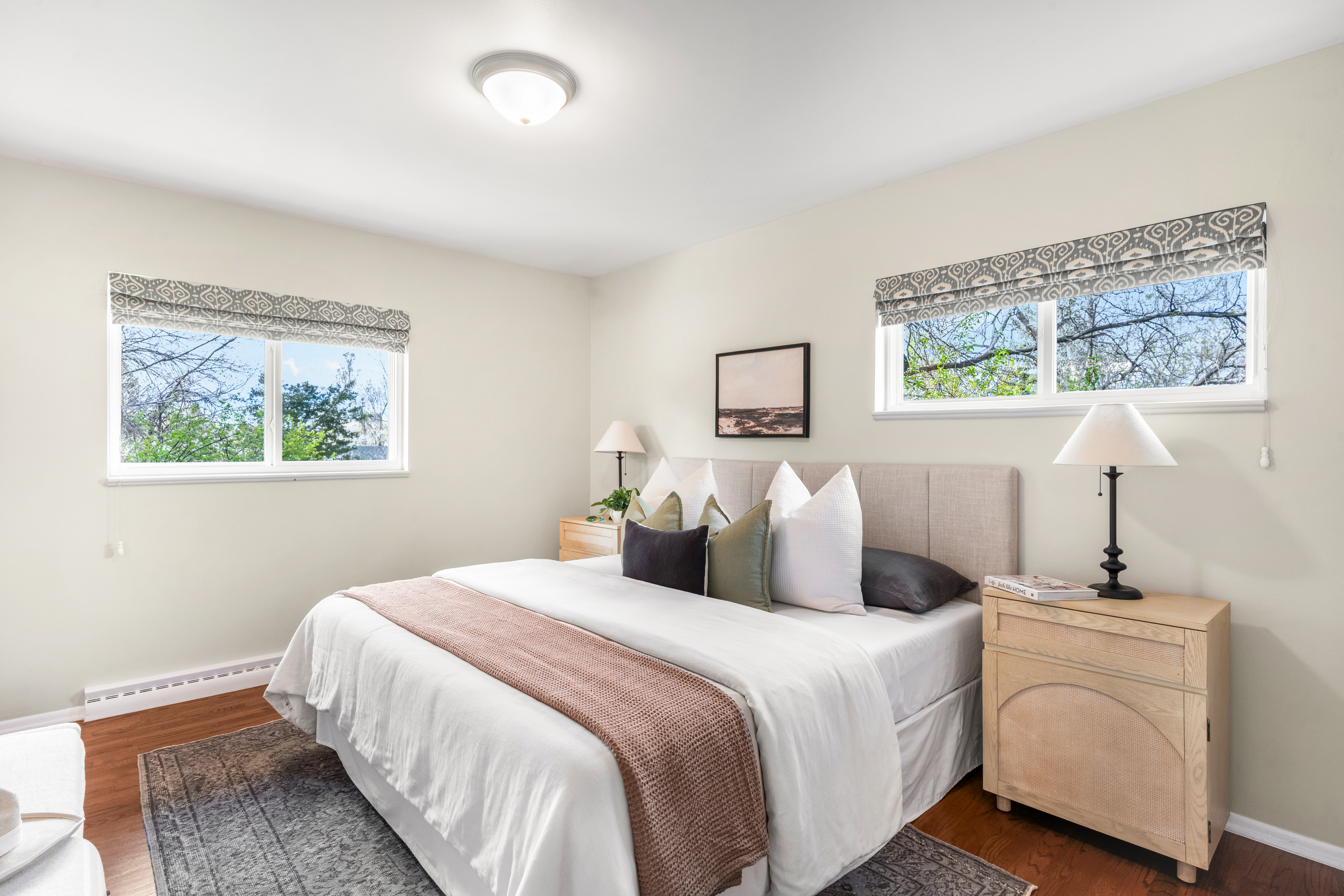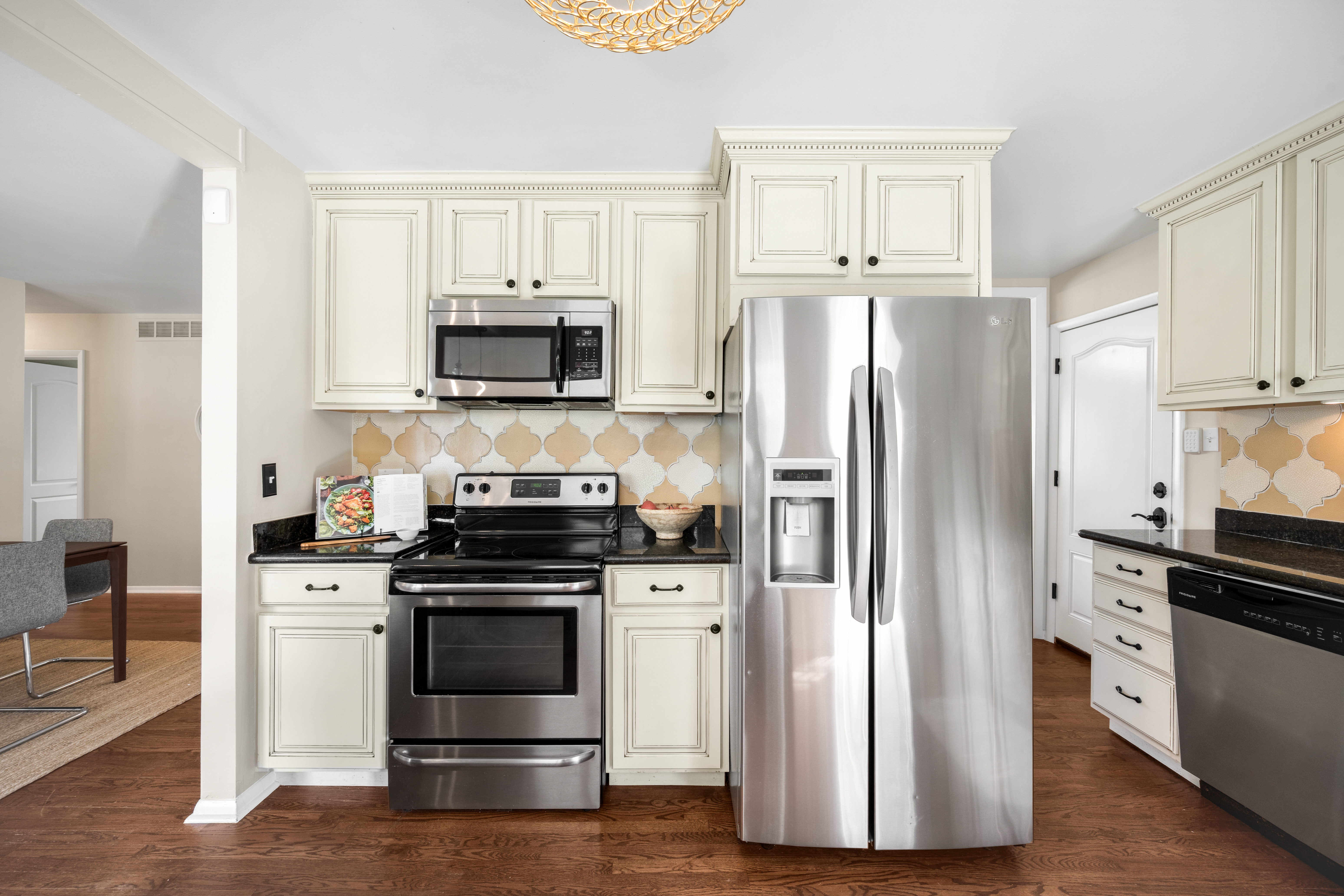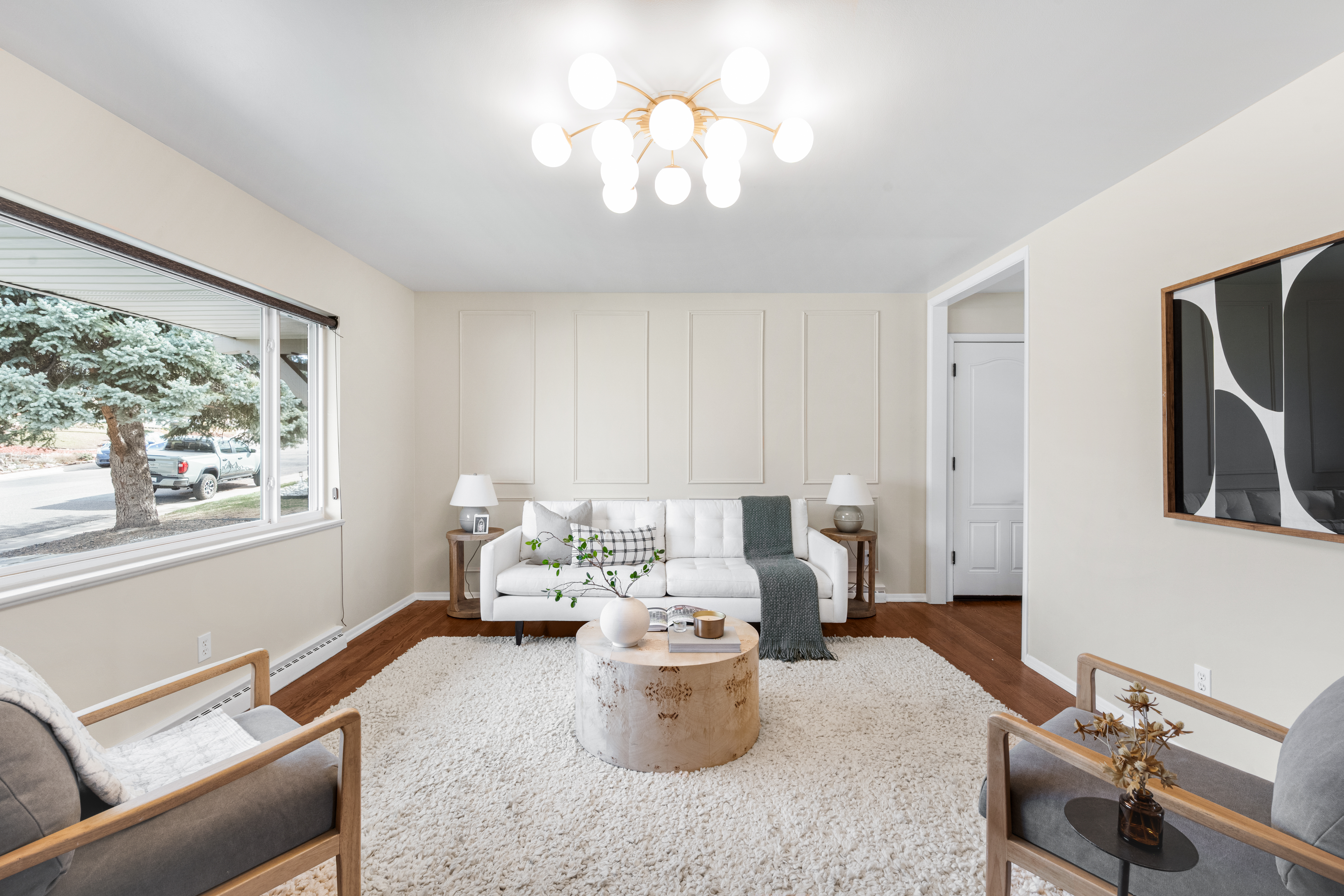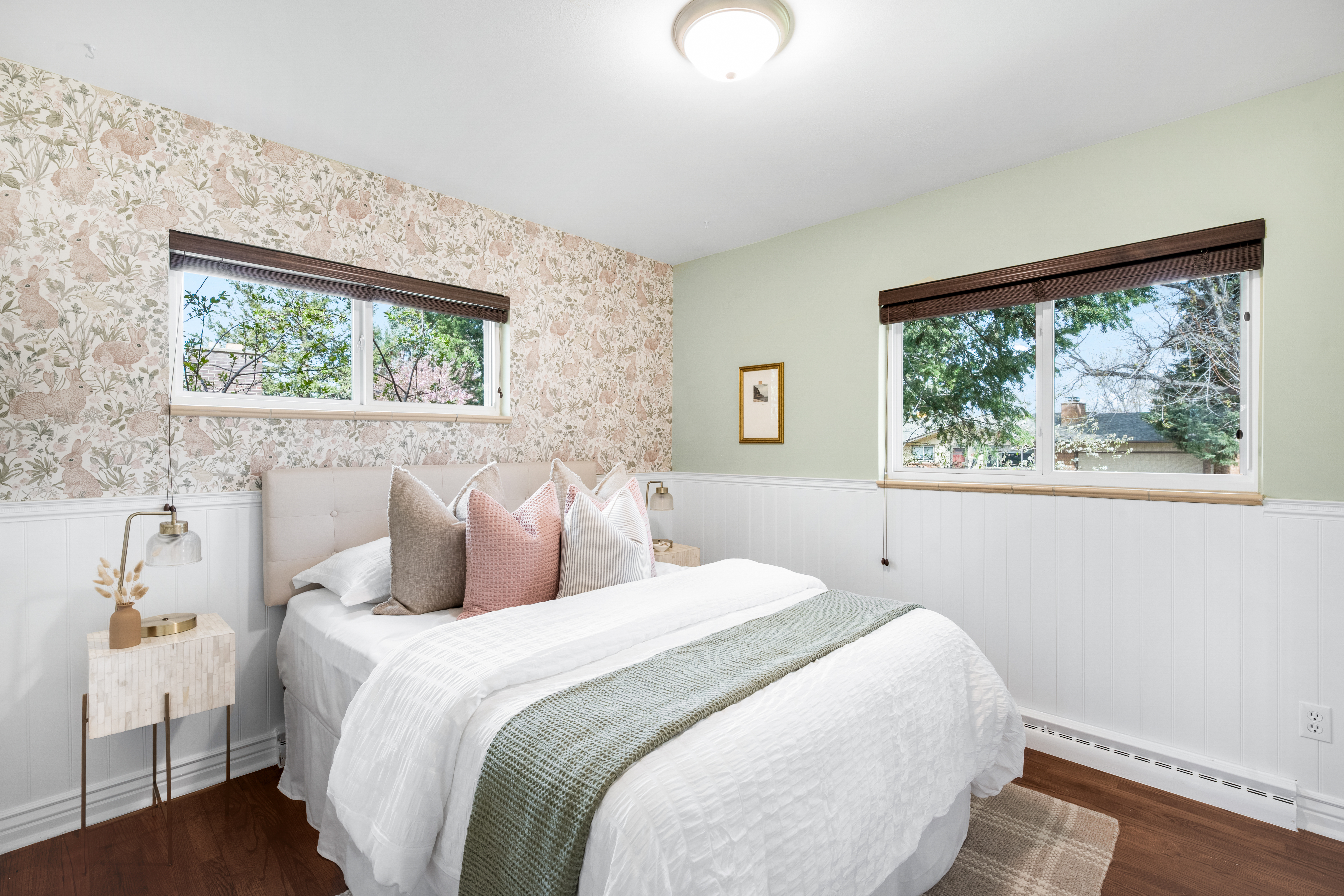 A timeless brick ranch with thoughtful updates and layered character, offering five bedrooms across two levels, three on the main level. Set on a spacious lot with a generous yard & hardwood floors throughout the main level, the living space is anchored by a wall of updated windows, filling the home with consistent natural light. An accent wall with intricate molding adds depth and sophistication, complemented by updated lighting throughout. The layout flows into a formal dining designed for gathering-featuring a built-in hutch with glass cabinetry for display + storage. Sliding glass doors open to the backyard, enhancing the home’s airy feel and creating effortless in-outdoor connection. The kitchen connects seamlessly, offering an eat-in island, granite countertops, stainless steel appliances, and full-height cabinetry with crown molding. A tiled backsplash adds personality, while picture windows frame backyard views. Direct access to the attached two-car garage-with built-in storage + workshop space-adds convenience. Three bedrooms are ideally situated on the main level. The primary suite features an en-suite bath and generous closet, while two additional main-level bedrooms share a full bath-creating a highly desirable layout. The lower level expands livability with secondary living space centered around a floor-to-ceiling brick, wood-burning fireplace + built-in shelving. The layout accommodates multiple zones-ideal for media or game space. Two additional bedrooms and a ¾ bath provide flexibility for guests or office space. A large utility/laundry room offers generous storage, built-in shelving, countertop space, and a utility sink. The backyard is expansive + private, featuring a large, fully fenced yard and covered concrete patio for year-round outdoor living-perfect for entertaining or quiet evenings. Ideally located with quick access to I-25 and I-225, moments from Cherry Creek Reservoir, Hampden Heights Park, and Whole Foods, and 15 mins to Cherry Creek.