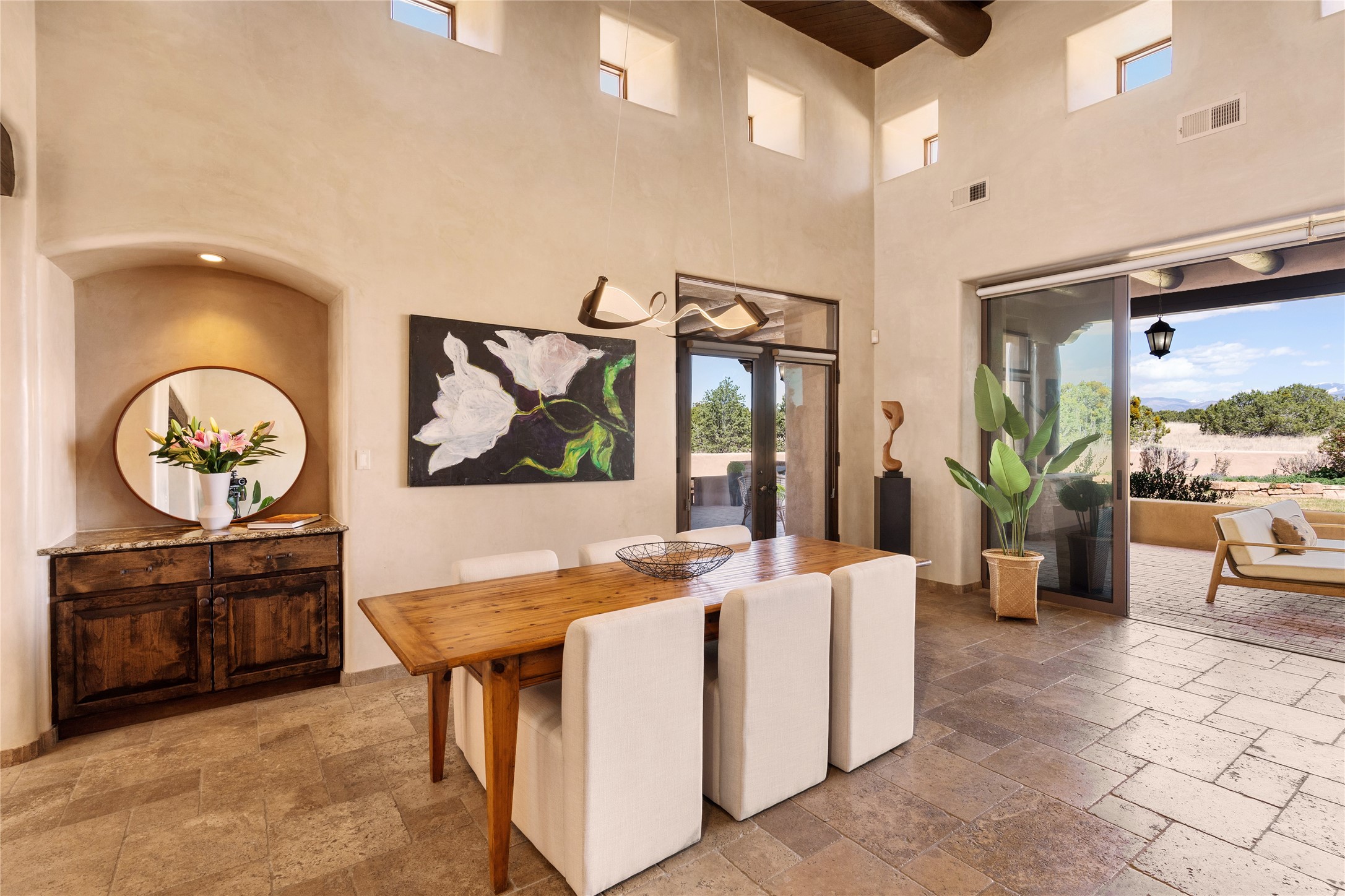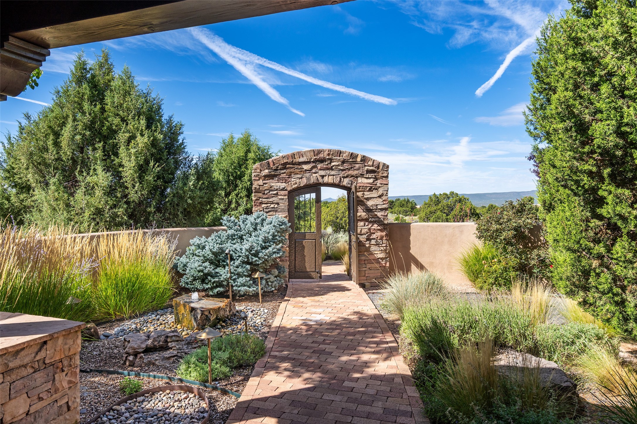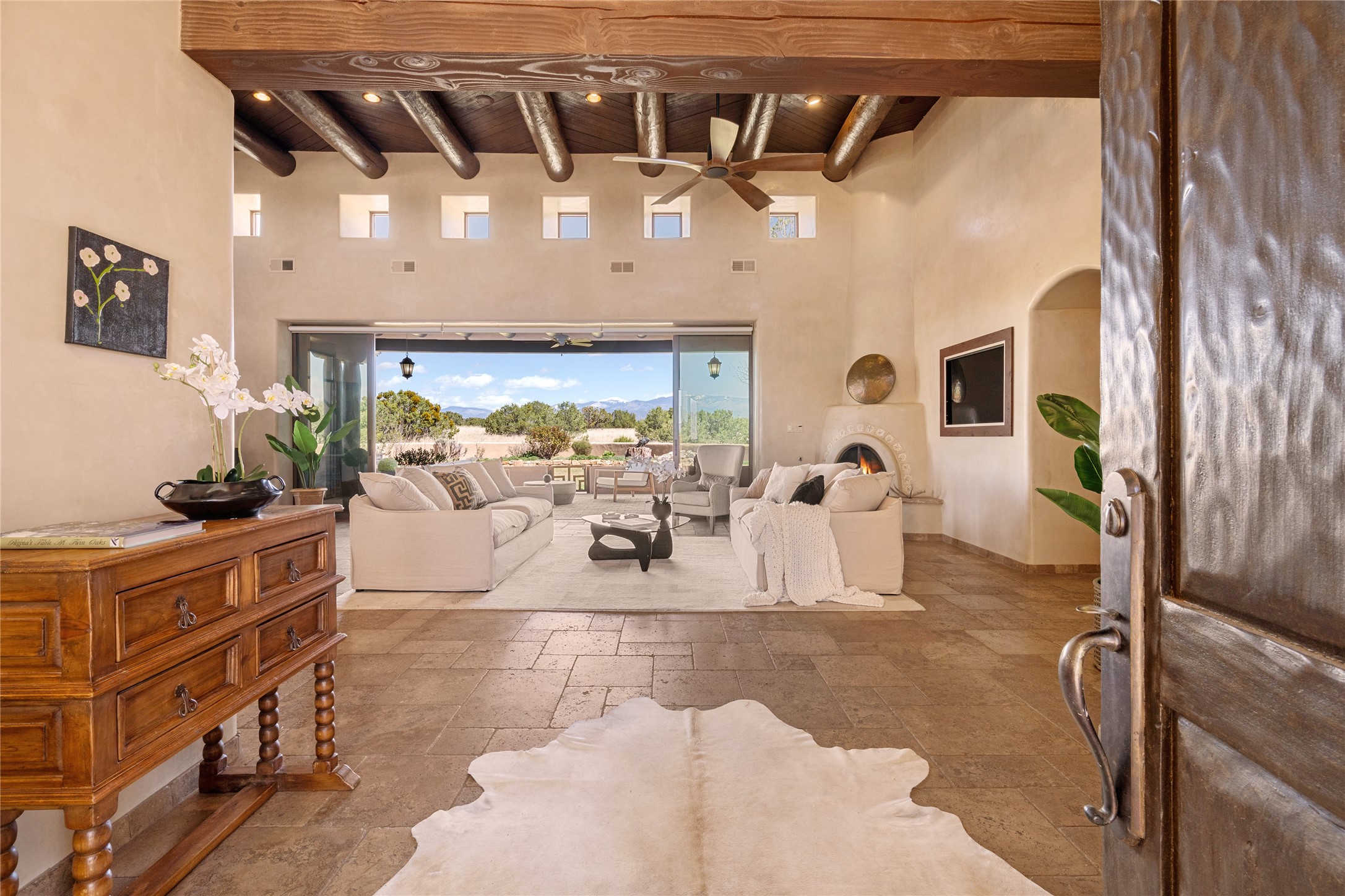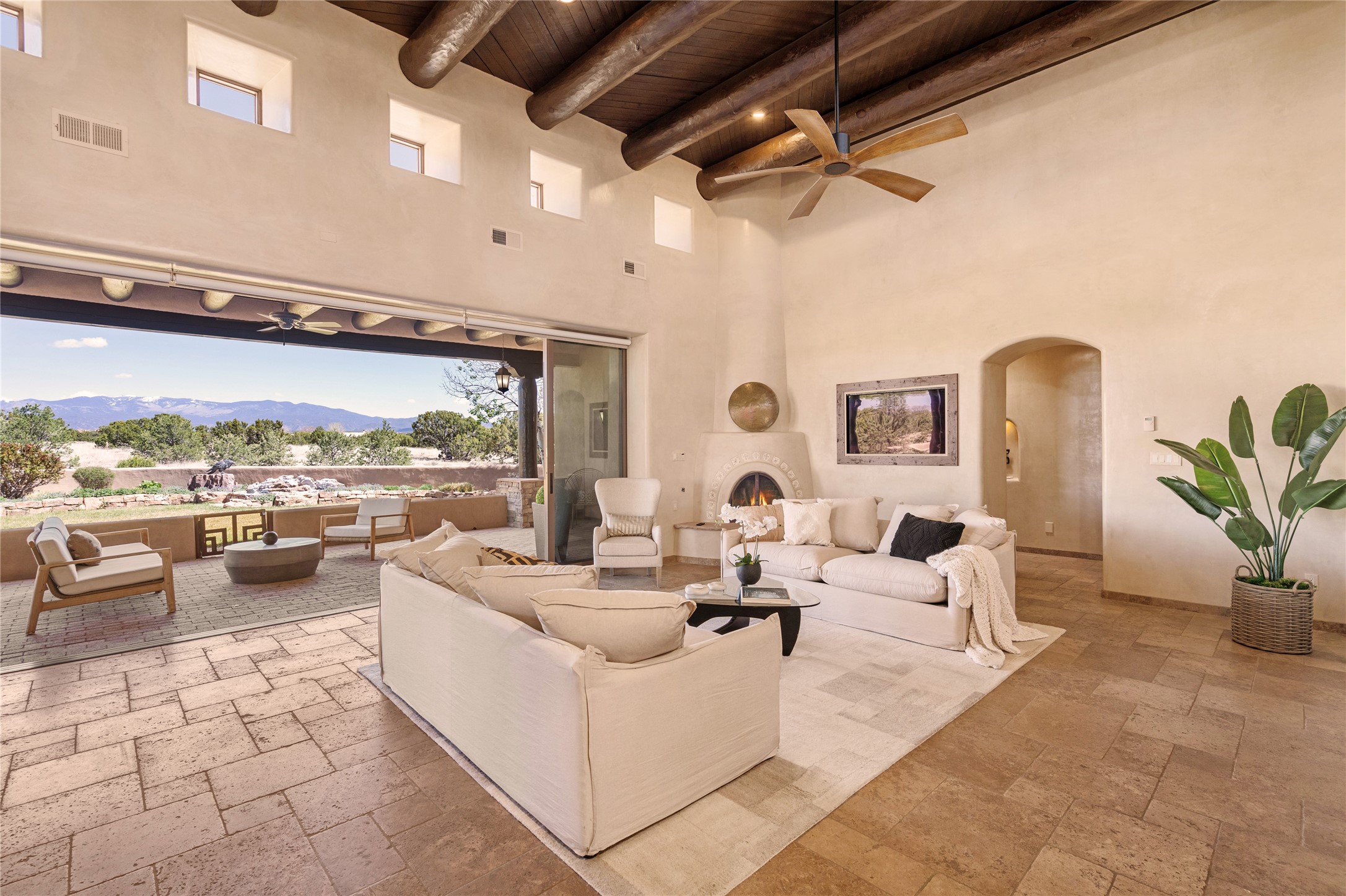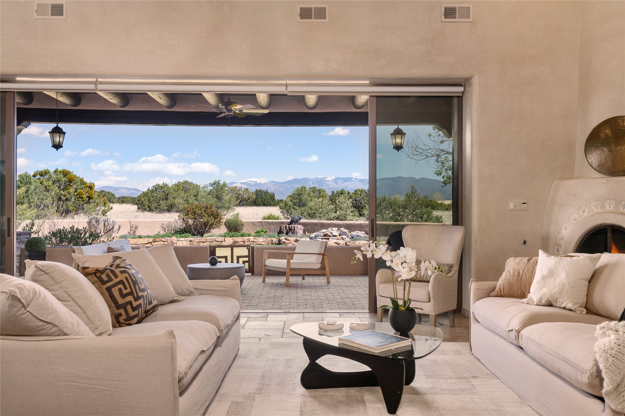 PANORAMIC VIEWS AND TIMELESS DESIGN IN LAS CAMPANAS. This refined residence in the Las Campanas community combines sweeping mountain vistas with many updates and enduring style in a hard-to-find 4 bedroom with a dramatic architecture. An inviting courtyard entry opens to generous living spaces framed by a dramatic sliding glass wall, creating seamless indoor-outdoor living. Towering viga-lined ceilings and plaster walls frame the spaces. The gourmet kitchen features dual Sub-Zero refrigerators, a Sub-Zero ice maker, and expanded storage. The Owners’ suite offers a quiet and spacious retreat, while a large media/game room provides flexibility for entertainment or relaxation. Recent enhancements include upgraded landscaping, refreshed interiors, and mechanical improvements that elevate both comfort and efficiency. Outdoor areas are designed for year-round enjoyment, with covered dining spaces, a pizza oven, and xeric, drip-irrigated gardens that are both lush and easy to maintain. Residents enjoy close proximity to The Club at Las Campanas, with spa, fitness, and dining amenities (membership available through the private Club at Las Campanas) as well as direct access to miles of walking paths. A move-in ready home blending elegant finishes, multiple upgrades, and the best of Santa Fe living.