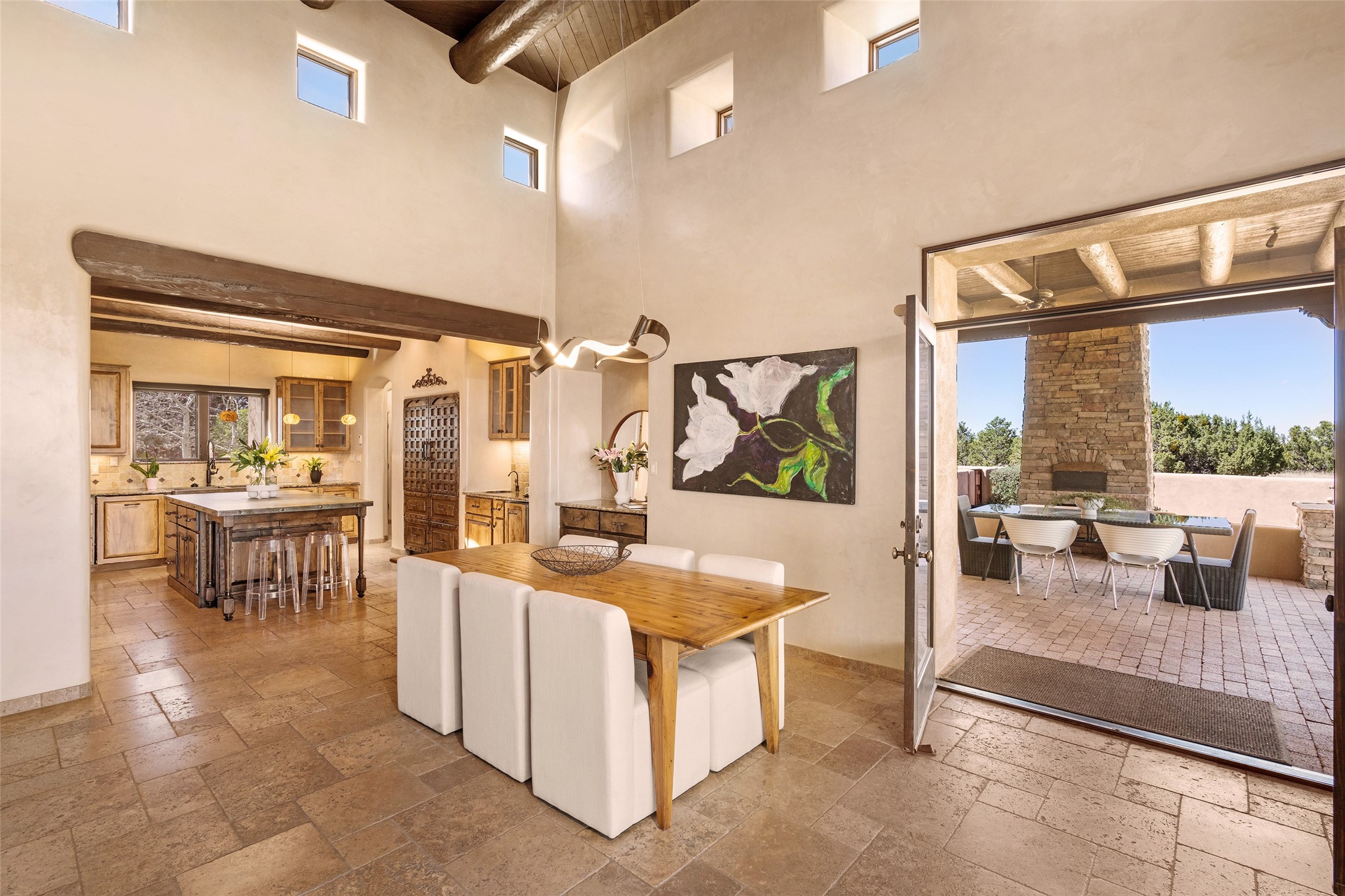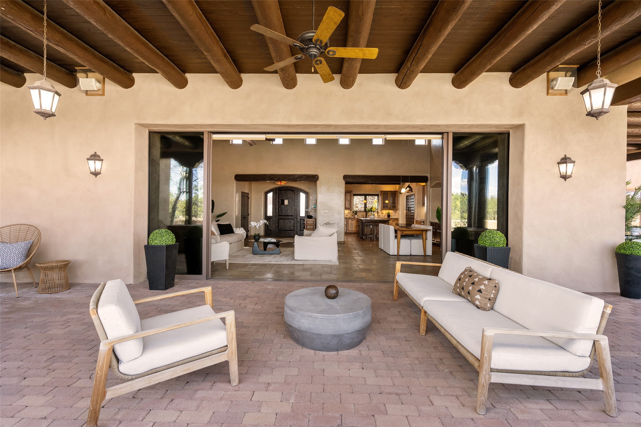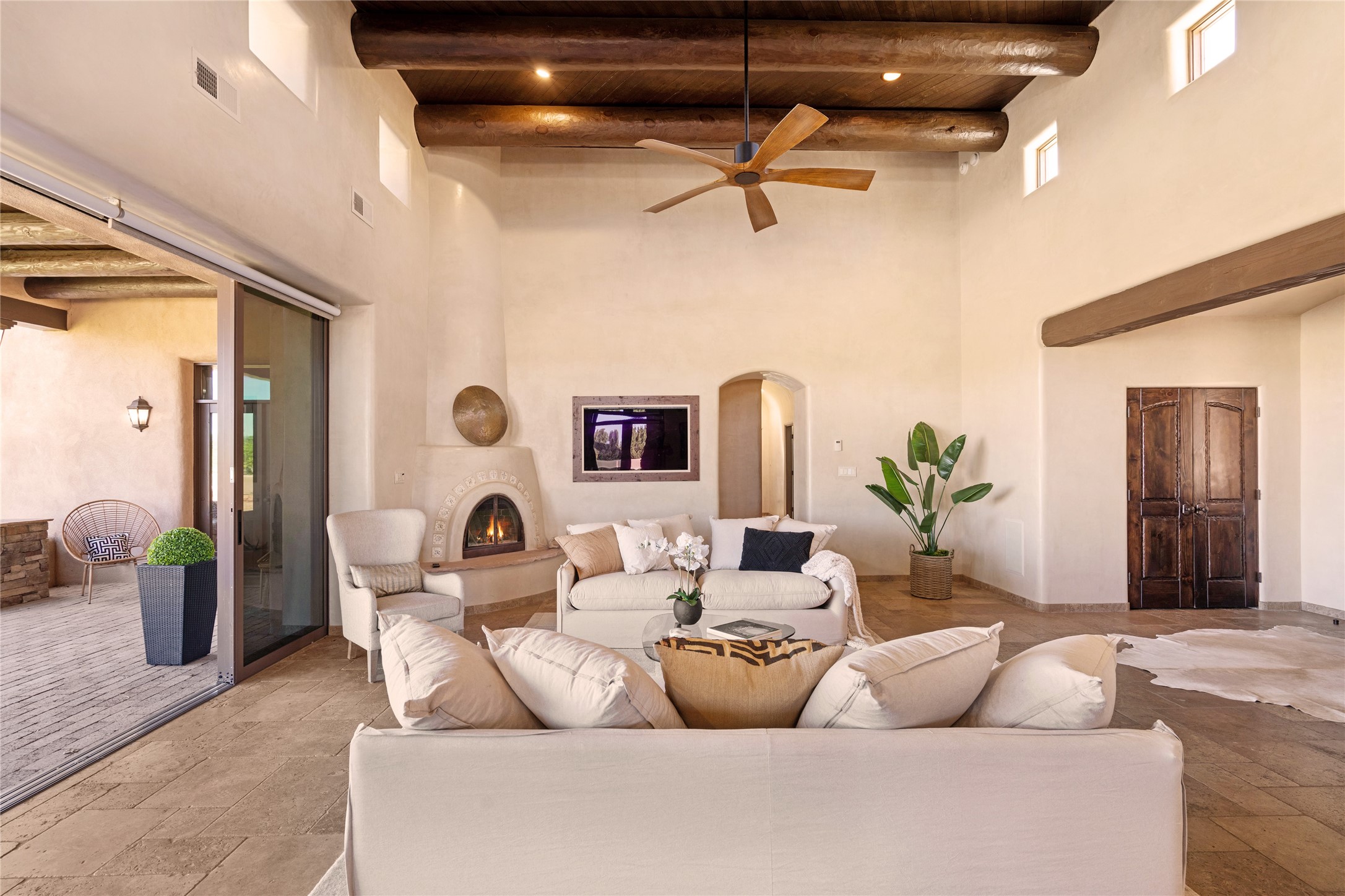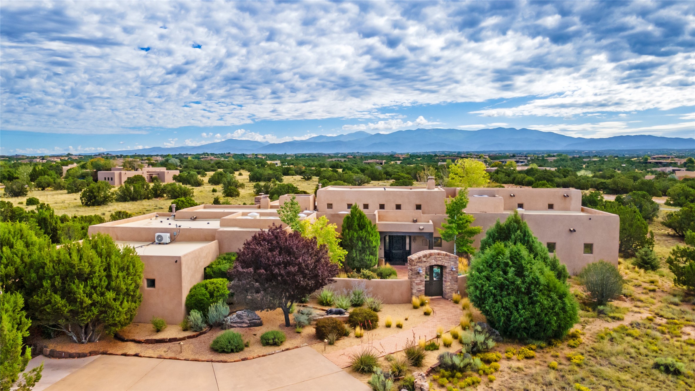 PANORAMIC VIEWS AND TIMELESS DESIGN IN LAS CAMPANAS. This refined residence in the Las Campanas community combines sweeping mountain vistas with many updates and enduring style in a hard-to-find 4 bedroom with a dramatic architecture. An inviting courtyard entry opens to generous living spaces framed by a dramatic sliding glass wall, creating seamless indoor-outdoor living. Towering viga-lined ceilings and plaster walls frame the spaces. The gourmet kitchen features dual Sub-Zero refrigerators, a Sub-Zero ice maker, and expanded storage. The Owners’ suite offers a quiet and spacious retreat, while a large media/game room provides flexibility for entertainment or relaxation. Recent enhancements include upgraded landscaping, refreshed interiors, and mechanical improvements that elevate both comfort and efficiency. Outdoor areas are designed for year-round enjoyment, with covered dining spaces, a pizza oven, and xeric, drip-irrigated gardens that are both lush and easy to maintain. Residents enjoy close proximity to The Club at Las Campanas, with spa, fitness, and dining amenities (membership available through the private Club at Las Campanas) as well as direct access to miles of walking paths. A move-in ready home blending elegant finishes, multiple upgrades, and the best of Santa Fe living.