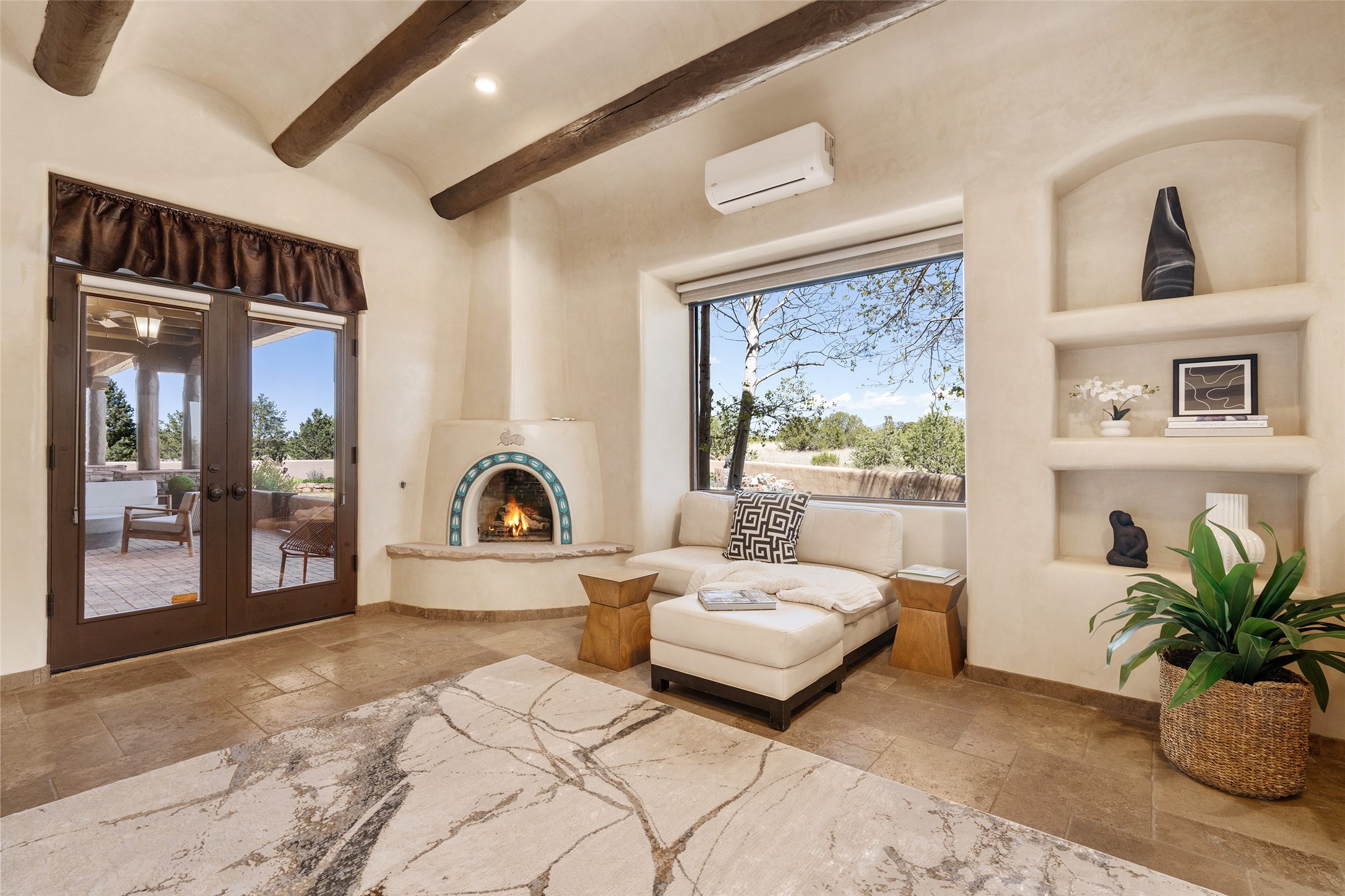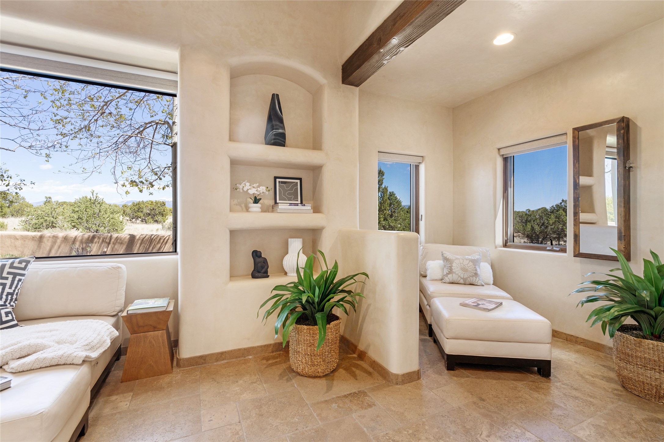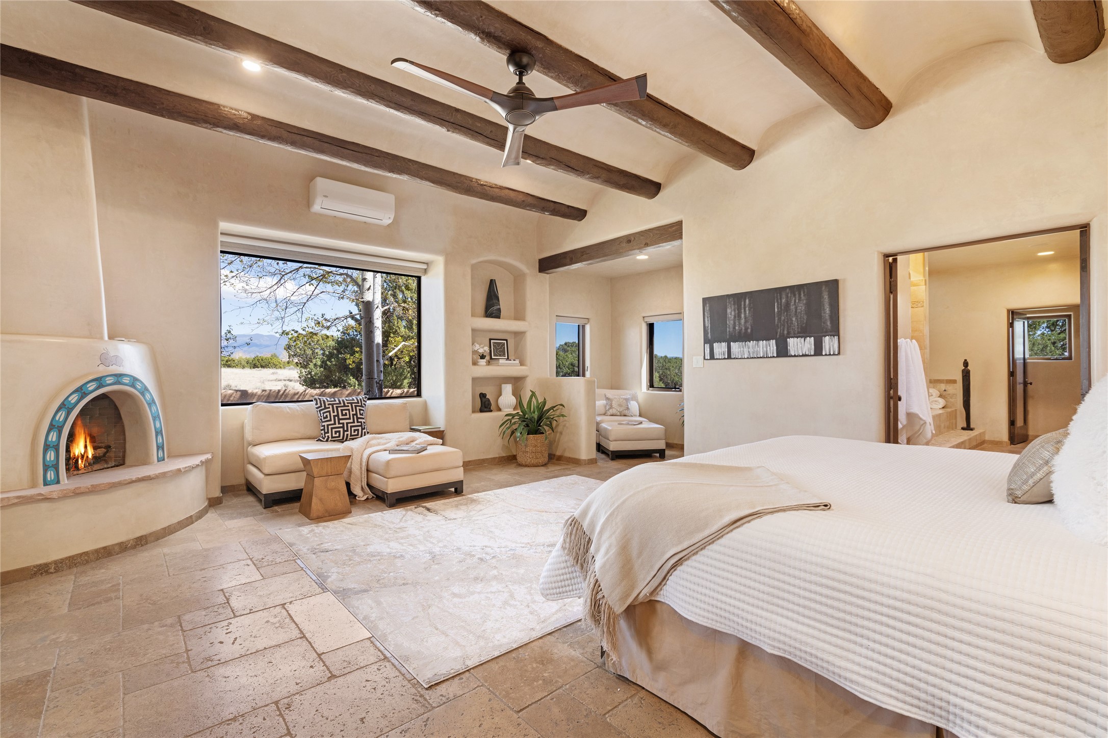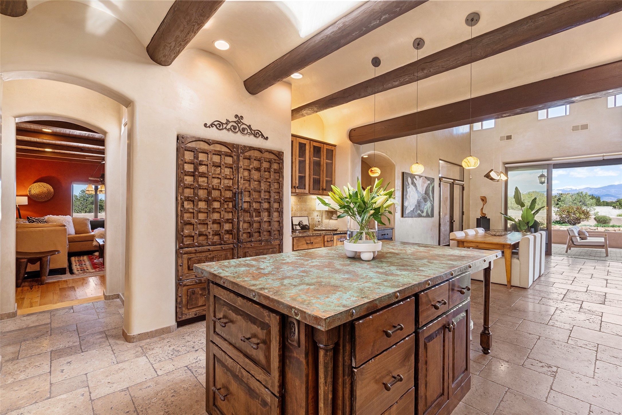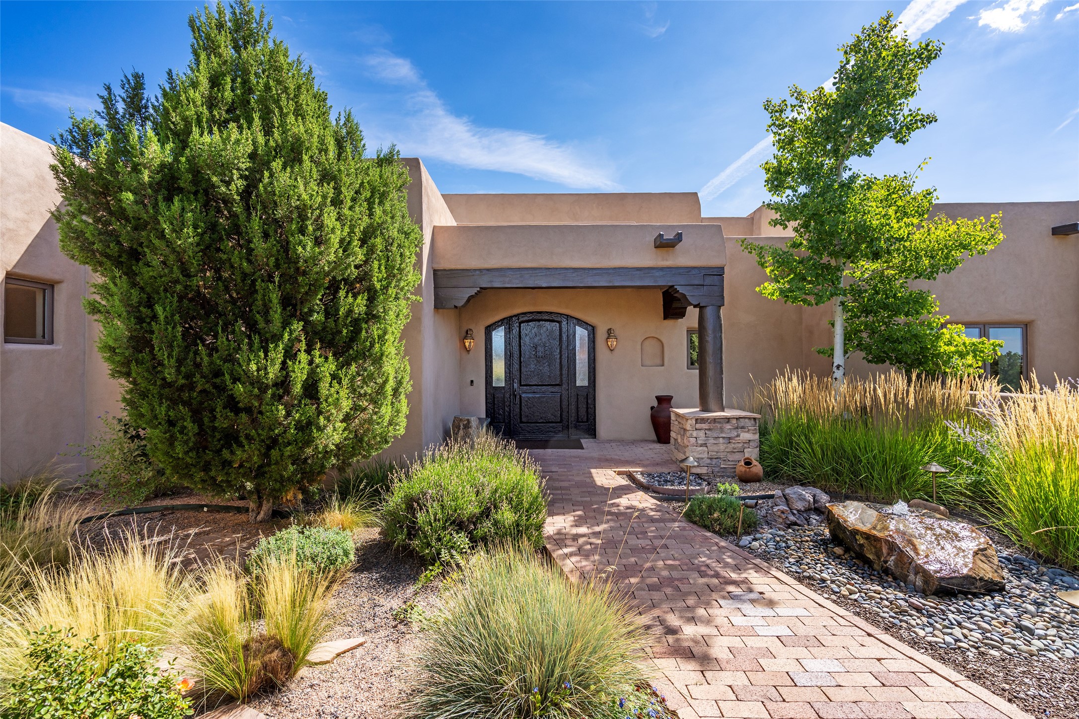 PANORAMIC VIEWS AND TIMELESS DESIGN IN LAS CAMPANAS. This refined residence in the Las Campanas community combines sweeping mountain vistas with many updates and enduring style in a hard-to-find 4 bedroom with a dramatic architecture. An inviting courtyard entry opens to generous living spaces framed by a dramatic sliding glass wall, creating seamless indoor-outdoor living. Towering viga-lined ceilings and plaster walls frame the spaces. The gourmet kitchen features dual Sub-Zero refrigerators, a Sub-Zero ice maker, and expanded storage. The Owners’ suite offers a quiet and spacious retreat, while a large media/game room provides flexibility for entertainment or relaxation. Recent enhancements include upgraded landscaping, refreshed interiors, and mechanical improvements that elevate both comfort and efficiency. Outdoor areas are designed for year-round enjoyment, with covered dining spaces, a pizza oven, and xeric, drip-irrigated gardens that are both lush and easy to maintain. Residents enjoy close proximity to The Club at Las Campanas, with spa, fitness, and dining amenities (membership available through the private Club at Las Campanas) as well as direct access to miles of walking paths. A move-in ready home blending elegant finishes, multiple upgrades, and the best of Santa Fe living.