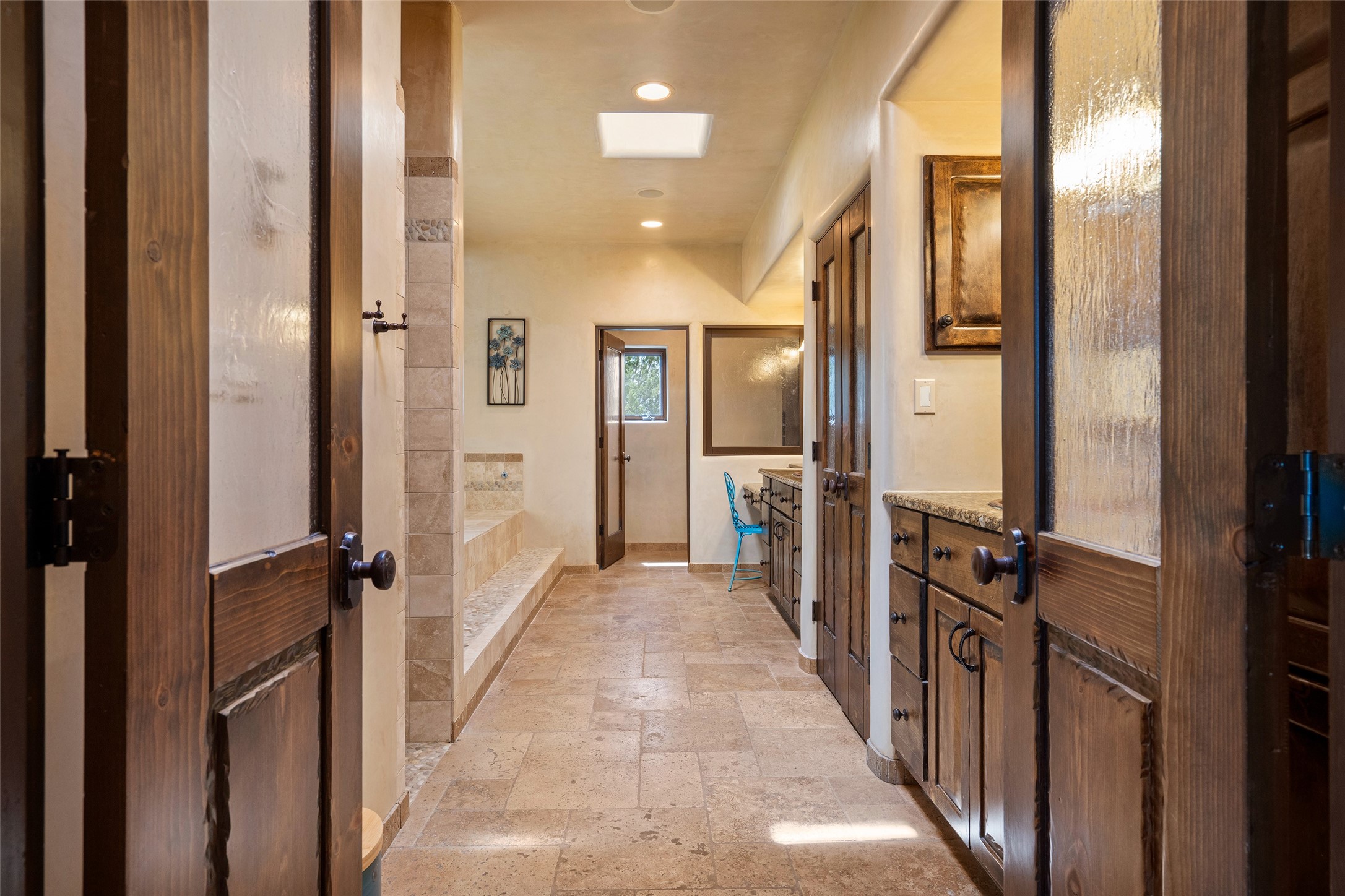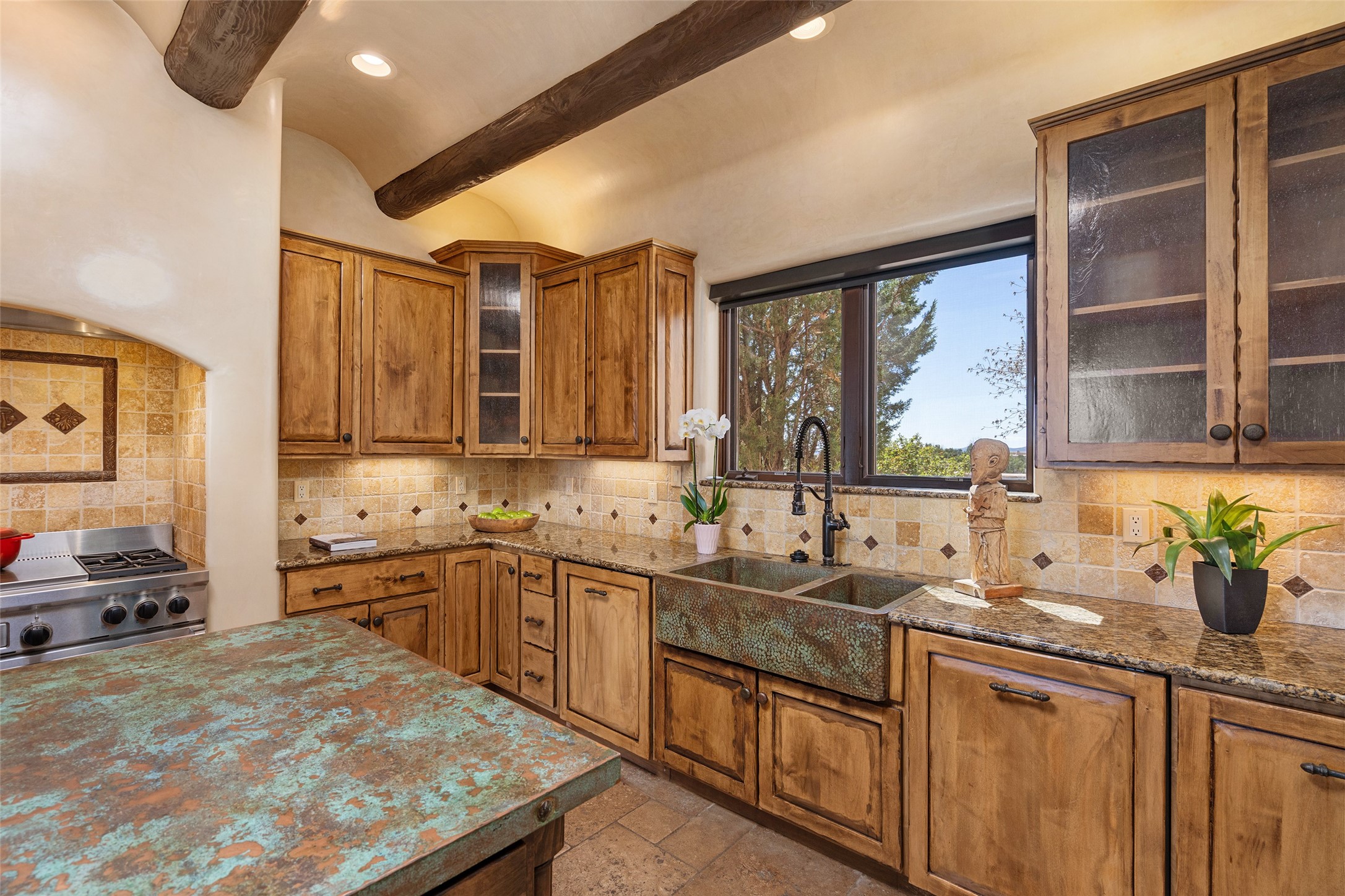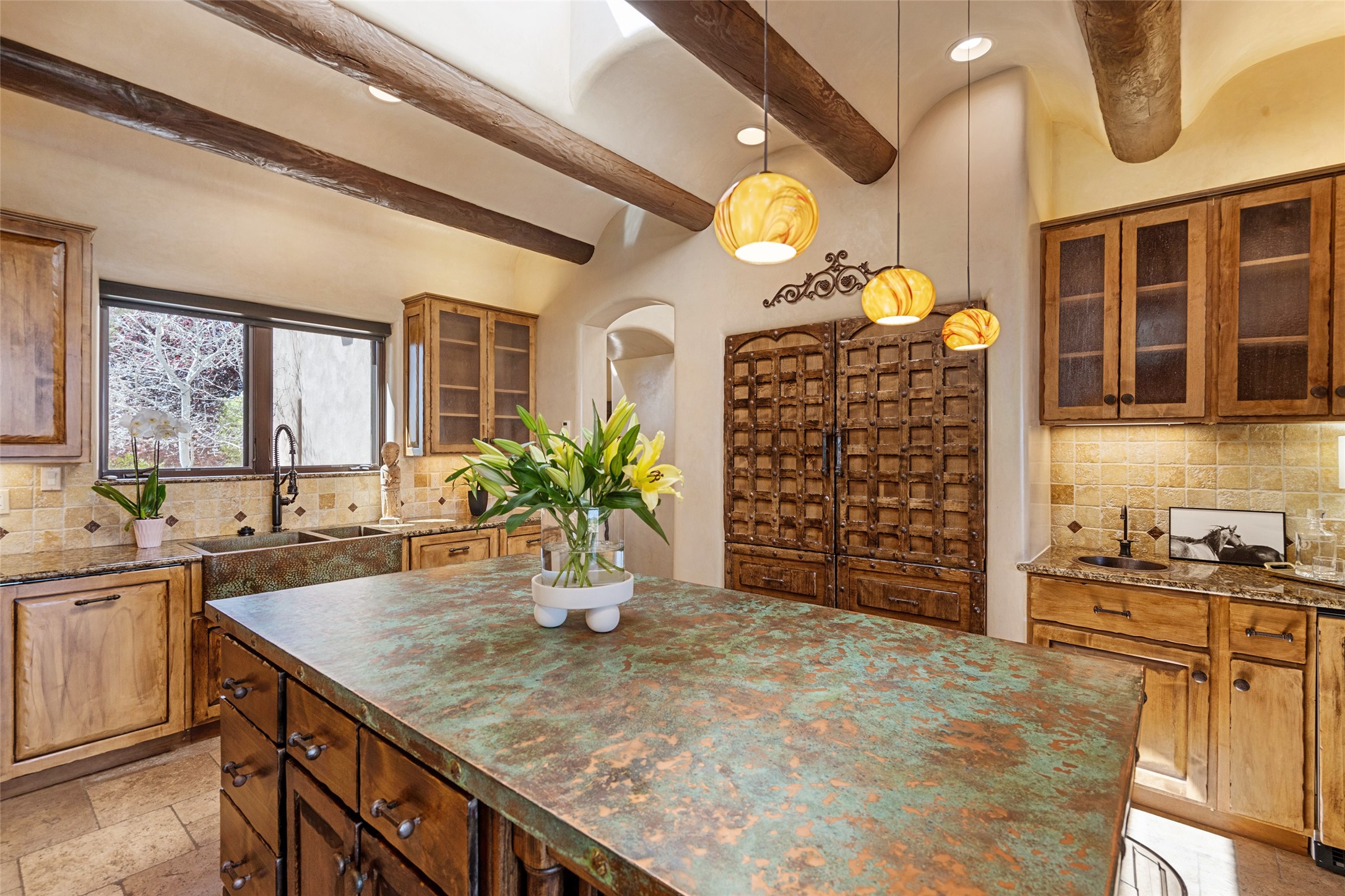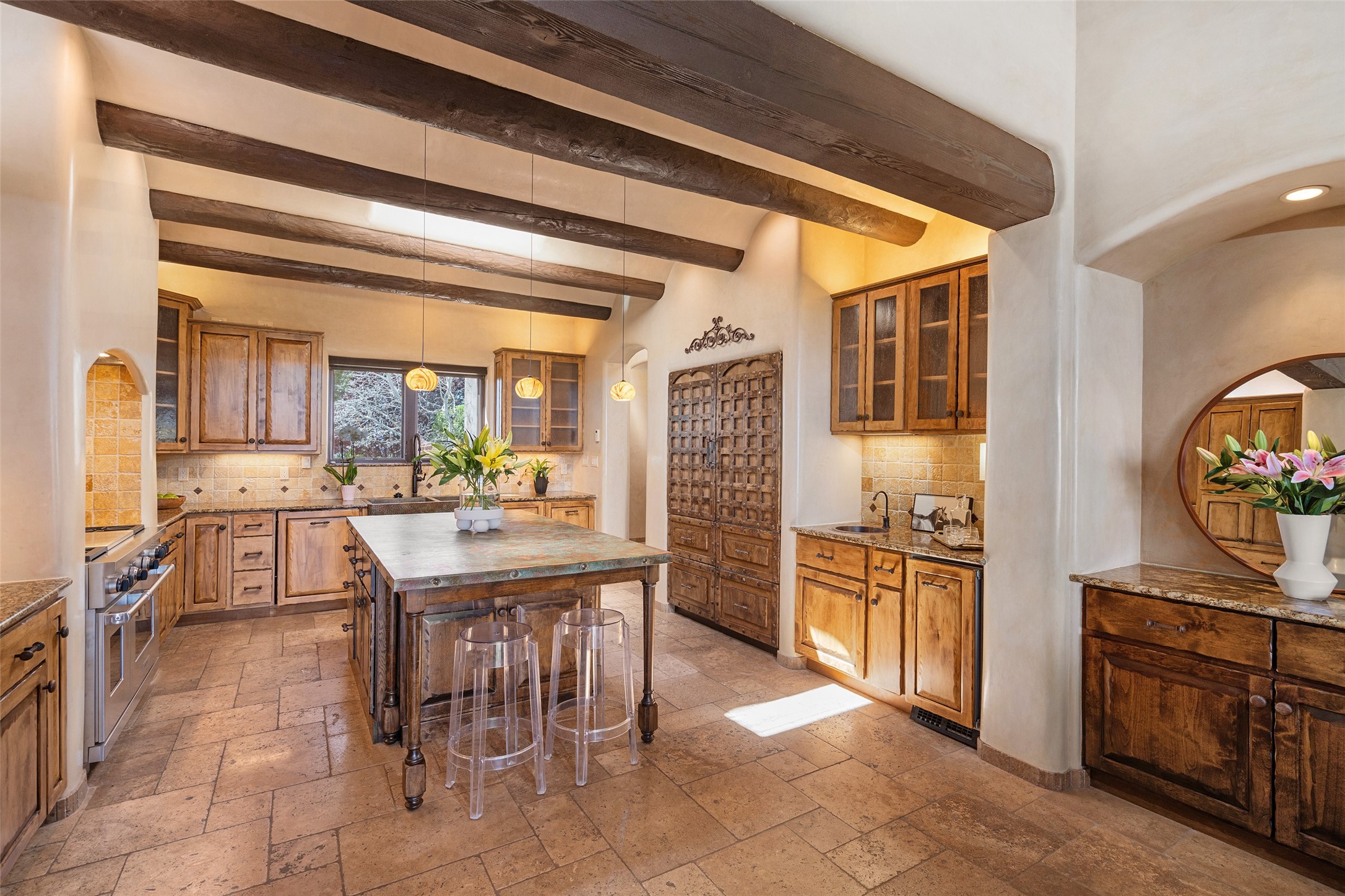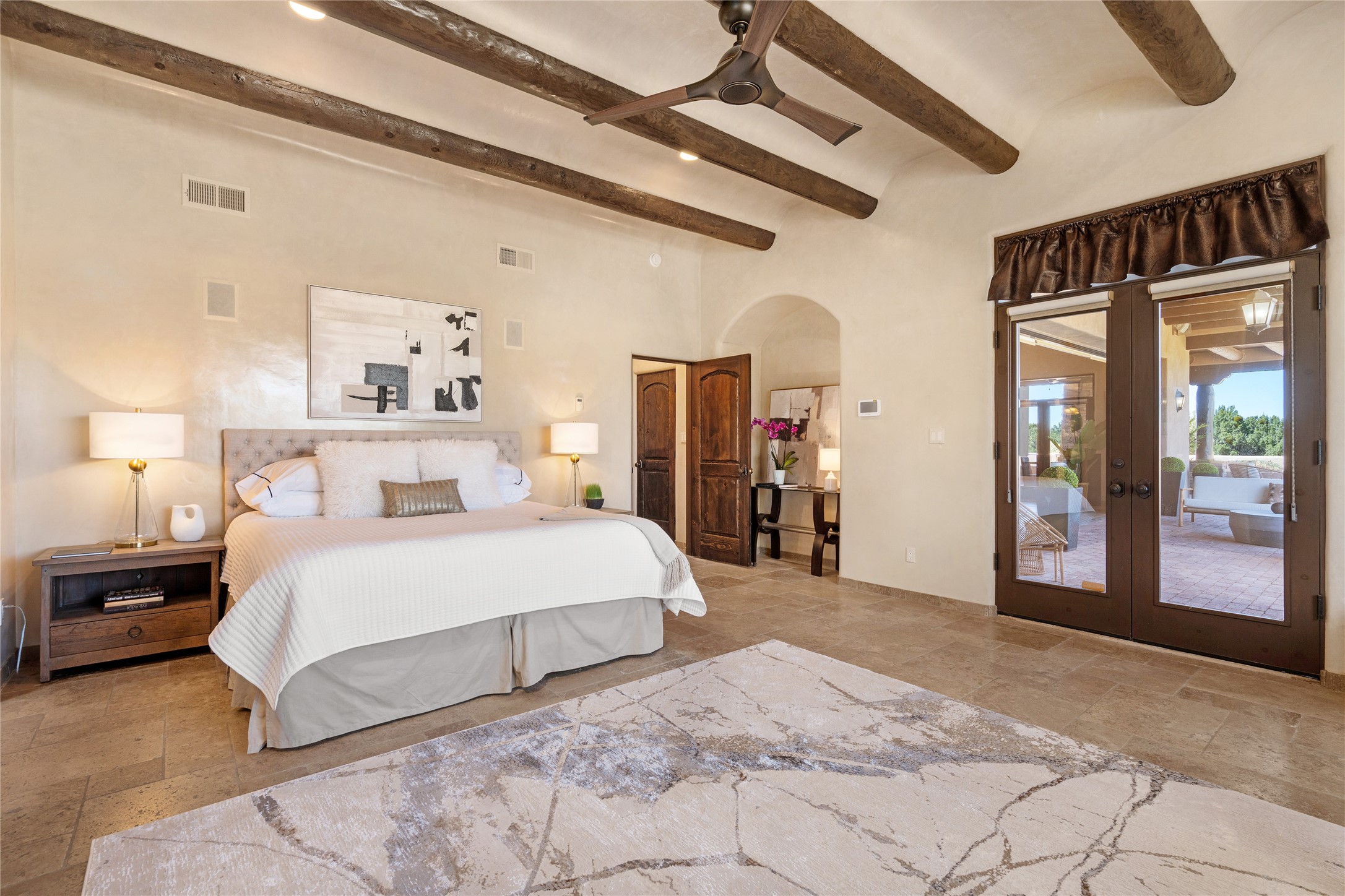 PANORAMIC VIEWS AND TIMELESS DESIGN IN LAS CAMPANAS. This refined residence in the Las Campanas community combines sweeping mountain vistas with many updates and enduring style in a hard-to-find 4 bedroom with a dramatic architecture. An inviting courtyard entry opens to generous living spaces framed by a dramatic sliding glass wall, creating seamless indoor-outdoor living. Towering viga-lined ceilings and plaster walls frame the spaces. The gourmet kitchen features dual Sub-Zero refrigerators, a Sub-Zero ice maker, and expanded storage. The Owners’ suite offers a quiet and spacious retreat, while a large media/game room provides flexibility for entertainment or relaxation. Recent enhancements include upgraded landscaping, refreshed interiors, and mechanical improvements that elevate both comfort and efficiency. Outdoor areas are designed for year-round enjoyment, with covered dining spaces, a pizza oven, and xeric, drip-irrigated gardens that are both lush and easy to maintain. Residents enjoy close proximity to The Club at Las Campanas, with spa, fitness, and dining amenities (membership available through the private Club at Las Campanas) as well as direct access to miles of walking paths. A move-in ready home blending elegant finishes, multiple upgrades, and the best of Santa Fe living.