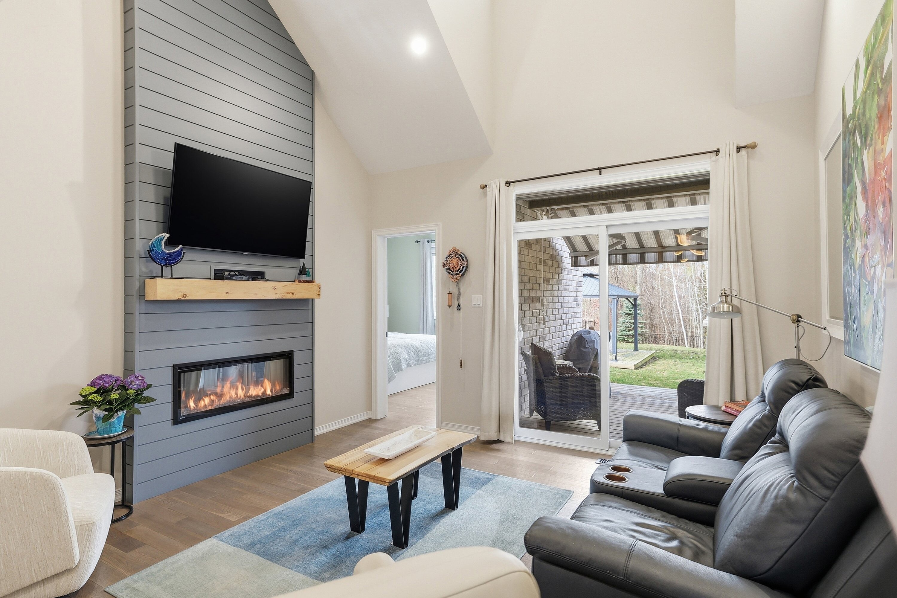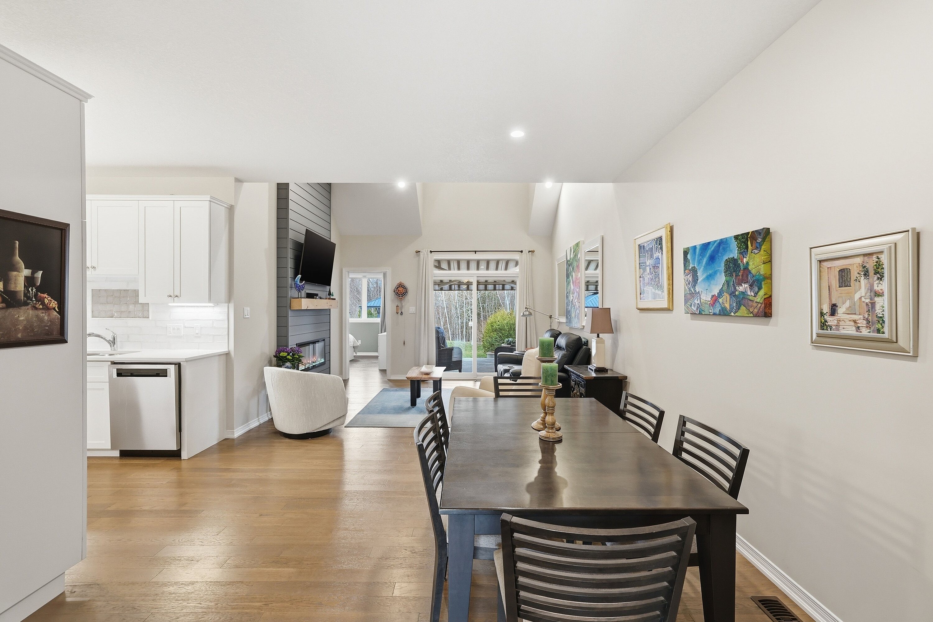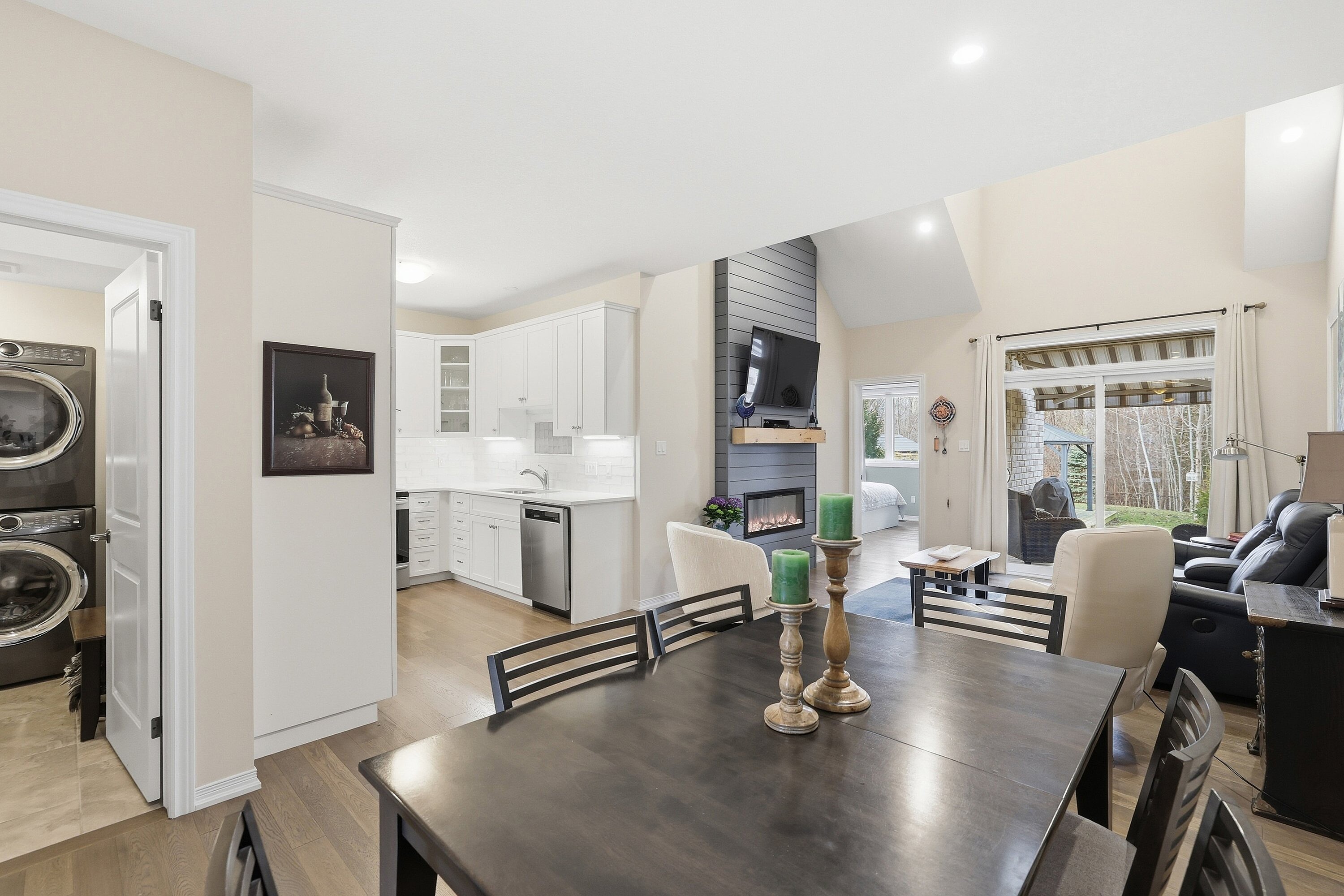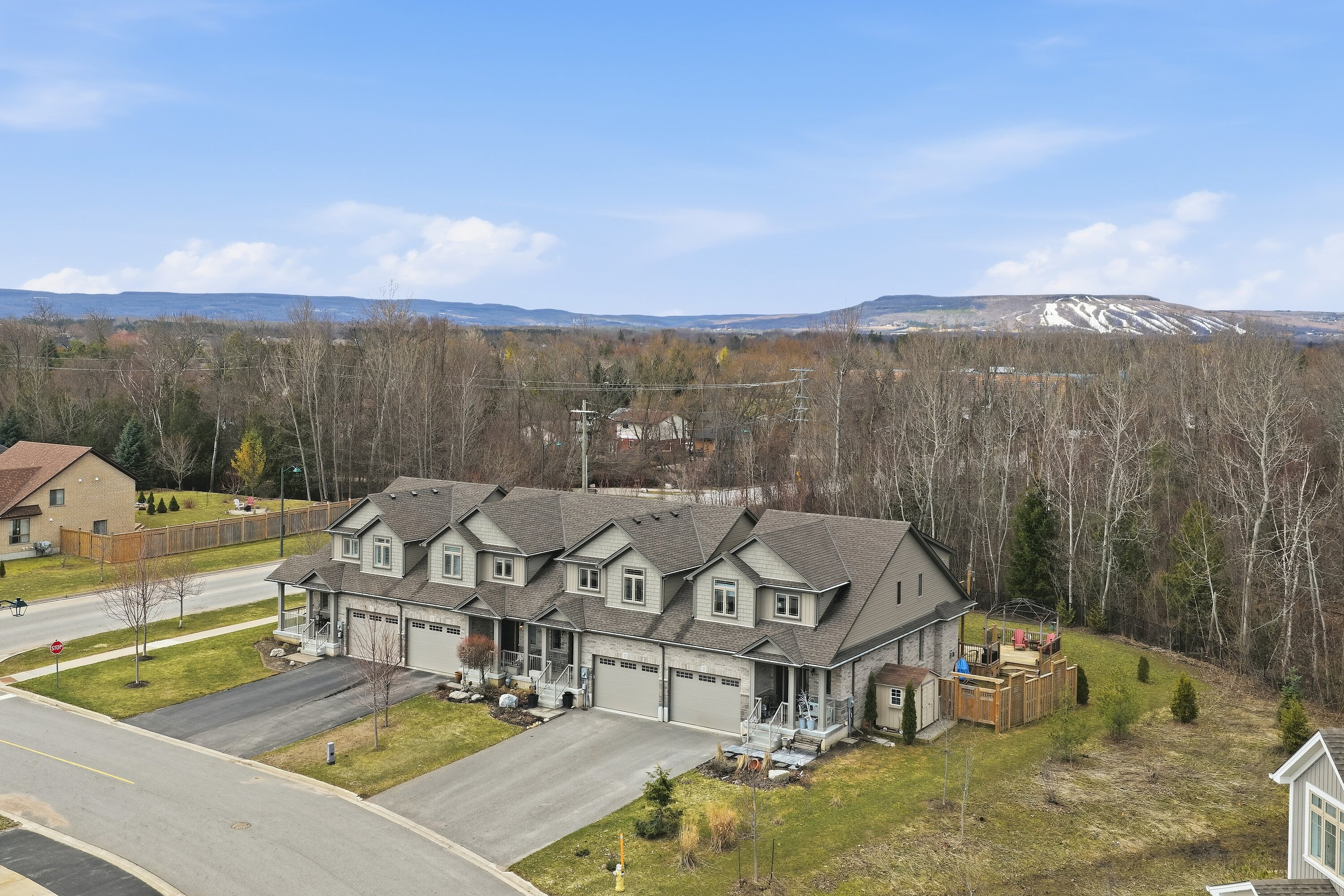 Stunning Sunvale bungaloft townhome set on an extra-deep premium lot backing onto the scenic railway trail and a serene forested area. Designed for effortless main-floor living, this home features a bright open-concept kitchen, dining, and living space highlighted by a soaring vaulted ceiling, oak hardwood flooring and a beautiful fireplace as the focal point. The living area seamlessly extends to a covered porch-perfect for relaxing or entertaining-while a separate deck overlooks the beautifully landscaped, expansive backyard. The main-floor primary suite offers a walk-in closet, a four-piece ensuite, and peaceful views of the lush rear yard. Upstairs, a lofted space open to below creates an airy feel and is complemented by a dedicated office, two additional bedrooms, and a four-piece bathroom-ideal for family or guests. Additional features include a 1.5 car garage with inside entry, parking for two vehicles in the driveway, main floor laundry and a full unfinished basement ready for your customization. Ideally located close to downtown Collingwood, local schools, and an abundance of trails, this home offers the perfect blend of comfort, style, and convenience.