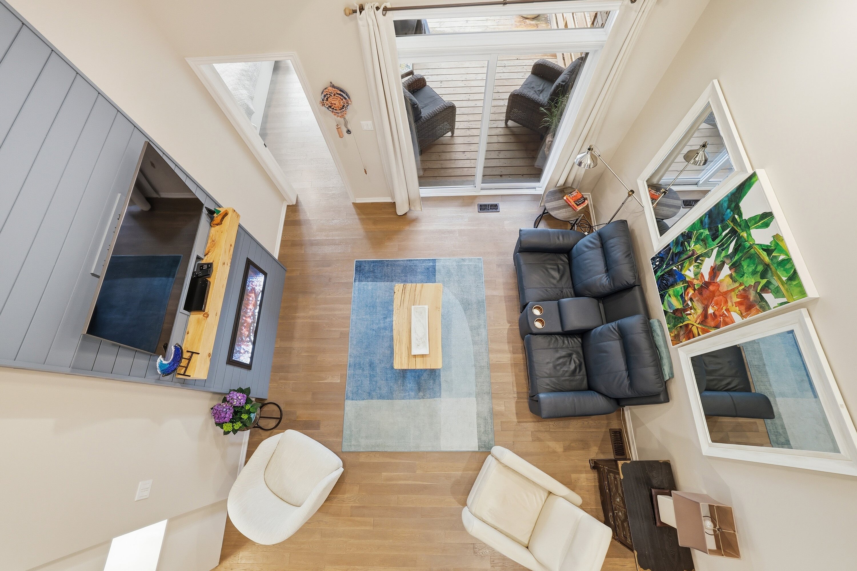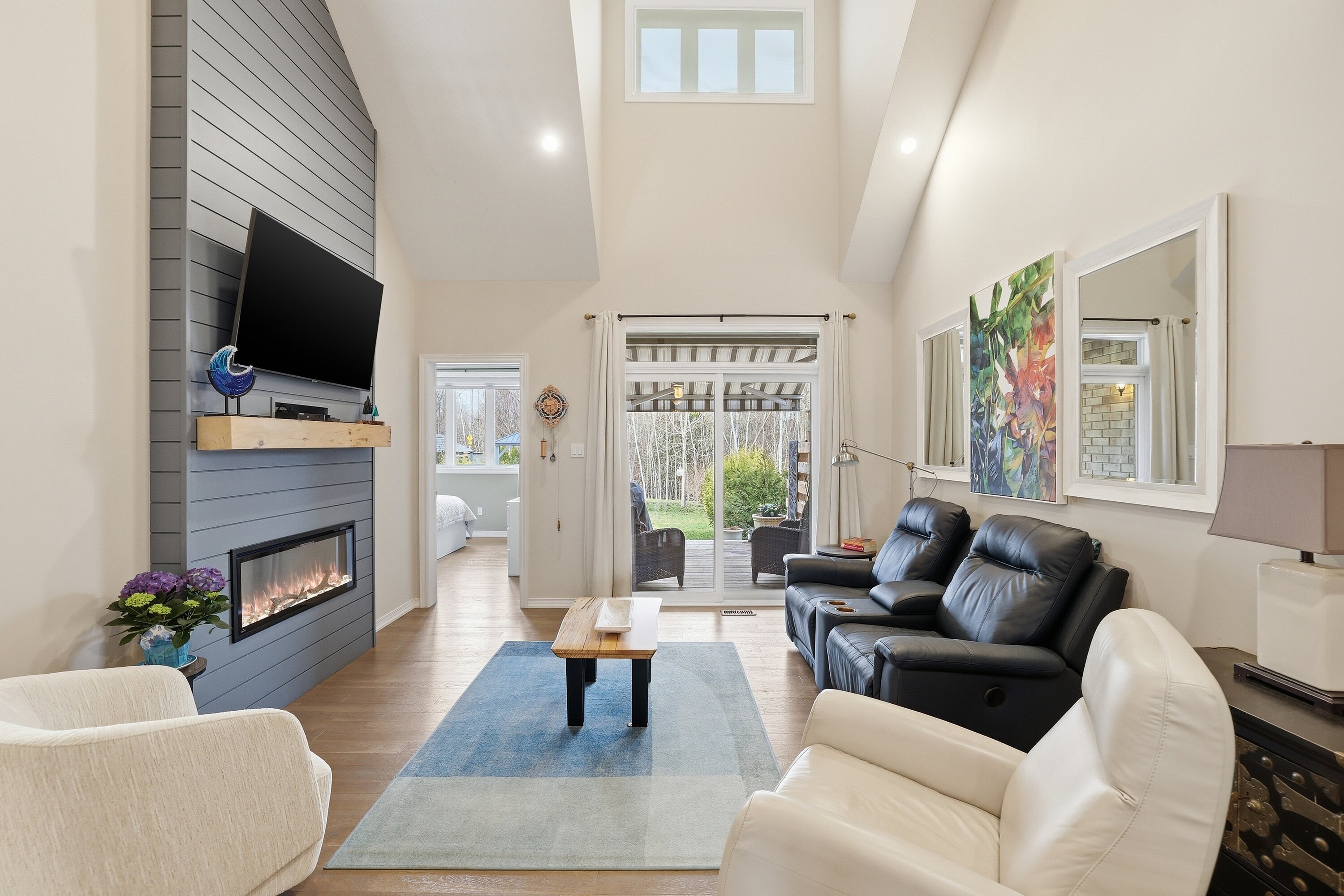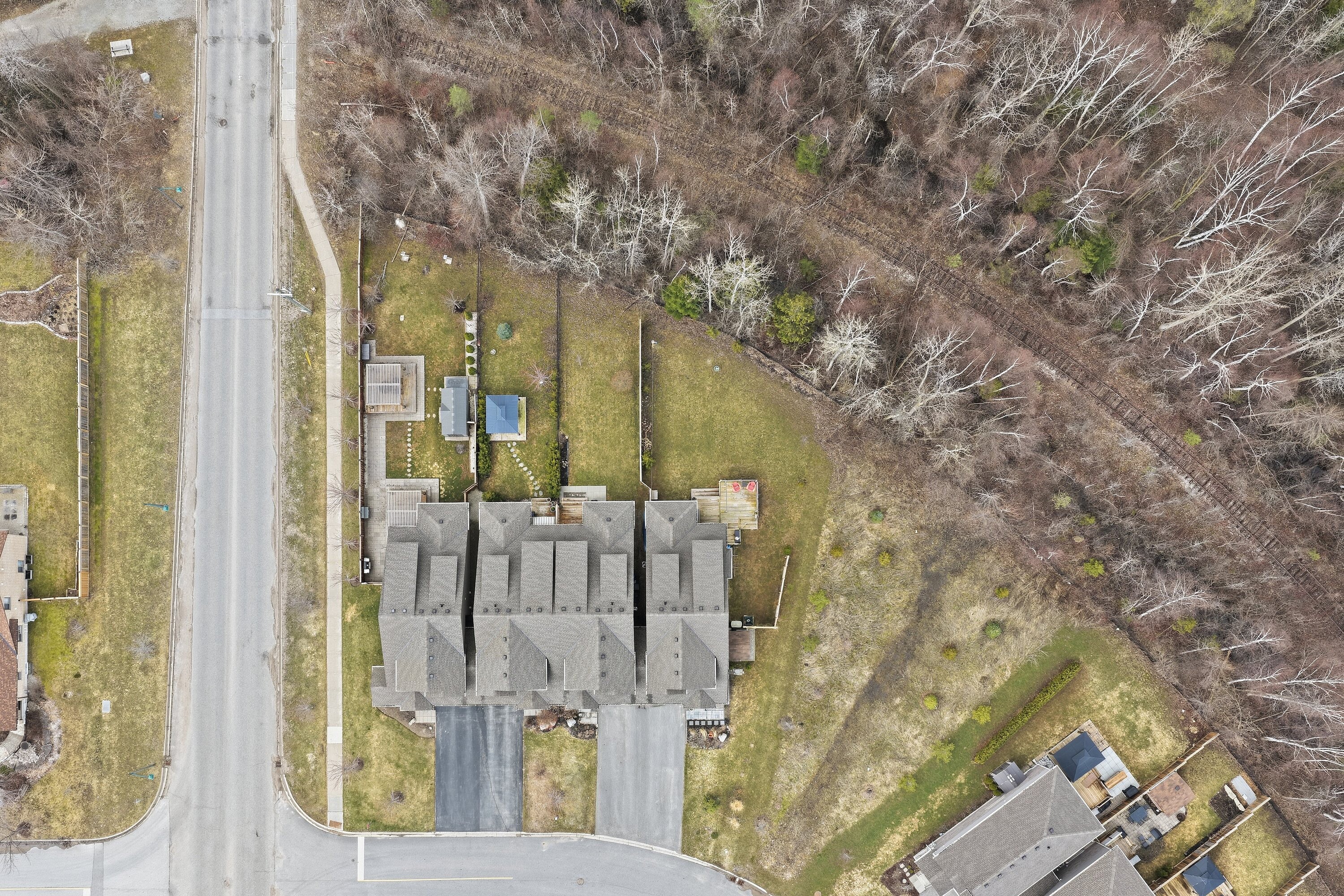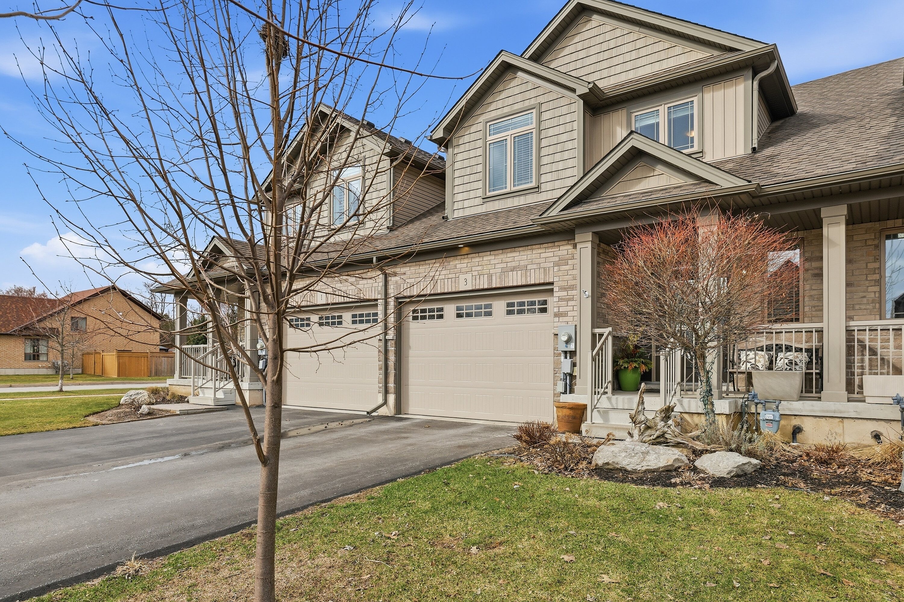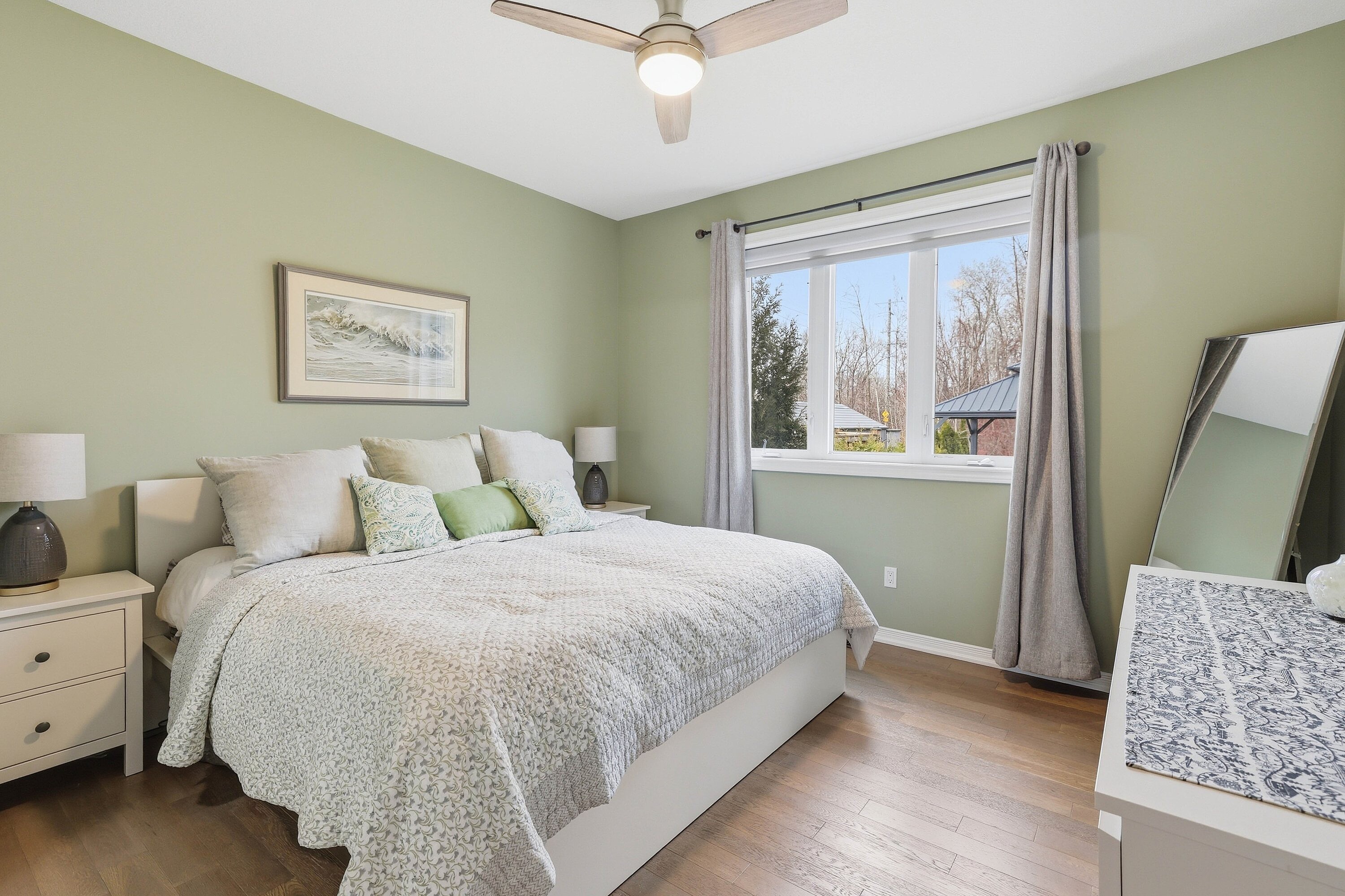 Stunning Sunvale bungaloft townhome set on an extra-deep premium lot backing onto the scenic railway trail and a serene forested area. Designed for effortless main-floor living, this home features a bright open-concept kitchen, dining, and living space highlighted by a soaring vaulted ceiling, oak hardwood flooring and a beautiful fireplace as the focal point. The living area seamlessly extends to a covered porch-perfect for relaxing or entertaining-while a separate deck overlooks the beautifully landscaped, expansive backyard. The main-floor primary suite offers a walk-in closet, a four-piece ensuite, and peaceful views of the lush rear yard. Upstairs, a lofted space open to below creates an airy feel and is complemented by a dedicated office, two additional bedrooms, and a four-piece bathroom-ideal for family or guests. Additional features include a 1.5 car garage with inside entry, parking for two vehicles in the driveway, main floor laundry and a full unfinished basement ready for your customization. Ideally located close to downtown Collingwood, local schools, and an abundance of trails, this home offers the perfect blend of comfort, style, and convenience.
