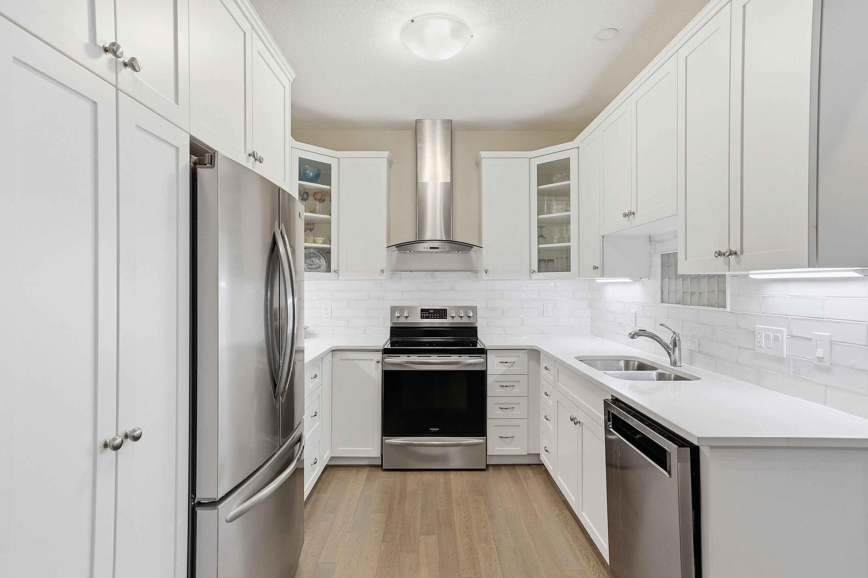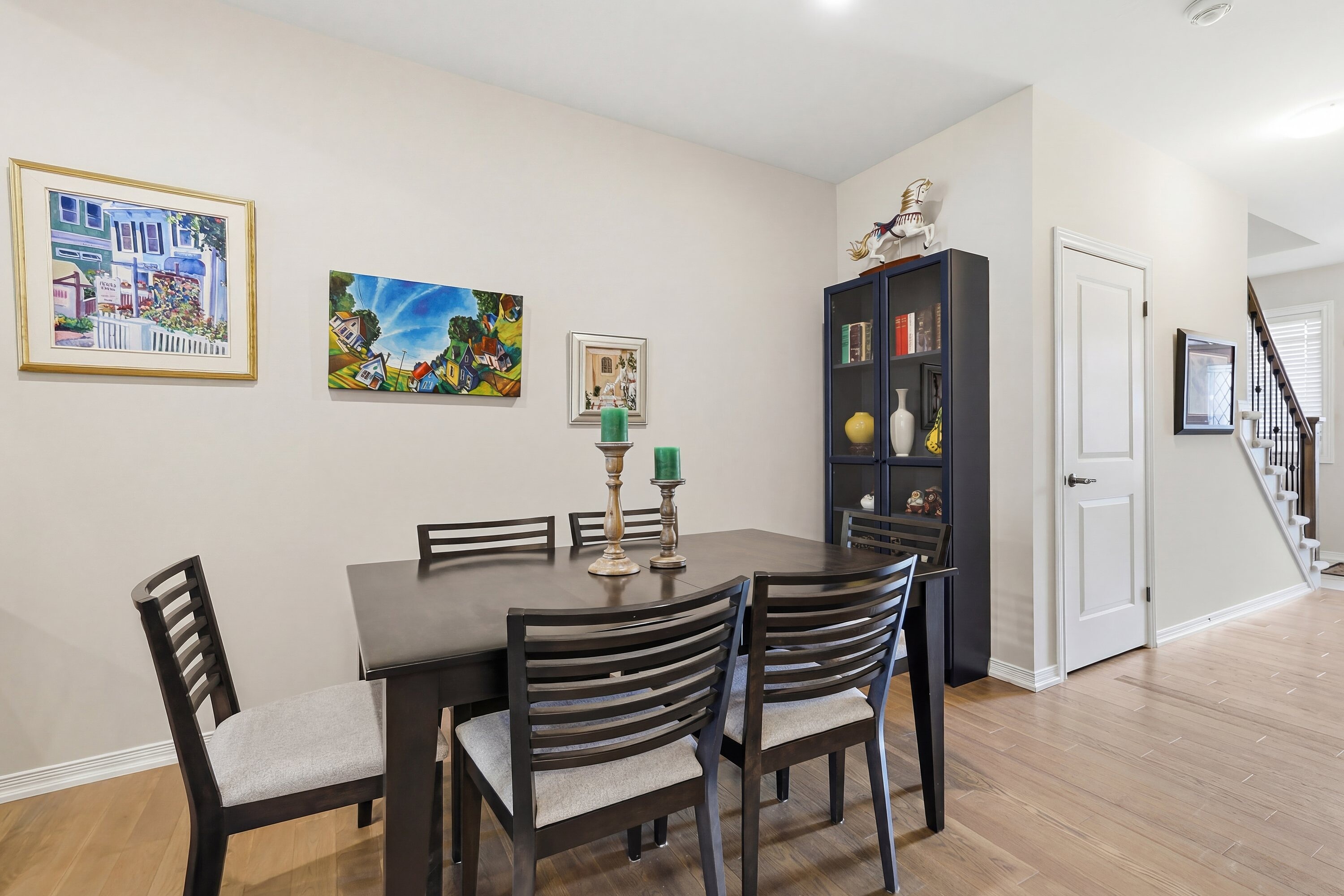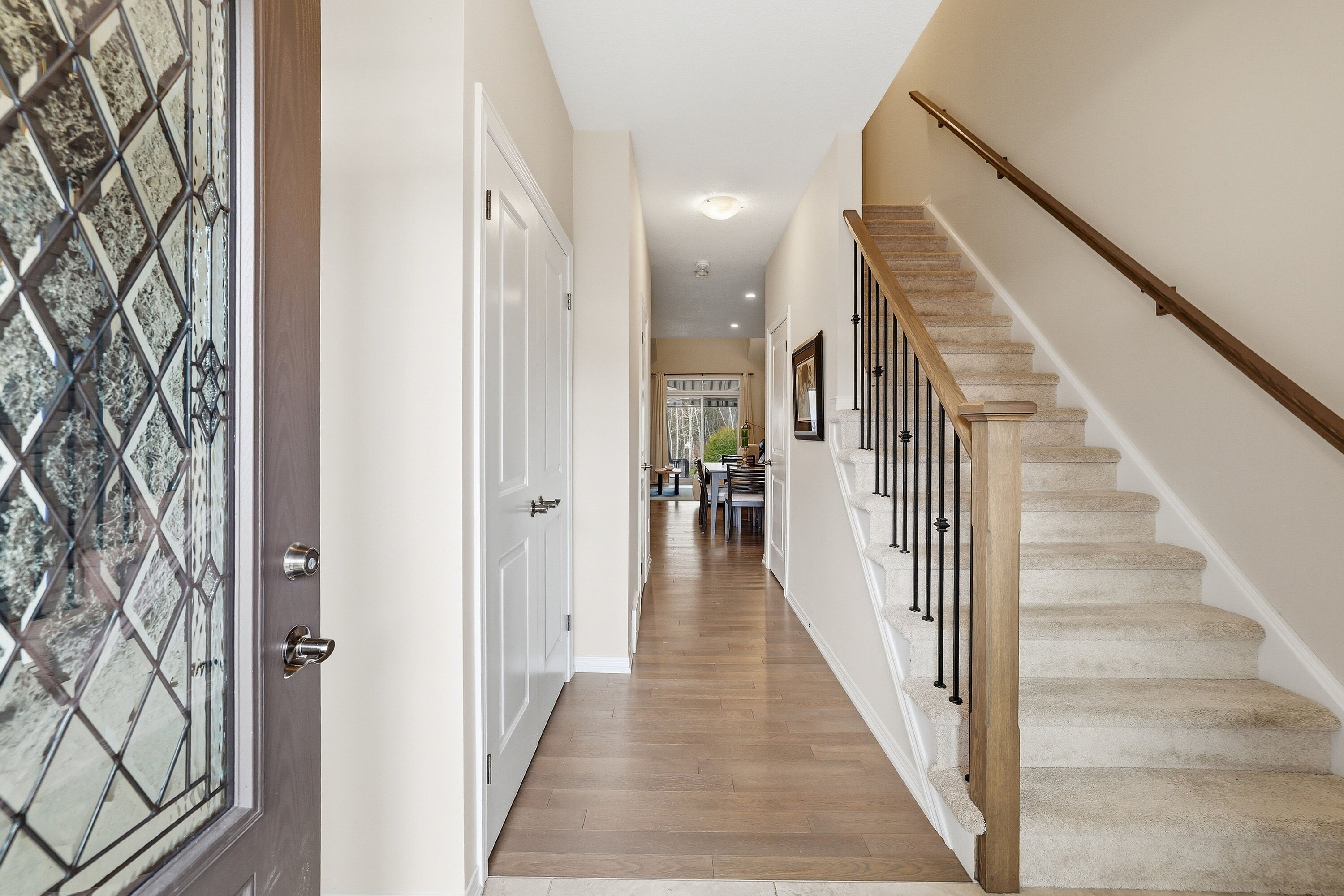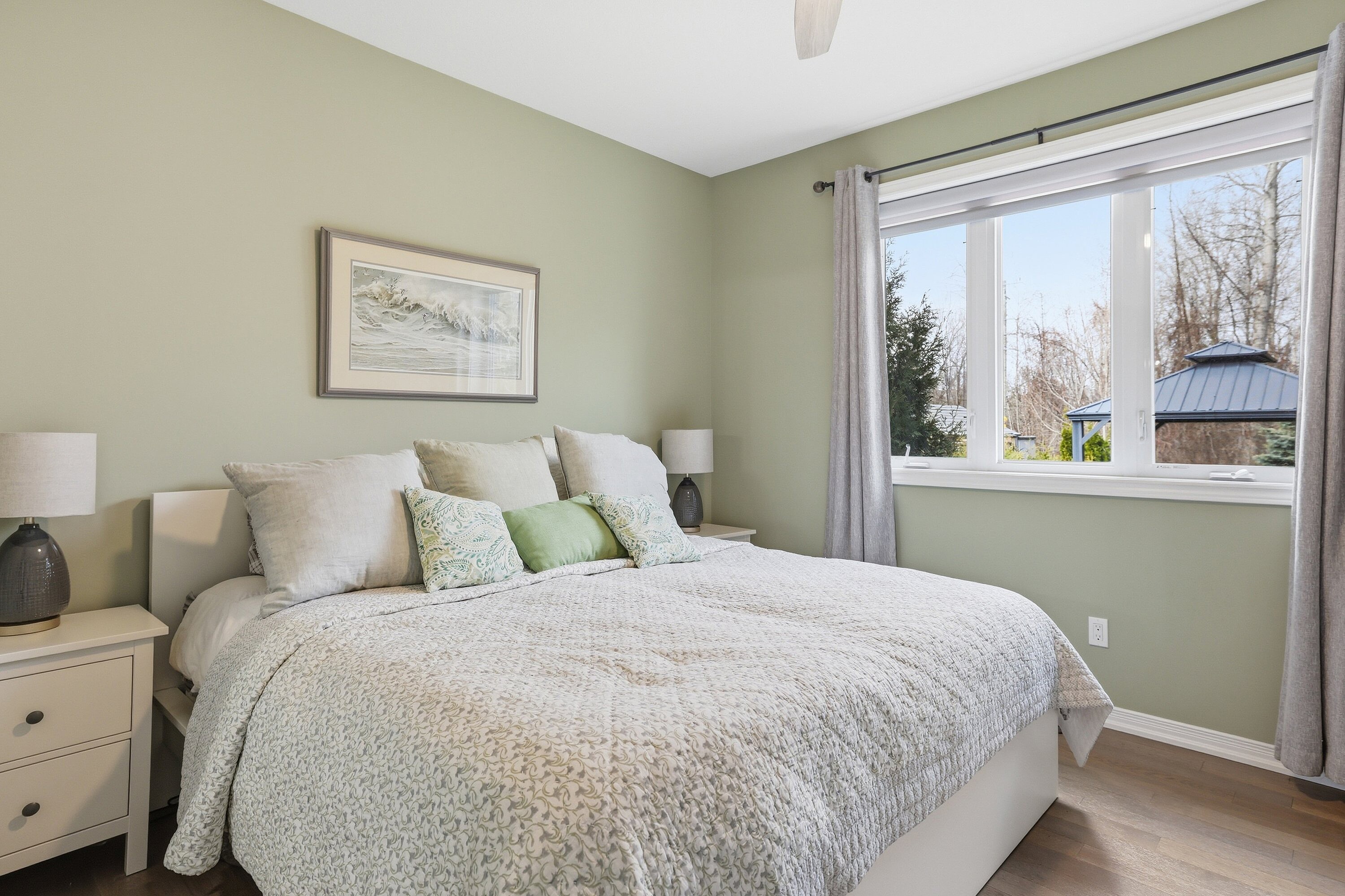 Stunning Sunvale bungaloft townhome set on an extra-deep premium lot backing onto the scenic railway trail and a serene forested area. Designed for effortless main-floor living, this home features a bright open-concept kitchen, dining, and living space highlighted by a soaring vaulted ceiling, oak hardwood flooring and a beautiful fireplace as the focal point. The living area seamlessly extends to a covered porch-perfect for relaxing or entertaining-while a separate deck overlooks the beautifully landscaped, expansive backyard. The main-floor primary suite offers a walk-in closet, a four-piece ensuite, and peaceful views of the lush rear yard. Upstairs, a lofted space open to below creates an airy feel and is complemented by a dedicated office, two additional bedrooms, and a four-piece bathroom-ideal for family or guests. Additional features include a 1.5 car garage with inside entry, parking for two vehicles in the driveway, main floor laundry and a full unfinished basement ready for your customization. Ideally located close to downtown Collingwood, local schools, and an abundance of trails, this home offers the perfect blend of comfort, style, and convenience.