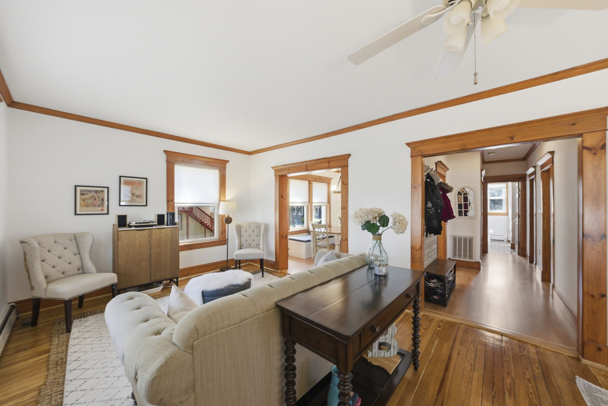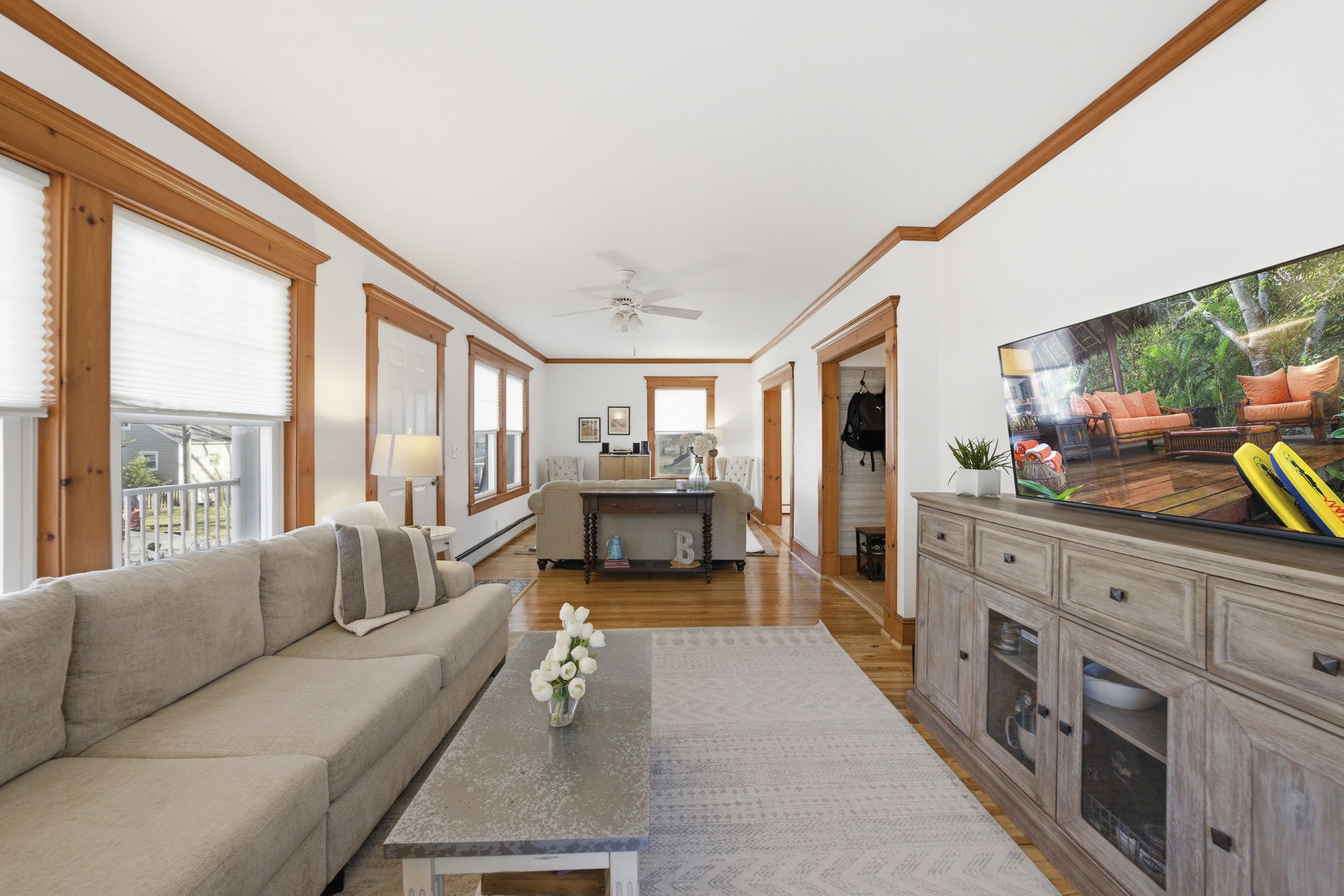 Welcome to this charming, move-in ready home nestled on a quiet street in the heart of town. Offering exceptional value in today's market, this beautifully updated home features 4 bedrooms and 2 full bathrooms, sits on an expansive .315 acre lot, and combines character, comfort, and many thoughtful updates throughout. A welcoming front porch invites you inside to a bright and inviting living room that flows seamlessly into the dining room and a renovated kitchen featuring new stainless steel appliances - perfect for both everyday living and entertaining. The first floor also offers a convenient primary bedroom, an updated full bathroom and a bonus room perfect for an office, providing flexible main level living. Upstairs, a spacious second floor family room creates the ideal additional living space, along with three generously sized bedrooms and another full bathroom. The finished basement expands the home's versatility with a large recreation area and a newly added gym, ideal for today's lifestyle needs. Step outside to a beautiful Trex deck overlooking the expansive backyard, offering exceptional outdoor space for relaxing, entertaining, and future possibilities. With a new roof, new AC systems and numerous updates throughout, this home truly has it all and is ready for its next owners to enjoy. Just moments from top-rated schools, NYC transportation, and the vibrant center of town.