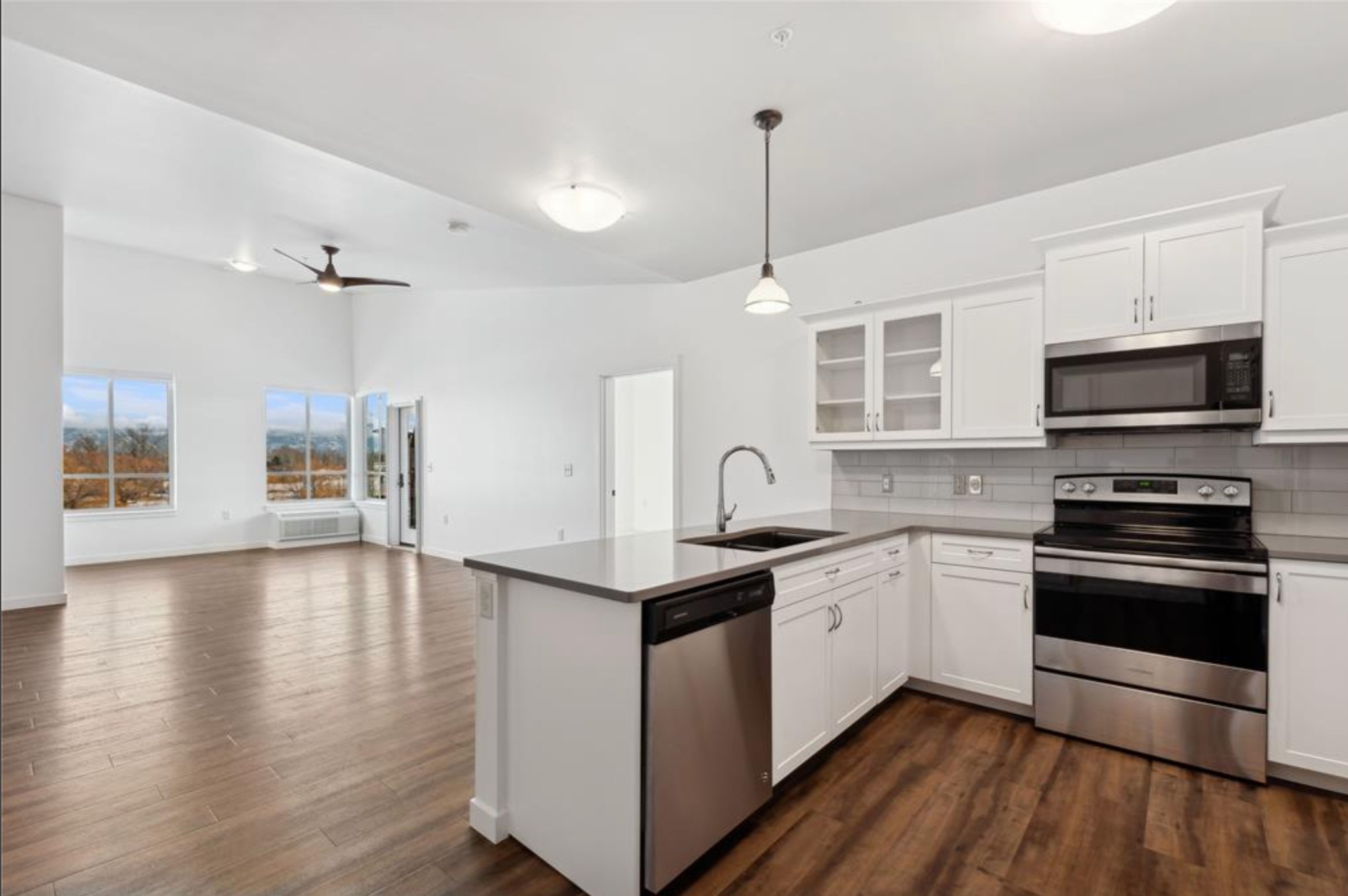 This beautiful 2 bedroom, 2 bath condo on the top floor of the Spruce Building is a coveted end unit with more square footage and views of snow capped mountain peaks. Enjoy stress-free living at the Woodlands which is a 55+ condo complex located in the heart of Kalispell on 11 acres allowing for 60% green space. With high ceilings, big windows, an open floor plan and a fresh coat of paint, this unit feels airy, bright and move in ready. To add to its charm, the condo offers quartz countertops, stainless appliances, washer/dryer and individual heating and air for each room. The assigned parking space, storage room and access to recycling bins are located on the ground level in a heated and secure parking garage.