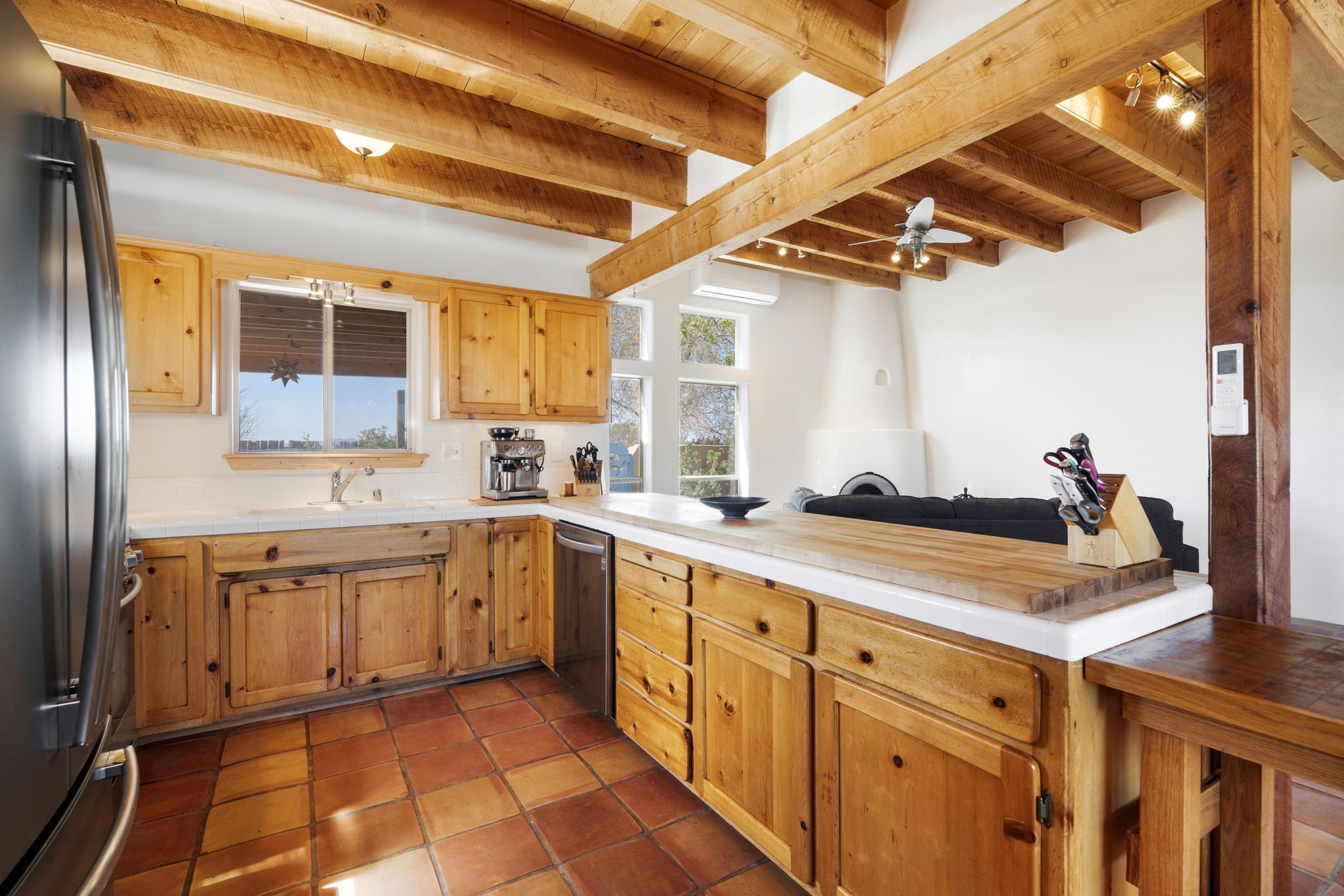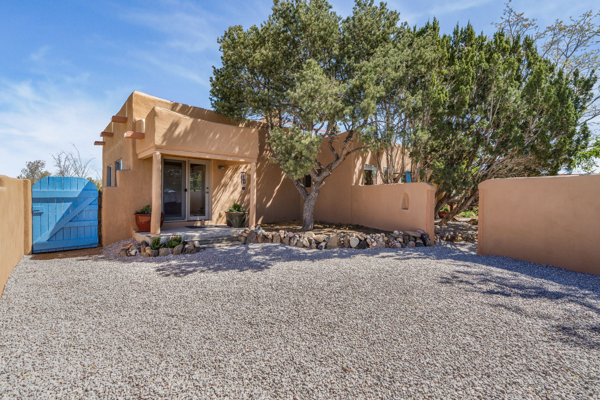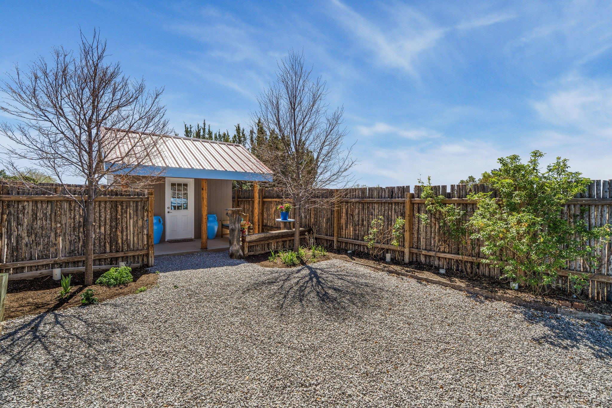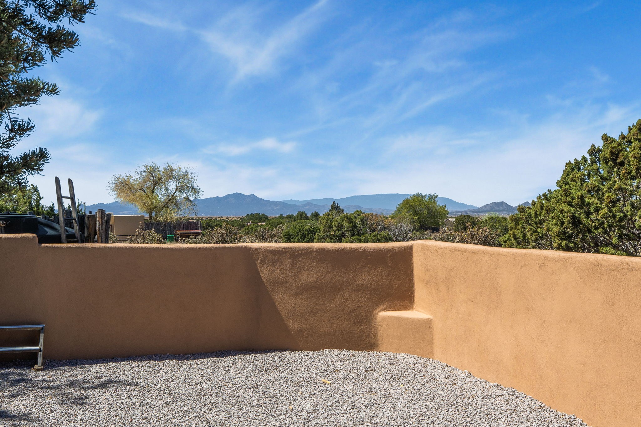 Charming single-level Eldorado retreat with stunning mountain views, offering 4 bedrooms, 3 full baths, and a separate 10' x 12' studio/office built in 2025. The open floor plan seamlessly connects the kitchen, dining, and living areas, creating an inviting space for everyday living and entertaining. The home features two potential primary bedroom suites, each with direct access to the beautifully landscaped backyard. A traditional kiva fireplace anchors the living room, while Saltillo tile floors and beamed ceilings add warmth and character throughout much of the home. Step outside to enjoy the lush gardens with fruit trees, thoughtfully designed with multiple spaces for relaxation and gatherings. The property includes a 1,500-gallon water tank that supports the irrigation system, and a shared well—resulting in no water bill (sellers currently pay just $50 per quarter for electricity). New TPO roof with a 15-year warranty and new skylights. Mini-splits provide efficient heating and cooling, including in the studio. Finished, direct entry two-car garage and a luxury heated and insulated chicken coop. Shared well located on the property (meter on neighboring lot). Select items can convey, including the desk and chairs in the studio and extra freezers in the garage. This unique property blends Southwestern charm with modern comfort—ideal for those seeking space, flexibility, and serene surroundings. Extensive list of seller upgrades in supplements.