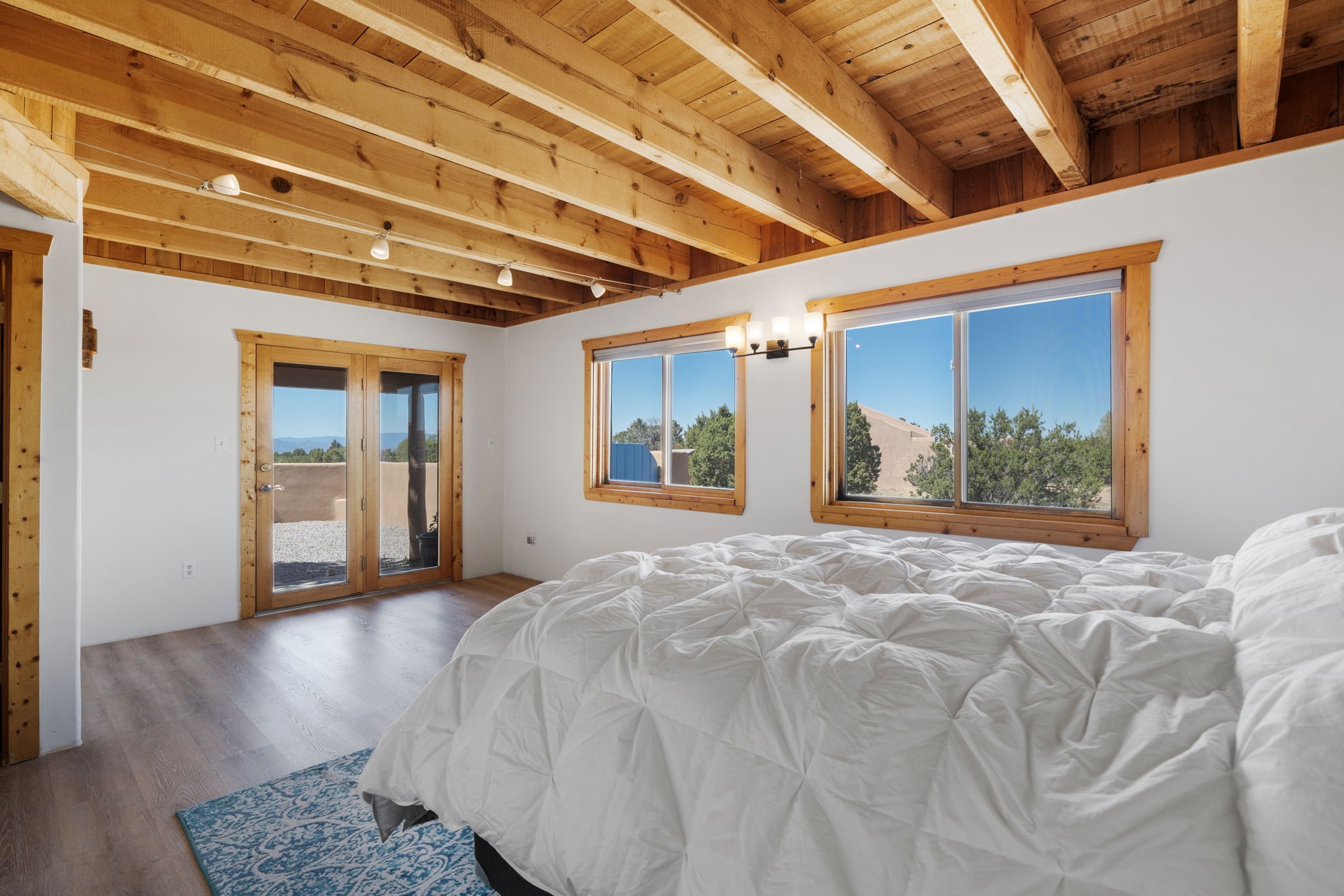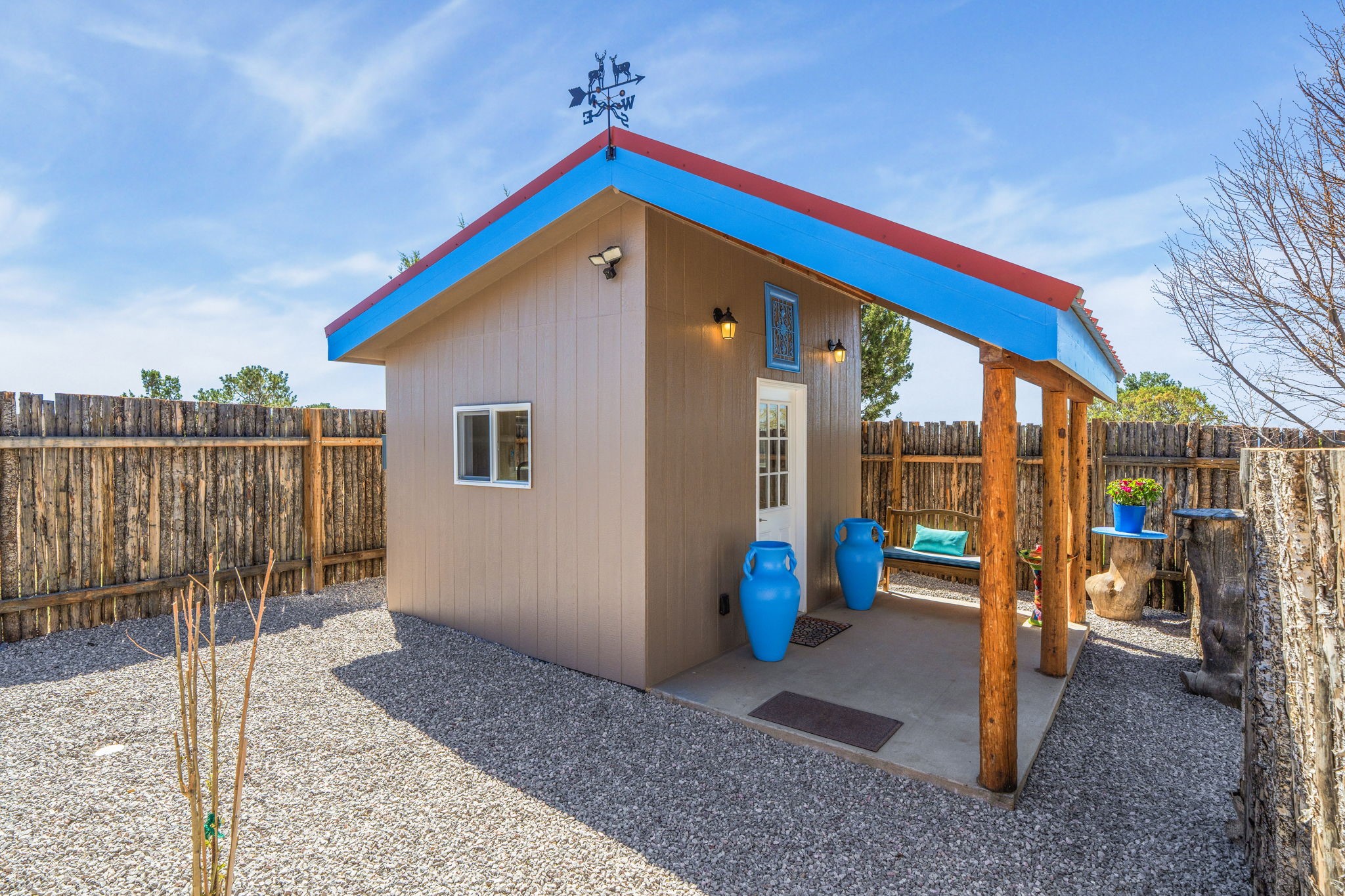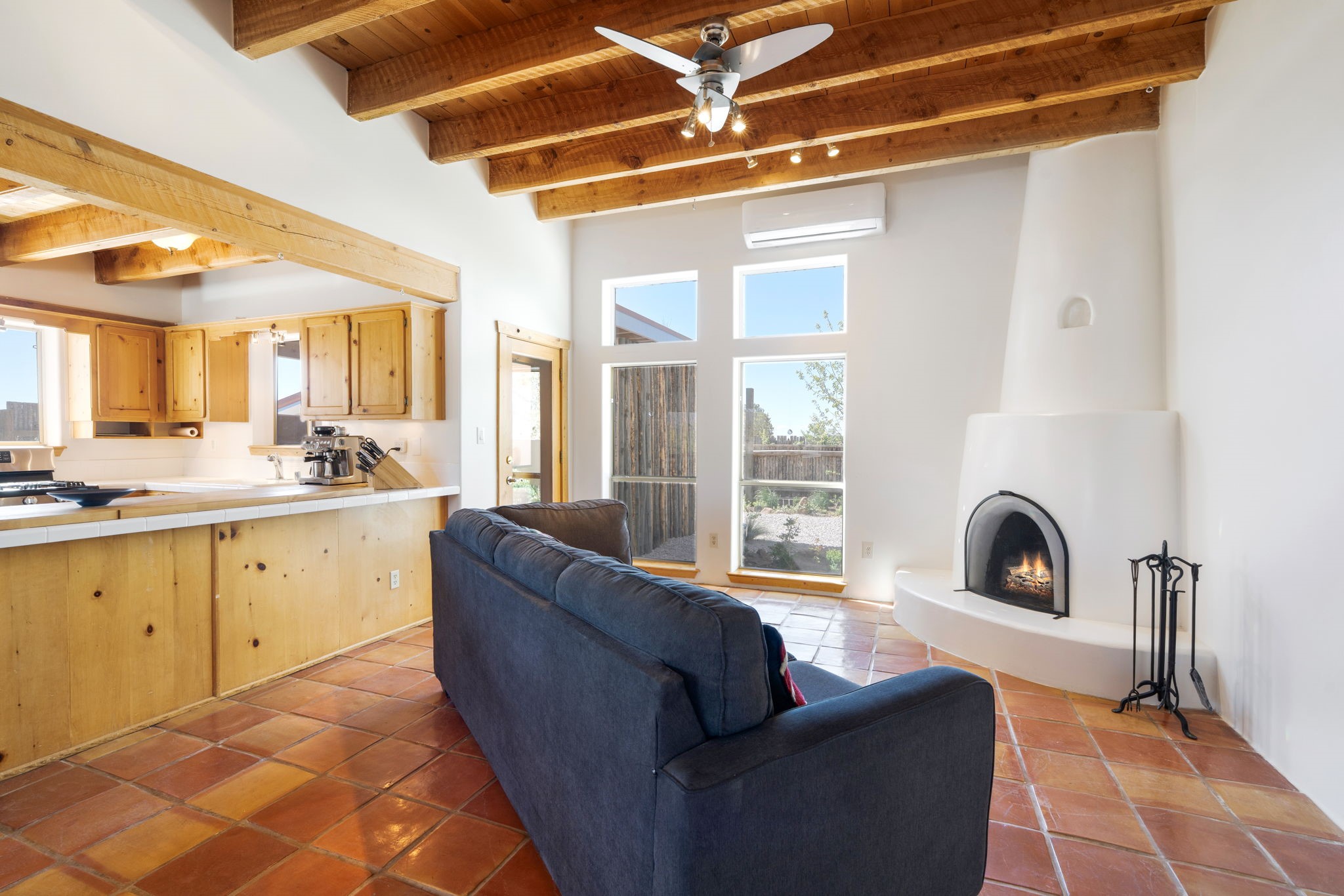 Charming single-level Eldorado retreat with stunning mountain views, offering 4 bedrooms, 3 full baths, and a separate 10' x 12' studio/office built in 2025. The open floor plan seamlessly connects the kitchen, dining, and living areas, creating an inviting space for everyday living and entertaining. The home features two potential primary bedroom suites, each with direct access to the beautifully landscaped backyard. A traditional kiva fireplace anchors the living room, while Saltillo tile floors and beamed ceilings add warmth and character throughout much of the home. Step outside to enjoy the lush gardens with fruit trees, thoughtfully designed with multiple spaces for relaxation and gatherings. The property includes a 1,500-gallon water tank that supports the irrigation system, and a shared well—resulting in no water bill (sellers currently pay just $50 per quarter for electricity). New TPO roof with a 15-year warranty and new skylights. Mini-splits provide efficient heating and cooling, including in the studio. Finished, direct entry two-car garage and a luxury heated and insulated chicken coop. Shared well located on the property (meter on neighboring lot). Select items can convey, including the desk and chairs in the studio and extra freezers in the garage. This unique property blends Southwestern charm with modern comfort—ideal for those seeking space, flexibility, and serene surroundings. Extensive list of seller upgrades in supplements.