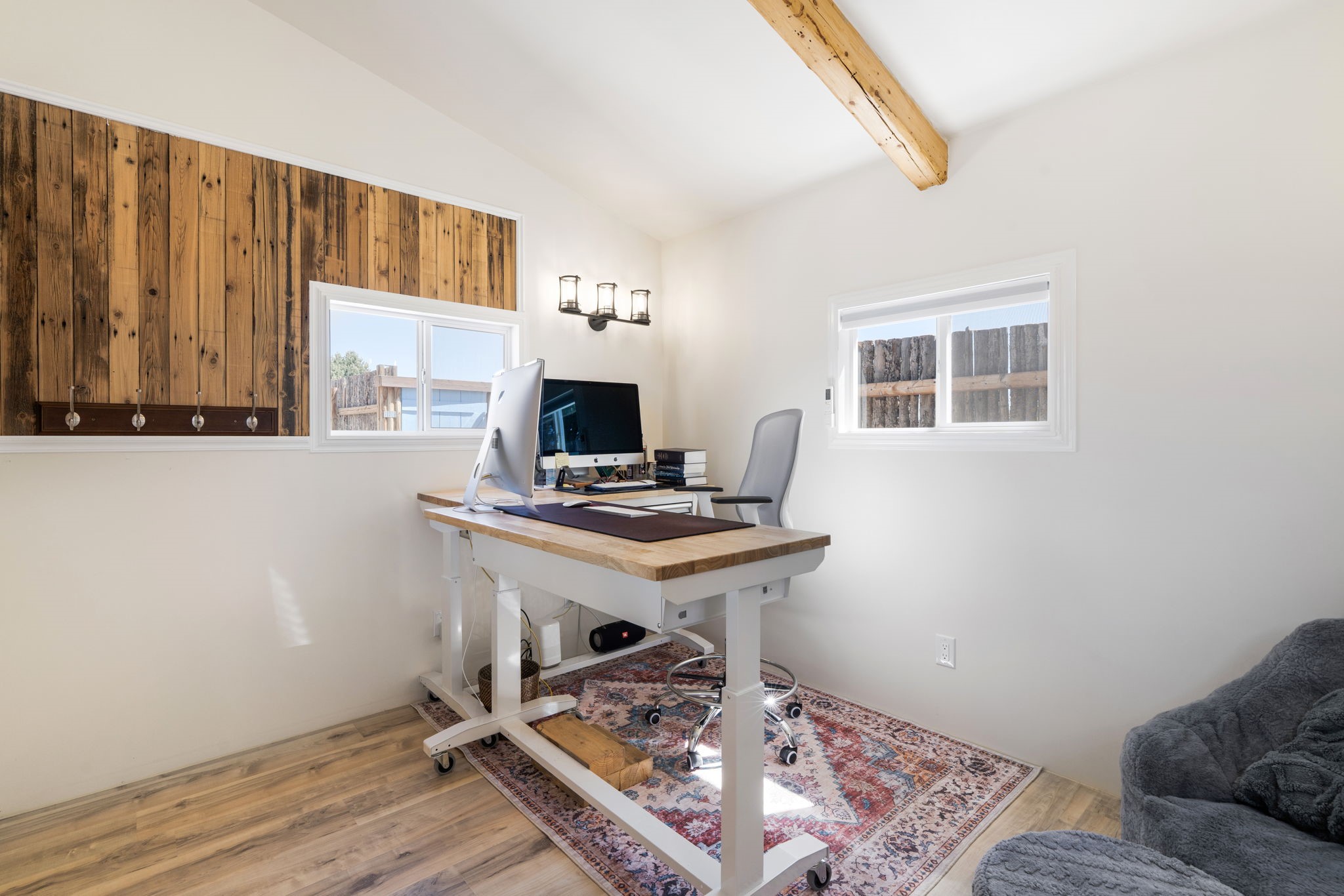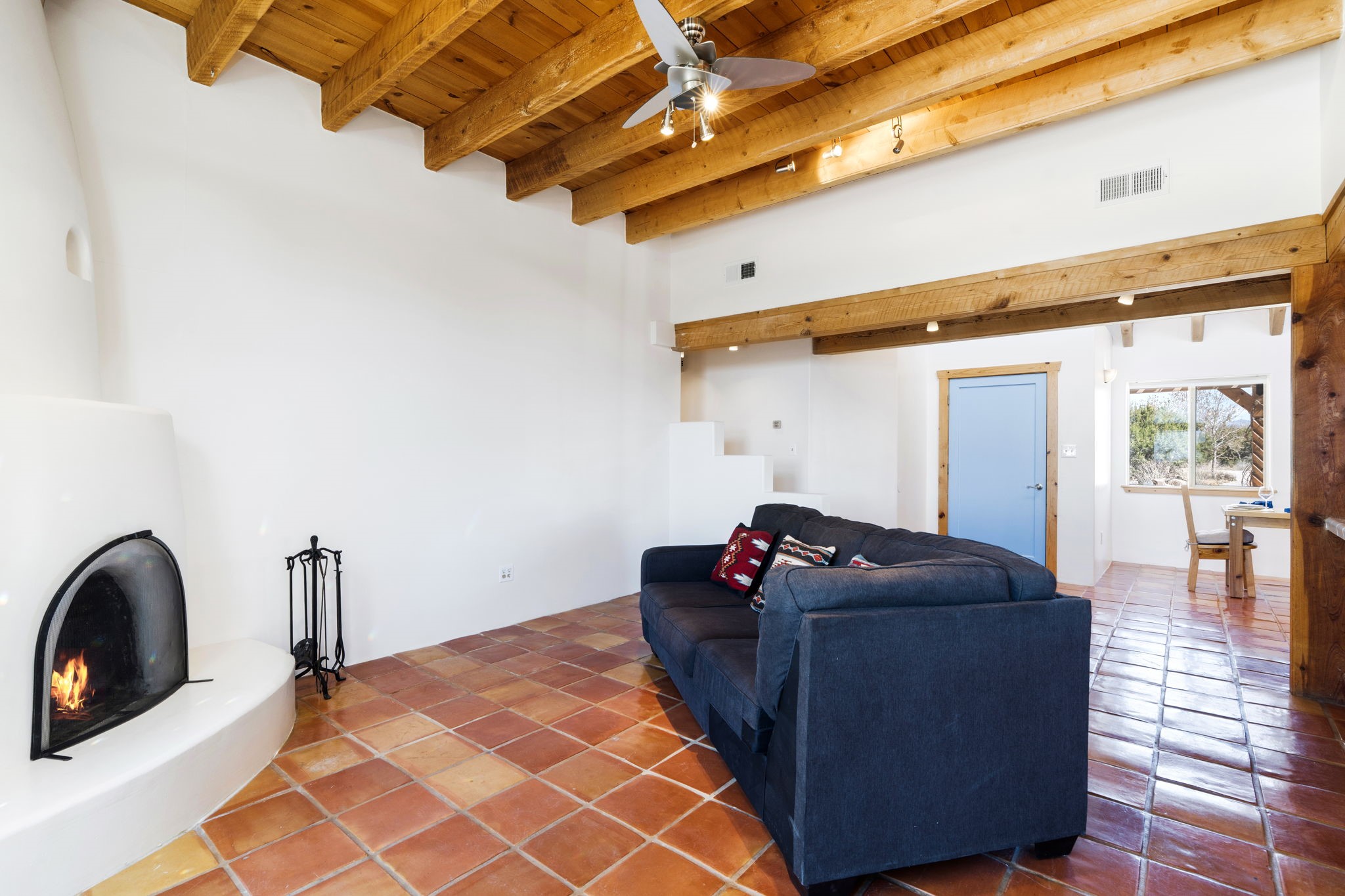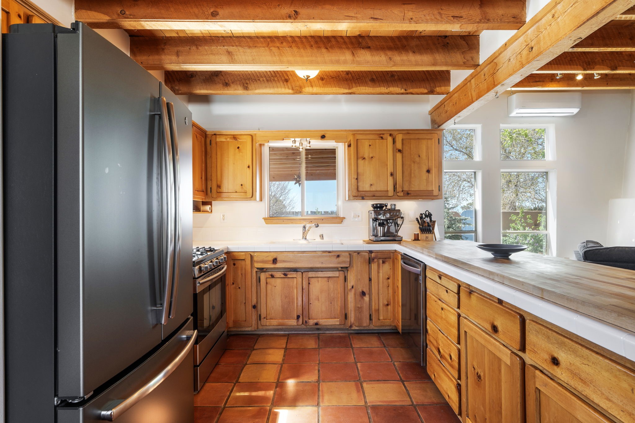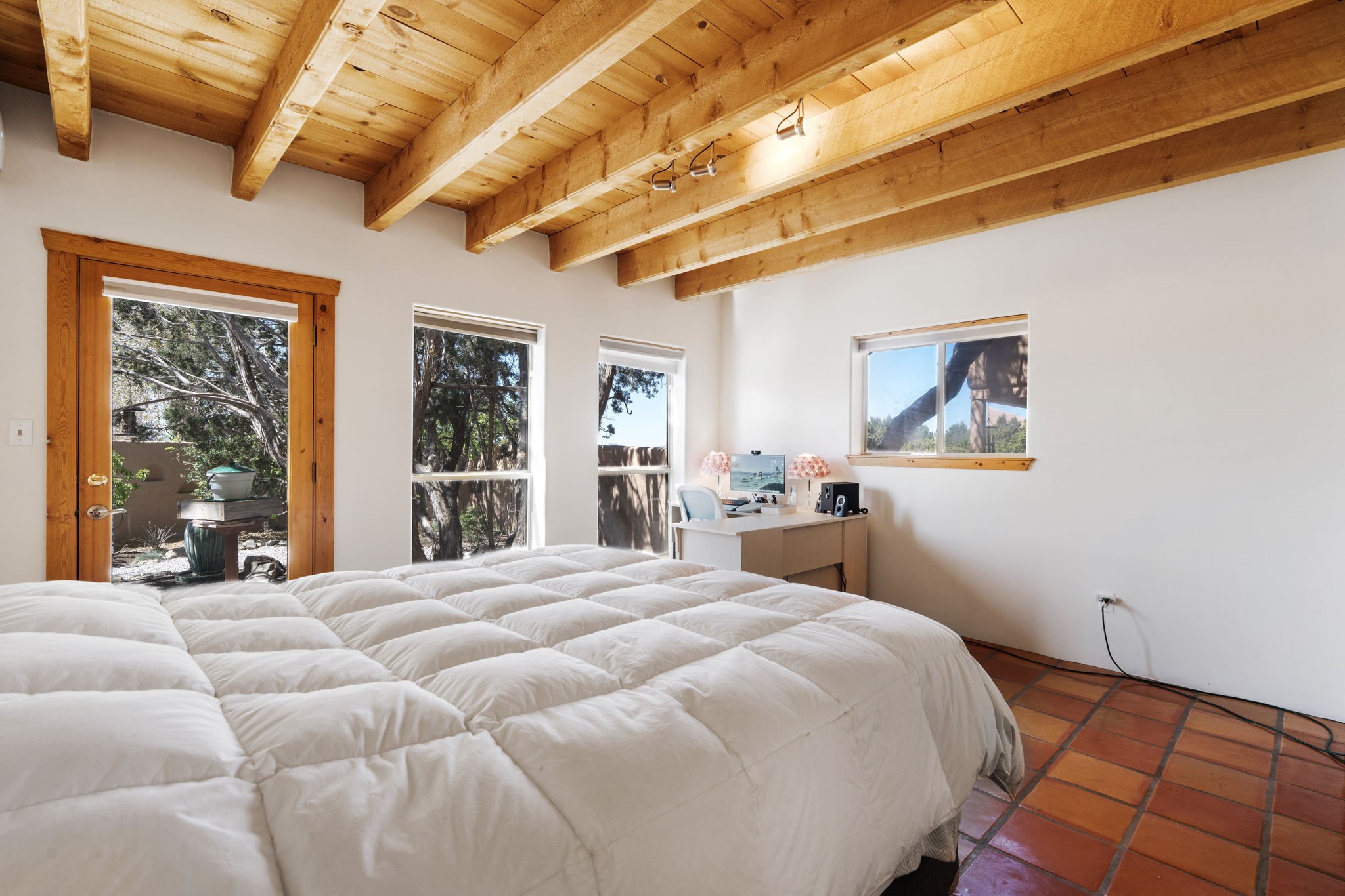 Charming single-level Eldorado retreat with stunning mountain views, offering 4 bedrooms, 3 full baths, and a separate 10' x 12' studio/office built in 2025. The open floor plan seamlessly connects the kitchen, dining, and living areas, creating an inviting space for everyday living and entertaining. The home features two potential primary bedroom suites, each with direct access to the beautifully landscaped backyard. A traditional kiva fireplace anchors the living room, while Saltillo tile floors and beamed ceilings add warmth and character throughout much of the home. Step outside to enjoy the lush gardens with fruit trees, thoughtfully designed with multiple spaces for relaxation and gatherings. The property includes a 1,500-gallon water tank that supports the irrigation system, and a shared well—resulting in no water bill (sellers currently pay just $50 per quarter for electricity). New TPO roof with a 15-year warranty and new skylights. Mini-splits provide efficient heating and cooling, including in the studio. Finished, direct entry two-car garage and a luxury heated and insulated chicken coop. Shared well located on the property (meter on neighboring lot). Select items can convey, including the desk and chairs in the studio and extra freezers in the garage. This unique property blends Southwestern charm with modern comfort—ideal for those seeking space, flexibility, and serene surroundings. Extensive list of seller upgrades in supplements.