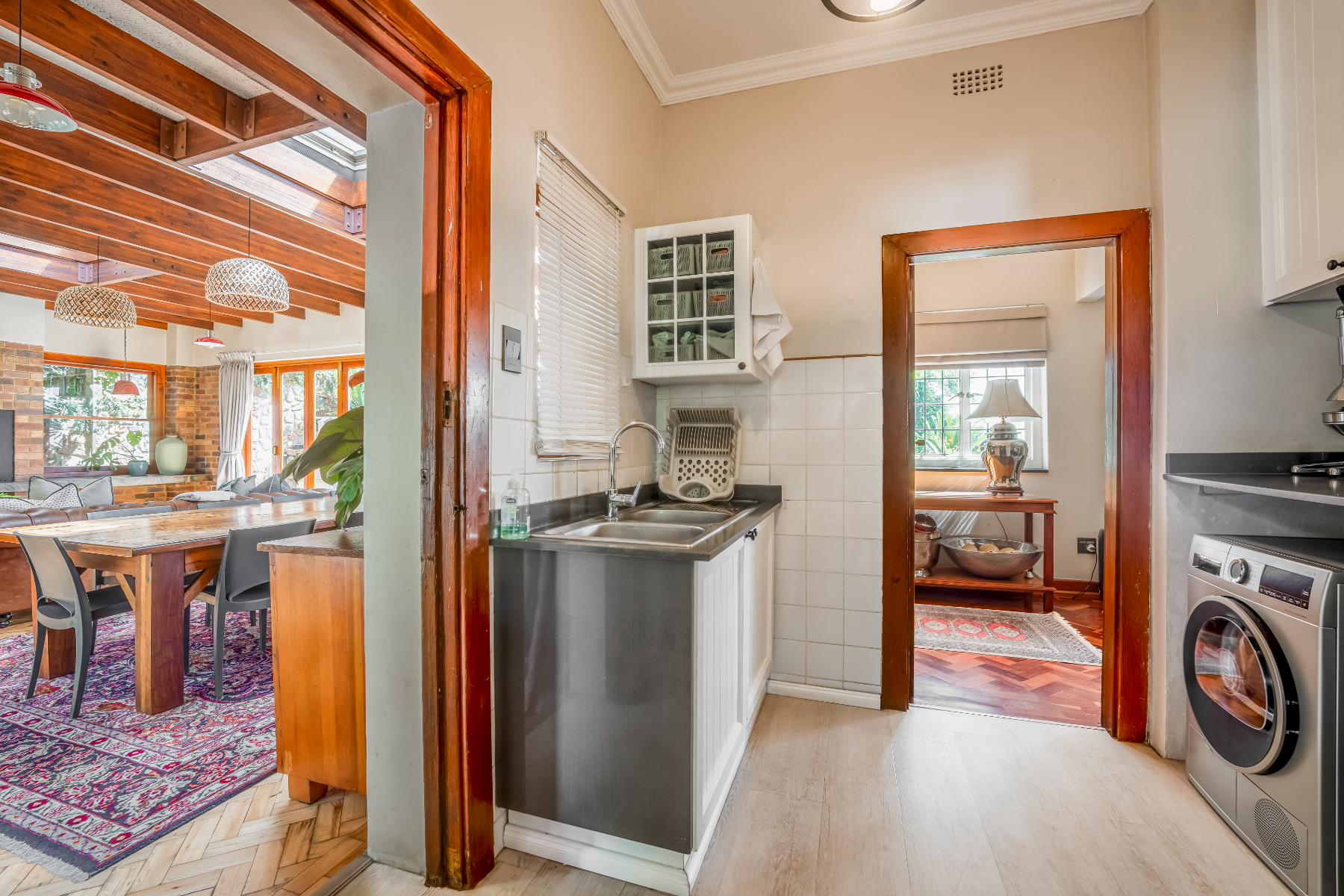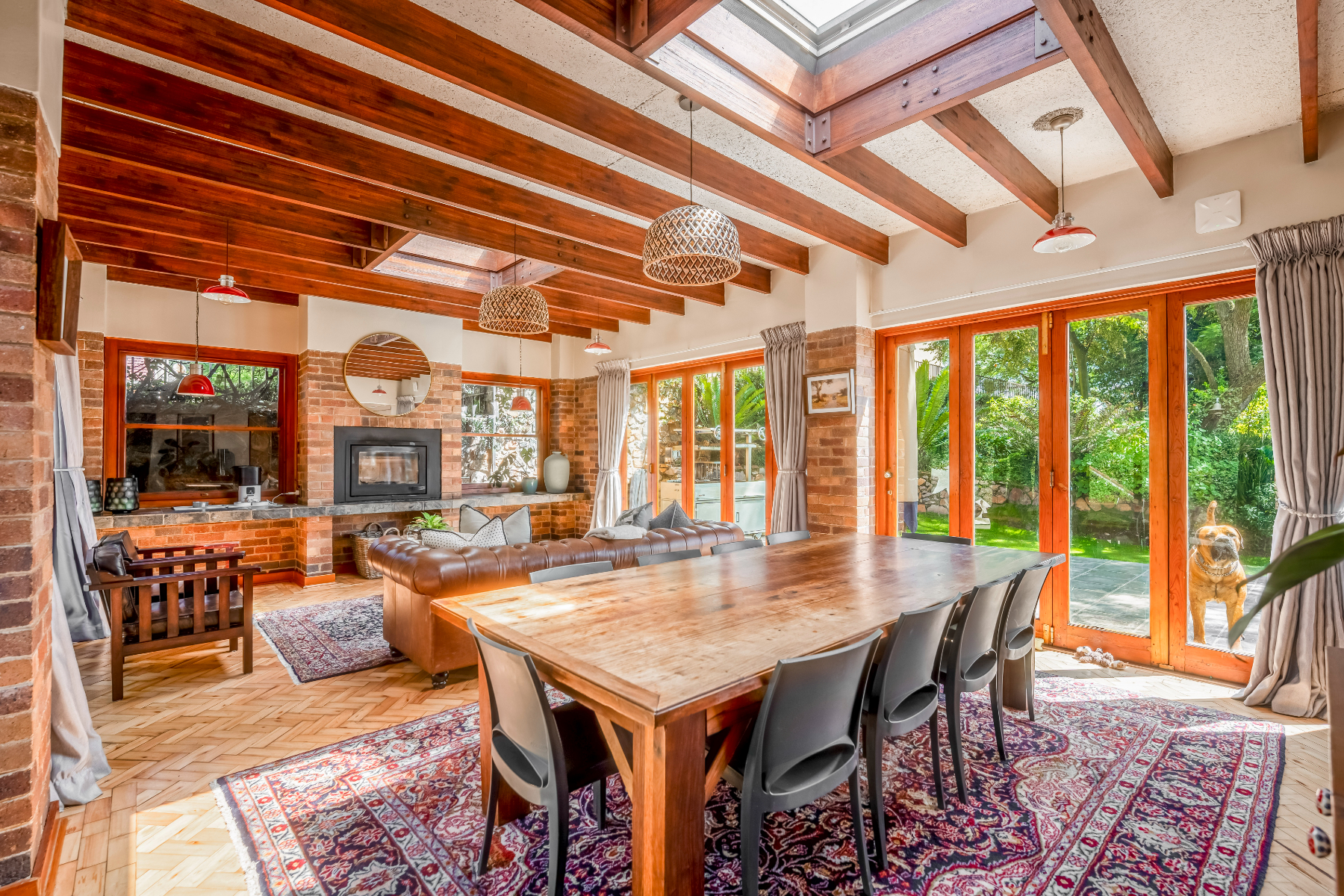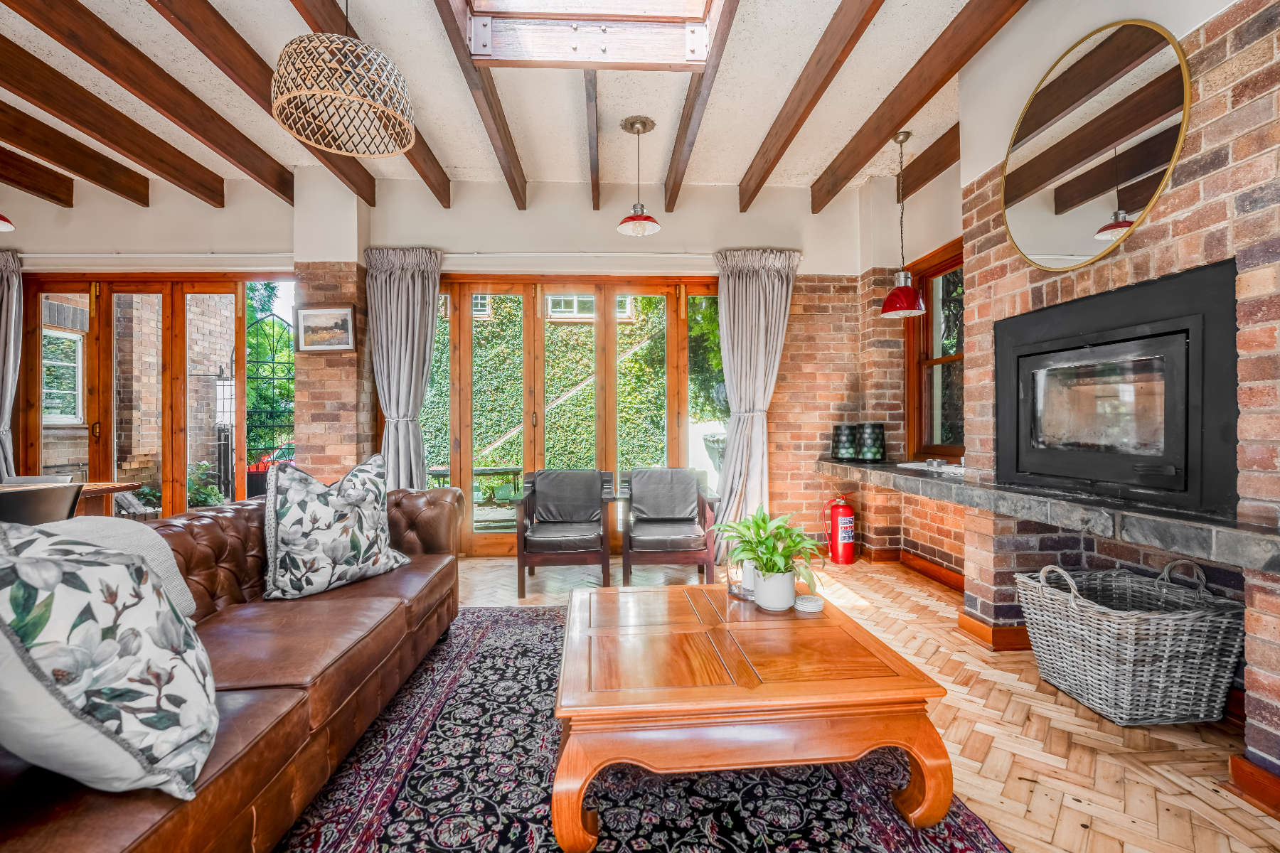 The kitchen is a chef’s delight, featuring artisan cabinetry, Caesarstone countertops, a gas stove with Egoli gas, and a separate scullery. A spacious entertainment room with a fireplace, skylights, and stack-back doors opens onto the outdoor living area—perfect for hosting in style.