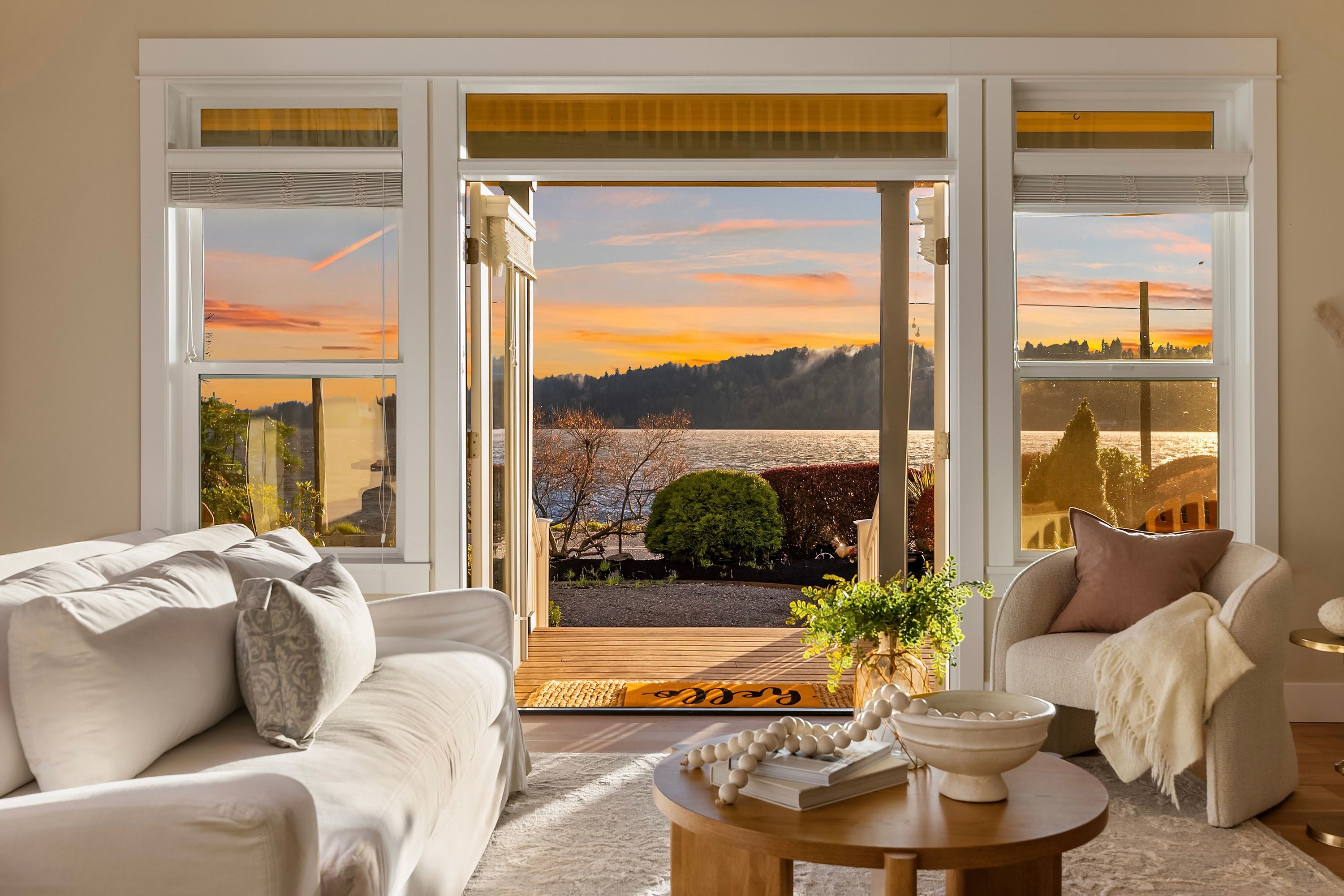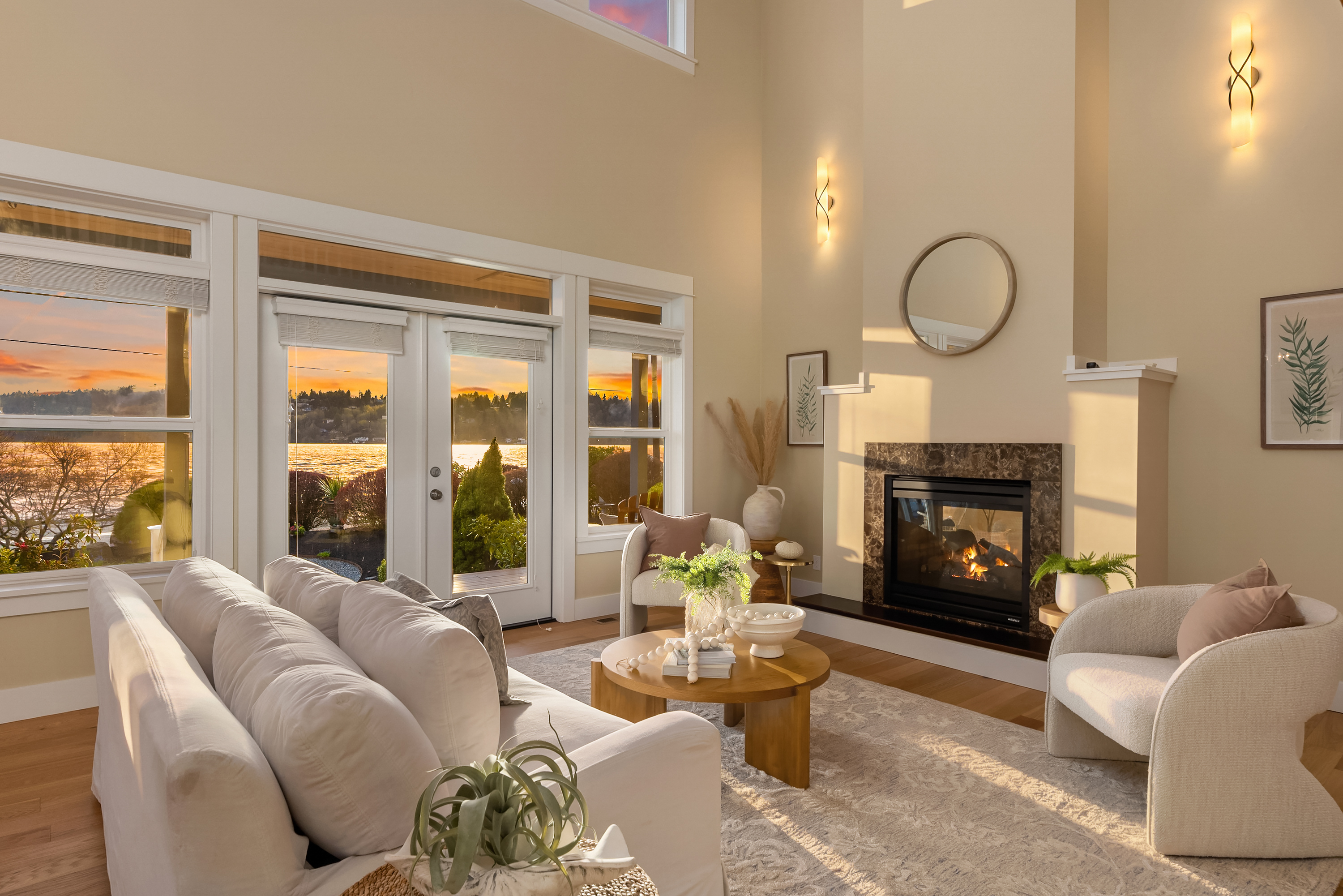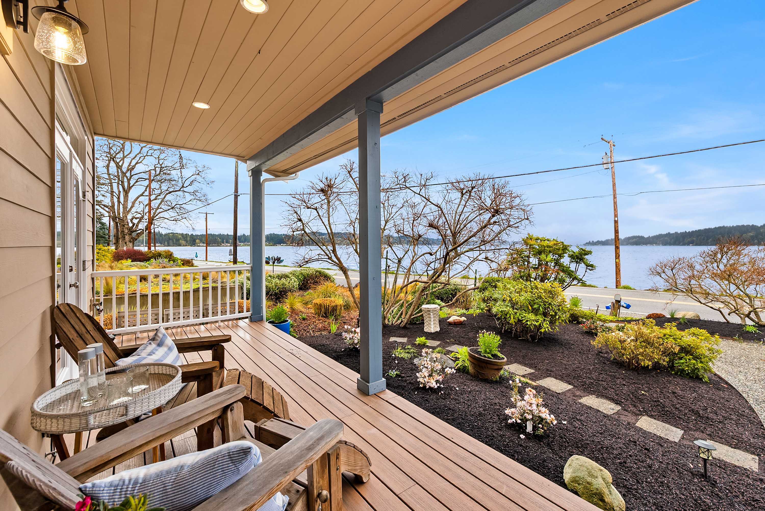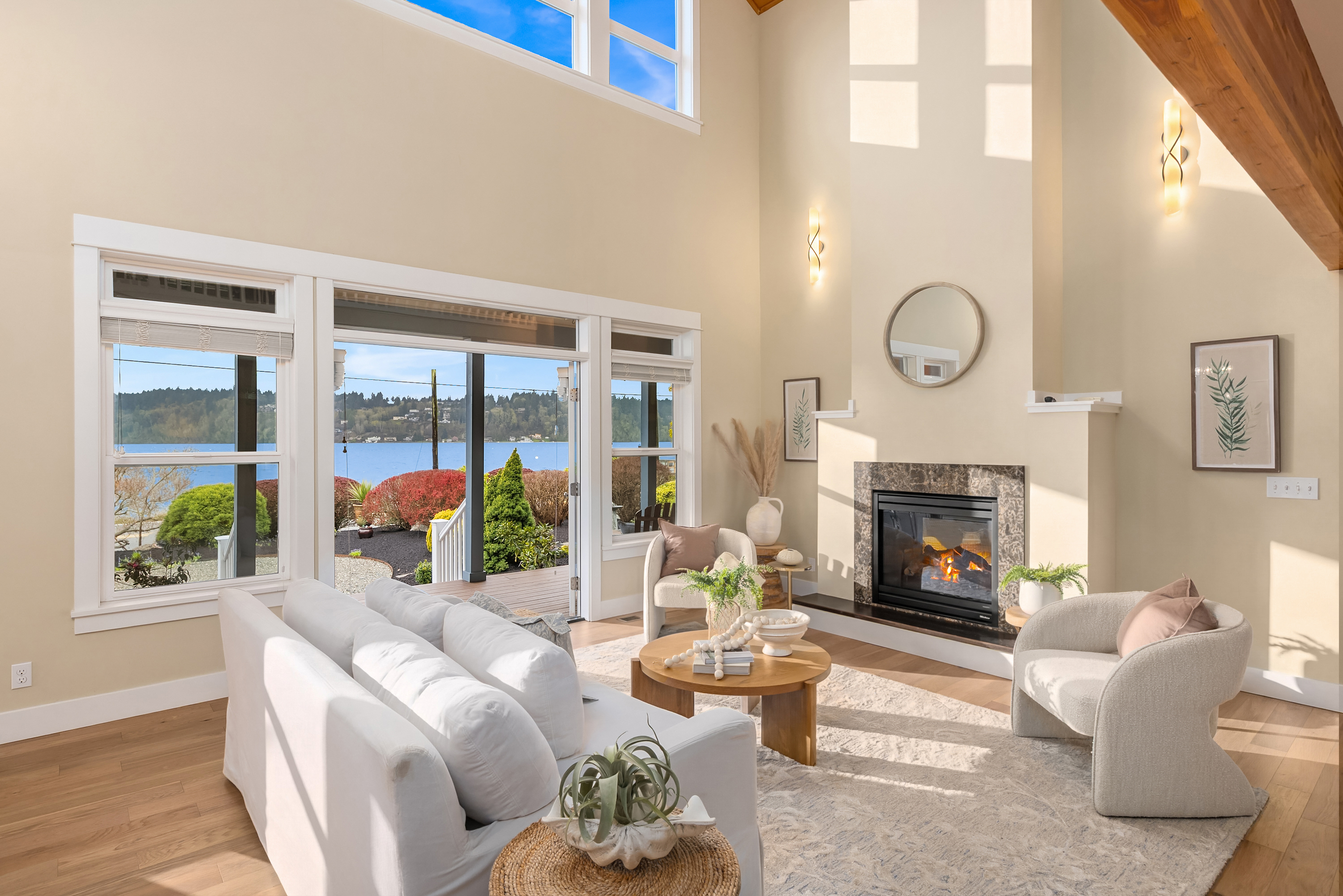 Sunlit and serene waterfront living awaits at this stunning Crystal Springs retreat, perfectly positioned to capture sweeping views of the ever-changing Rich Passage. Thoughtfully designed with a comfortable floorplan, this sweet home sits on a sunny half-acre with beautifully manicured gardens in one of Bainbridge Island’s most sought-after locations. The open-concept main level features a dramatic two-story great room with expansive windows and a double-sided fireplace, creating a bright and inviting living space. French doors open to the beach-side gardens, providing seamless indoor-outdoor living. The kitchen is well-appointed with Bosch appliances, a walk-in pantry, & ample counter space- ideal for everyday living & entertaining. The main-level primary suite includes a fireplace, spa-inspired bath, dual walk-in closets, & direct access to the tranquil waterfront setting. Upstairs, two more spacious ensuite bedrooms provide comfort and privacy, each with their own balcony. A versatile loft offers the perfect space for a media room, home office, or lounge area. Exterior features include mature landscaping, fruit trees, & a private hot tub. The detached oversized 2-car garage offers workshop space & additional storage. Addtional parking for an RV or recreational vehicles available behind the garage. Don’t miss your chance to own this sunny waterfront gem just 2 miles from Lynwood Center/Pleasant Beach w/its vibrant restaurants, shops & the historic Lynwood Theater.