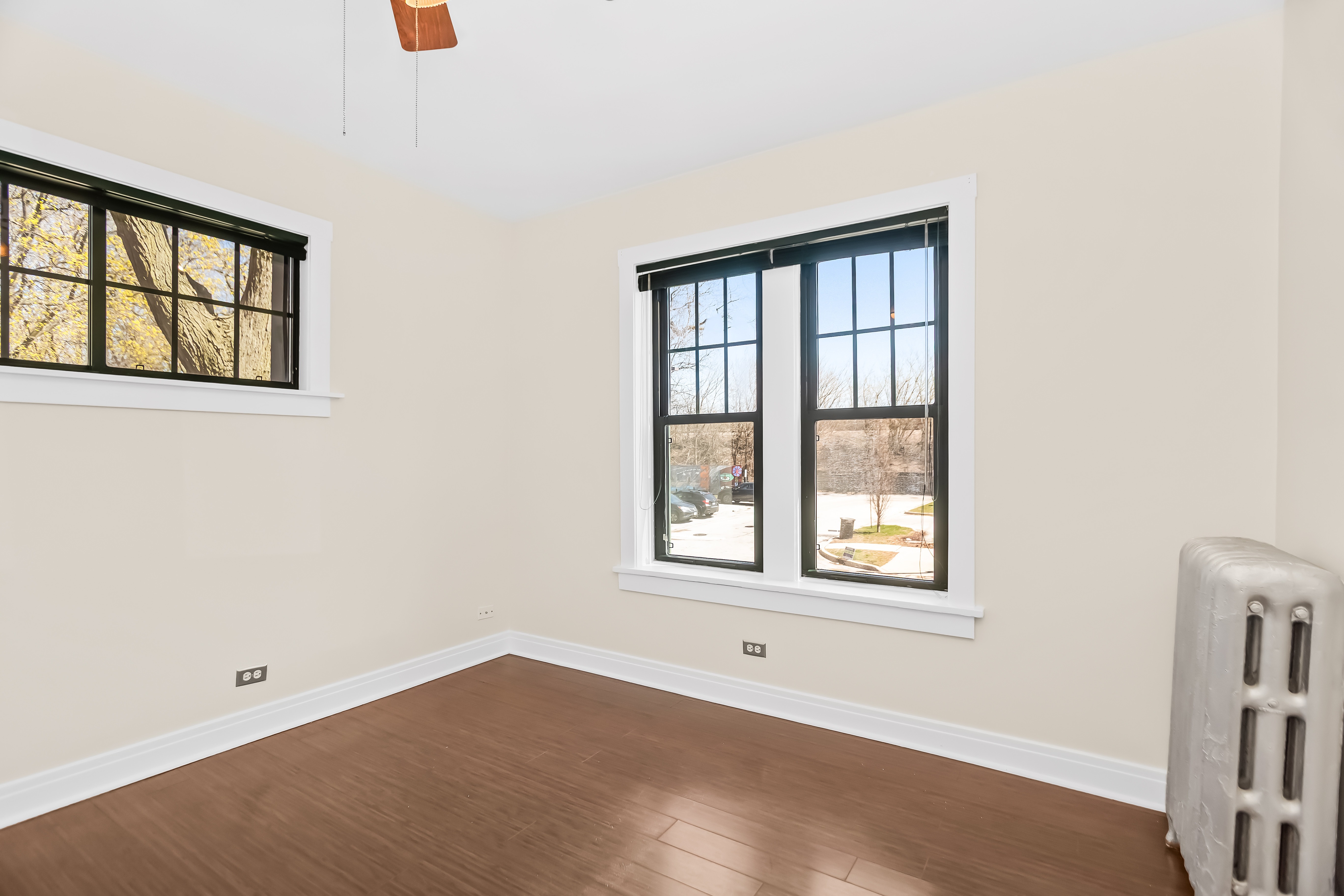 Fantastic new offering checking so many boxes! Fabulous 2 bedroom front unit in very well cared for vintage condo building. Three exposures flood this high first floor unit with sunshine. Features include exposed brick walls, in unit laundry, 3 ceiling fans, remodeled bathroom with unique marble detailing, updated kitchen with stainless appliances, granite counters, and solid wood cabinetry, and ample closets. A huge 10 x 22 deeded and heated garage comes with the unit plus an oversized 8 x 4 storage locker. Newer windows, plumbing, electrical, and flooring, freshly painted and in move in condition. Just a few blocks to Red Line CTA, groceries, and neighborhood restaurants, bakery, and more. Charming park and tot lot next door. Investor and pet friendly. So affordable, excellent value.