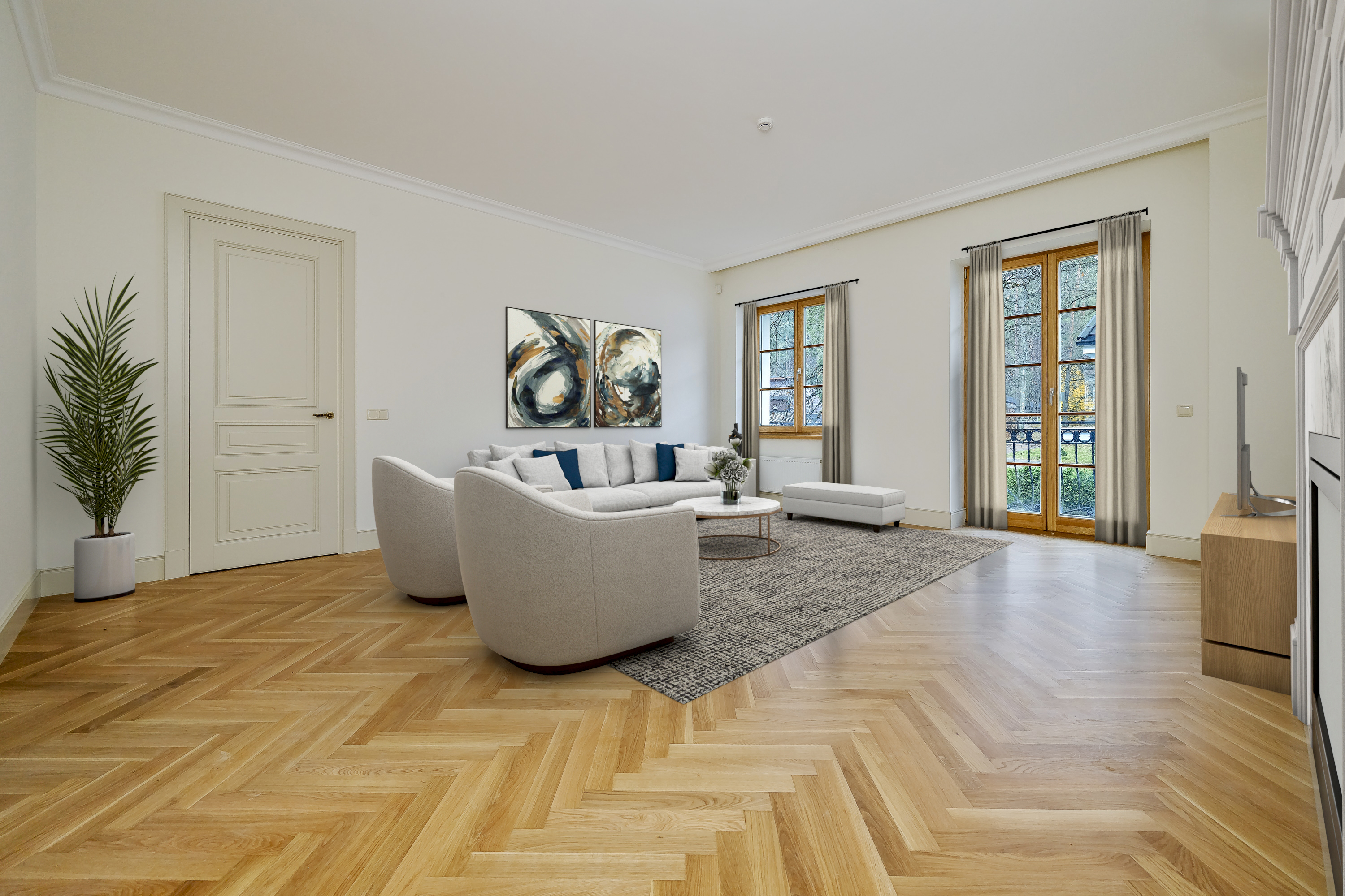 The apartment is sold unfurnished, with full finishing: natural wood flooring, fully equipped bathrooms, and thoughtfully implemented lighting and finishing solutions. The layout is practical and comfortable, while the windows provide a sense of privacy and coziness.