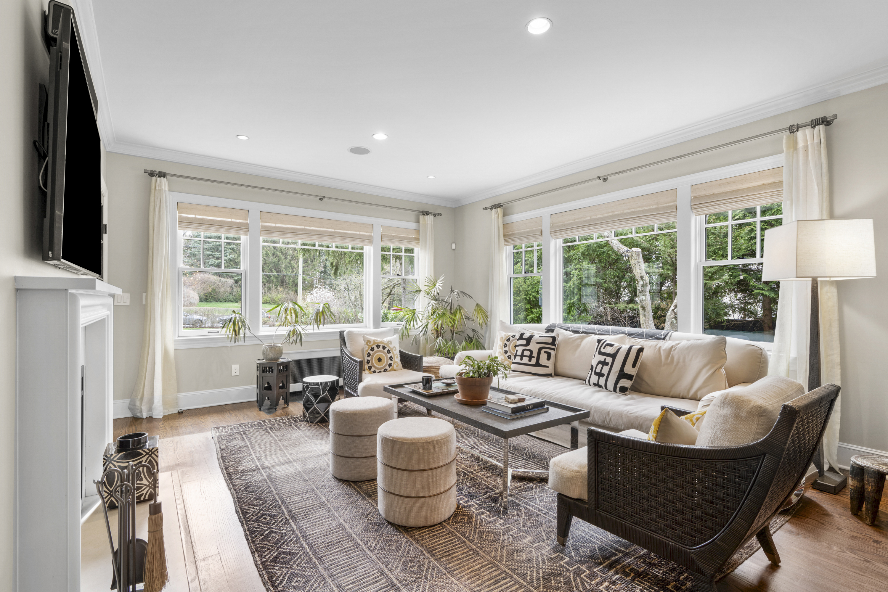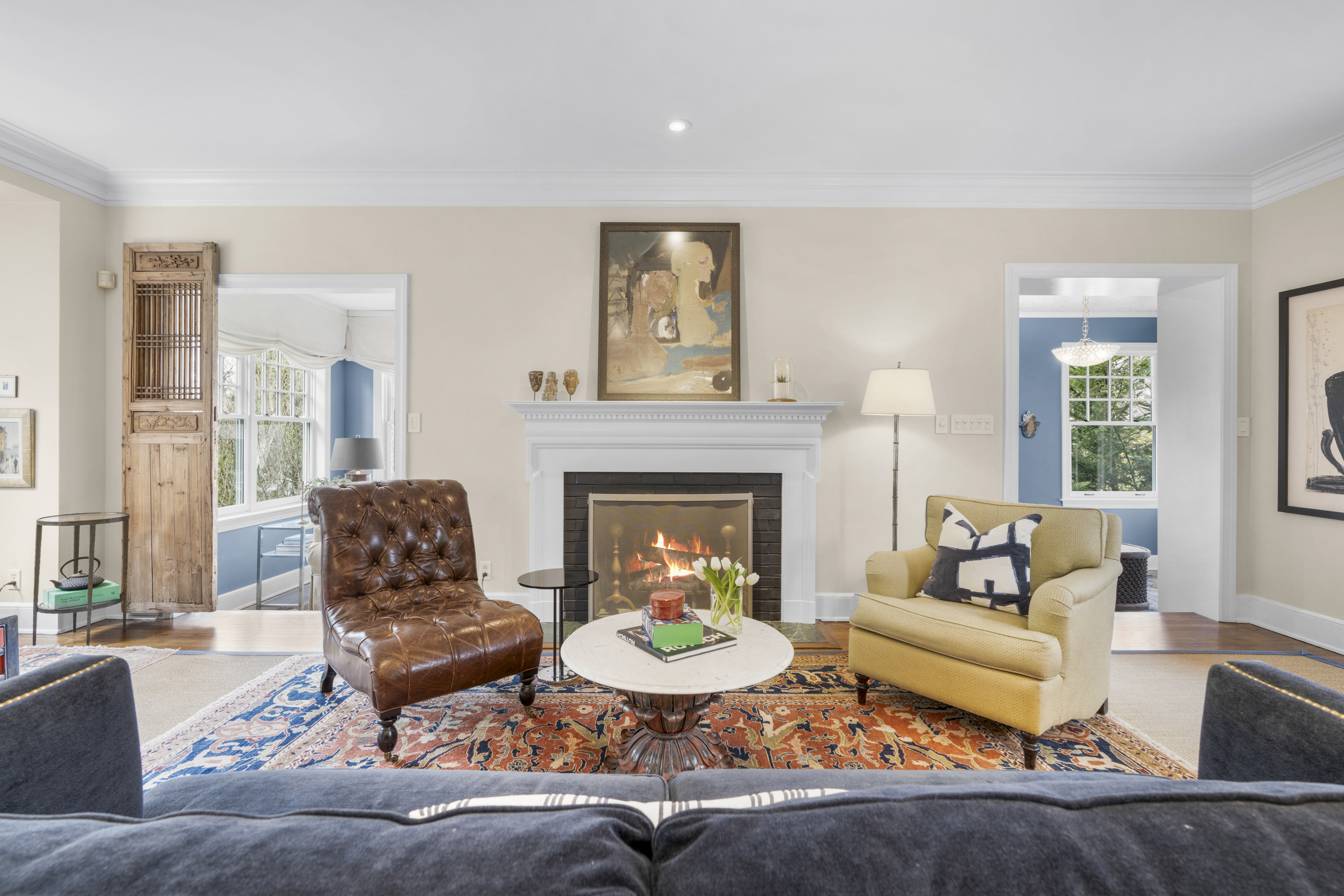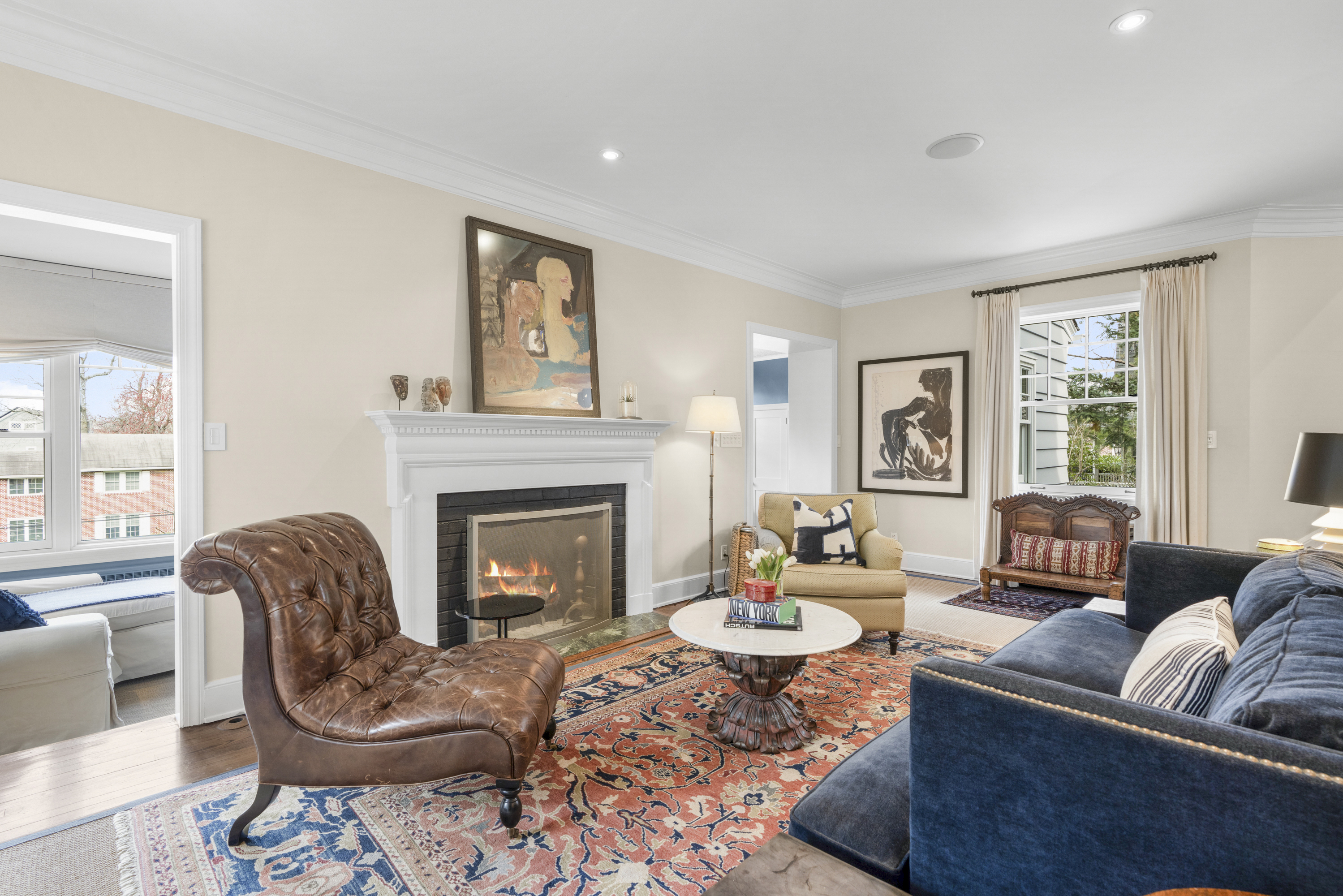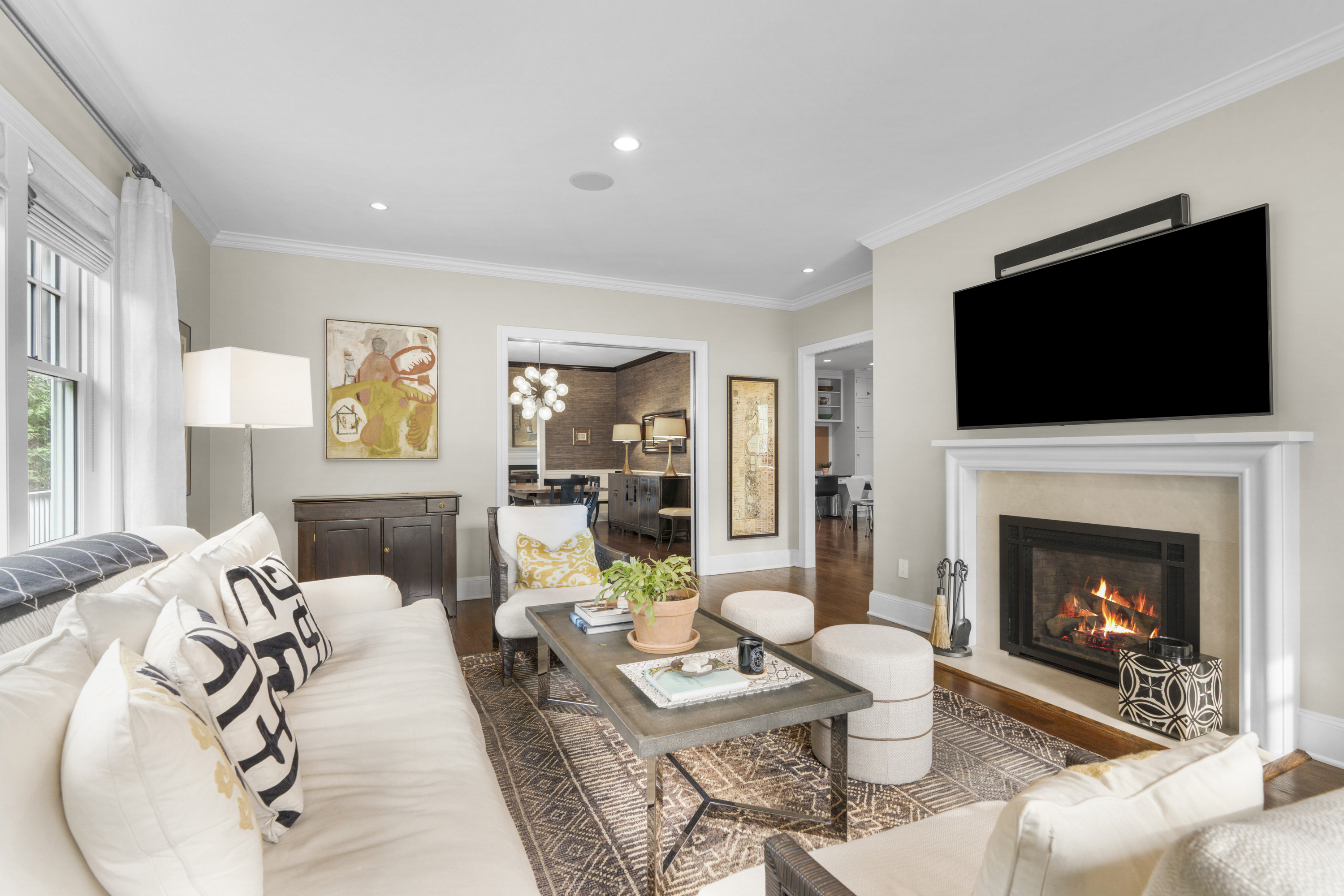room anchored by a classic wood-burning fireplace. This space flows naturally into a