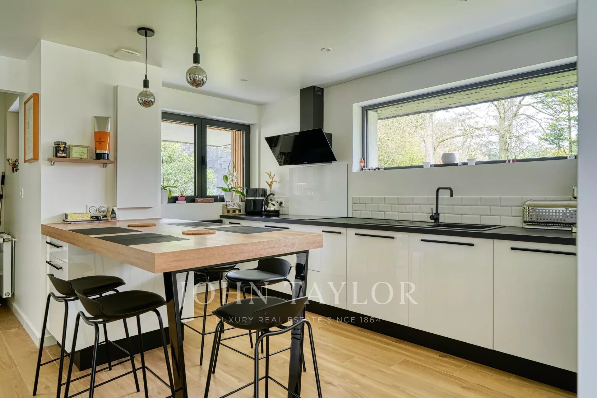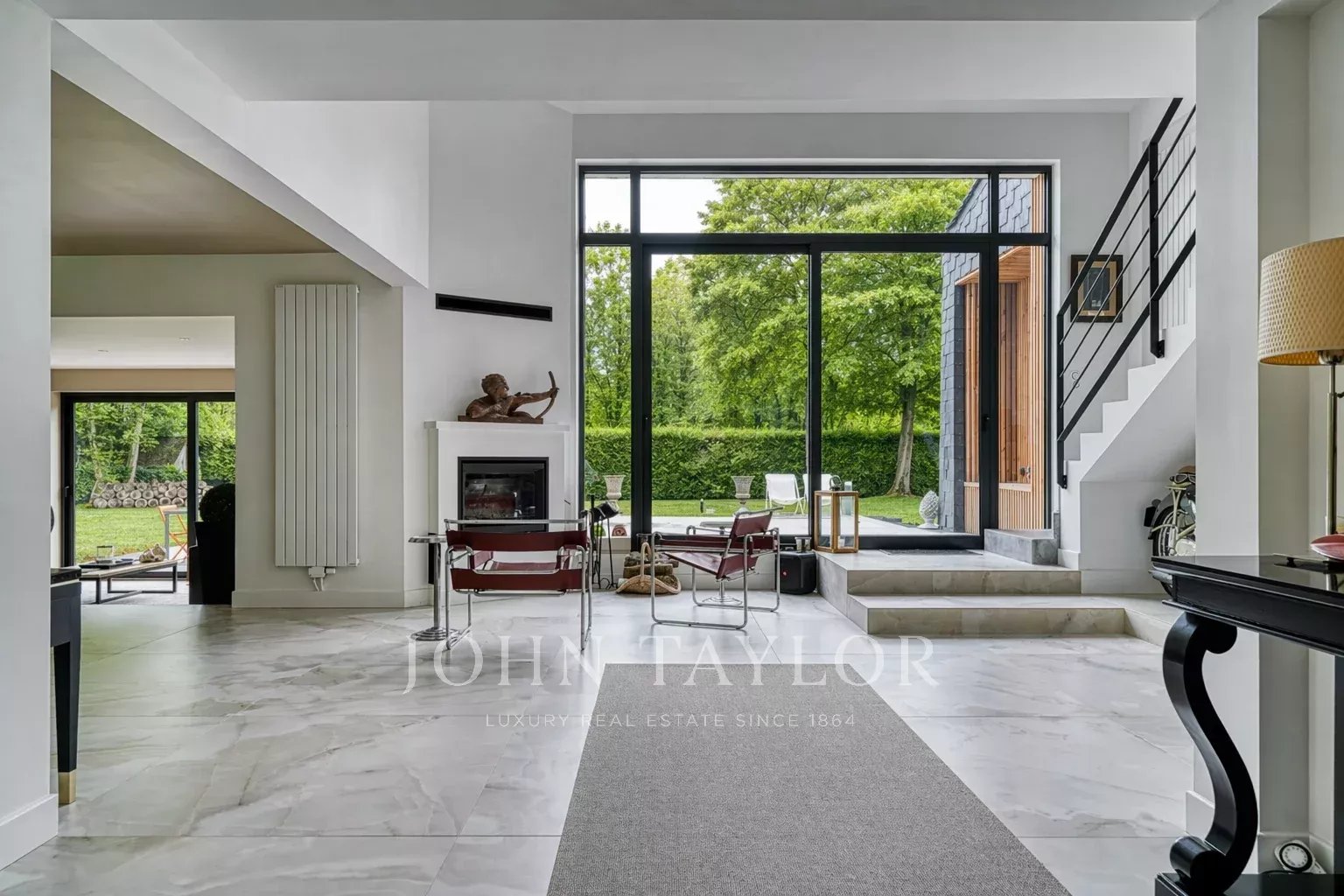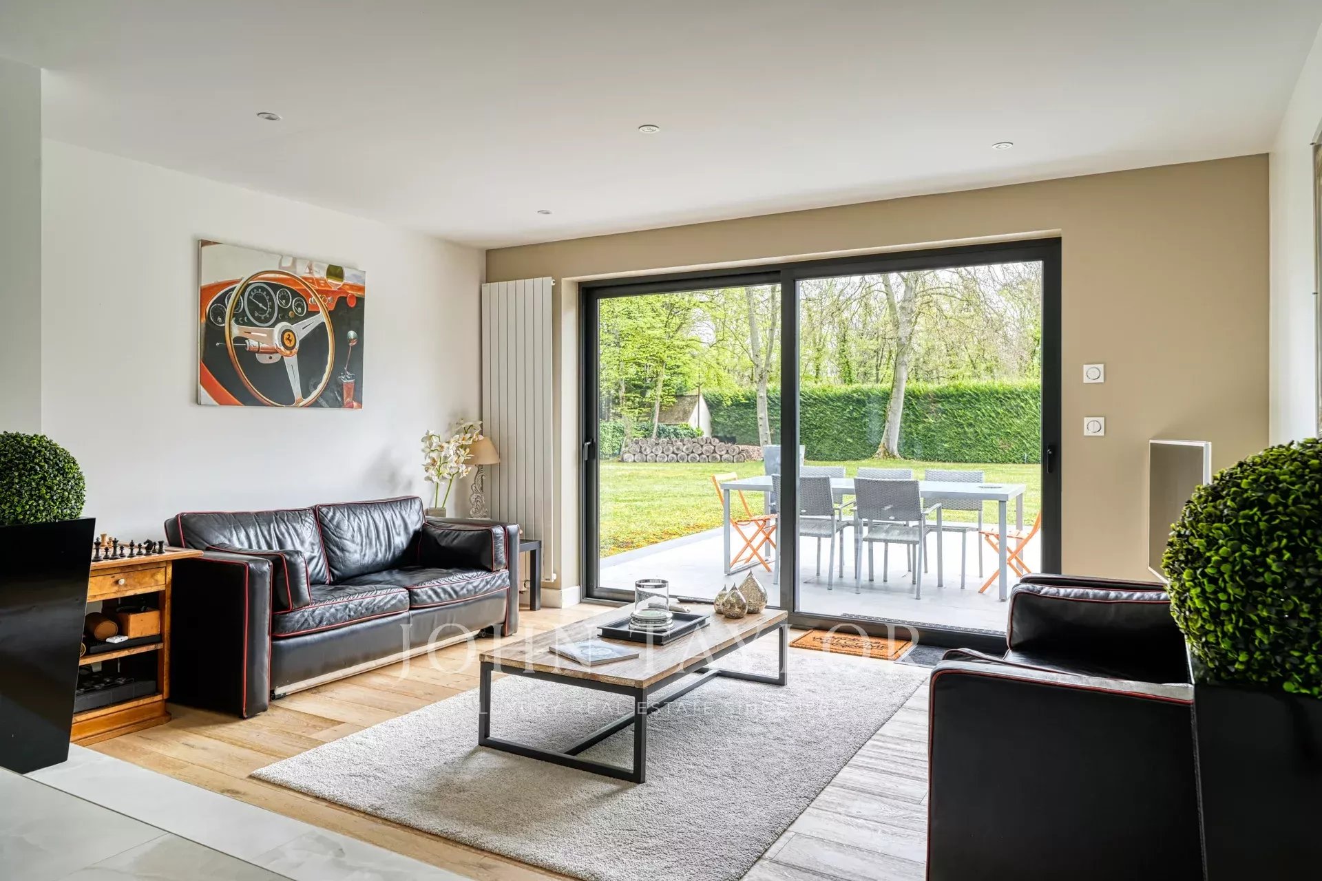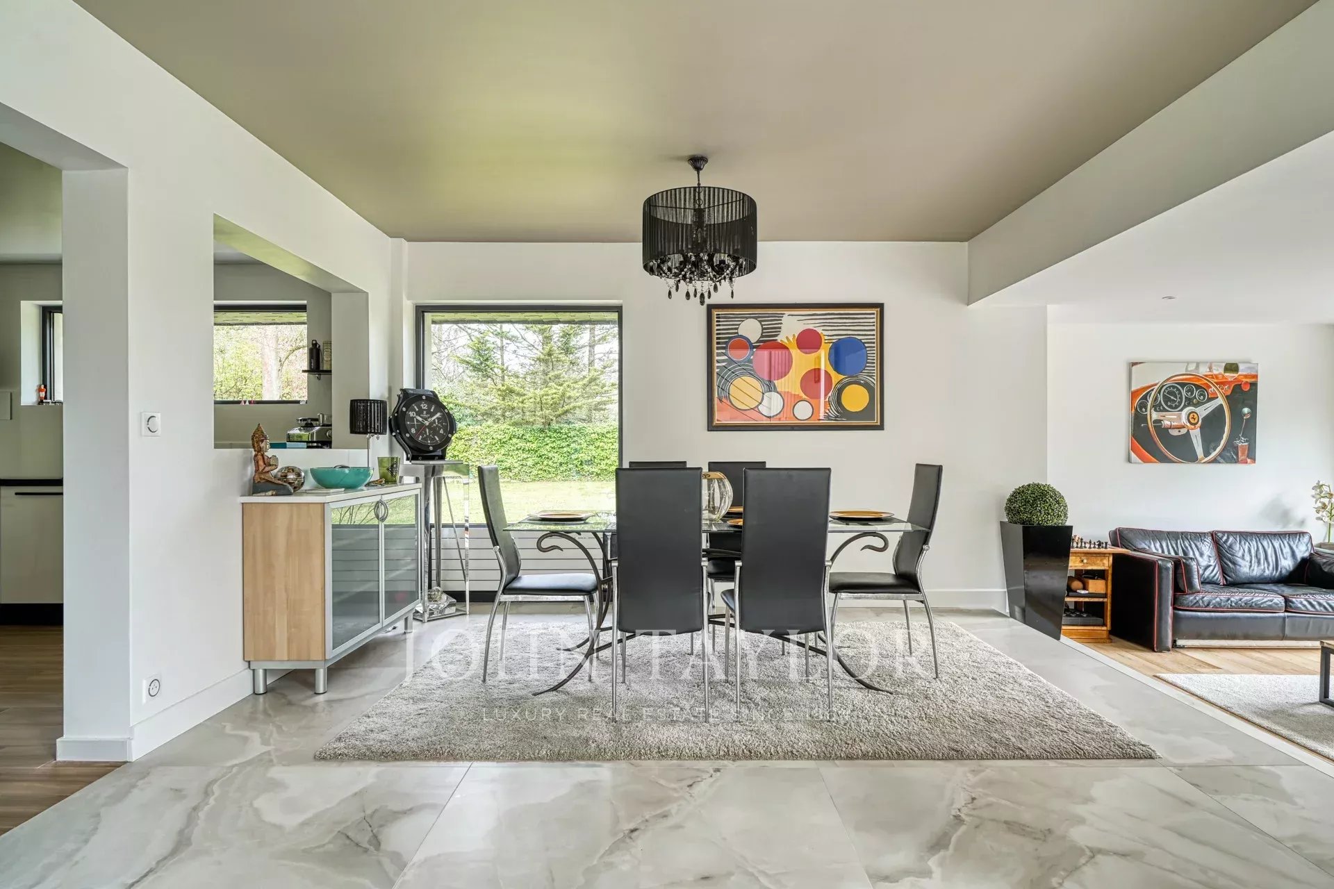 Located on the edge of Chantilly, in the sought-after town of Gouvieux, 45 minutes from Paris and 25 minutes from Charles de Gaulle Airport, this property enjoys a preserved natural setting surrounded by trees, while remaining within immediate proximity of shops, schools and everyday amenities.Set on a flat plot of approximately 7,000 sqm, it offers a lifestyle closely connected to nature.This architect-designed house of approximately 260 sqm has recently undergone a careful renovation. Its architecture highlights generous volumes and natural light through large floor-to-ceiling windows that create a seamless connection between indoor and outdoor spaces.Arranged over two levels, the house features an entrance hall, a first living room opening onto a terrace, a spacious southeast-facing lounge extended by a second terrace, a dining area, and a fully fitted and equipped kitchen. A first bedroom with its own shower room completes the ground floor.Upstairs, two bedrooms each benefit from their own private shower room, one of which also features a balcony. The master suite offers a dressing room, a shower room and a private balcony.The property also includes an outbuilding arranged as an independent studio apartment as well as a large garage accommodating several vehicles.A contemporary home designed to fully enjoy natural light and the surrounding landscape.