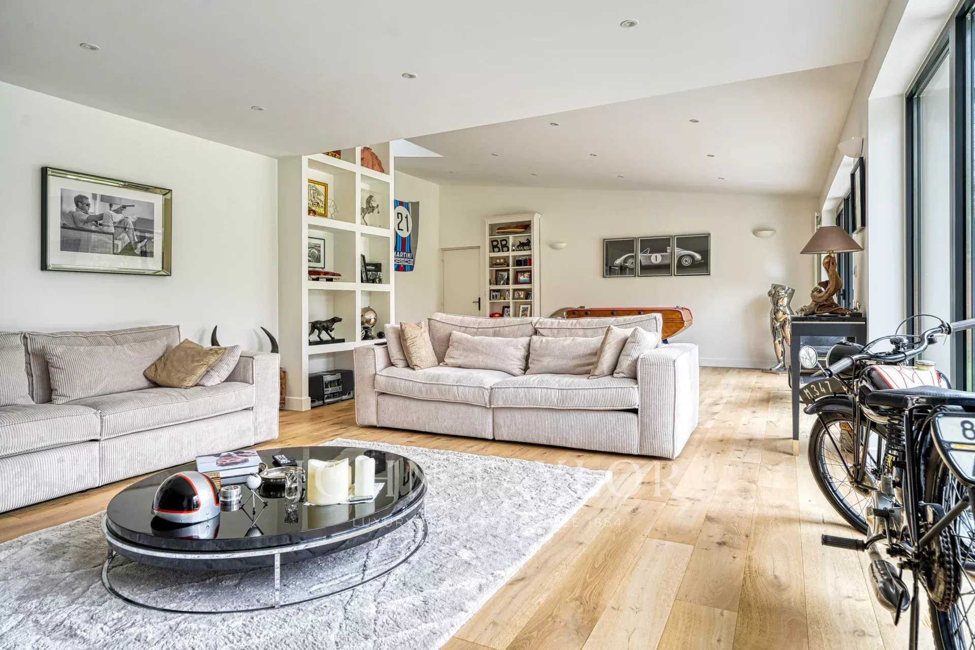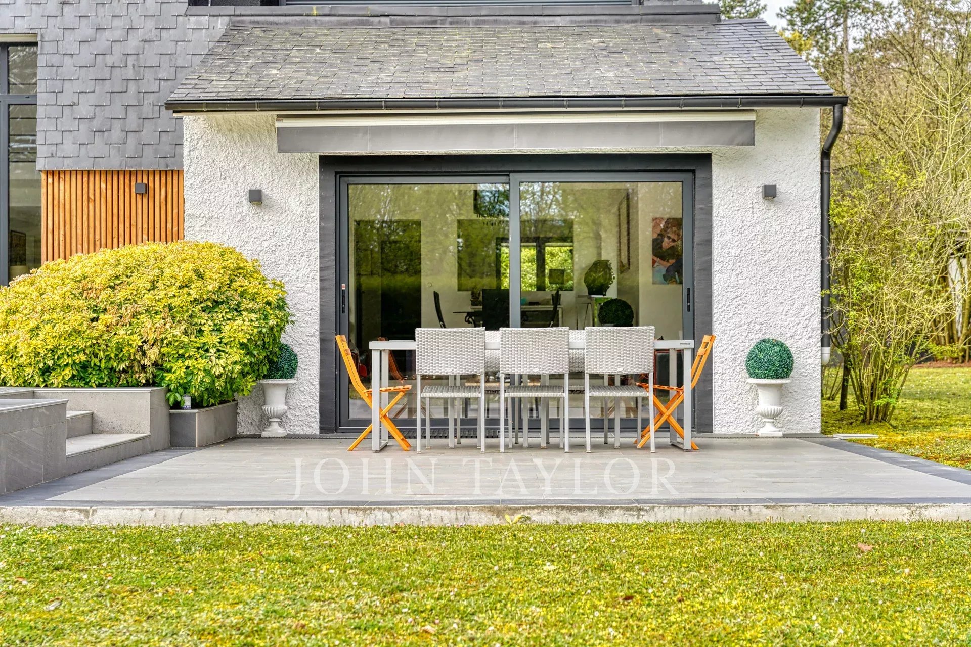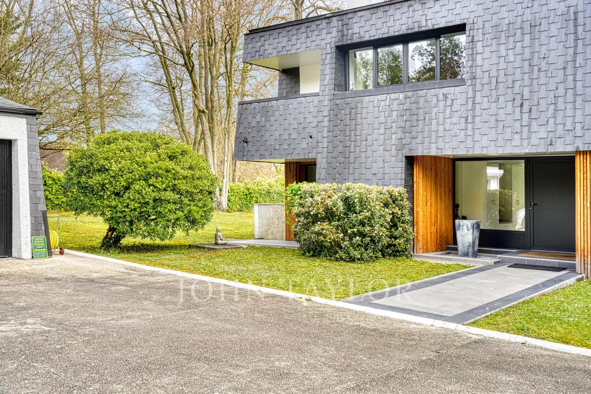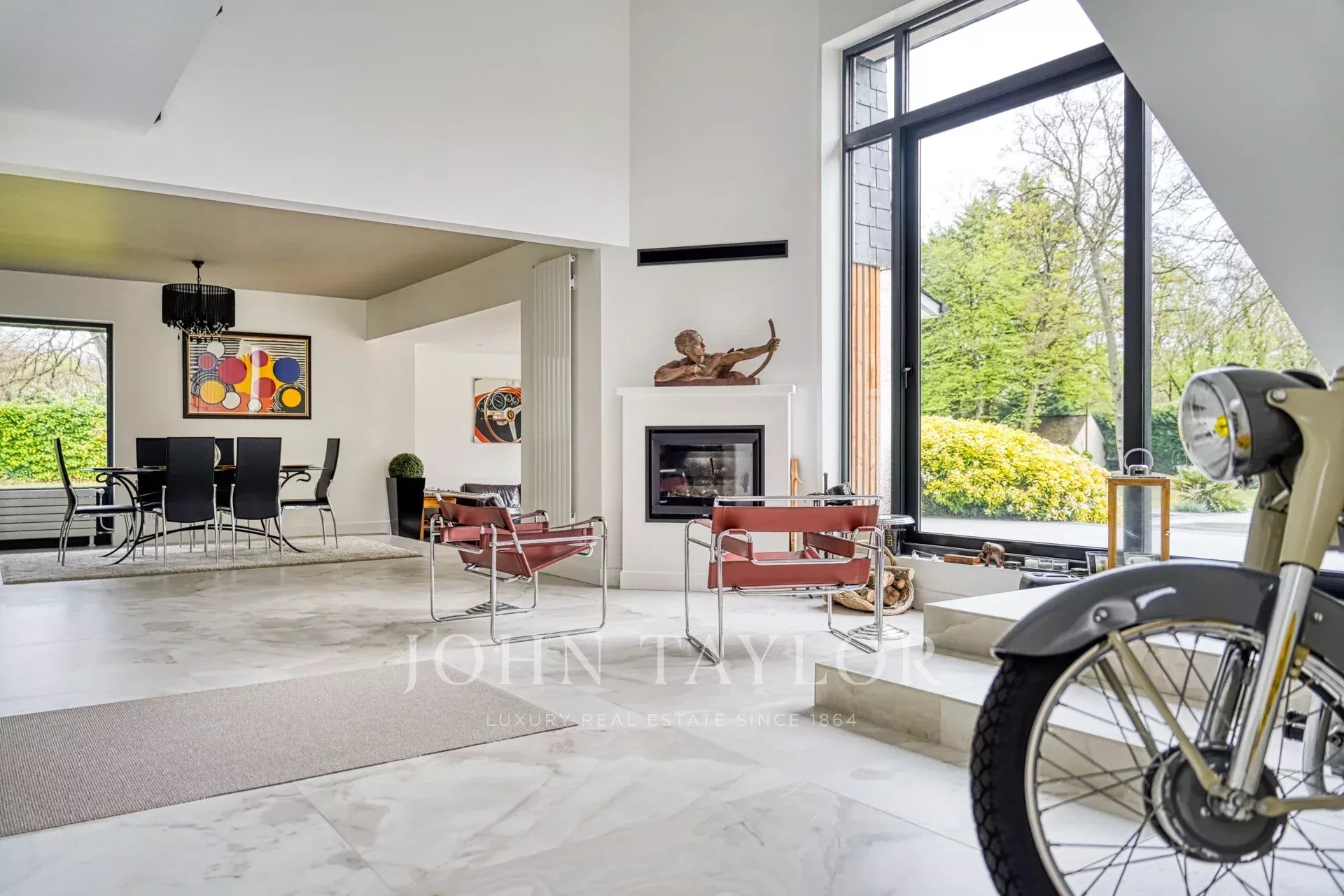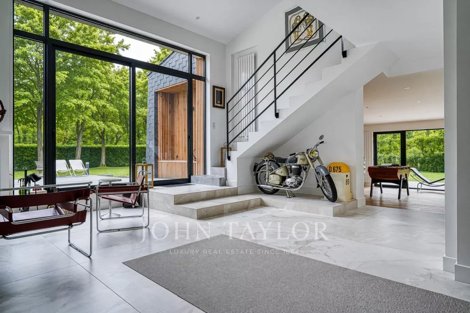 Located on the edge of Chantilly, in the sought-after town of Gouvieux, 45 minutes from Paris and 25 minutes from Charles de Gaulle Airport, this property enjoys a preserved natural setting surrounded by trees, while remaining within immediate proximity of shops, schools and everyday amenities.Set on a flat plot of approximately 7,000 sqm, it offers a lifestyle closely connected to nature.This architect-designed house of approximately 260 sqm has recently undergone a careful renovation. Its architecture highlights generous volumes and natural light through large floor-to-ceiling windows that create a seamless connection between indoor and outdoor spaces.Arranged over two levels, the house features an entrance hall, a first living room opening onto a terrace, a spacious southeast-facing lounge extended by a second terrace, a dining area, and a fully fitted and equipped kitchen. A first bedroom with its own shower room completes the ground floor.Upstairs, two bedrooms each benefit from their own private shower room, one of which also features a balcony. The master suite offers a dressing room, a shower room and a private balcony.The property also includes an outbuilding arranged as an independent studio apartment as well as a large garage accommodating several vehicles.A contemporary home designed to fully enjoy natural light and the surrounding landscape.