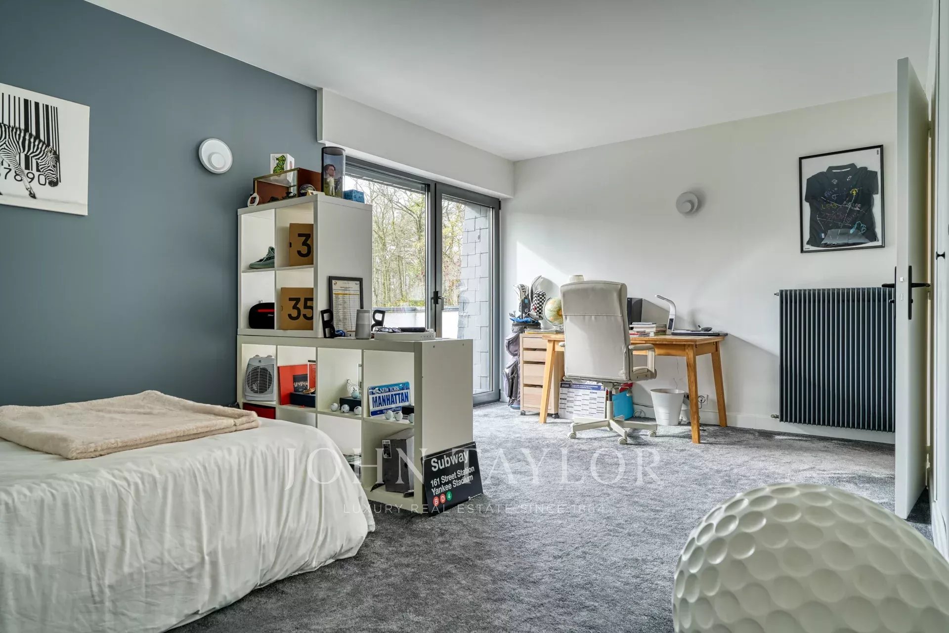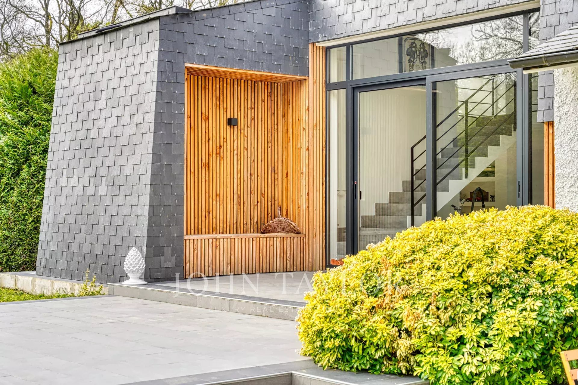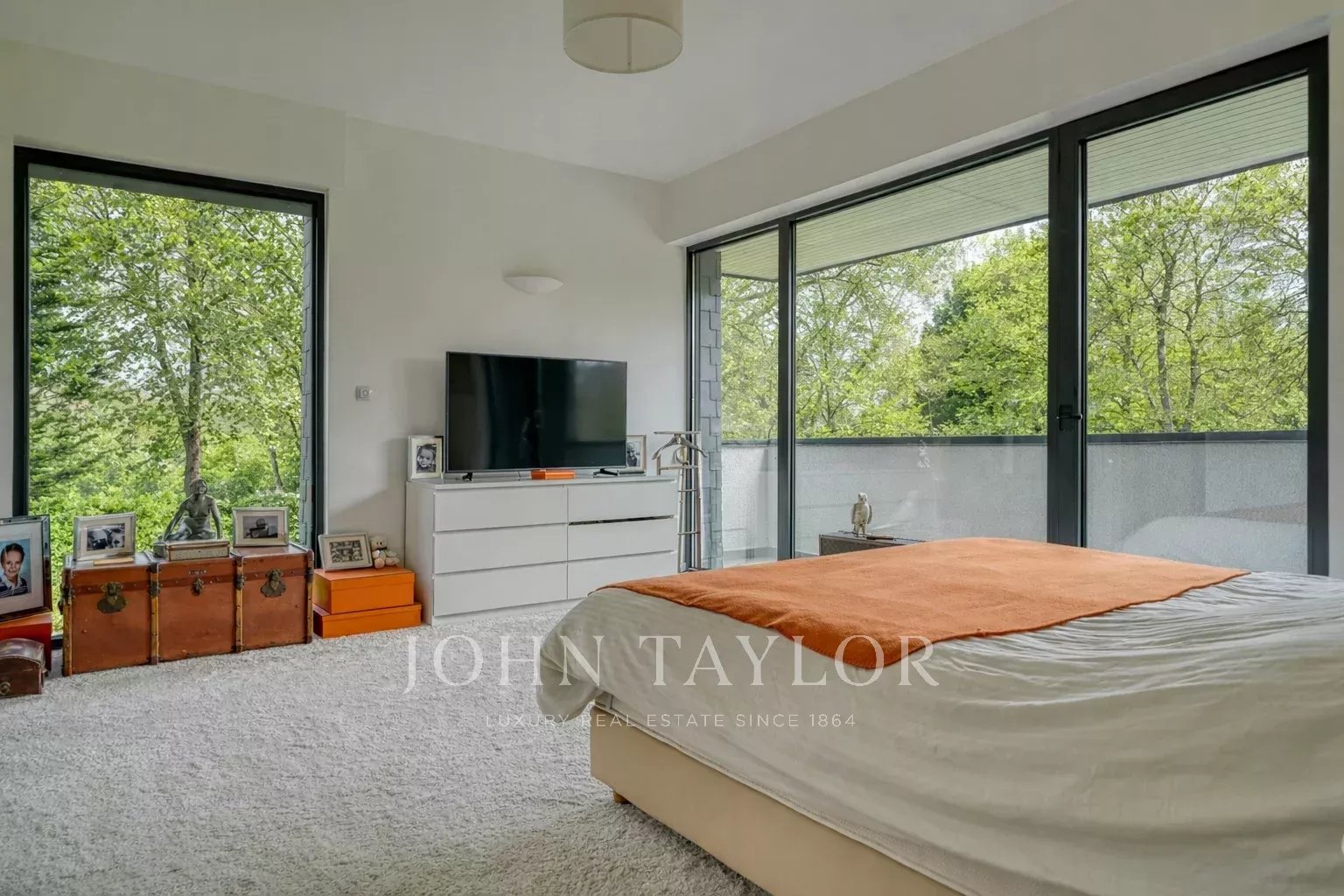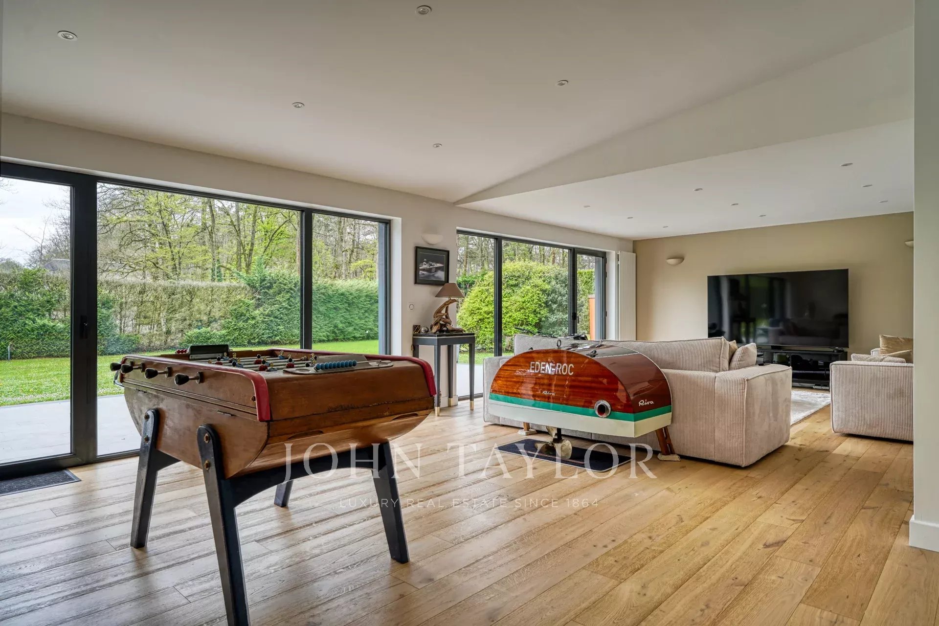 Located on the edge of Chantilly, in the sought-after town of Gouvieux, 45 minutes from Paris and 25 minutes from Charles de Gaulle Airport, this property enjoys a preserved natural setting surrounded by trees, while remaining within immediate proximity of shops, schools and everyday amenities.Set on a flat plot of approximately 7,000 sqm, it offers a lifestyle closely connected to nature.This architect-designed house of approximately 260 sqm has recently undergone a careful renovation. Its architecture highlights generous volumes and natural light through large floor-to-ceiling windows that create a seamless connection between indoor and outdoor spaces.Arranged over two levels, the house features an entrance hall, a first living room opening onto a terrace, a spacious southeast-facing lounge extended by a second terrace, a dining area, and a fully fitted and equipped kitchen. A first bedroom with its own shower room completes the ground floor.Upstairs, two bedrooms each benefit from their own private shower room, one of which also features a balcony. The master suite offers a dressing room, a shower room and a private balcony.The property also includes an outbuilding arranged as an independent studio apartment as well as a large garage accommodating several vehicles.A contemporary home designed to fully enjoy natural light and the surrounding landscape.