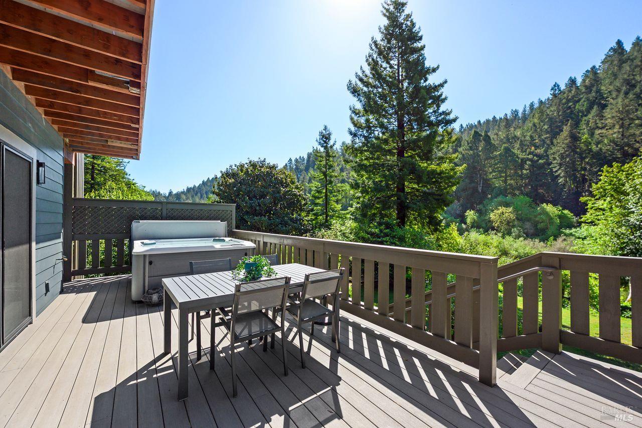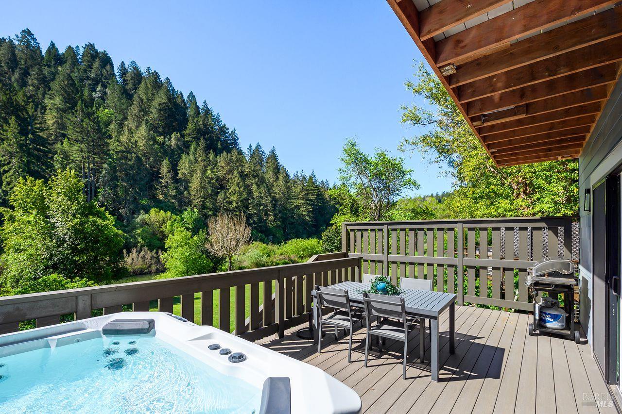 Modern Riverfront Sanctuary. Experience the pinnacle of riverfront living in this stunning, fully electric architectural masterpiece completed in 2023. Perched above the 100-year flood level, this two-bedroom, 2.5-bathroom home blends cutting-edge resilience with sophisticated design. The entire home is light filled. Large sliders and Walls of windows invite the beauty of the Russian River indoors. Enjoy hardwood floors throughout, custom tile work, mesmerizing water vapor fireplace and a sleek wet bar with a wine fridge. A perfect set up for entertaining. The primary suite features a private deck with River views and a walk-in closet. Ascend to the third-story loft, complete with a Juliet balcony offering unmatched views of the water. The living area opens to the ultimate outdoor oasis with large expansive attached deck. Enjoy the steaming hot tub while taking in the serene river atmosphere. Additional features include an EV charging station in the garage, steel frame and a grid concrete pier foundation, a Ring alarm system, exterior cameras, and an interior fire sprinkler system. Offered turnkey and fully furnished