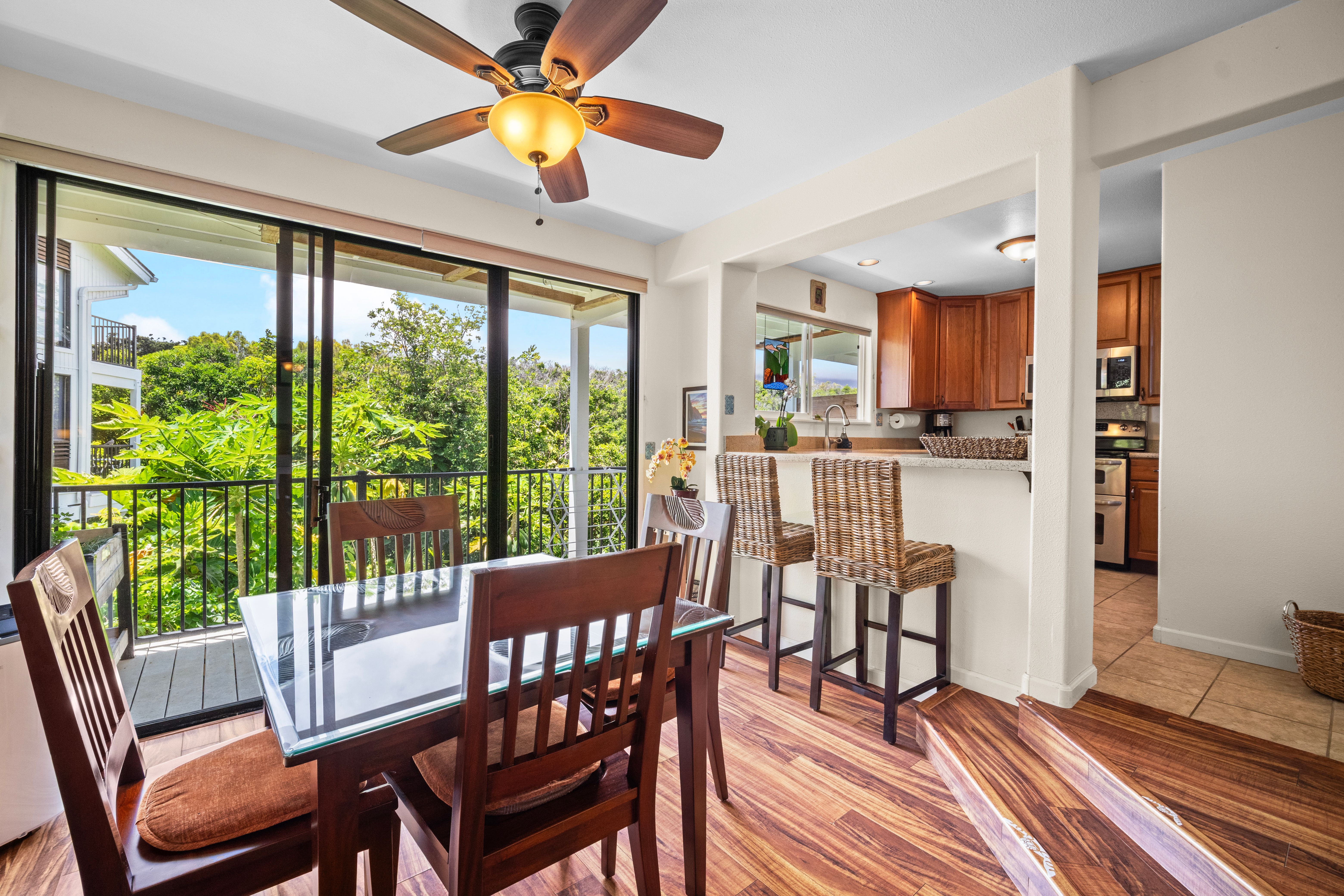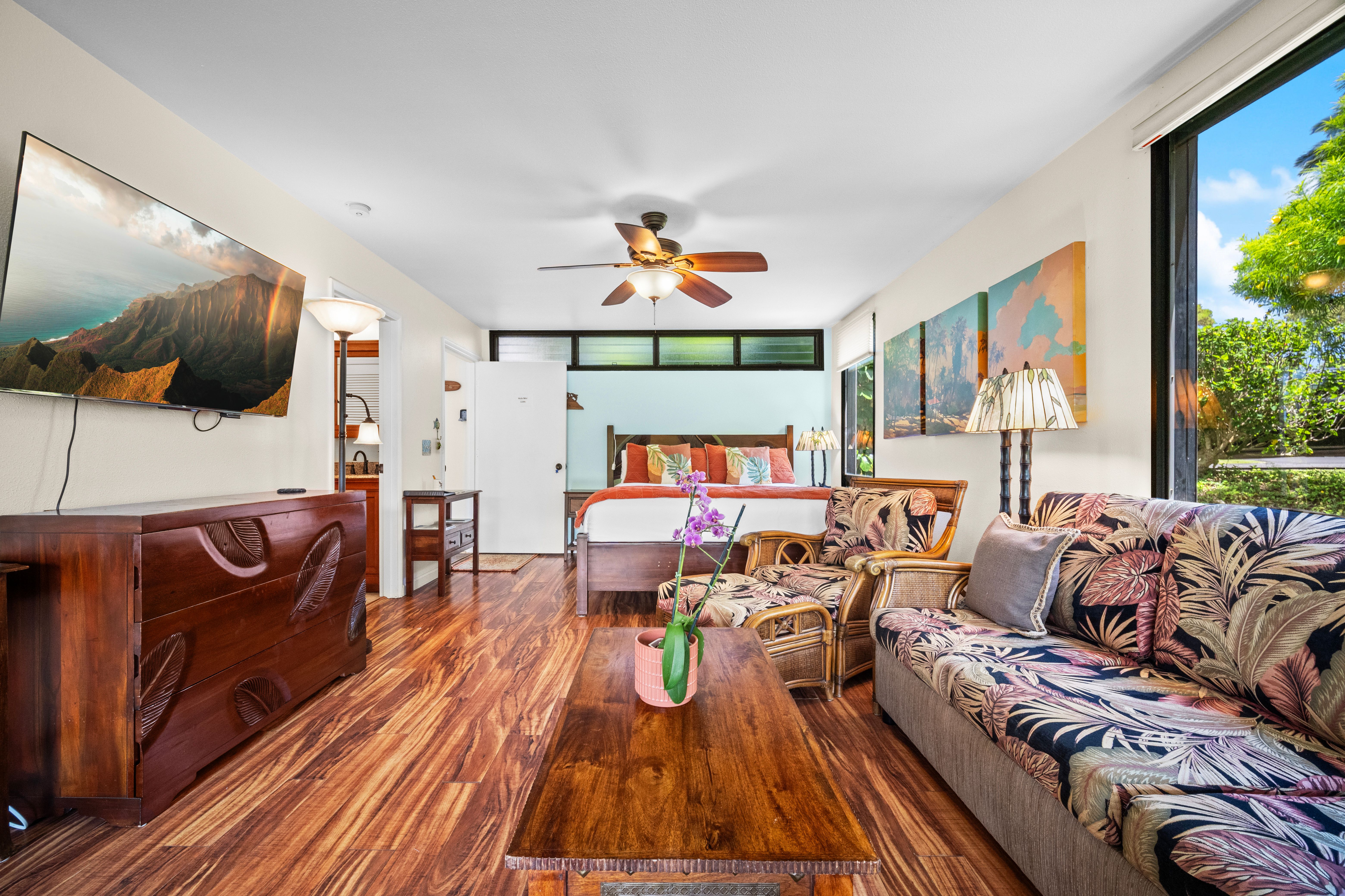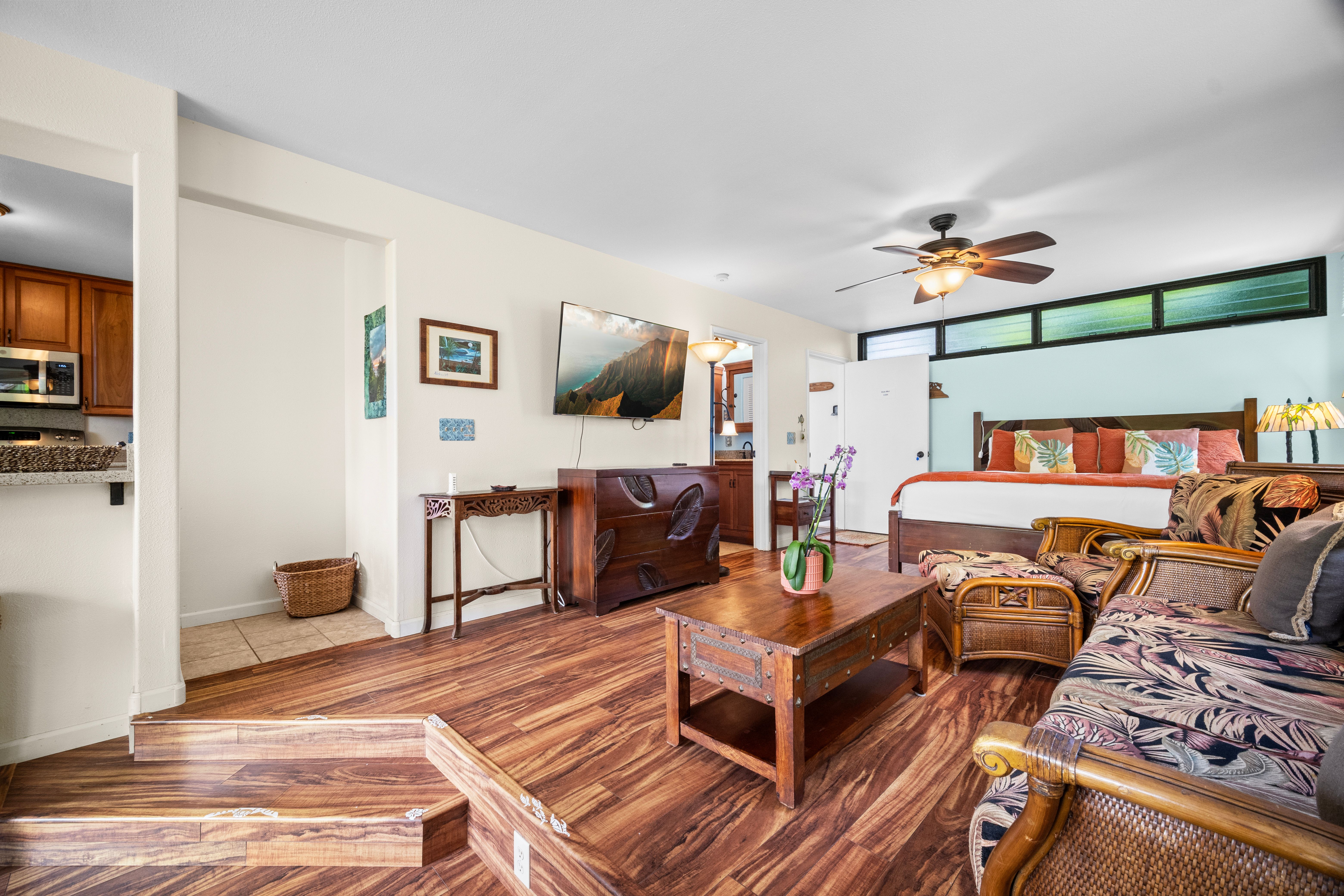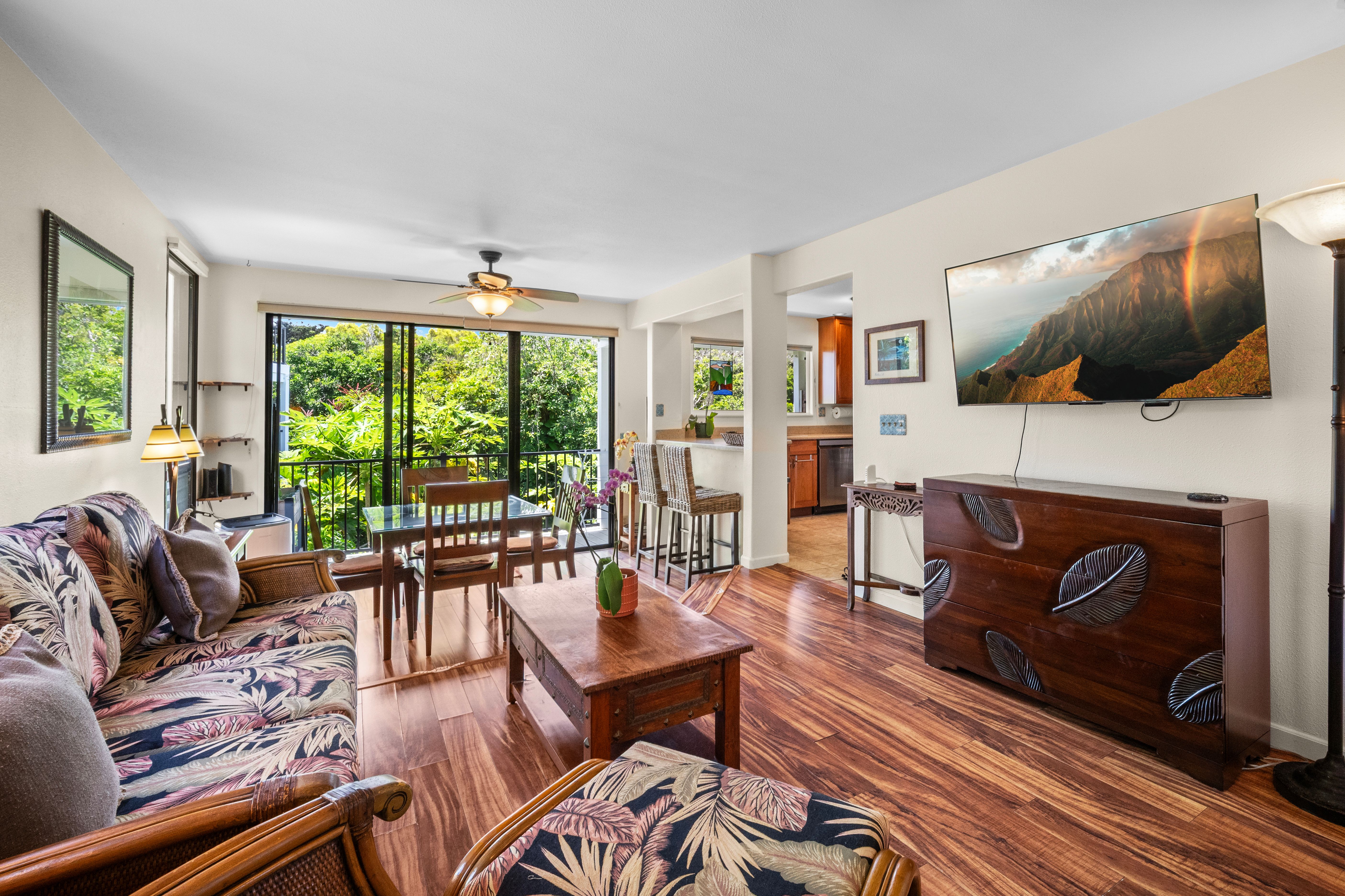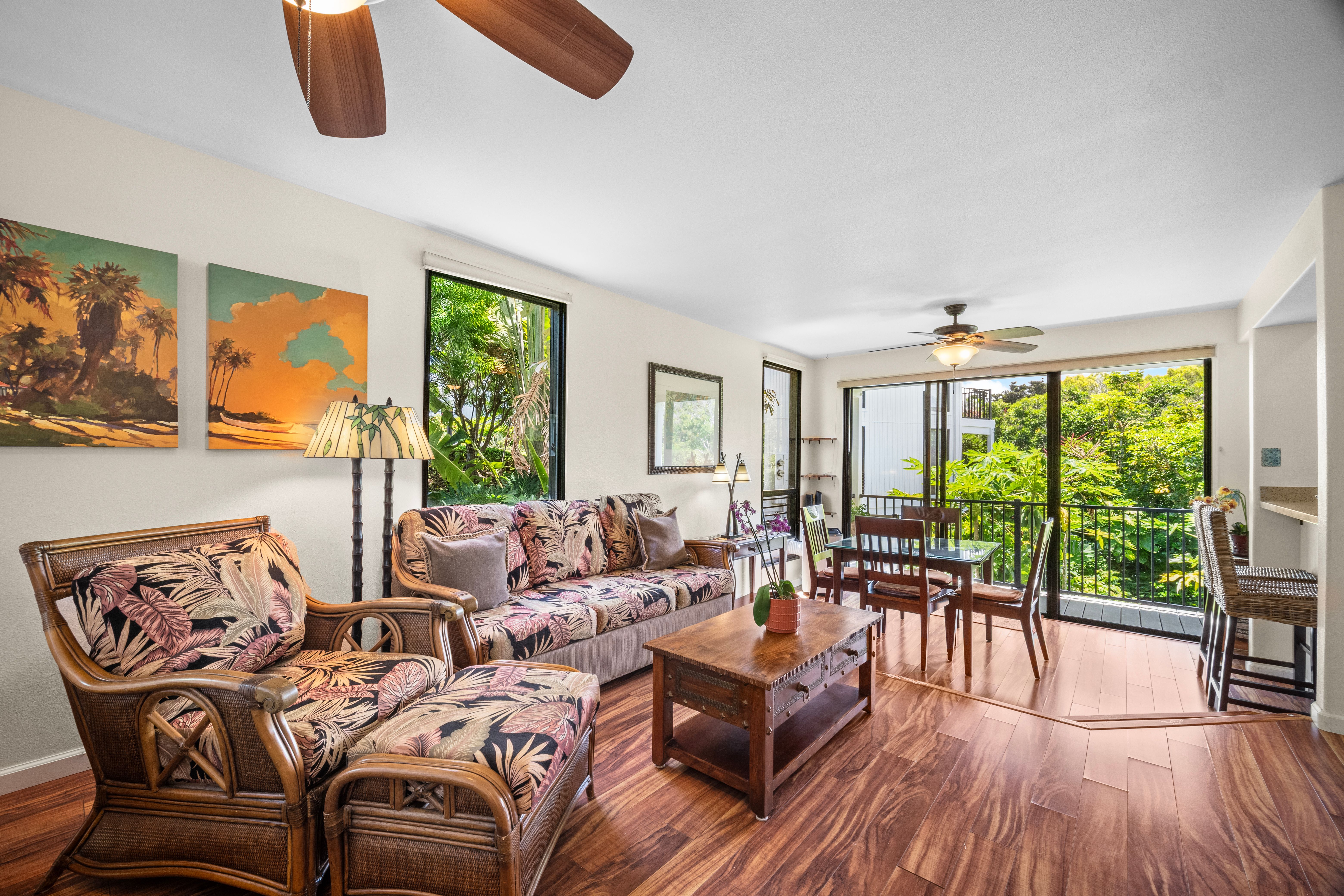 This versatile 1-bedroom, 2-bath condo offers exceptional flexibility, featuring separate entrances for each side—ideal for personal use and hosting guests. Currently operating as a highly active vacation rental managed by the owners.Tucked into a lush, peaceful corner, Hale Moi #119 offers a unique sense of privacy and tranquility, surrounded by tropical greenery and songbirds. The setting feels like a true sanctuary: open, airy, and connected to nature, featuring, vibrant treetops and mountain vistas. Location is truly exceptional. The residence has been thoughtfully remodeled with a clean, modern aesthetic and upscale furnishings, creating a refined yet comfortable living environment. Each side of the unit is intelligently designed for efficiency and independence, well-organized and dual in-unit laundry, ideal for flexible living. Positioned directly across from one of Princeville’s most iconic ocean bluff viewpoints, the location enjoys immediate access to sweeping vistas of “Bali Hai”, reef-lined coastline, and Princeville’s most celebrated sunset viewing spot. You can simply stroll across the street to experience what draws a crowd each evening, with no parking required, enjoying the privilege of having it just steps from your front door.Beach access points, premier snorkeling, and multiple surf breaks are all within walking distance, along with the amenities of the 1 Hotel Hanalei Bay, offering dining, spa services, and optional fitness memberships