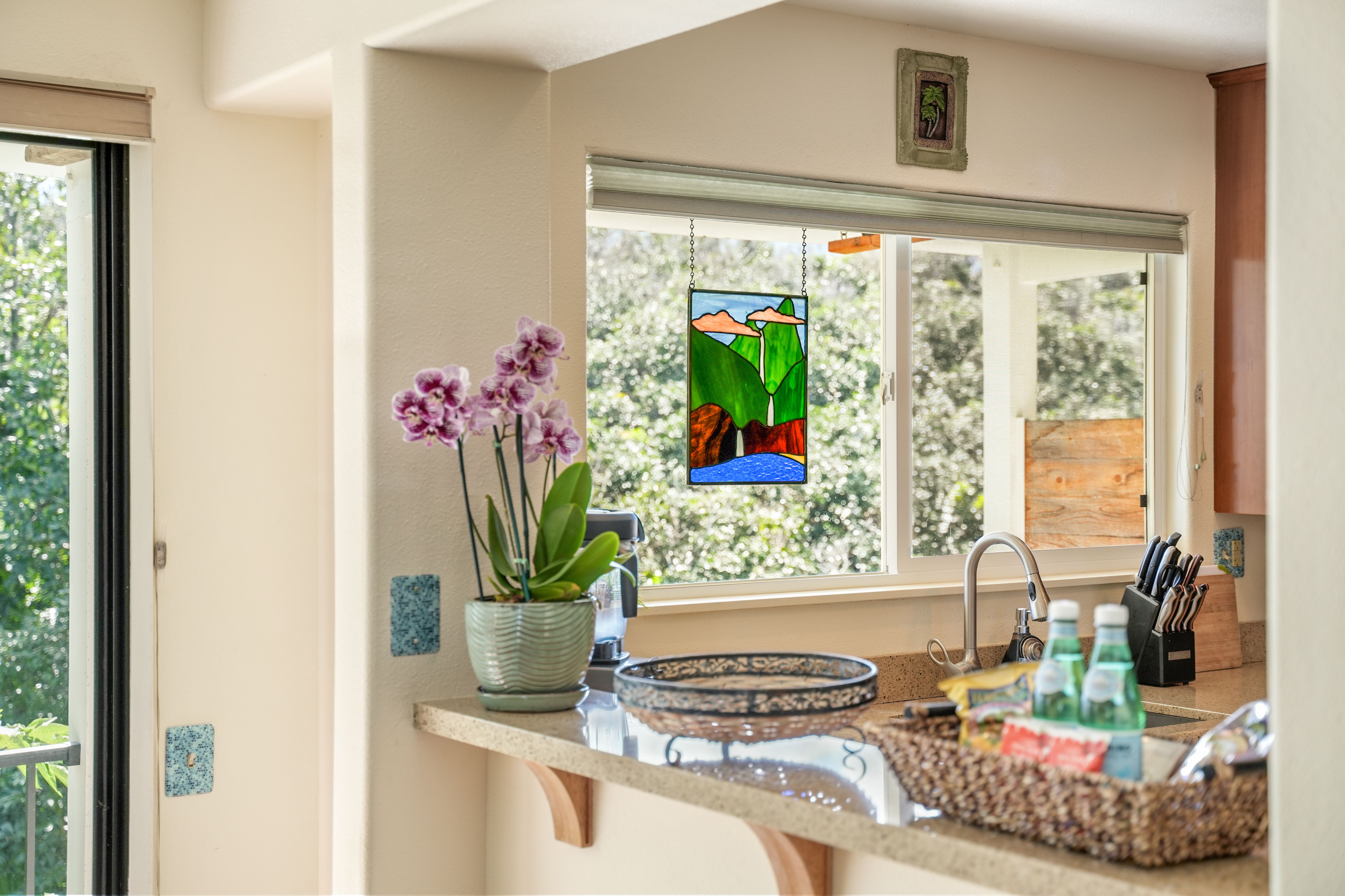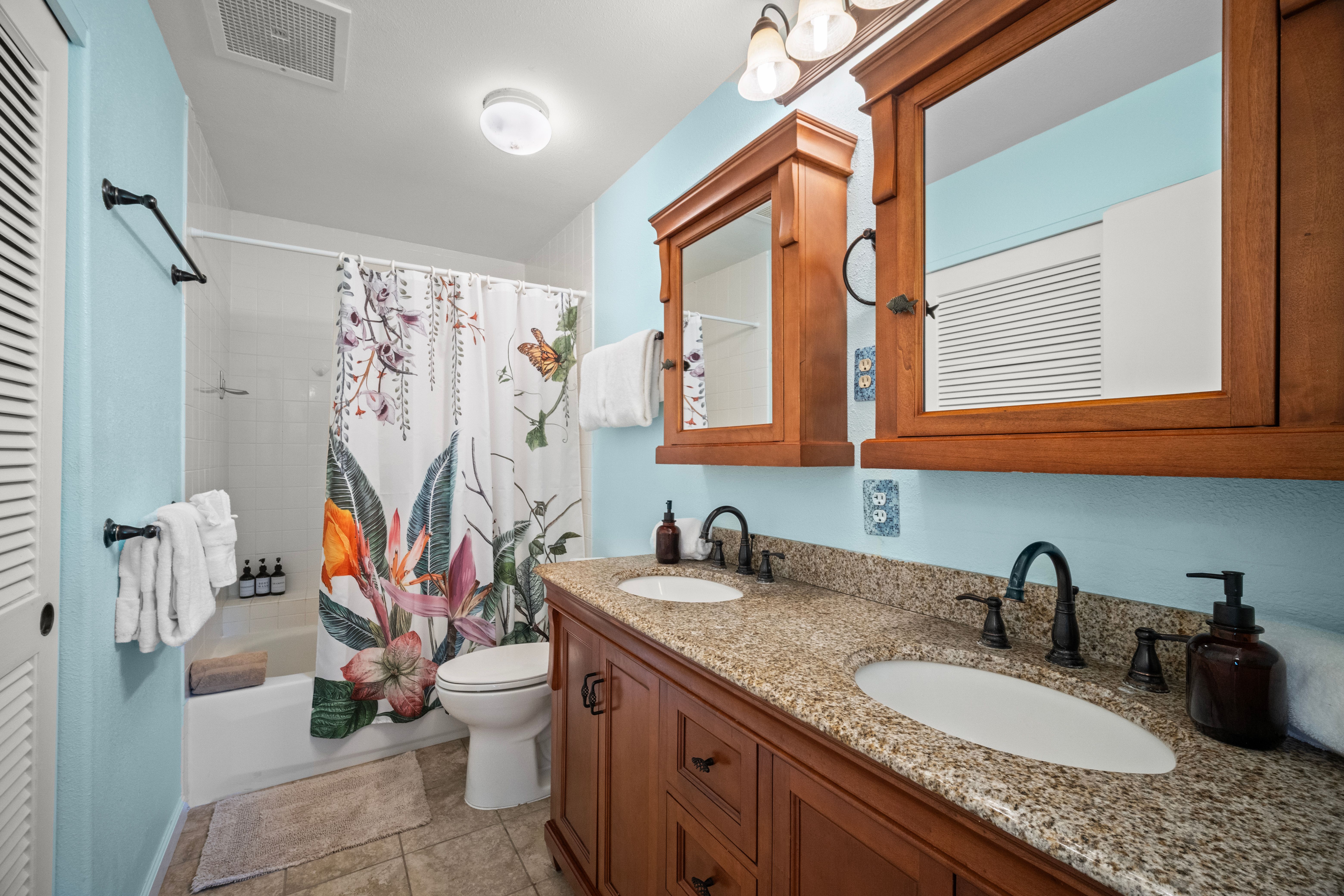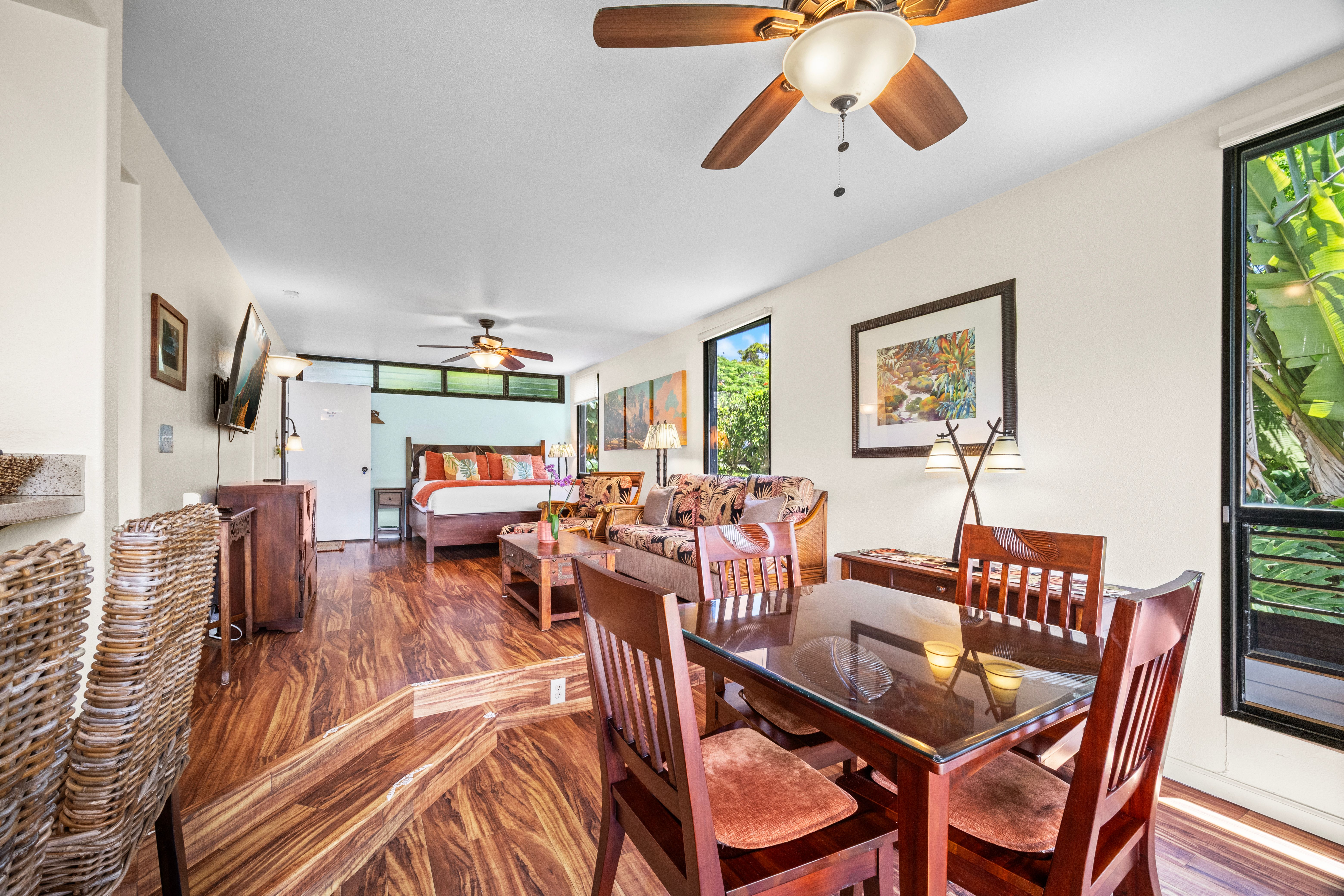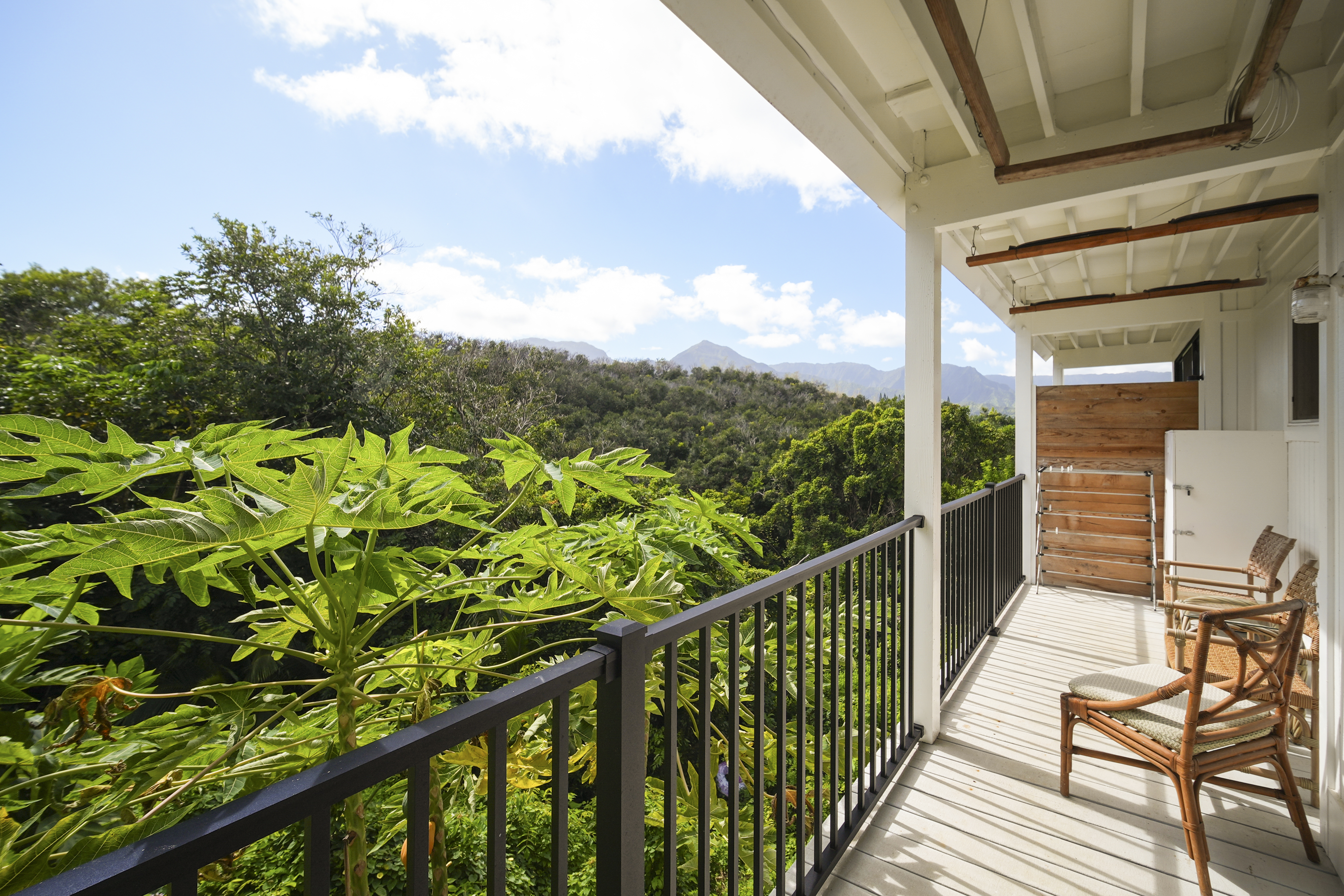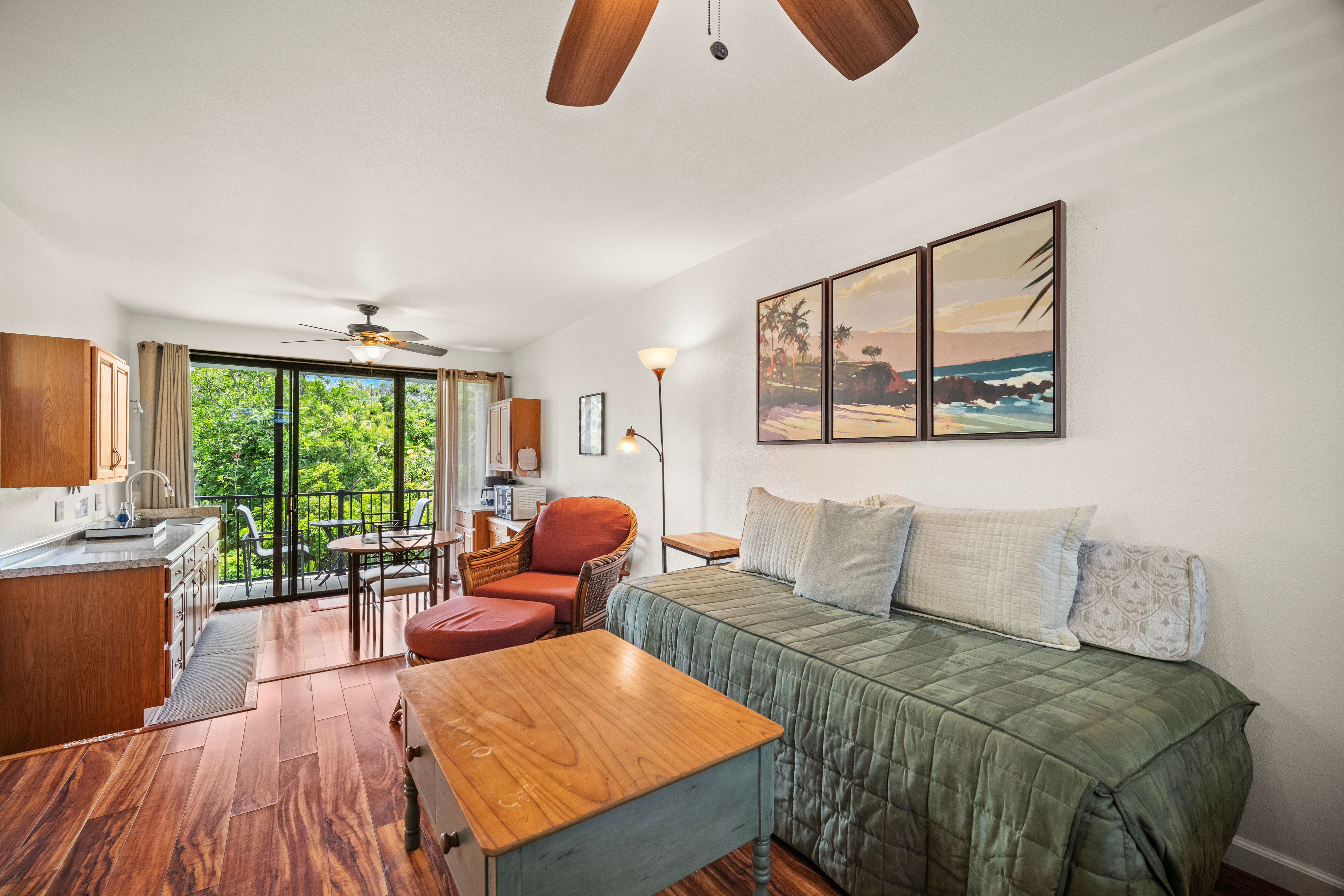 This versatile 1-bedroom, 2-bath condo offers exceptional flexibility, featuring separate entrances for each side—ideal for personal use and hosting guests. Currently operating as a highly active vacation rental managed by the owners.Tucked into a lush, peaceful corner, Hale Moi #119 offers a unique sense of privacy and tranquility, surrounded by tropical greenery and songbirds. The setting feels like a true sanctuary: open, airy, and connected to nature, featuring, vibrant treetops and mountain vistas. Location is truly exceptional. The residence has been thoughtfully remodeled with a clean, modern aesthetic and upscale furnishings, creating a refined yet comfortable living environment. Each side of the unit is intelligently designed for efficiency and independence, well-organized and dual in-unit laundry, ideal for flexible living. Positioned directly across from one of Princeville’s most iconic ocean bluff viewpoints, the location enjoys immediate access to sweeping vistas of “Bali Hai”, reef-lined coastline, and Princeville’s most celebrated sunset viewing spot. You can simply stroll across the street to experience what draws a crowd each evening, with no parking required, enjoying the privilege of having it just steps from your front door.Beach access points, premier snorkeling, and multiple surf breaks are all within walking distance, along with the amenities of the 1 Hotel Hanalei Bay, offering dining, spa services, and optional fitness memberships