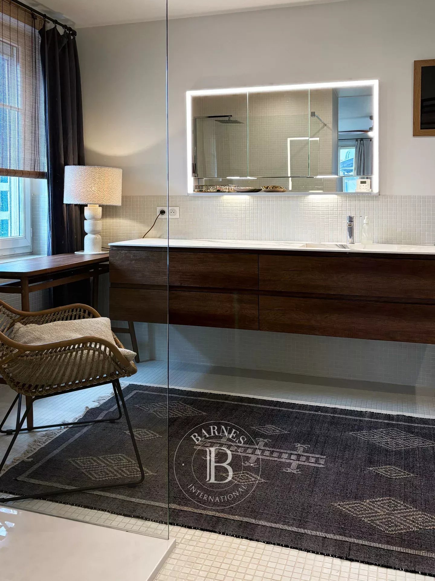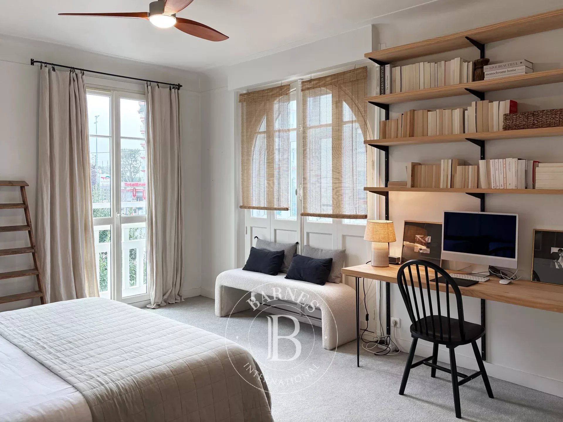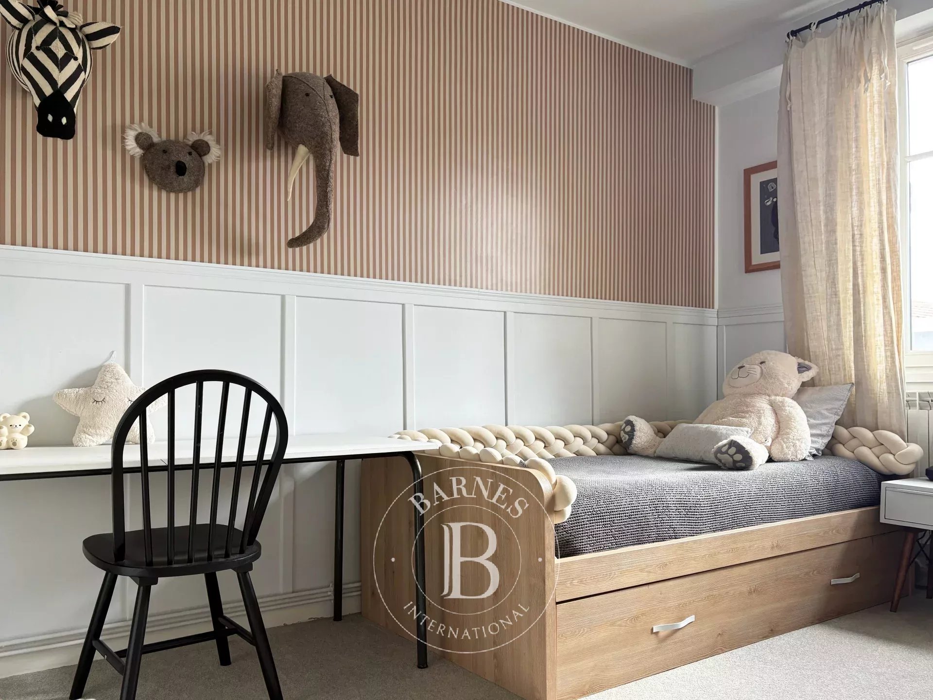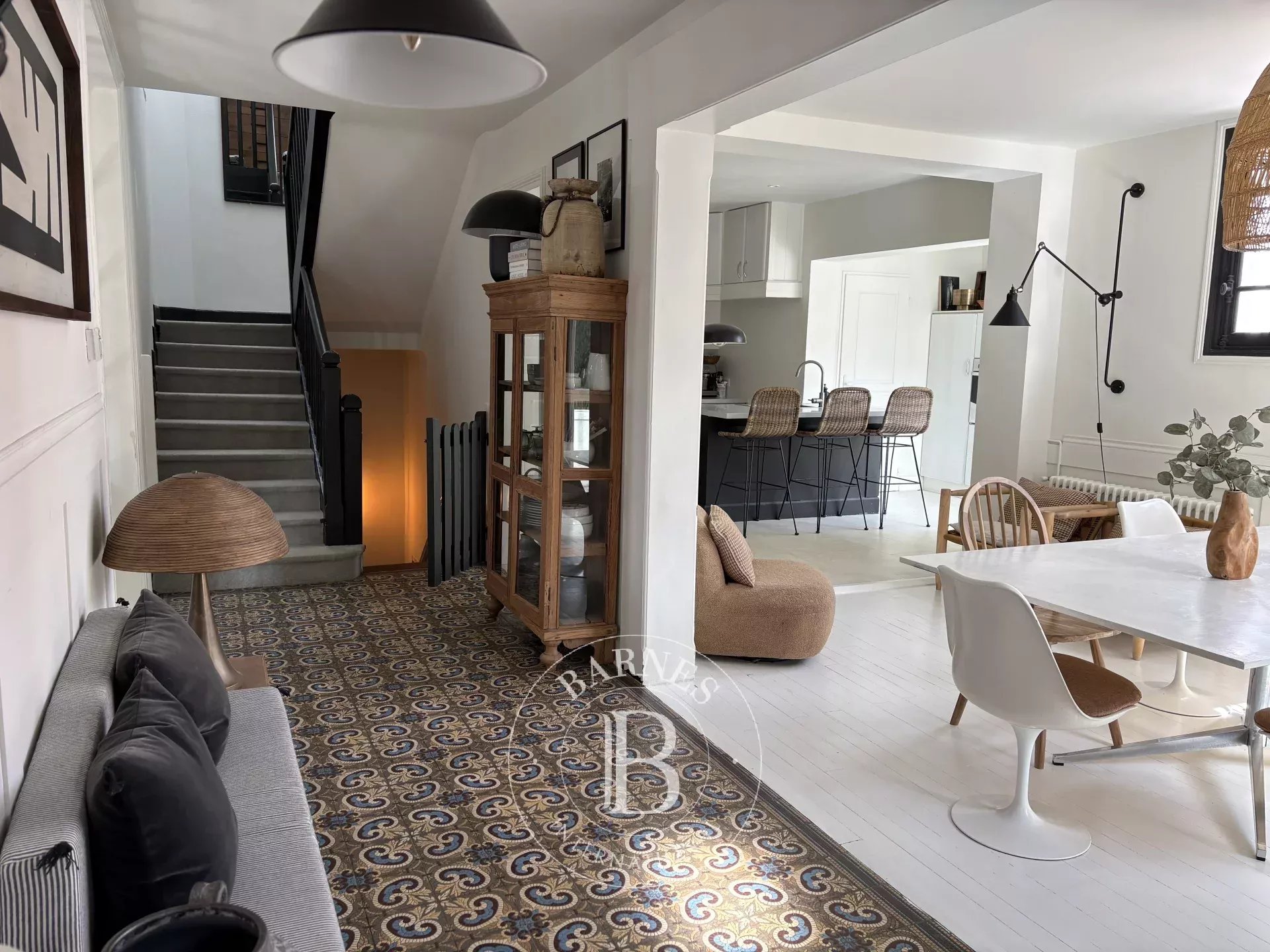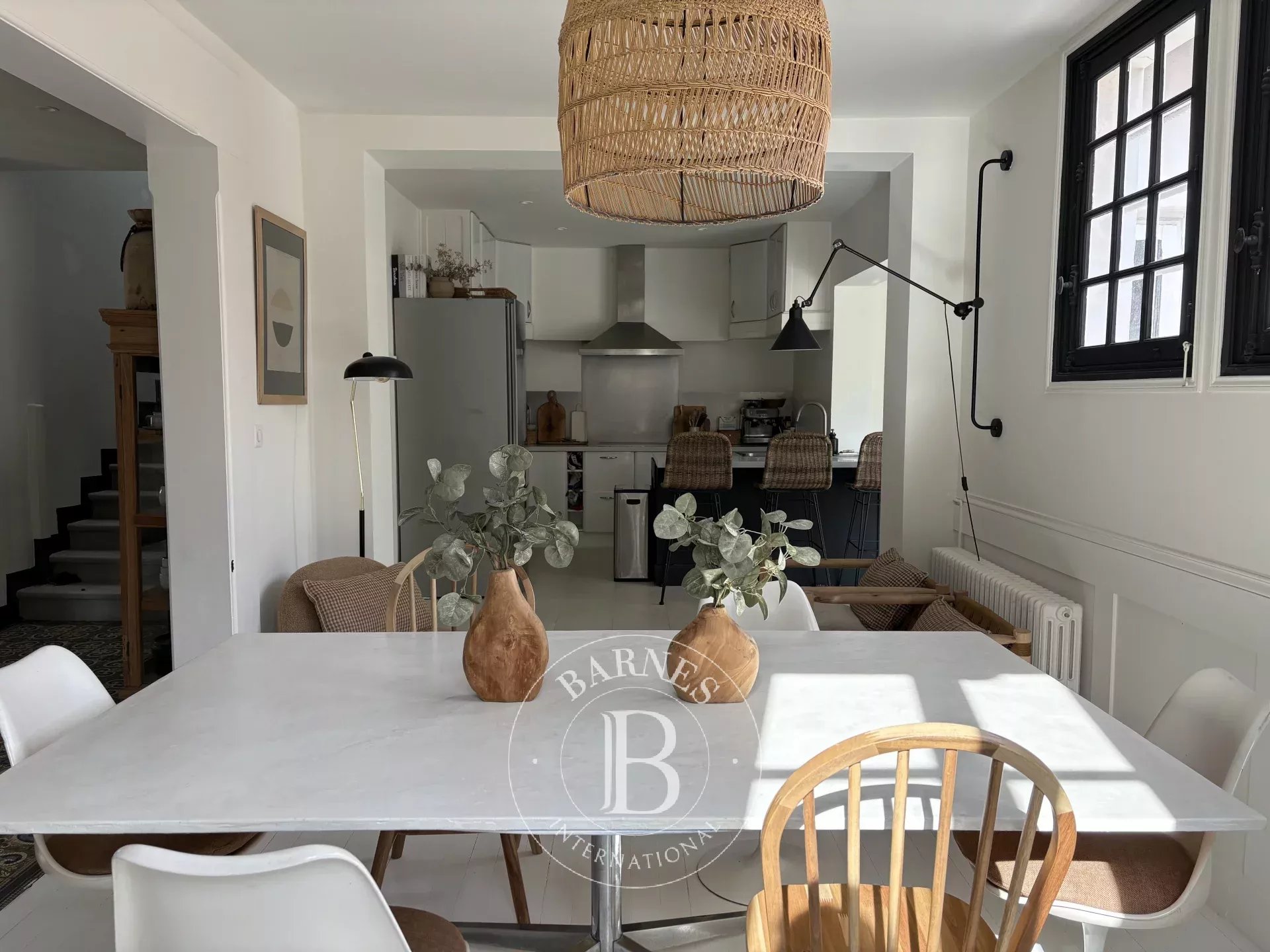 Just a short walk from the center of Biarritz, Maison KUMO is an elegant townhouse accommodating up to 9 guests. Set over three levels, it offers a soft and natural atmosphere, blending authentic charm with contemporary touches.Filled with natural light, the living space features a cozy lounge with fireplace, a welcoming dining area, and a fully equipped open-plan kitchen with vintage accents. The space opens onto a superb 120 m² terrace—rare in the city center—perfect for outdoor dining and relaxing moments in a guinguette-style setting.The house offers 5 bedrooms. On the lower level, two double bedrooms (160 cm beds) share a shower room with toilets, including one suite with private access. Upstairs, three suites complete the property: one bedroom with a single bed (90 cm), desk, and en-suite shower room with toilets; one bedroom with two single beds (90 cm), a bathtub and separate toilets; and a master suite with a double bed (180 cm), desk, shower room, bathtub, and toilets.Ideally located, the property allows you to reach the Halles de Biarritz in 15 minutes on foot and the Grande Plage in 20 minutes. Shops, restaurants, and local attractions are easily accessible, with a free shuttle (line N5) right in front of the house. The property does not have private parking, but free parking is available in nearby streets and at the Charles Floquet car park.