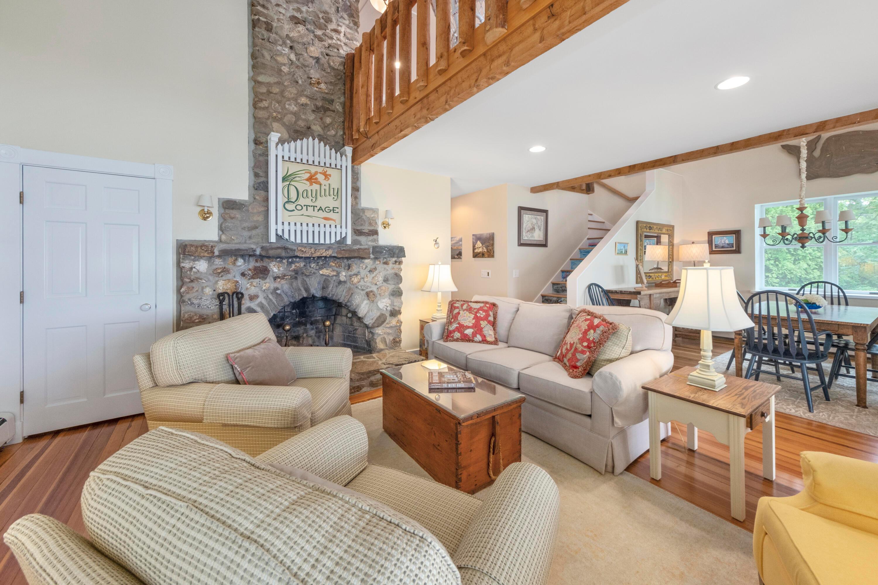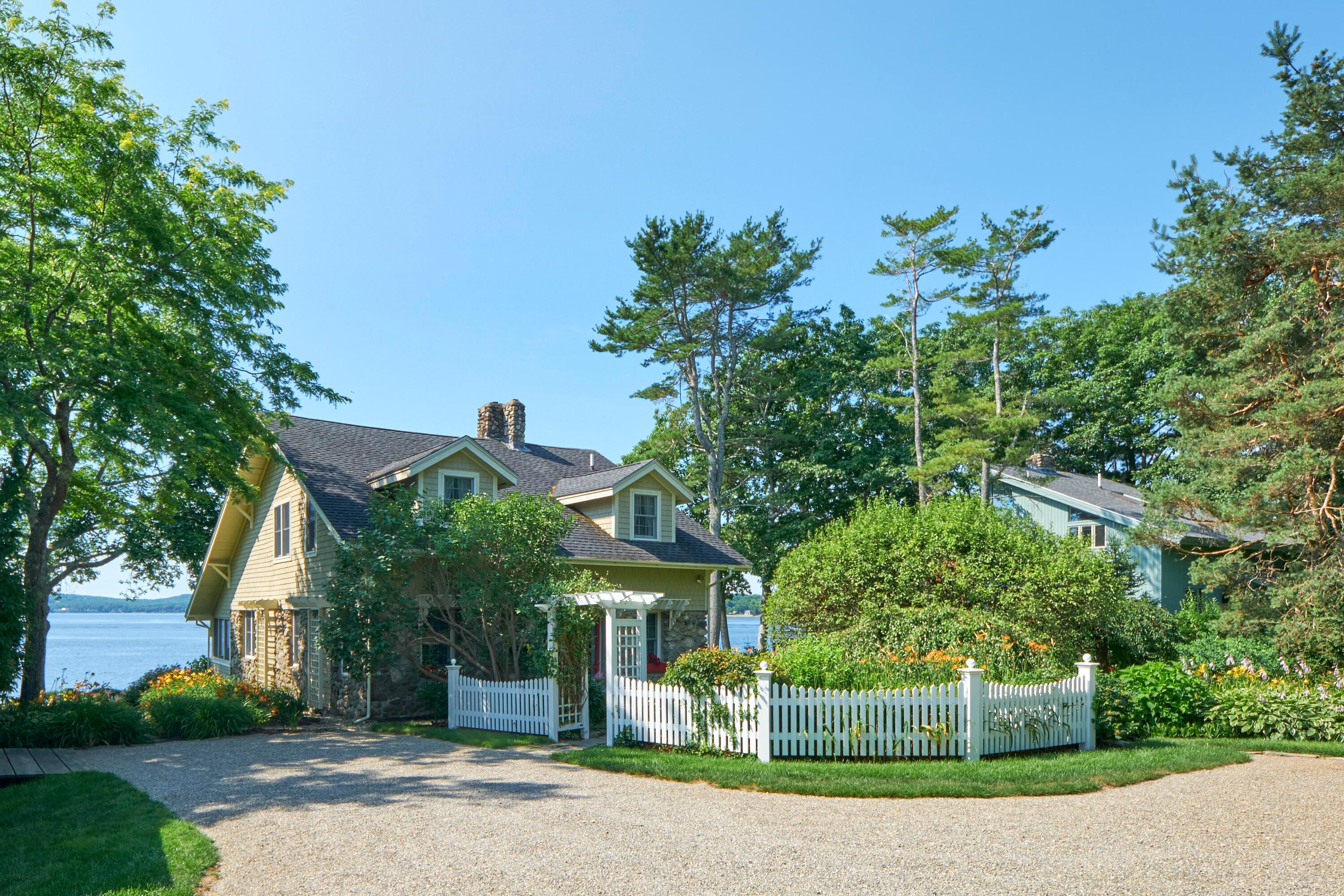 Nestled on the serene shores of Belfast's outer harbor, Day Lily Cottage is a historic gem from 1920, beautifully restored to capture both timeless charm and modern elegance. This elevated waterfront haven boasts original stone and clapboard architecture, with a spacious covered porch with a screened-in area, perfectly positioned to take in the stunning southern views over the harbor. Inside, the cottage is filled with character: relax by the cozy stone fireplace, prepare meals in a delightful kitchen with granite counters and modern appliances, and enjoy two exquisitely updated bathrooms with oversized glass showers. With three comfortable bedrooms, this year-round retreat balances the simple allure of a classic New England cottage with the comforts of contemporary living. Outside, the grounds are a lush oasis, landscaped with native that blend seamlessly into the natural surroundings. The property includes a charming barn for storage, a spacious yard for outdoor games, and a versatile, stand-alone studio perfect for creative pursuits-be it writing, painting, yoga, or additional guest accommodations. Stairs to the shoreline allow easy access for kayaking, walking and swimming. A strong rental history makes this meticulously maintained property a good choice for investment. Day Lily Cottage offers a rare blend of historic beauty, modern amenities, and enchanting waterfront vistas.