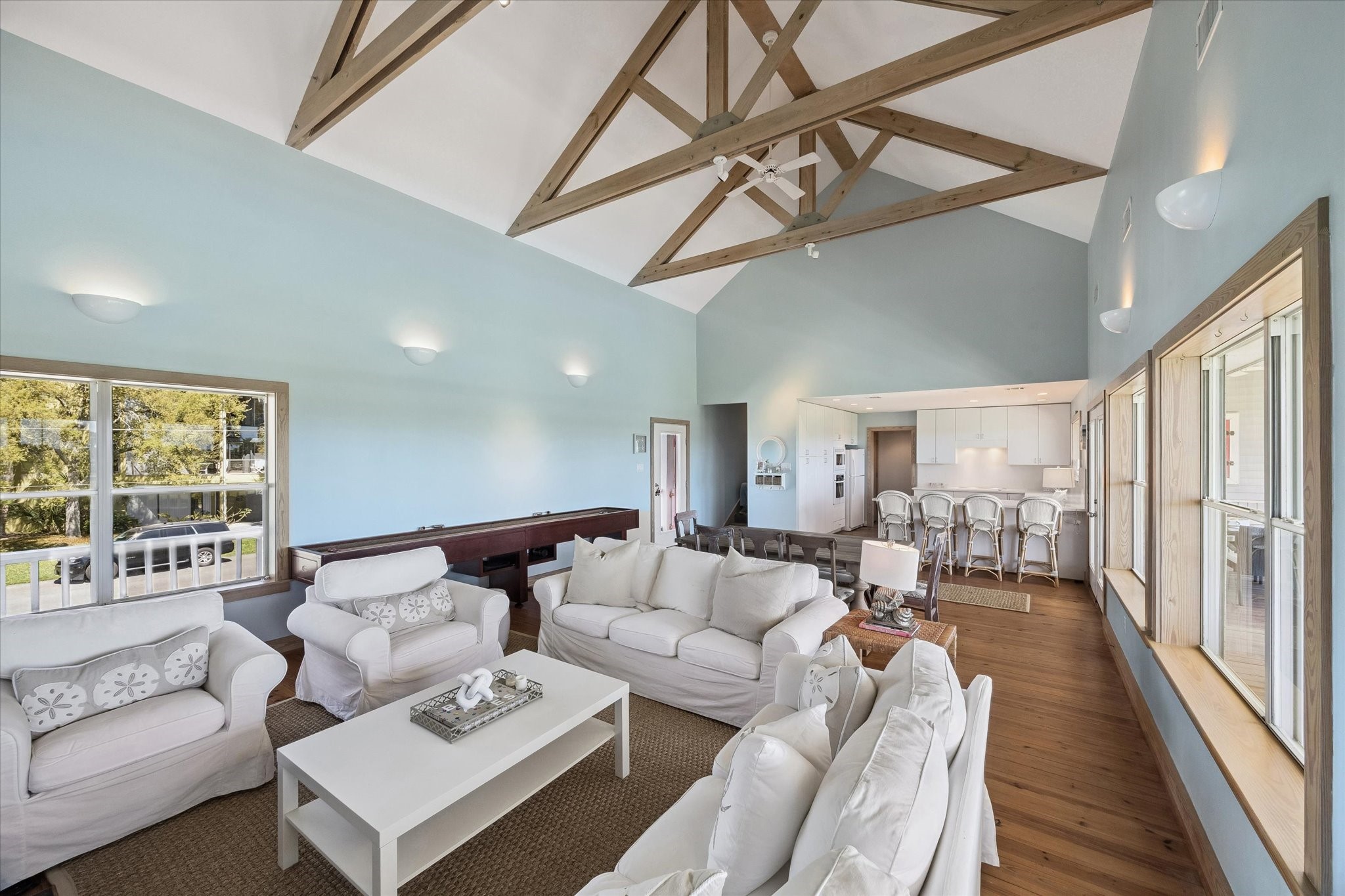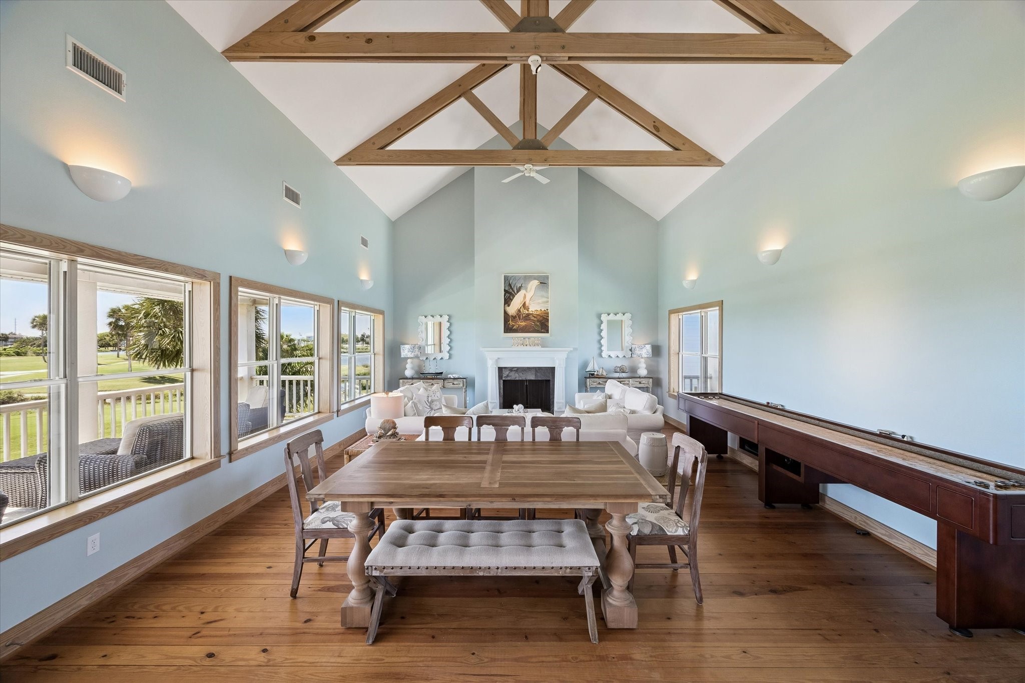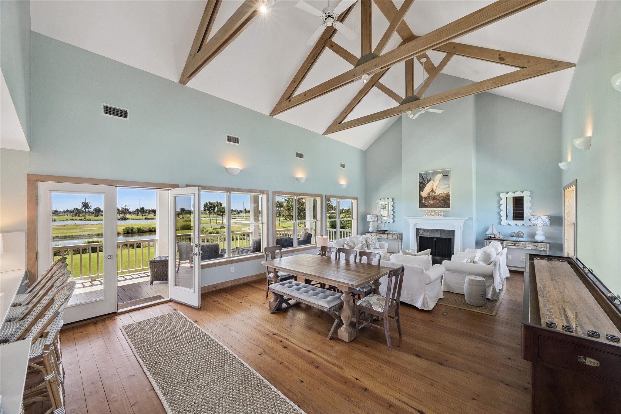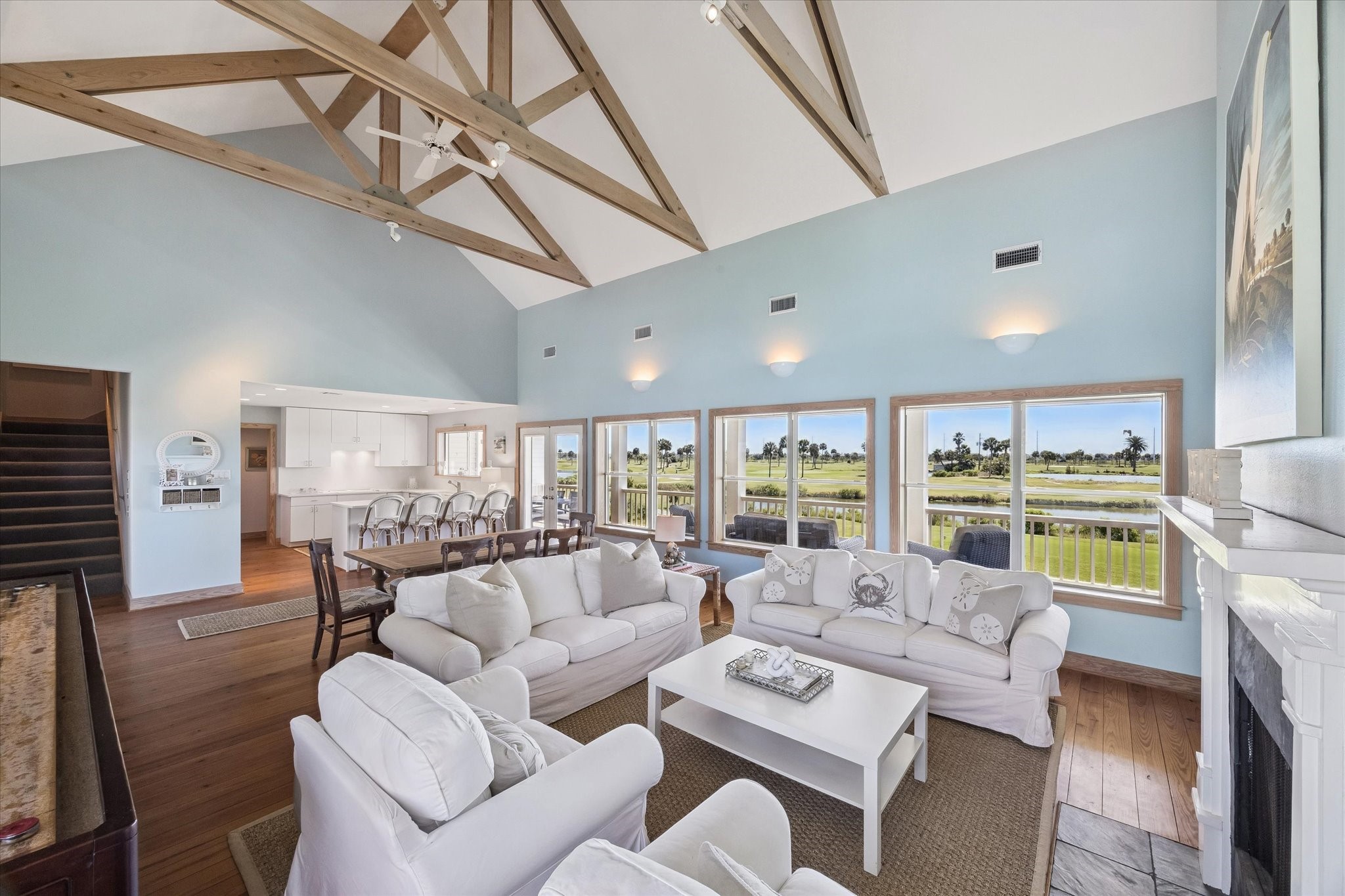 Coming Soon - From its inviting curb appeal to the covered back deck capturing a gentle breeze, you will fall in love. Panoramic views of Galveston Country Club golf course, evoke a Palm Springs-like serenity. Perfect for entertaining! The living-dining area is spacious showcasing vaulted ceilings and exposed wooden trusses. Row of windows bathe the space in sunlight and amazing views. Kitchen offers a farmhouse sink, quartz countertops and amazing floor-to-ceiling storage. Unusually large first-floor primary suite has shower, large vanity, double sinks and phenomenal walk-in closet. Upstairs has two additional bedrooms, each with its own bath. One bedroom is so large it could be split, making for 4 bedrooms. At ground level is a 2-car garage, plus versatile additional room for storage, etc. Double-wide driveway for ample parking. Set back on the lot with an inviting presence. Originally custom-built for a prominent family in a New England coastal style. An exceptional home at an exceptional price.
