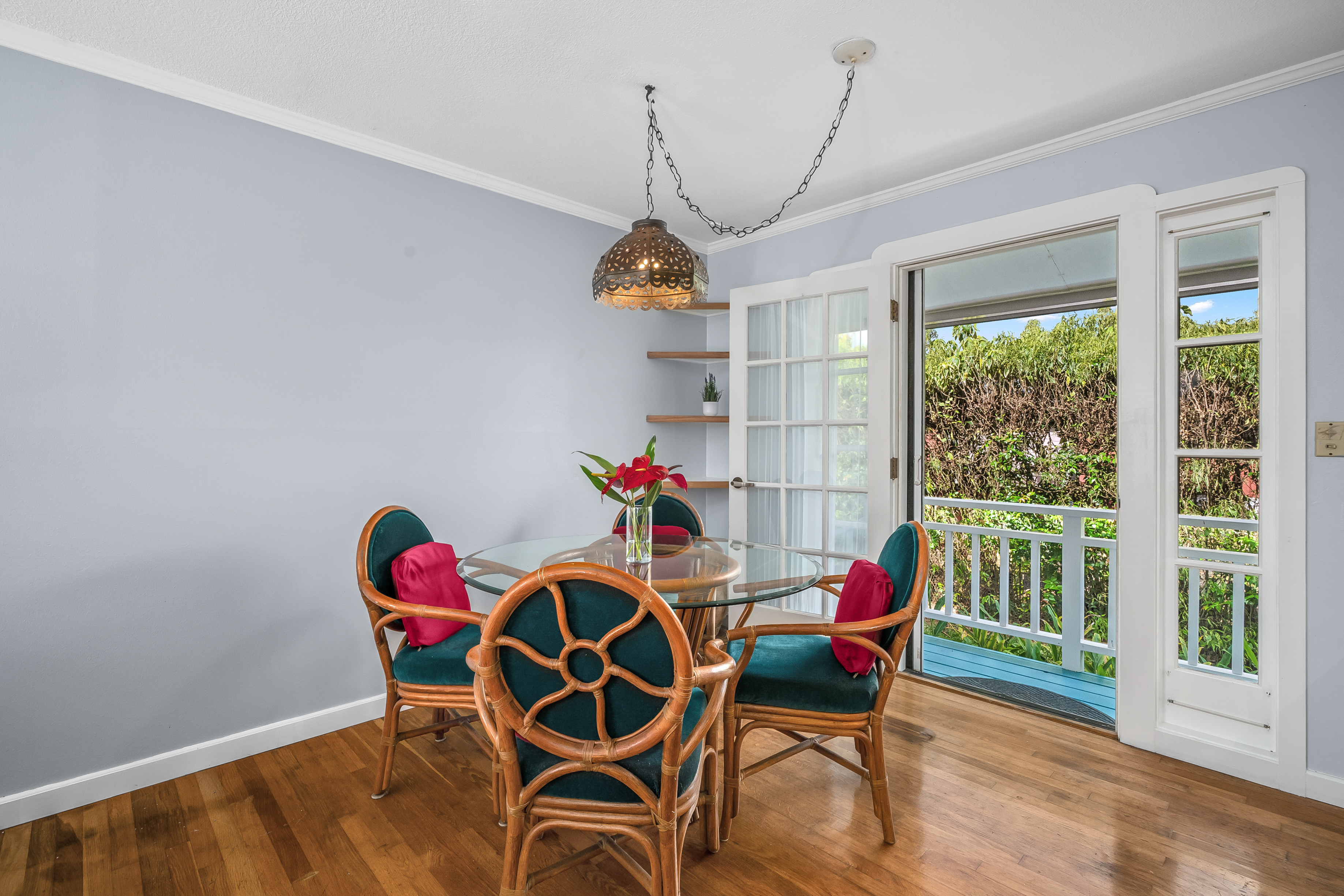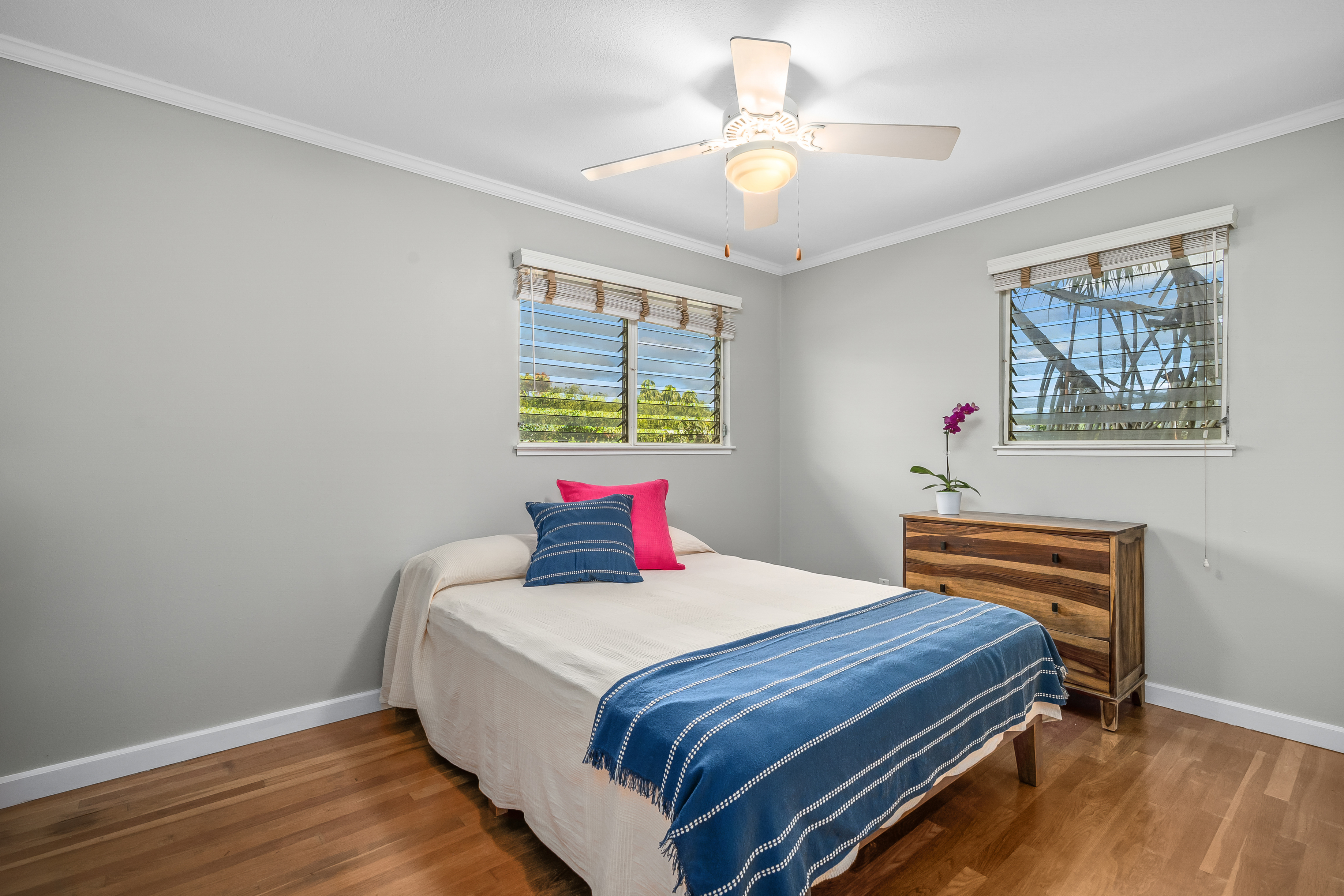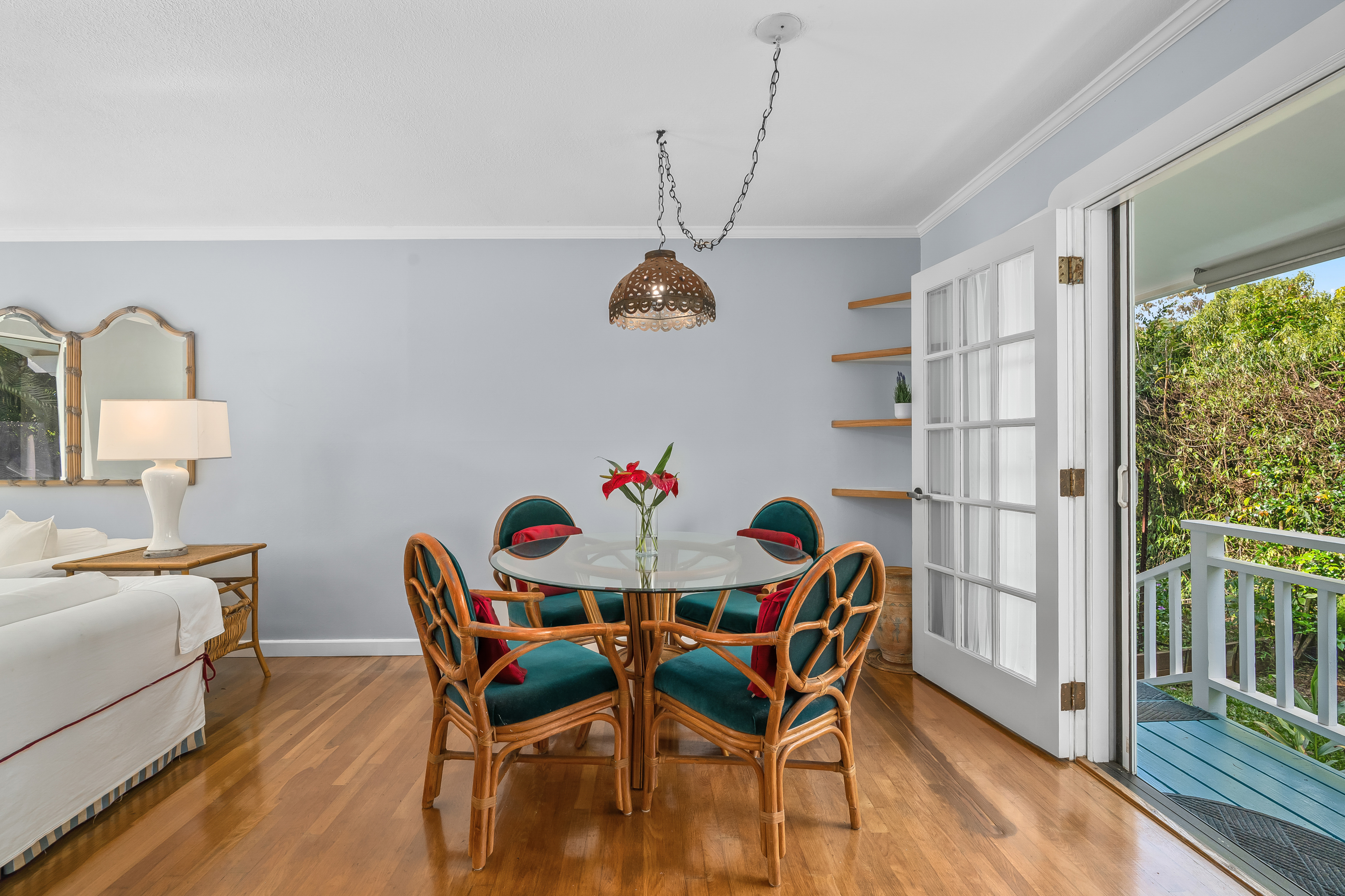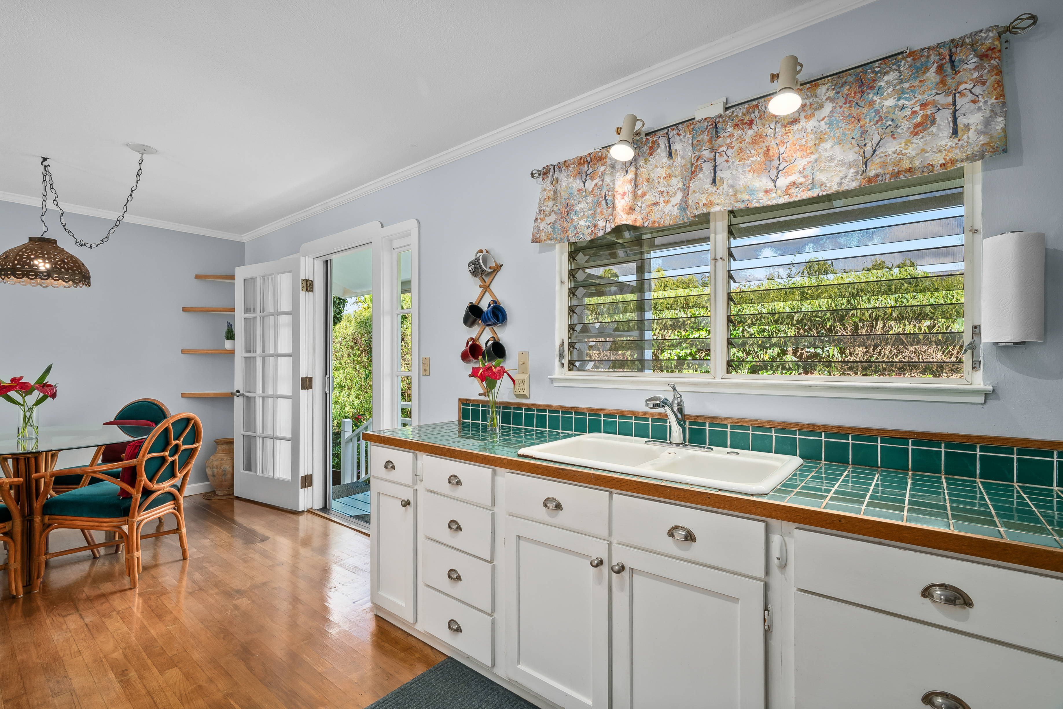5956 Kawaihau Rd B, Kapaʻa, HILocated in upper Kapaʻa near Kapahi, this charming 3-bedroom, 1-bath home offers a comfortable and inviting setting on an approximately 8,651 sq ft lot. The driveway is conveniently accessed from Poloke Street, where a lava rock wall creates an attractive entry.The beautiful yard features several raised garden beds along with mature royal palms, citrus, and banana trees, creating a vibrant outdoor environment with space to garden and enjoy the surroundings.A covered front lanai welcomes you into the home, where the living room flows naturally into the dining area and kitchen, creating a layout that feels open and spacious for the home’s size. Wood floors add to charm. The residence is well maintained and offers a sense of privacy, with three comfortable bedrooms and a full bathroom. There is also a covered garage and a separate shed for storage.Additional features include photovoltaic panels, on-demand hot water and an outdoor shower. The property’s garden areas add to the overall appeal and provide inviting outdoor spaces.Conveniently located just a short distance to Kapahi Park, with a gym nearby as well, this property offers a desirable location paired with a welcoming home and garden setting.