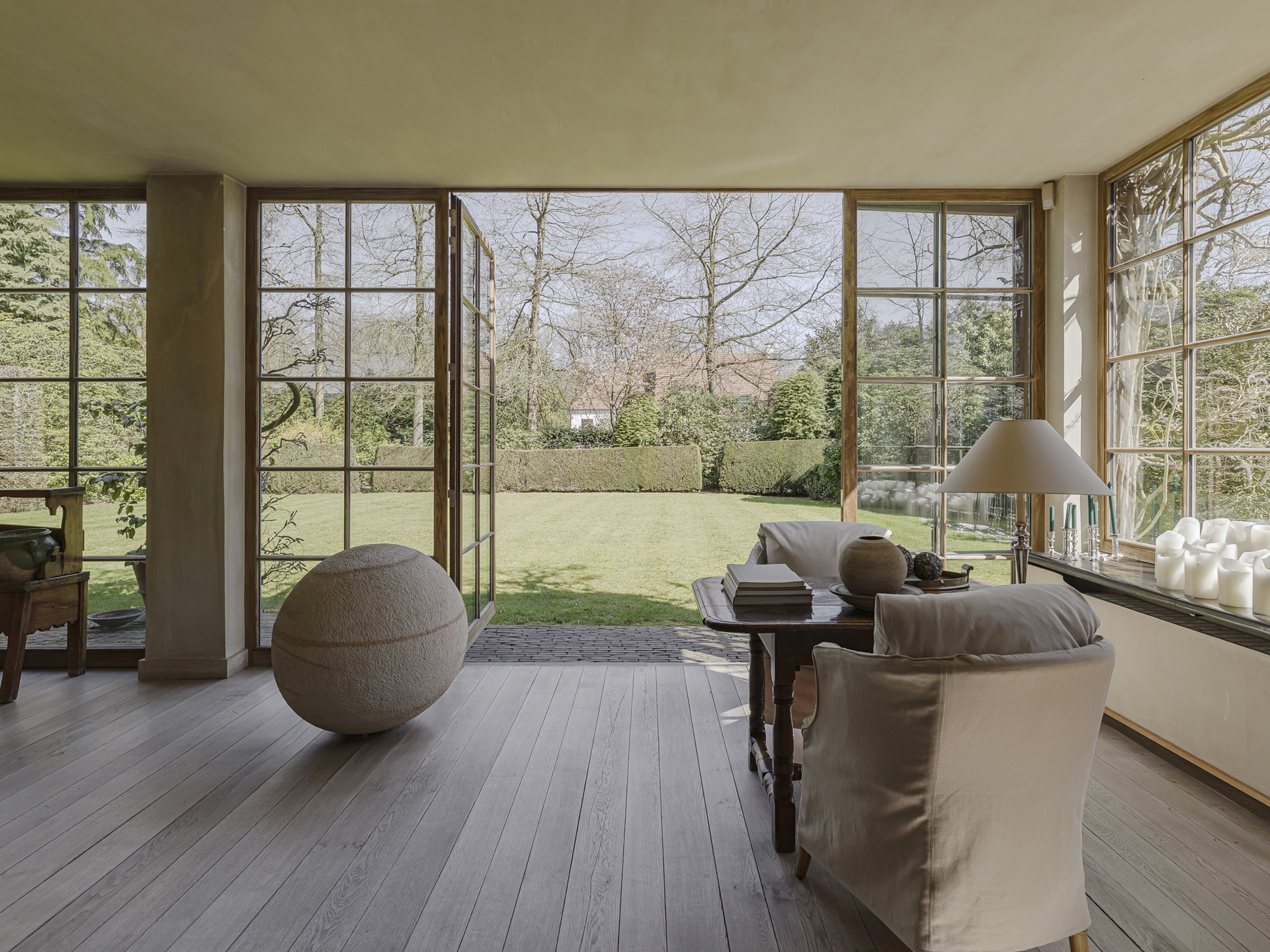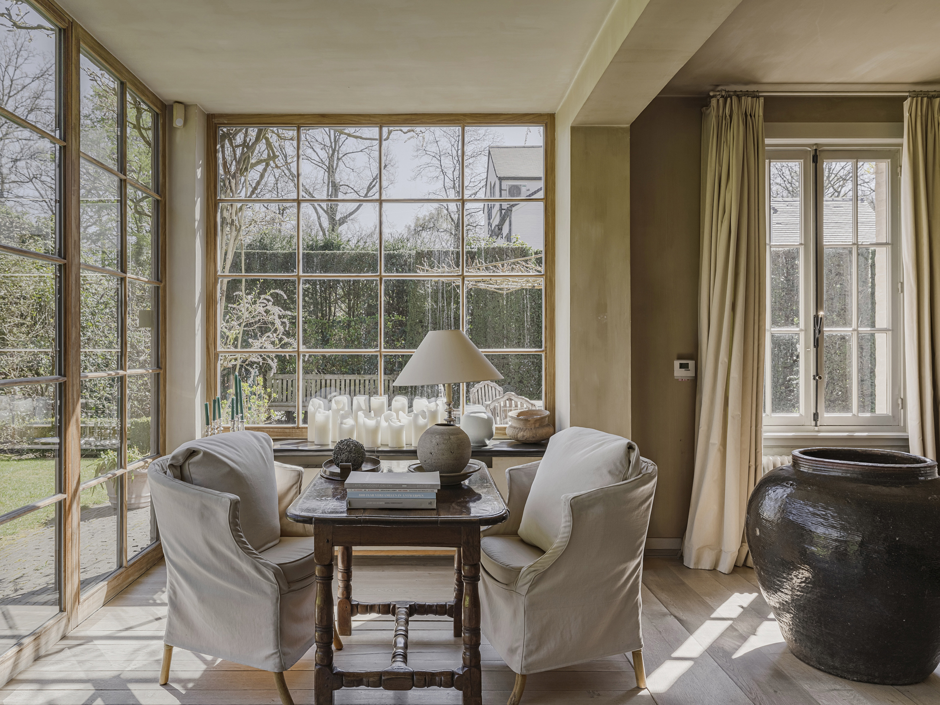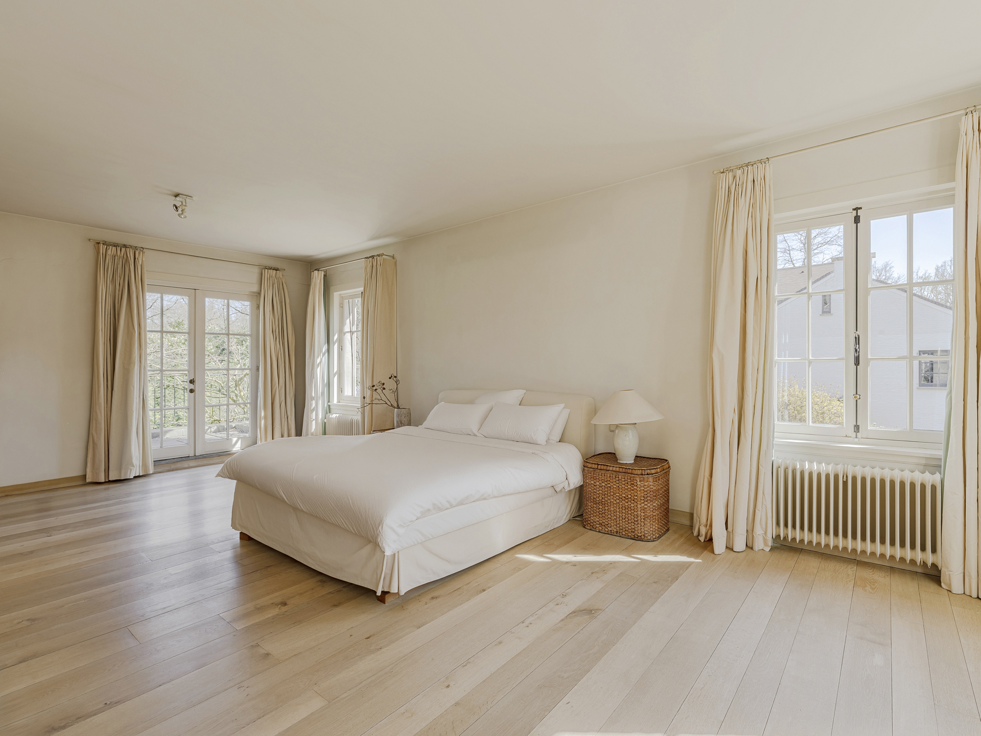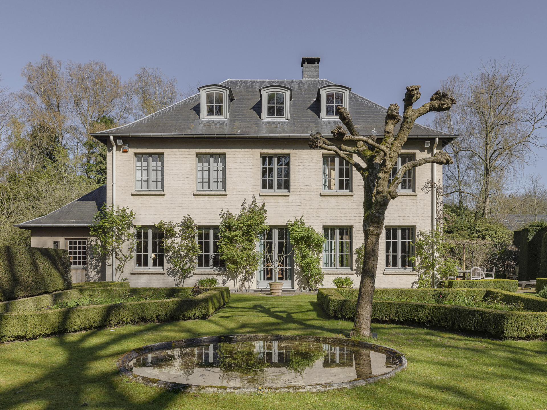 A timeless villa bearing the unique Axel Vervoordt signature. Prime location 'Vriesdonk'. Situated on an east-facing lot of approximately 1800 m² and renovated in 2001. A stately wrought-iron gate and a driveway lined with a magnolia tree welcome you. The entry hall, with paneling in aged pitch pine, leads to a spacious, multifunctional library. The thoughtful layout and oak floors create a warm and harmonious whole. Spacious living room with a fireplace, open-concept kitchen with a pantry, and a light-filled oanjerie. The first floor comprises a spacious master suite with a bedroom, a bathroom in Verde Alpi marble (bathtub and shower), a dressing room and a laundry area. There is potential for an additional bedroom. On the second floor: two bedrooms and a bathroom with a shower and toilet. The interior is elegant and refined, featuring beautiful materials: Italian and Belgian marbles, original double doors, fired slate, and unique fireplace moldings. Painted with mineral lime paints. Roof in natural slate. French-inspired garden with interesting botanical variations, yew and boxwood groves, a ‘miroir d’eau’ (water mirror), and sunny terraces paved with clay pavers. High-efficiency gas boiler with underfloor heating (ground floor), alarm system, and garden sprinkler system. In close proximity to high-quality schools, sports facilities, shops, and restaurants. For information or a viewing, contact Kristof Goossens – kg@sothebysrealty.be or +32 495 65 50 50