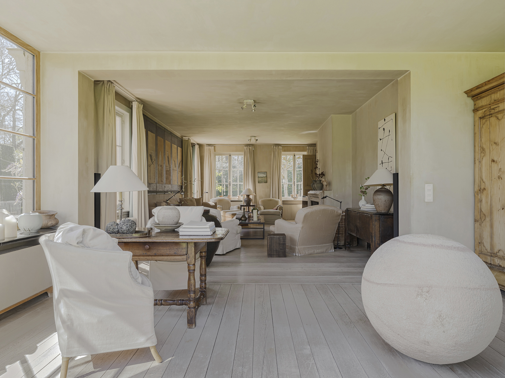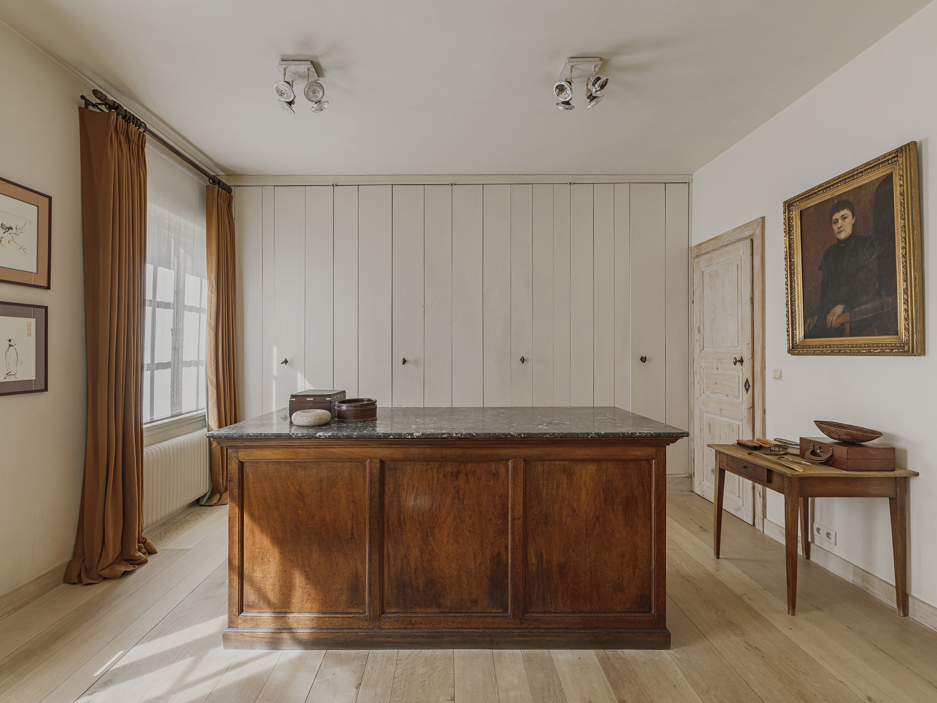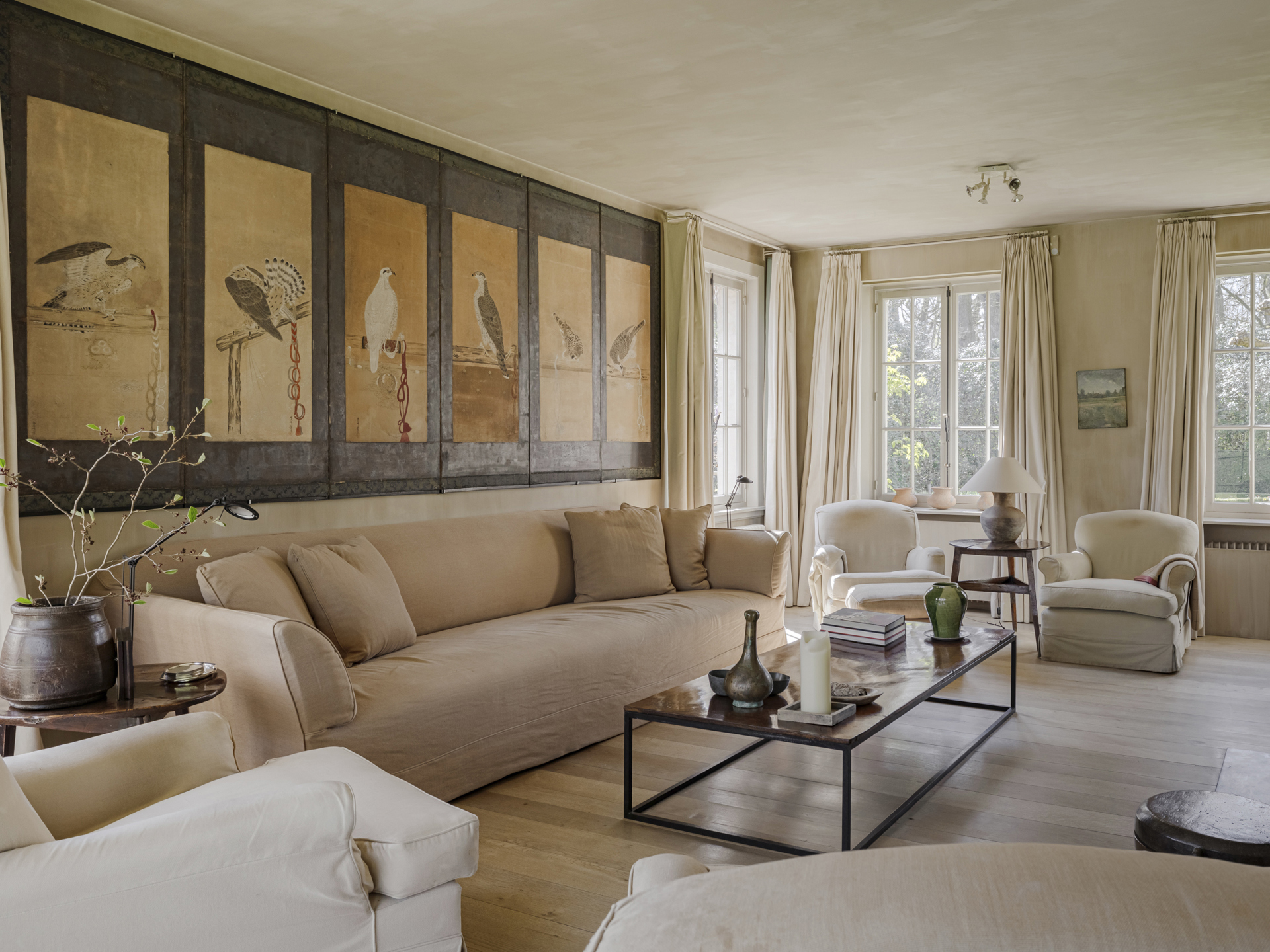 A timeless villa bearing the unique Axel Vervoordt signature. Prime location 'Vriesdonk'. Situated on an east-facing lot of approximately 1800 m² and renovated in 2001. A stately wrought-iron gate and a driveway lined with a magnolia tree welcome you. The entry hall, with paneling in aged pitch pine, leads to a spacious, multifunctional library. The thoughtful layout and oak floors create a warm and harmonious whole. Spacious living room with a fireplace, open-concept kitchen with a pantry, and a light-filled oanjerie. The first floor comprises a spacious master suite with a bedroom, a bathroom in Verde Alpi marble (bathtub and shower), a dressing room and a laundry area. There is potential for an additional bedroom. On the second floor: two bedrooms and a bathroom with a shower and toilet. The interior is elegant and refined, featuring beautiful materials: Italian and Belgian marbles, original double doors, fired slate, and unique fireplace moldings. Painted with mineral lime paints. Roof in natural slate. French-inspired garden with interesting botanical variations, yew and boxwood groves, a ‘miroir d’eau’ (water mirror), and sunny terraces paved with clay pavers. High-efficiency gas boiler with underfloor heating (ground floor), alarm system, and garden sprinkler system. In close proximity to high-quality schools, sports facilities, shops, and restaurants. For information or a viewing, contact Kristof Goossens – kg@sothebysrealty.be or +32 495 65 50 50