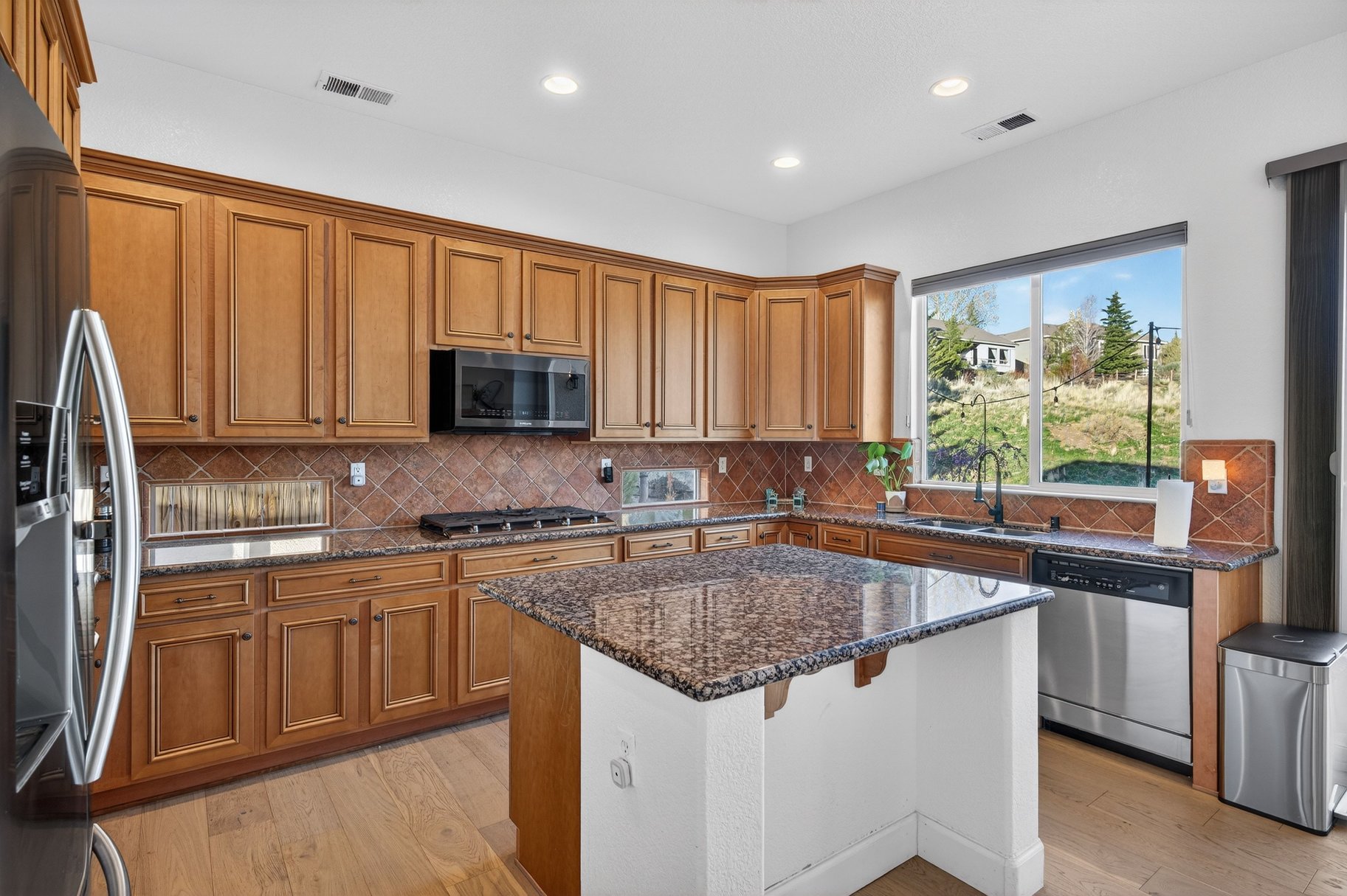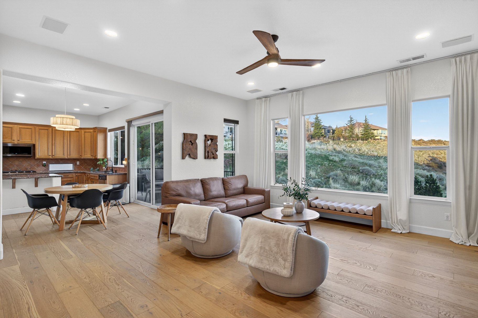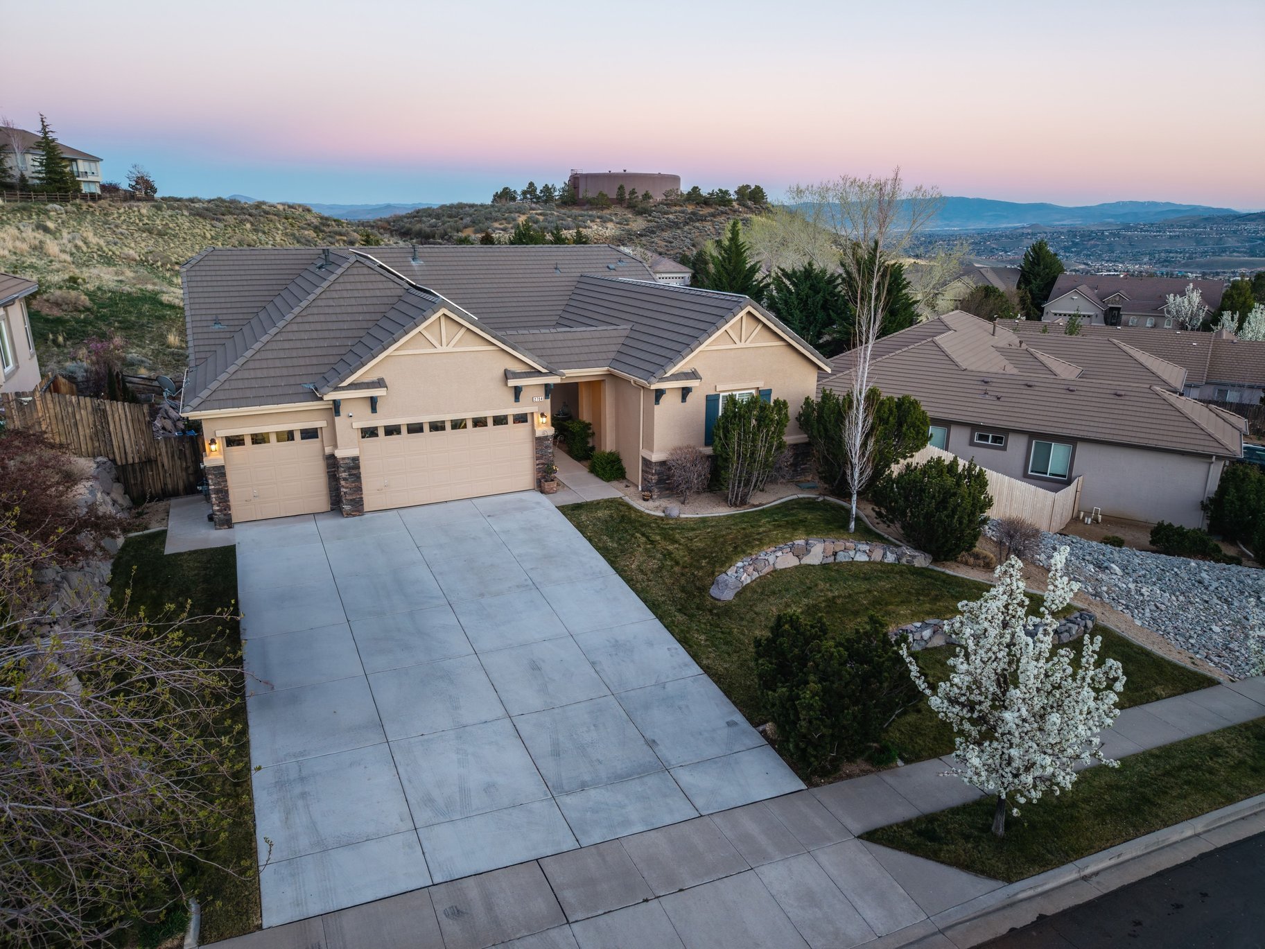 Granite Ridge Views. Modern Upgrades. Tahoe Within Reach. Perched on the upper slopes of Peavine Mountain, this 4 bed, 3.5 bath Craftsman-style home offers sweeping panoramic views of Reno, Verdi, and the Sierra Nevada mountains and just under an hour to Lake Tahoe. Inside, thoughtful updates meet timeless design. Recent improvements include brand new luxury vinyl plank flooring and an EV charger, complementing an already well appointed interior featuring slab granite countertops, maple cabinetry, stainless steel appliances, and an open-concept great room with fireplace and built-in entertainment niche filled with an abundance of natural light. The main-level primary suite provides comfort and privacy, while the expansive daylight basement opens directly to the backyard which can be ideal for a home theater, fitness space, or multi-generational living. Downstairs features a full bathroom and bedroom as well. Set on approximately 0.3 acres, the fully improved landscaped backyard offers a large paver patio, open grass lawn, and direct access to open land which creates a seamless blend of privacy and outdoor lifestyle. Just steps from BLM land, enjoy hiking, biking, and endless Nevada sunsets right out your door. Additional features include a fully owned 4.9kW solar system offsetting current usage, and a layout designed for both everyday living and entertaining. A rare opportunity to own in one of Northwest Reno's most sought-after communities.
