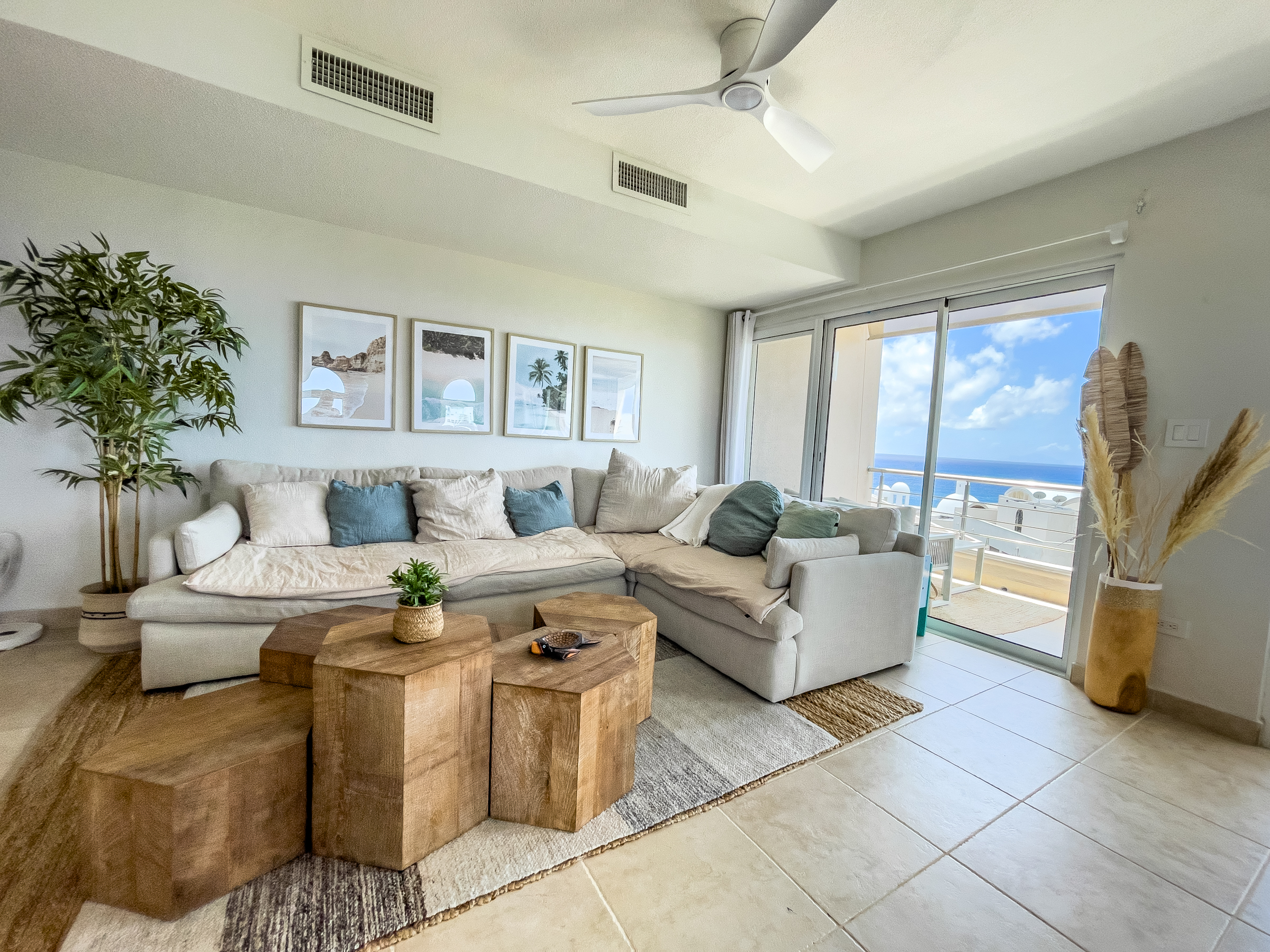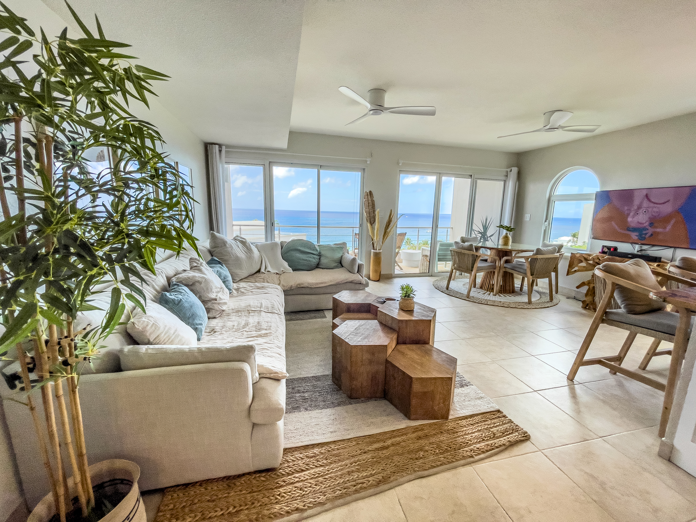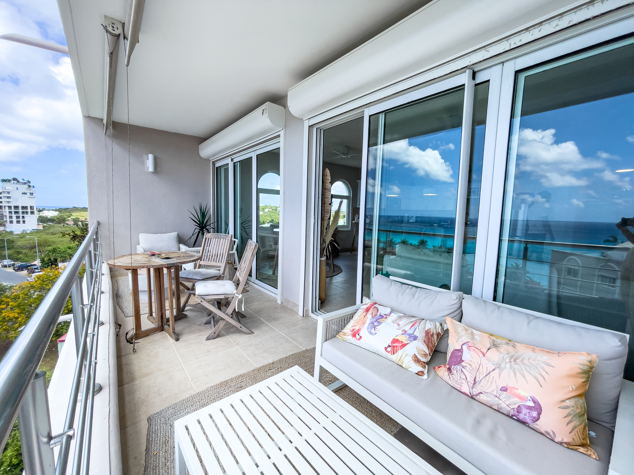 Located within the oceanfront community of Rainbow Beach Club in Cupecoy, this beautifully positioned two-bedroom, two-bathroom corner apartment offers a rare combination of natural light, privacy, and open ocean views.