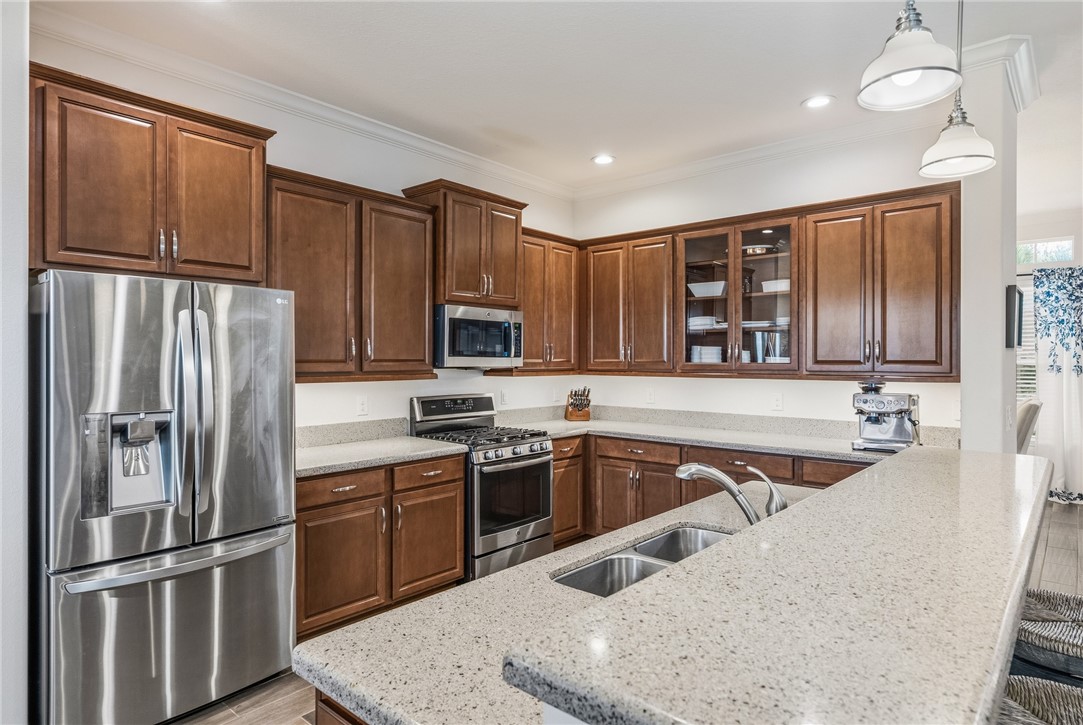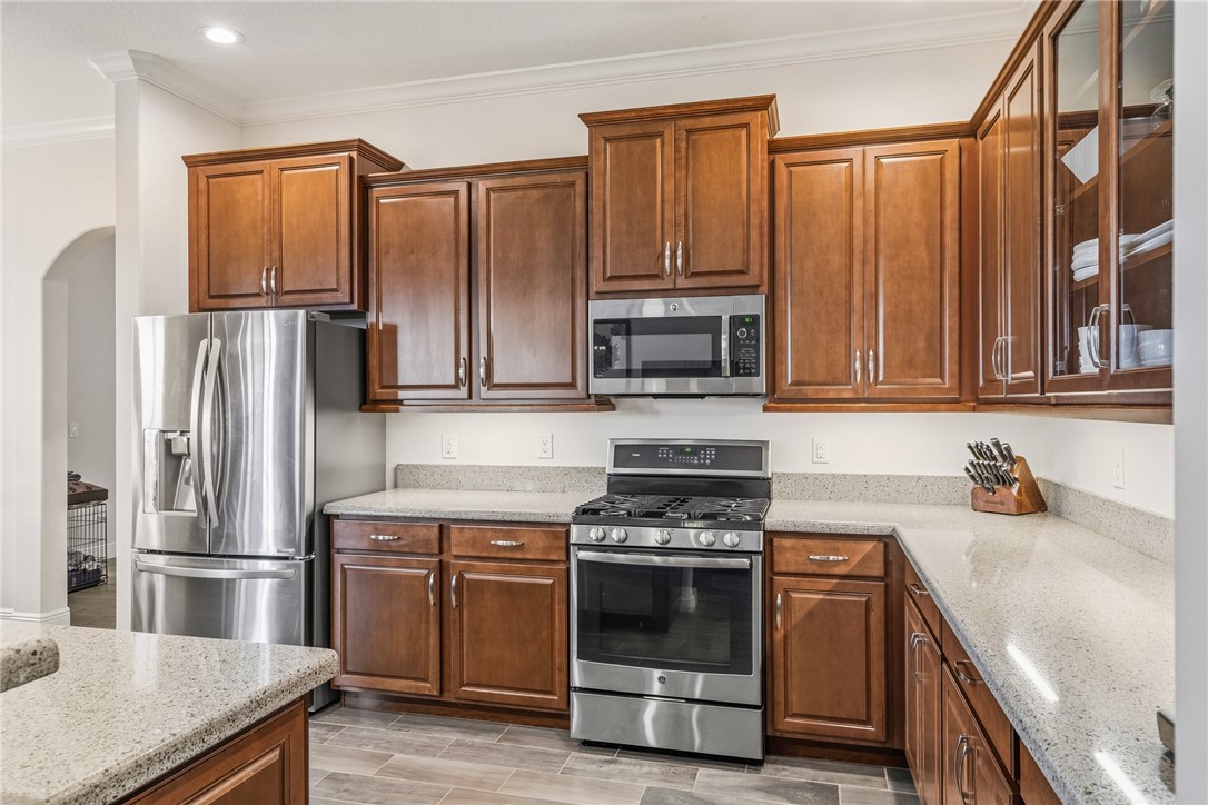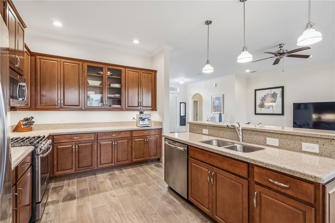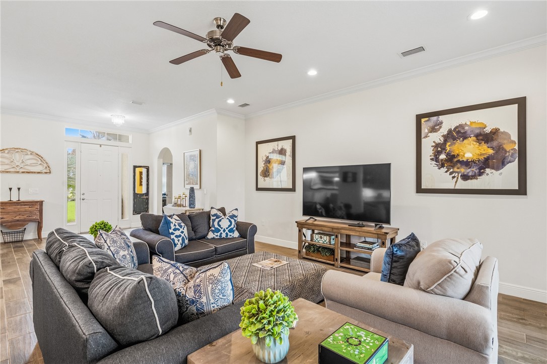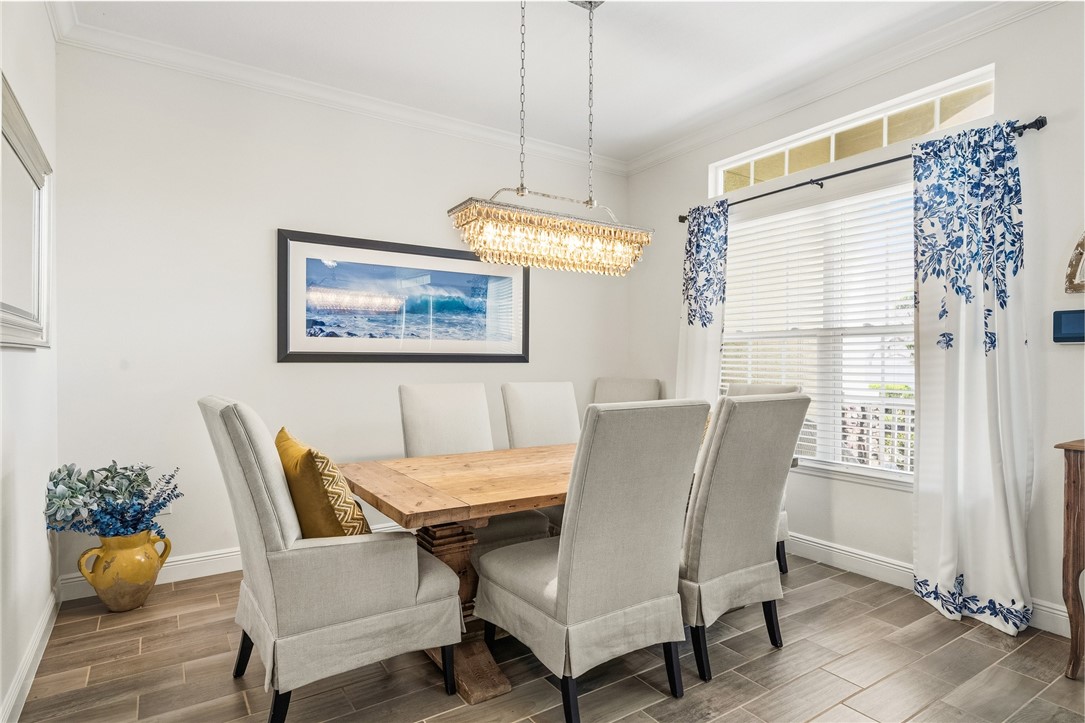 Golf & lake view gem! This home provides a prime location-choice corner lot .31 ac. on 10th hole. Step inside to enjoy wood plank tile floors throughout, open floor plan, custom kitchen features, 3 BR's + den for private office. Spacious screened lanai PLUS fenced yard - plenty or room for a pool. Spectacular sunsets. Impeccably maintained. Golf + social membership available.