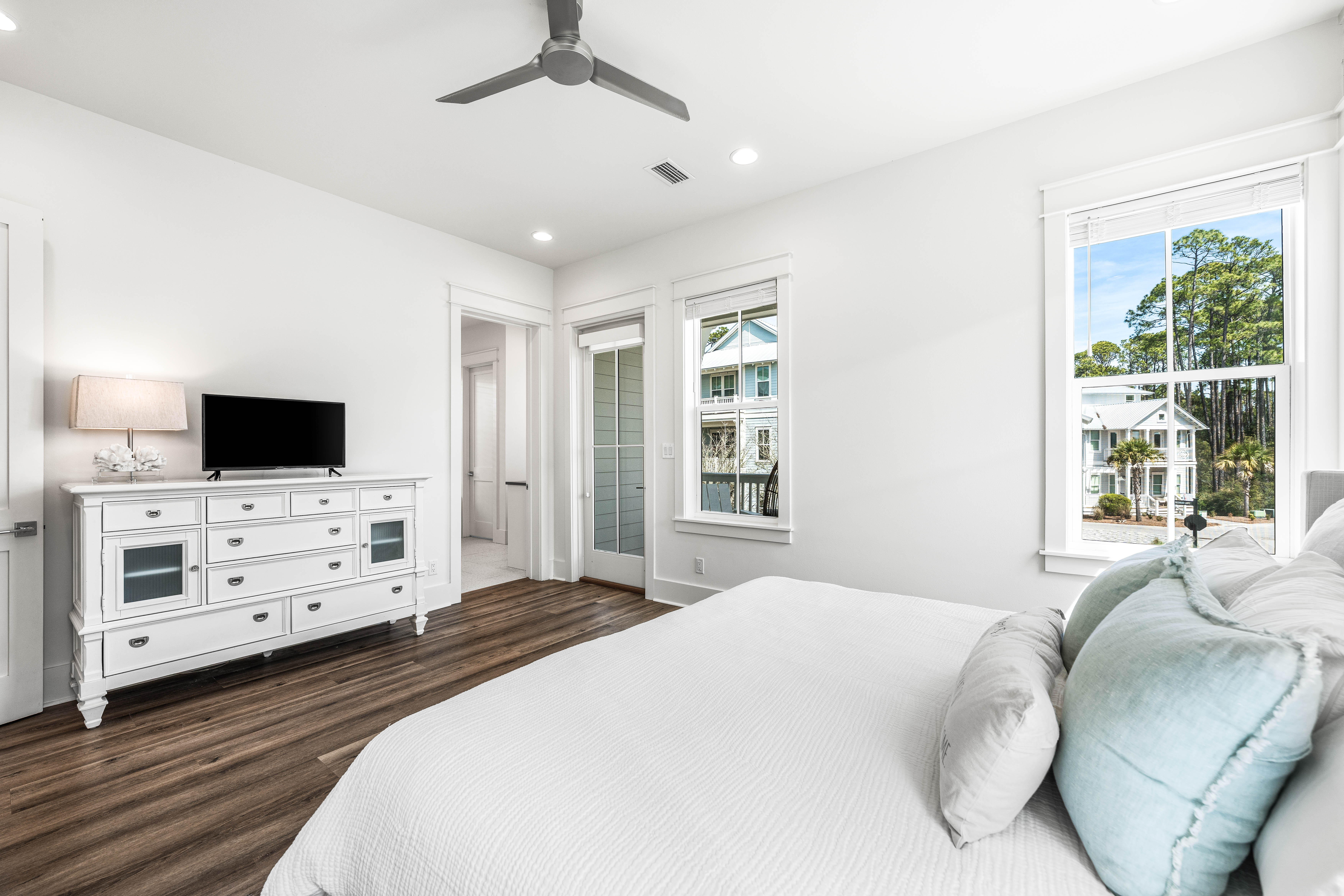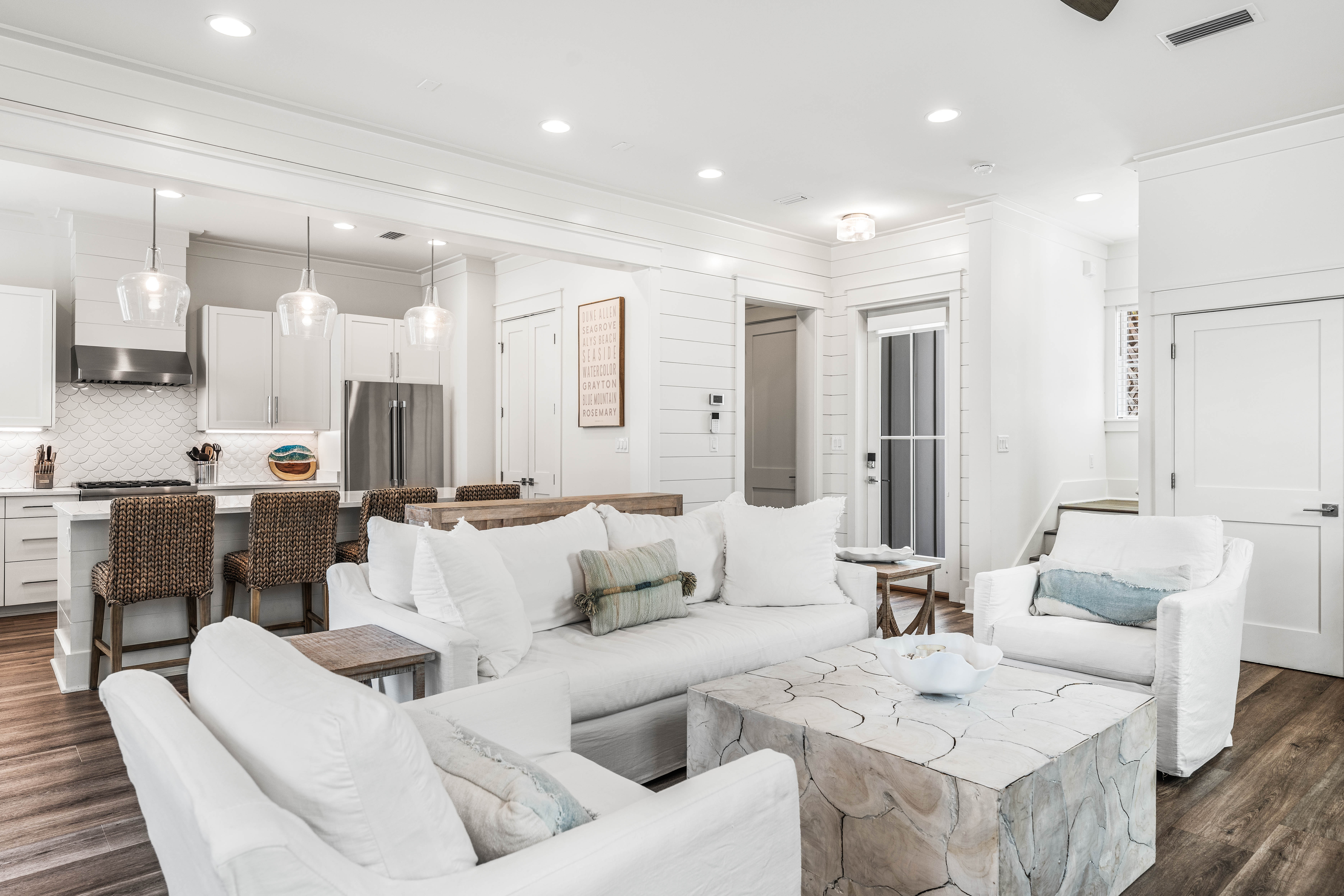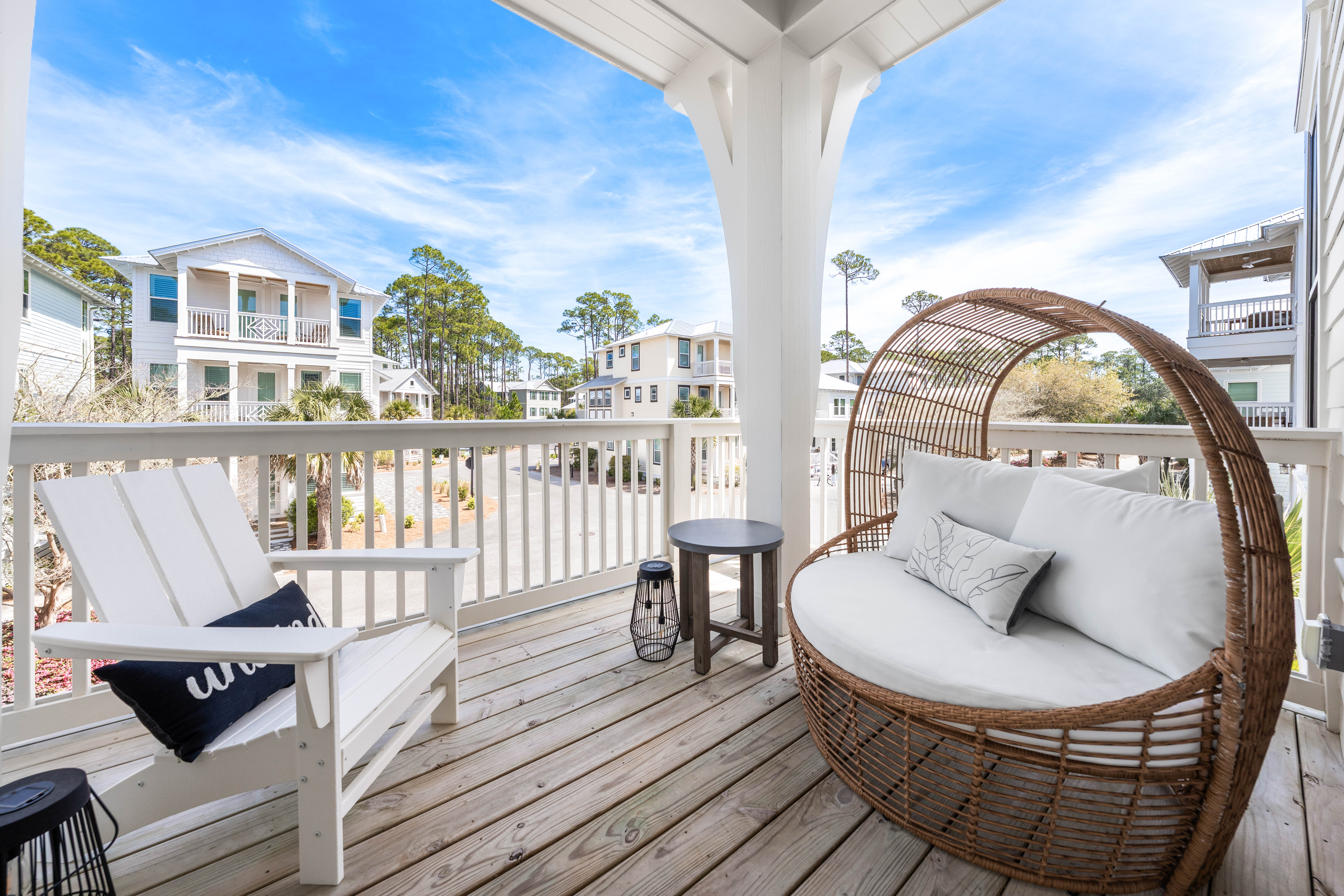 Find relaxed coastal living at this pristine 5BR/5.5BA retreat with over 3,200 square feet in the gated neighborhood of Treetop Village. Positioned on a corner homesite this immaculate home offers luxurious living, outdoor spaces, and modern conveniences. The open-concept living, kitchen and dining areas are filled with natural light and designer touches. The chef's kitchen boasts premium appliances, a large center island, and custom cabinetry. The home includes two spacious primary bedrooms both with their own private porches and spa-like ensuites. Two additional guest bedrooms with full baths plus a flex room with a Jack-and-Jill bath offers endless options including an additional bedroom, bunk room, office, or workout area. A second living area on the third level allows ample spacefor family and friends to enjoy. Just steps away are the community pool and tram stop which provides Gulf access to the coveted deeded beach. Additionally, the proximity to both Scenic Highway 30A and Highway 98 ensures effortless travel and connectivity to shops and restaurants from Alys Beach to 30Avenue. This property has been meticulously maintained and offers a rare combination of privacy, location, and resort-style amenities. Whether seeking a primary residence, luxurious second home or a high-performing investment property, this is a rare gem along 30A.