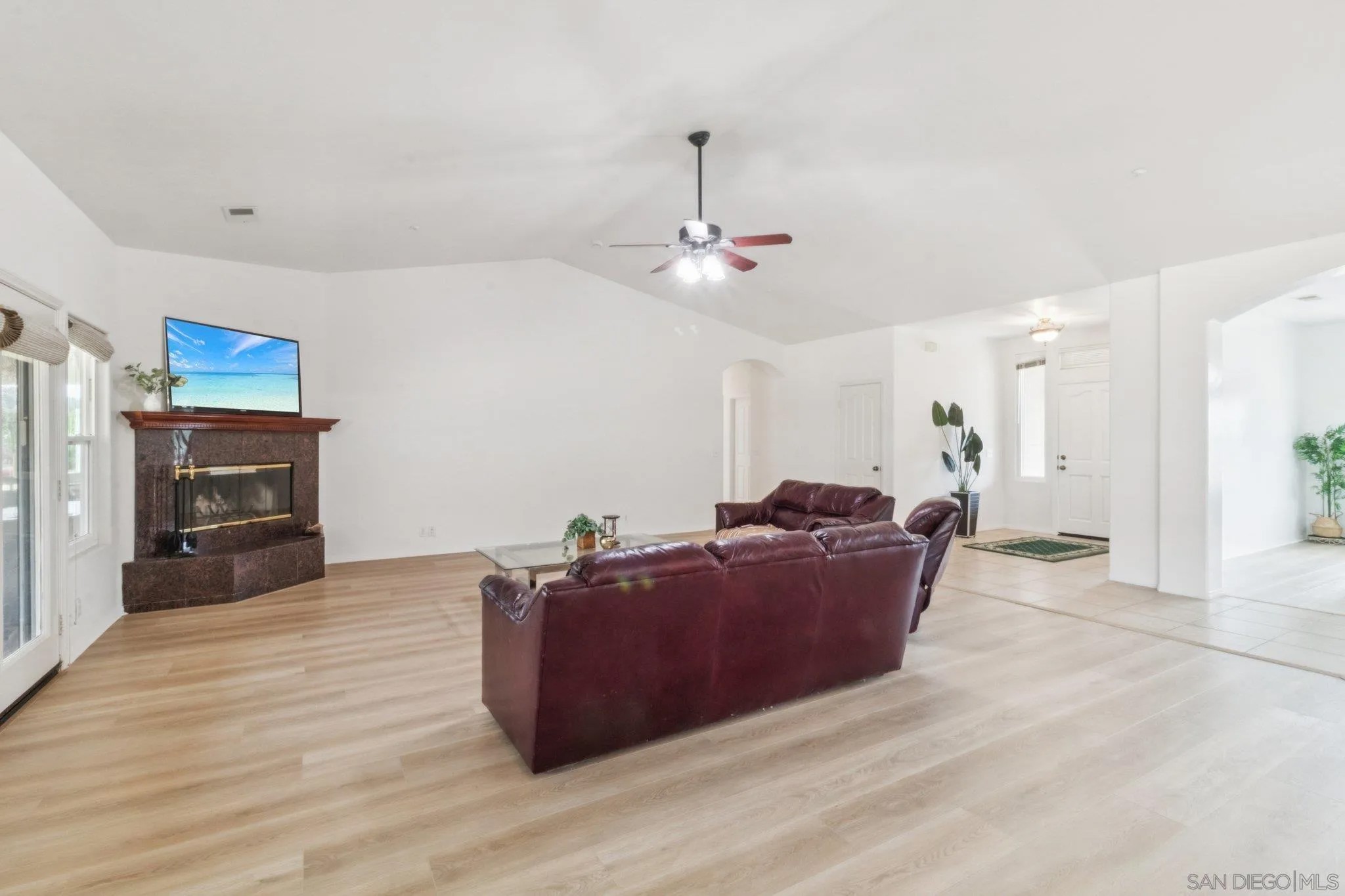 Single-level 4-5 bedroom, 3 bath, 3,008 sq ft home on 2.25 acres of flat, usable land with peaceful mountain views. Quality construction throughout with wide doors, bullnose corners, curved archways, 9 ft ceilings, skylights, recessed lighting, and four ceiling fans. Spacious island kitchen with Corian counters top, walk-in pantry, and breakfast bar. Large great room with fireplace and French doors leading to the back patio. Primary suite includes French doors, walk-in closet, cultured marble tub and sinks, and a spacious bedroom layout. Additional bedrooms are generously sized. Wide 4-ft hallway with sconces, dedicated office, and full laundry room. Finished, insulated 3-car garage with storage shelves. Property offers room for horses, chickens, RV parking, and additional uses, subject to local guidelines. Quiet, serene setting with open, usable land. Enjoy your everyday beautiful setting inside, and out side mountain views. Single-level home with wide doors and spacious bedrooms on 2.25 acres of flat, usable land. Quality construction with 9 ft ceilings, skylights, curved archways, and a large island kitchen. Finished 3-car garage with storage and room for RV parking. Property offers open land suitable for horses, animals, gardens, or future improvements, buyer to verify all uses with County of San Diego. Septic, and all systems maintained by long-term owners. Quiet, private setting with mountain views and easy access to town. All information deemed reliable but not guaranteed; buyer and buyer's agent to verify all before COE.