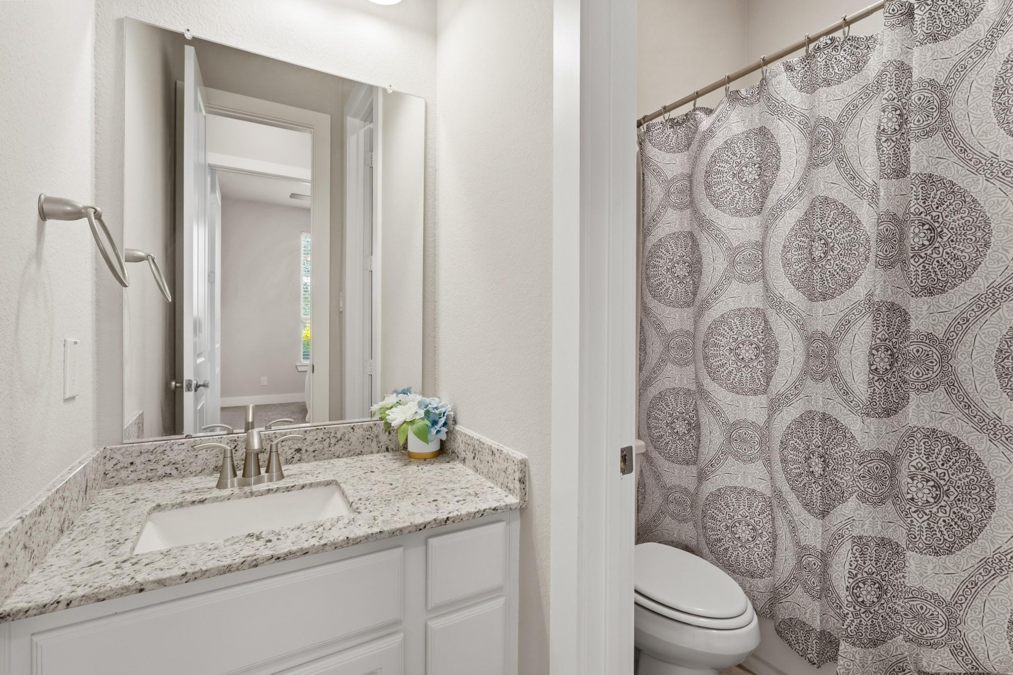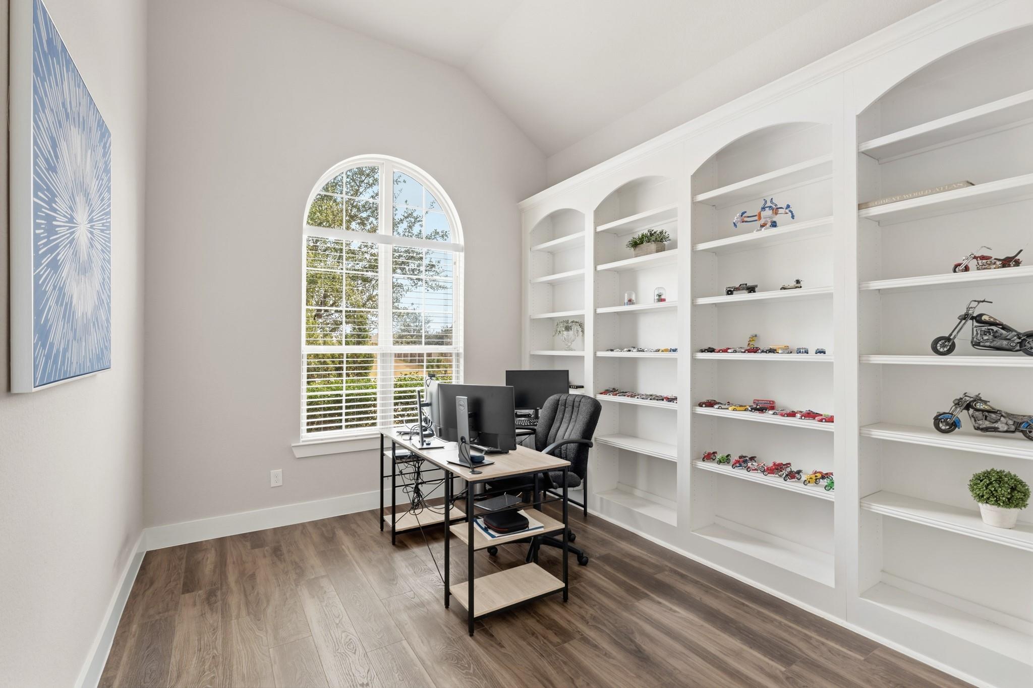 Highland home with 4 CAR GARAGE! One of the only homes in Harvest Green that offers a true 4 car garage on 65 ft lot! Water views out your front windows! Home has no neighbors directly across from it, but instead offers gorgeous green space and park-like vegetation and water! This home is perfect for guests, multi-generational buyers or small children with 2 bedrooms downstairs! Primary bedroom closet is over-sized and has a door leading into the large laundry room, complete with granite countertops and so much cabinet space! Private office with floor to ceiling bookcase and water views! Kitchen offers generous island seating, double oven and entertaining space into the large family room. Backyard offers high ceilings on the back covered patio, complete with your outdoor kitchen area. Upstairs game room can also have the builder media room option opened up by adding a door and finishing the area! 3 large bedrooms upstairs! Iron spindles overlook the family room below.